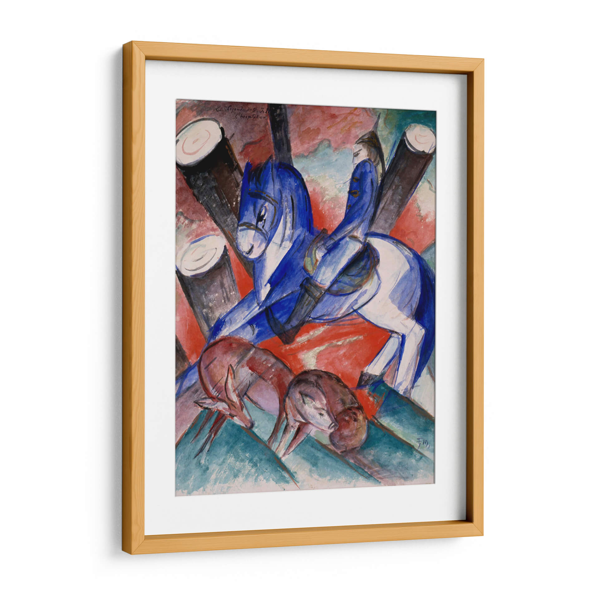 Sumérgete en la vibrante y expresiva obra de Franz Marc, 'San Julián el Hospitalario', un cuadro decorativo que captura la esencia del arte moderno con una paleta de colores audaz y una composición dinámica. Esta pieza, caracterizada por el uso predominante del azul intenso para el caballo y tonos terrosos para los ciervos y el fondo, evoca una sensación de movimiento y vitalidad. Las formas estilizadas y la pincelada enérgica, propias del expresionismo, invitan a la contemplación de la relación entre la figura humana y la naturaleza. Ideal para espacios que buscan un toque de color y personalidad, este cuadro decorativo moderno es perfecto para salas de estar contemporáneas, estudios de arte o cualquier ambiente que aprecie la fuerza visual y la narrativa simbólica. Añade una pieza de arte icónico a tu colección y transforma tu hogar en una galería personal, conectando con el legado artístico de principios del siglo XX a través de una interpretación contemporánea y llena de emoción. La obra desprende una energía única, a la vez serena y potente, que sin duda será un punto de conversación y admiración en tu decoración.