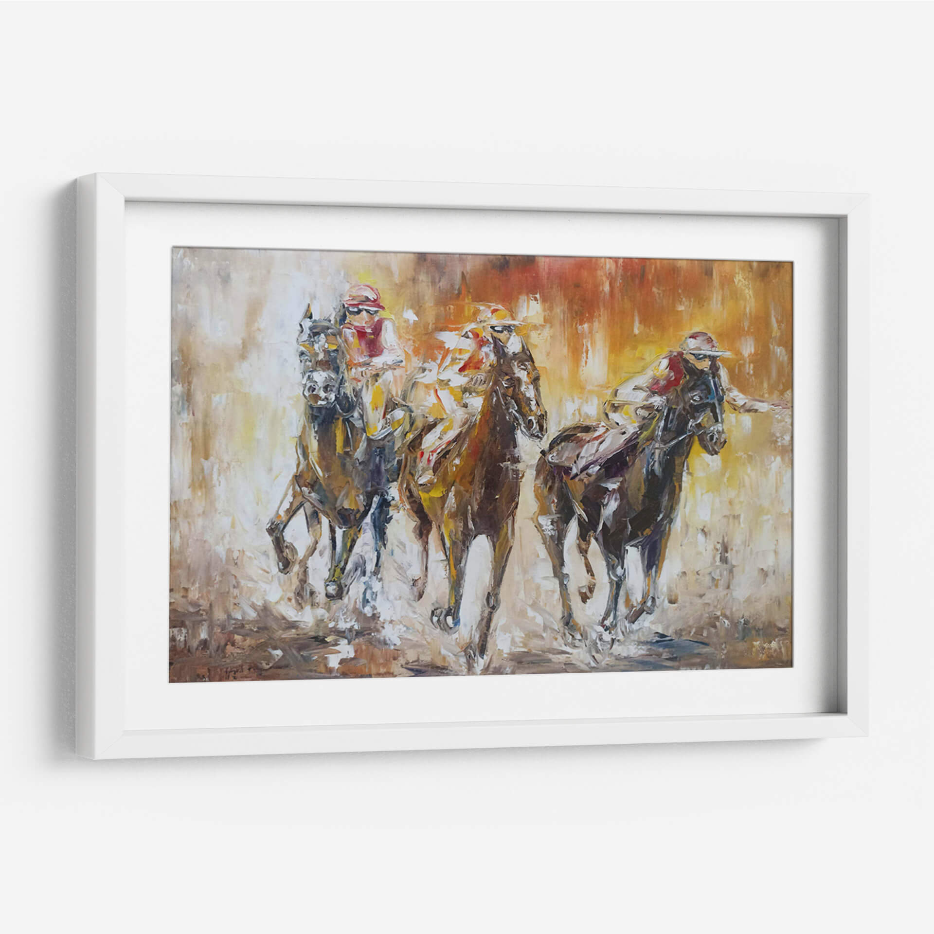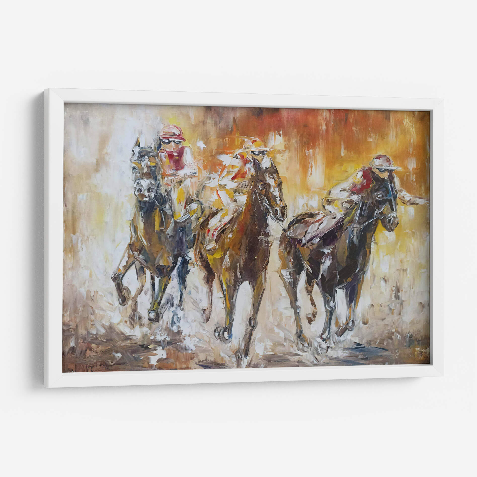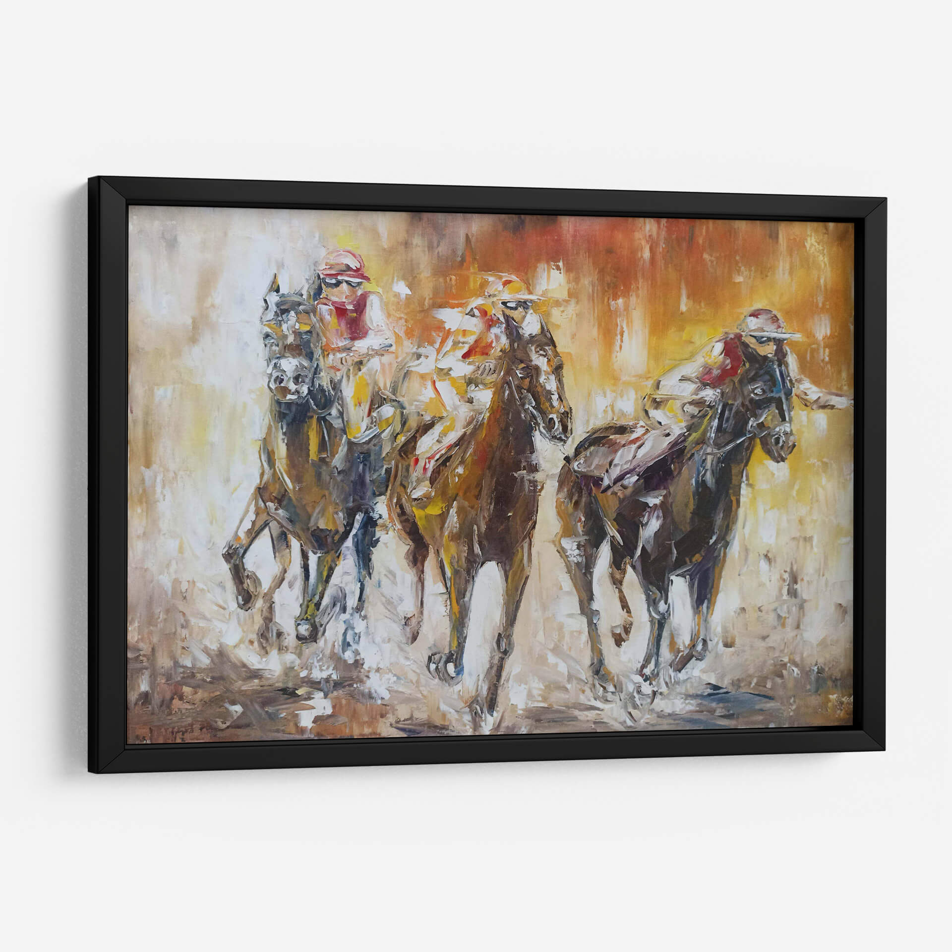 Sumérgete en la adrenalina y la emoción de la carrera con este cautivador cuadro decorativo que captura la esencia del hipismo. La obra de Triana, titulada "123", plasma con maestría la fuerza y la velocidad de los caballos en pleno galope, junto a sus jinetes concentrados en la competencia. A través de pinceladas audaces y una paleta de colores cálidos y terrosos, que van desde ocres y naranjas hasta marrones profundos, se crea una atmósfera vibrante y dinámica. El estilo expresionista y la técnica impasto añaden textura y profundidad, haciendo que cada elemento cobre vida ante los ojos del espectador. Las figuras de los caballos y jinetes se fusionan con el fondo en un torbellino de movimiento, transmitiendo la intensidad del momento cumbre de la carrera. Este cuadro decorativo es ideal para añadir un toque de energía y sofisticación a salones, estudios u oficinas, inspirando pasión y determinación. Perfecto para los amantes de los deportes ecuestres o para quienes buscan una pieza de arte con carácter y fuerza visual que se convierta en el centro de atención de cualquier espacio.