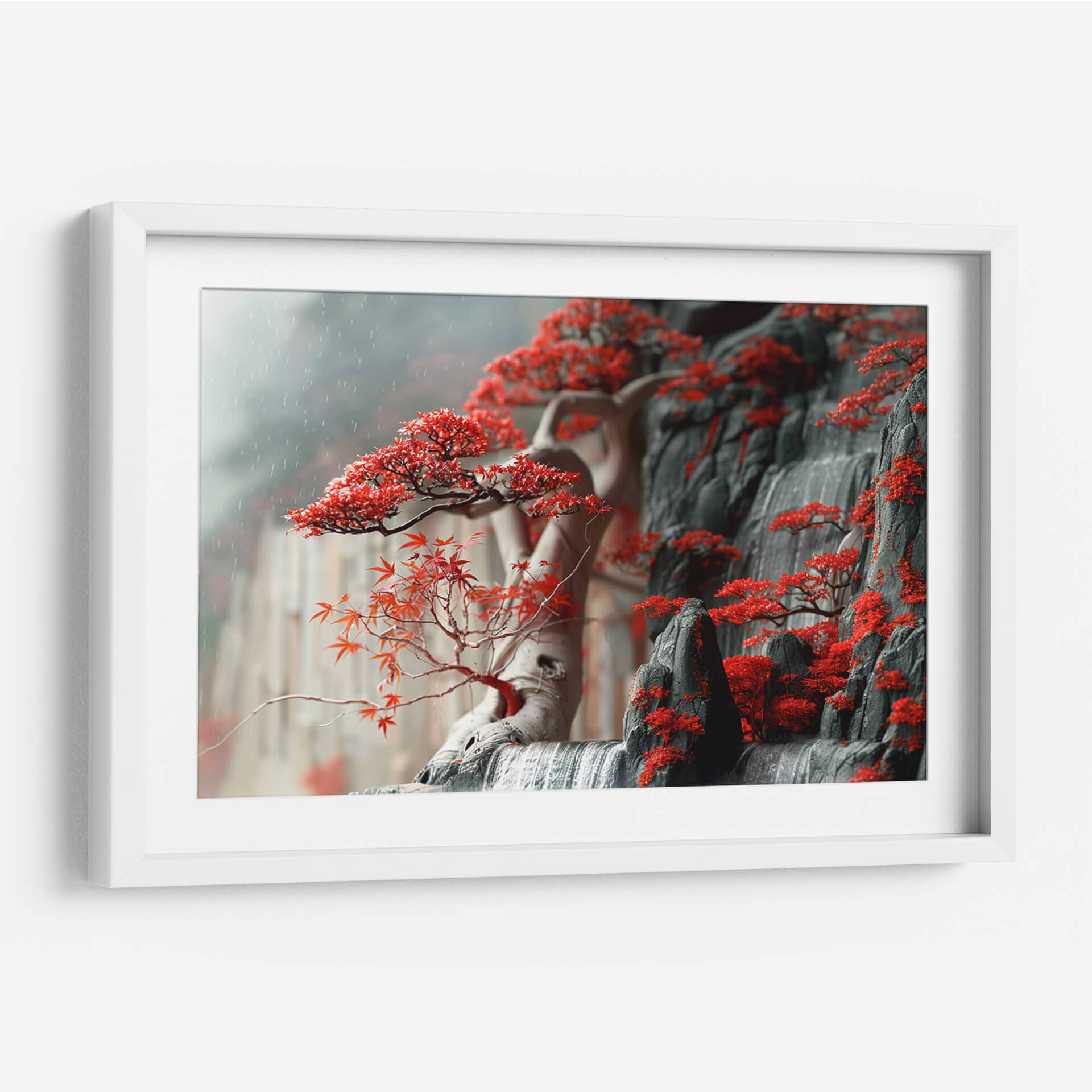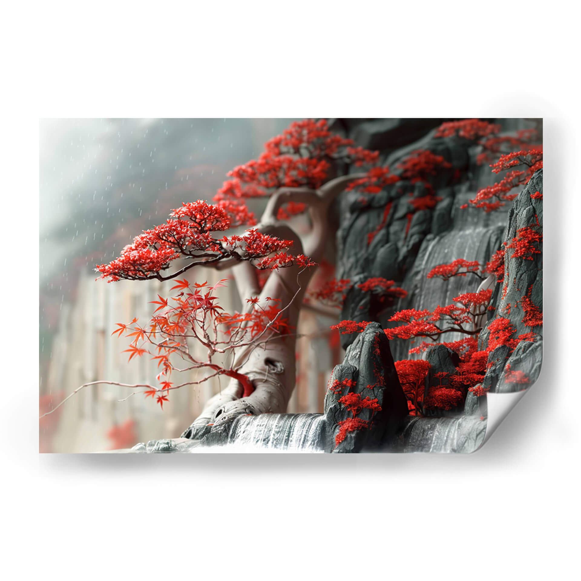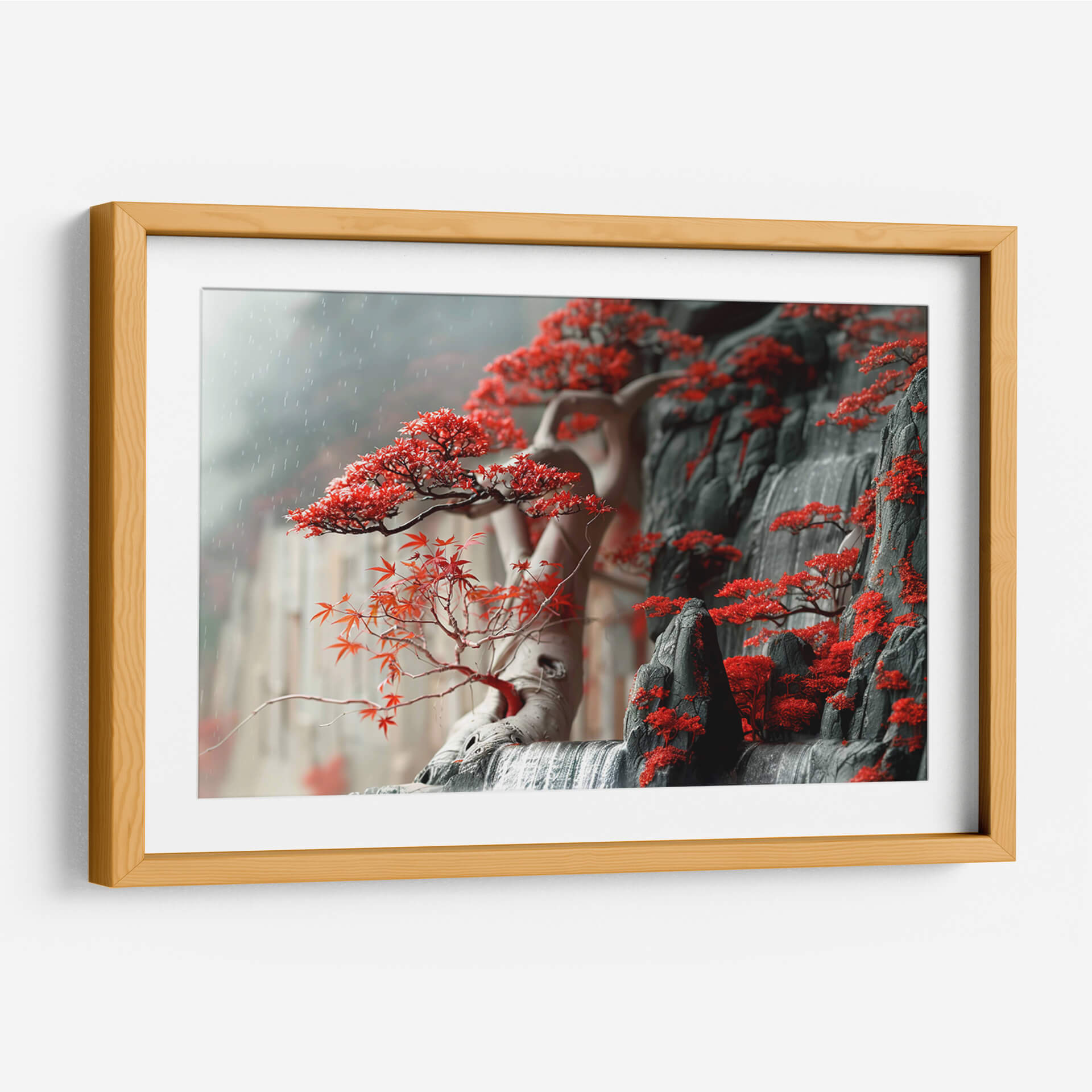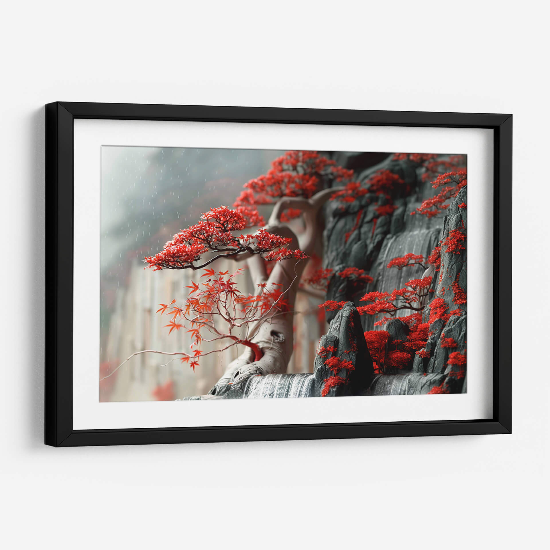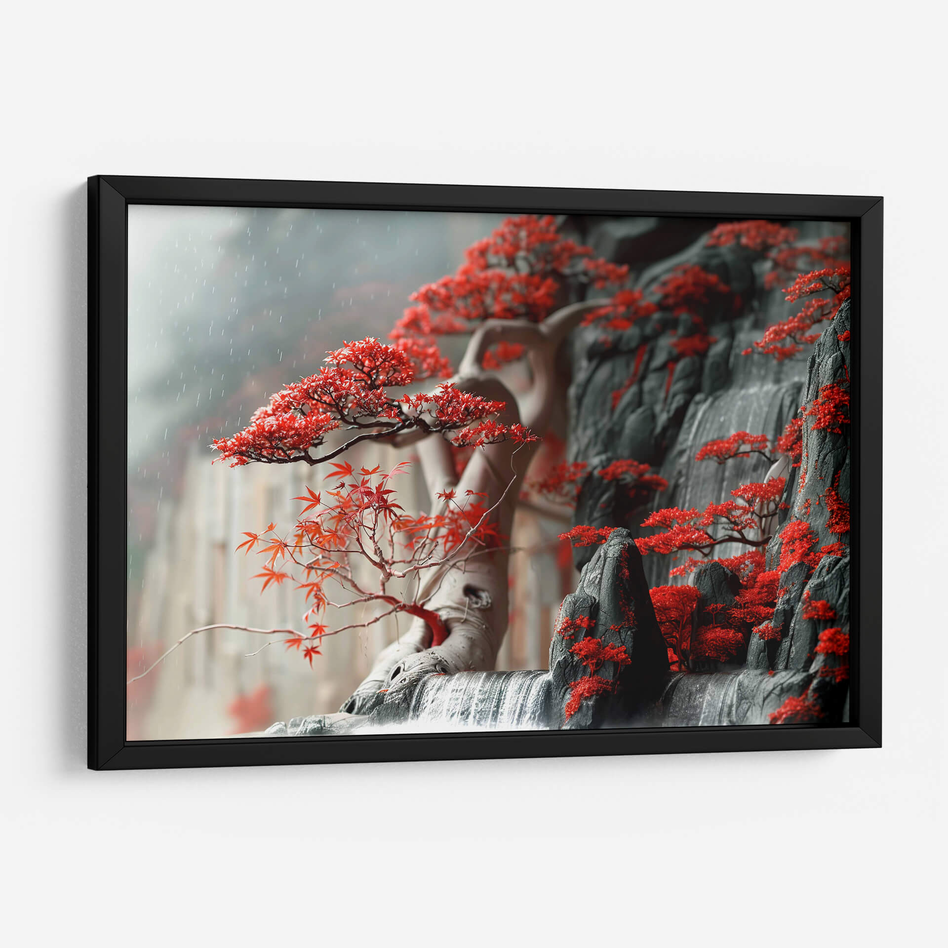 Sumérgete en la serenidad de la naturaleza con "Árbol Bonsái", una obra de Cecilia Flores que captura la esencia de la calma y la belleza efímera. Esta pieza presenta un árbol bonsái de vibrante follaje rojo, delicadamente posado sobre un paisaje rocoso y escarpado. Una cascada serena fluye suavemente, añadiendo un elemento de movimiento y tranquilidad a la composición. La paleta de colores, dominada por el contraste entre el rojo intenso de las hojas y los tonos fríos y grises de las rocas, crea una atmósfera evocadora y contemplativa. La sutil lluvia que cae en el fondo difumina los detalles, invitando a la reflexión y a la conexión con la naturaleza en su estado más puro. "Árbol Bonsái" es más que una decoración; es una ventana a un mundo de armonía y equilibrio, ideal para espacios que buscan transmitir paz y sofisticación. Su estilo detallado y realista, con un toque onírico, lo convierte en un punto focal cautivador para salones, dormitorios o estudios. Añade un toque de serenidad japonesa a tu hogar con este cuadro decorativo que inspira contemplación y renueva tu espacio.