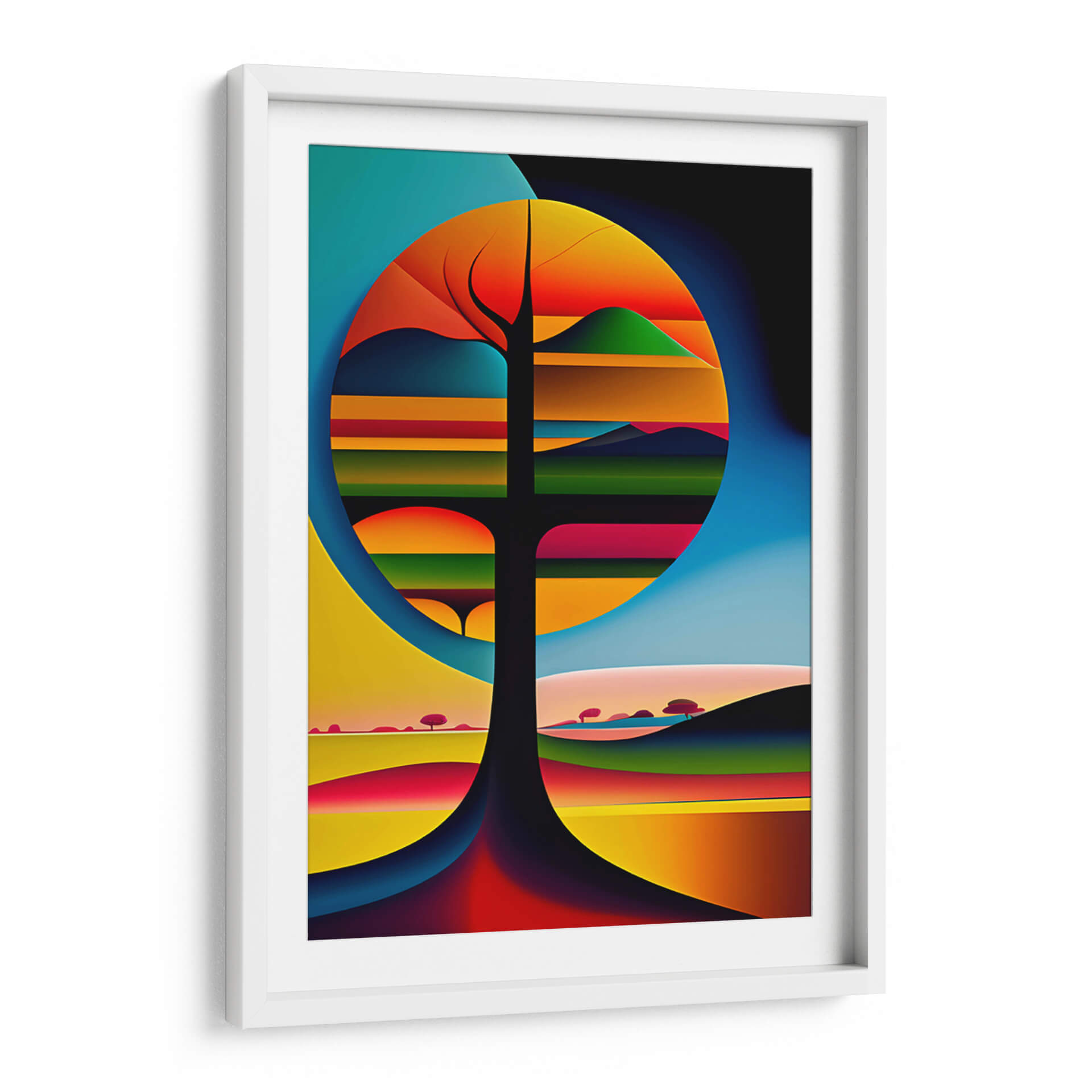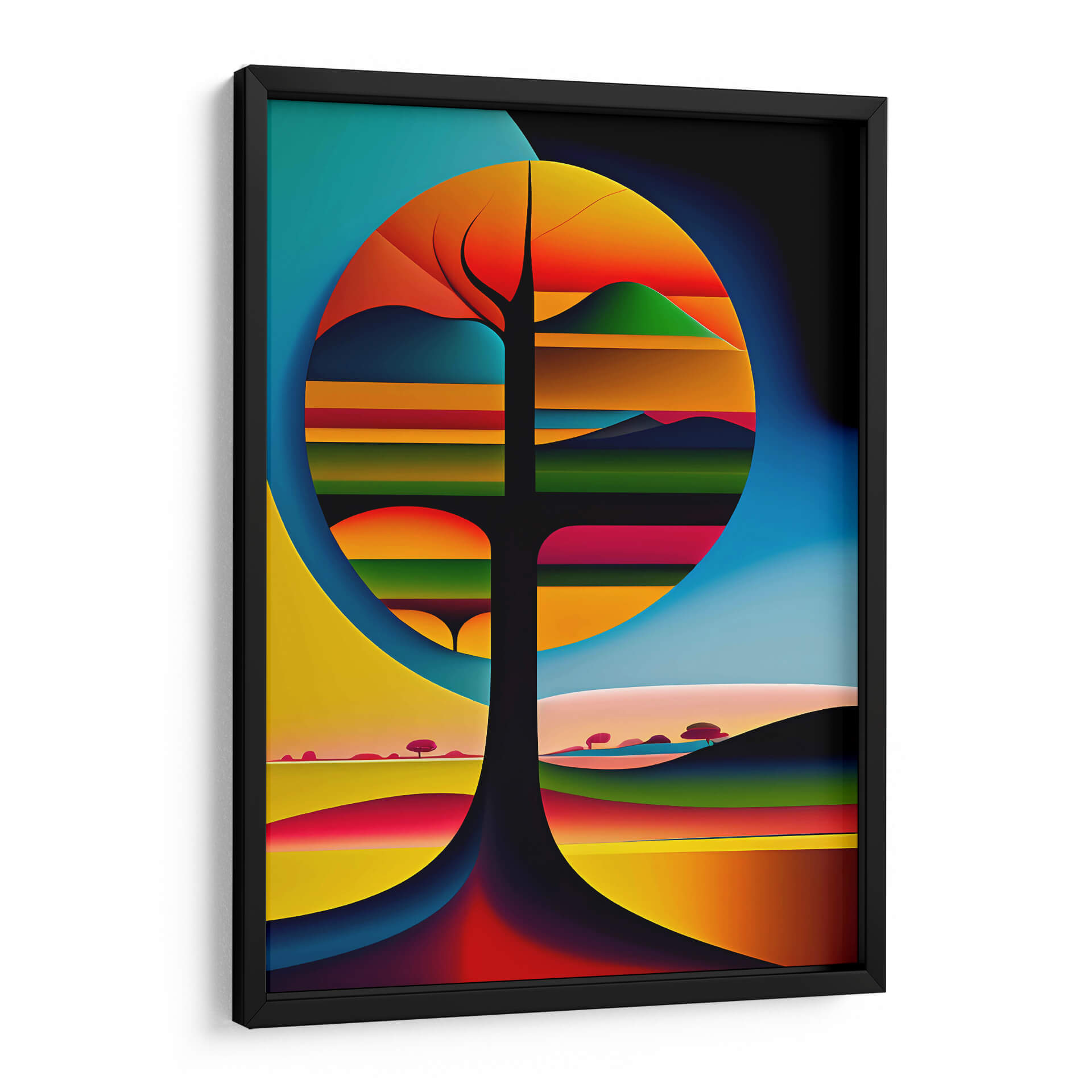 Sumérgete en la enigmática belleza del "Árbol de Vida Surrealista", una obra maestra de arte digital que trasciende la realidad para explorar las profundidades de la imaginación. Esta pieza cautiva con su vibrante paleta de colores, que transita desde el azul profundo del cielo hasta los cálidos tonos anaranjados y rojizos que sugieren un atardecer místico. La composición, liderada por la figura central de un árbol estilizado, se desdobla en un paisaje onírico donde formas geométricas y bandas de color evocan un mundo paralelo. Los elementos surrealistas se entrelazan de manera fluida, creando una sensación de misterio y expansión. Cada línea y cada matiz invitan a la contemplación, transformando este cuadro decorativo en un portal hacia un universo de fantasía y simbolismo. Ideal para salones modernos, estudios creativos u oficinas que buscan inspirar y provocar la conversación, esta obra de arte contemporáneo es perfecta para quienes aprecian la originalidad y la profundidad emocional en su decoración. Añade un toque de intriga y sofisticación a tu espacio con este lienzo que promete ser un punto focal inolvidable, estimulando la creatividad y la reflexión en cada observador.