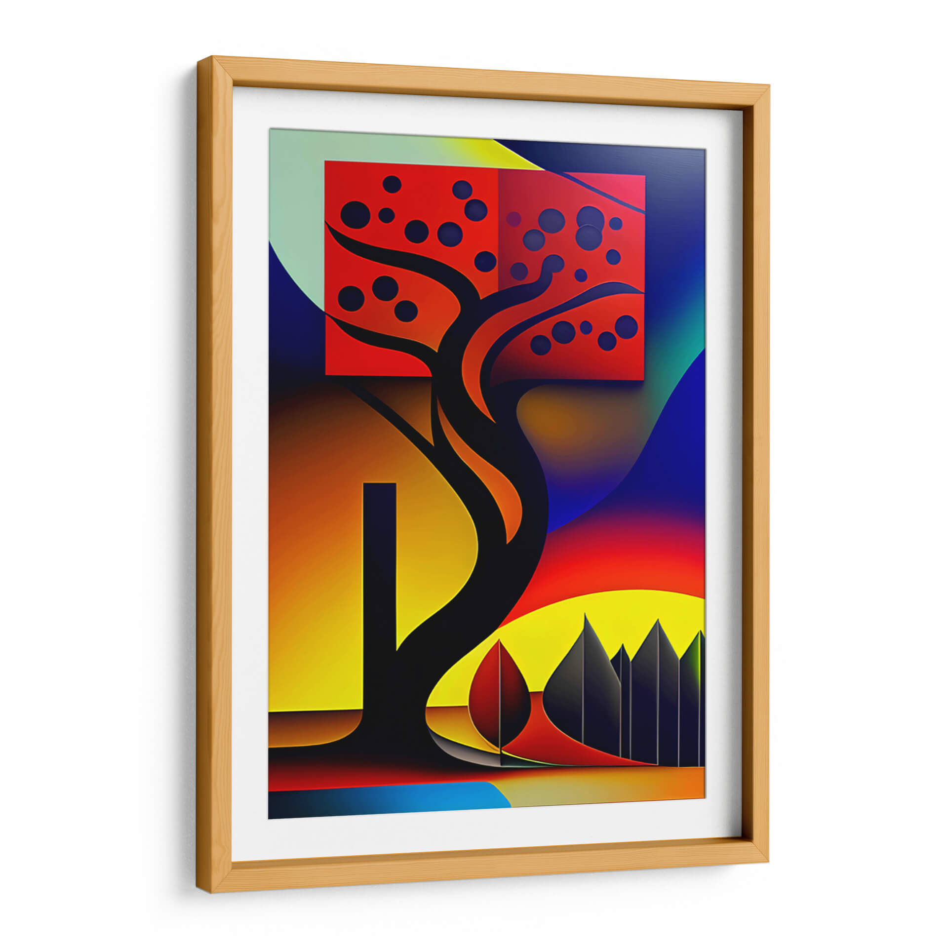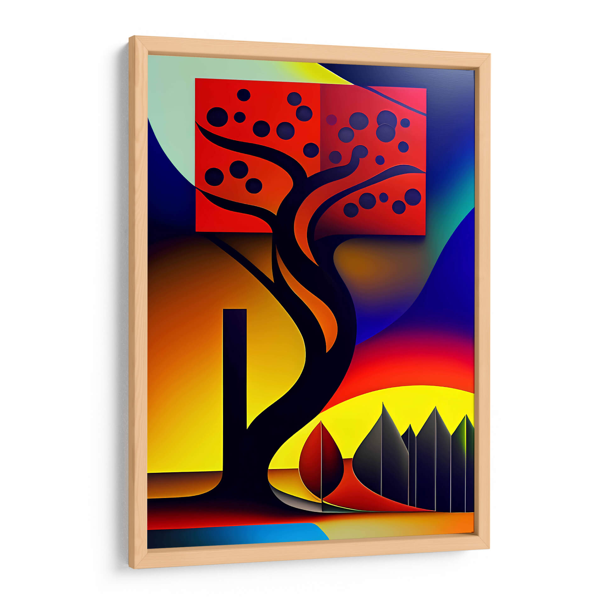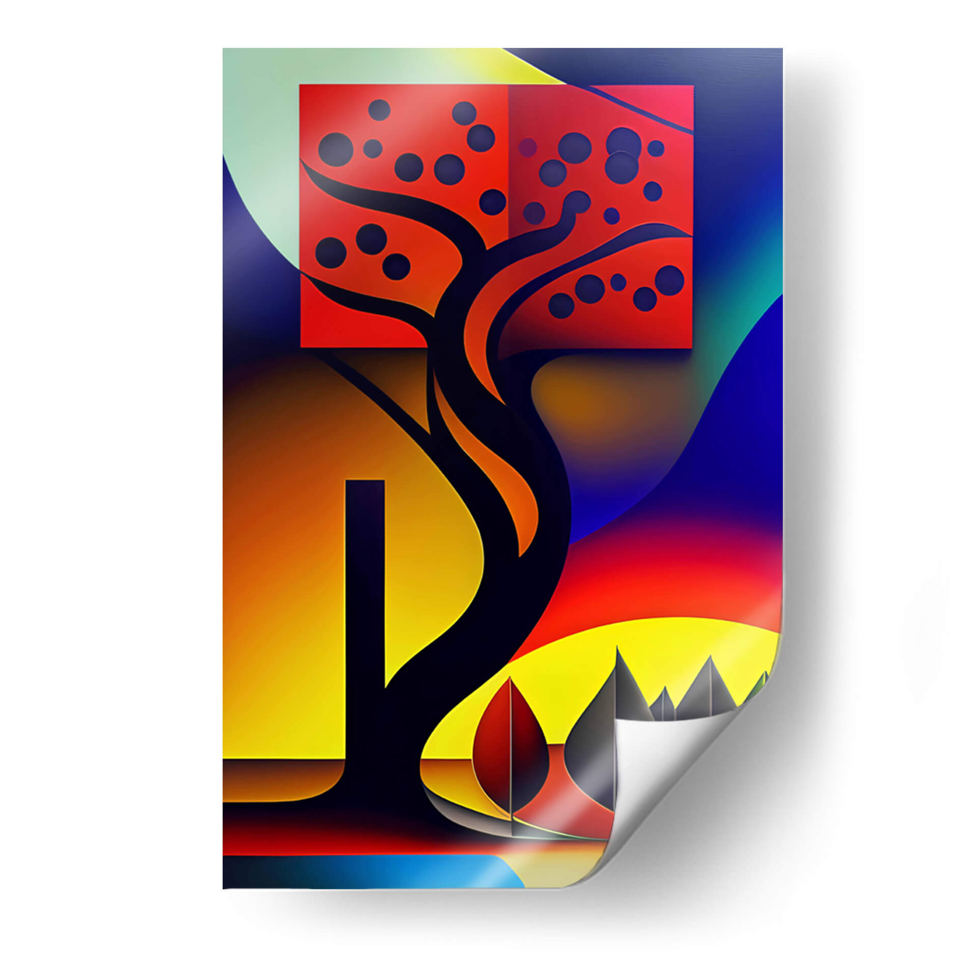 Sumérgete en la vibrante y enigmática obra "Árbol Geométrico" de DEA Digital Esoteric Art. Este cuadro decorativo trasciende la representación literal para explorar una fusión audaz de formas abstractas y elementos naturales estilizados. La composición se centra en un árbol estilizado, cuya silueta oscura y sinuosa contrasta dramáticamente con un recuadro rojo intenso que alberga esferas oscuras, evocando quizás frutos o patrones celestes. El fondo se despliega en un degradado de colores que va desde el verde pálido y azul profundo hasta un ardiente atardecer de tonos naranjas y amarillos, creando una atmósfera de energía cósmica y misterio. Las líneas limpias y la geometría sutil de los elementos secundarios, como las siluetas puntiagudas en la base y las formas curvas que envuelven la escena, sugieren una conexión entre lo orgánico y lo digital, lo terrenal y lo espiritual. "Árbol Geométrico" es más que una simple pieza de arte de pared; es una invitación a la contemplación, ideal para infundir a cualquier espacio moderno, oficina o sala de estar, un toque de originalidad y profundidad intelectual. Su paleta de colores audaces y su diseño único lo convierten en un punto focal impactante, capaz de dialogar con decoraciones contemporáneas y eclécticas, aportando vitalidad y un sentido de exploración visual.