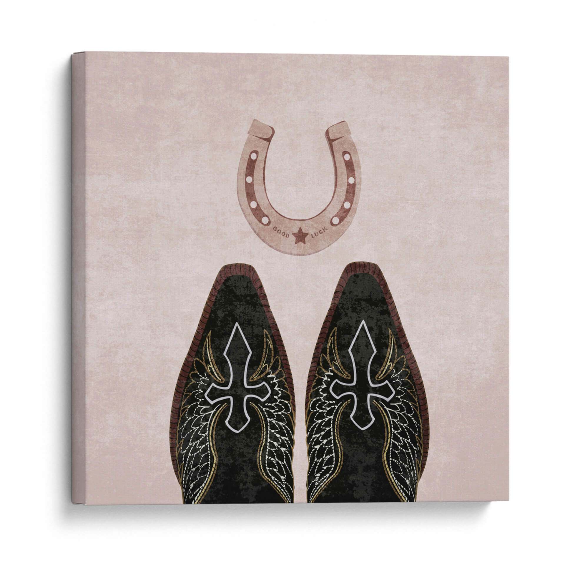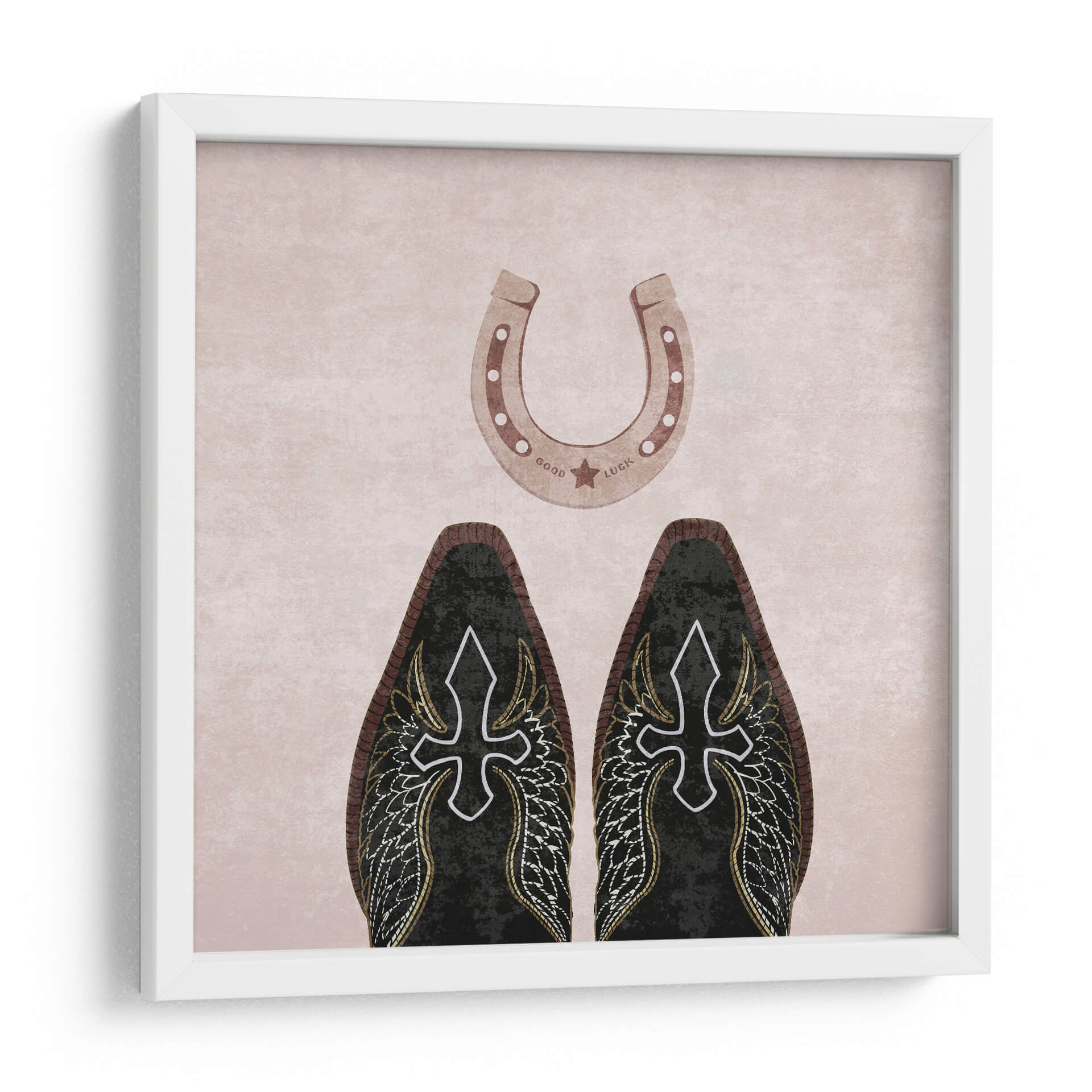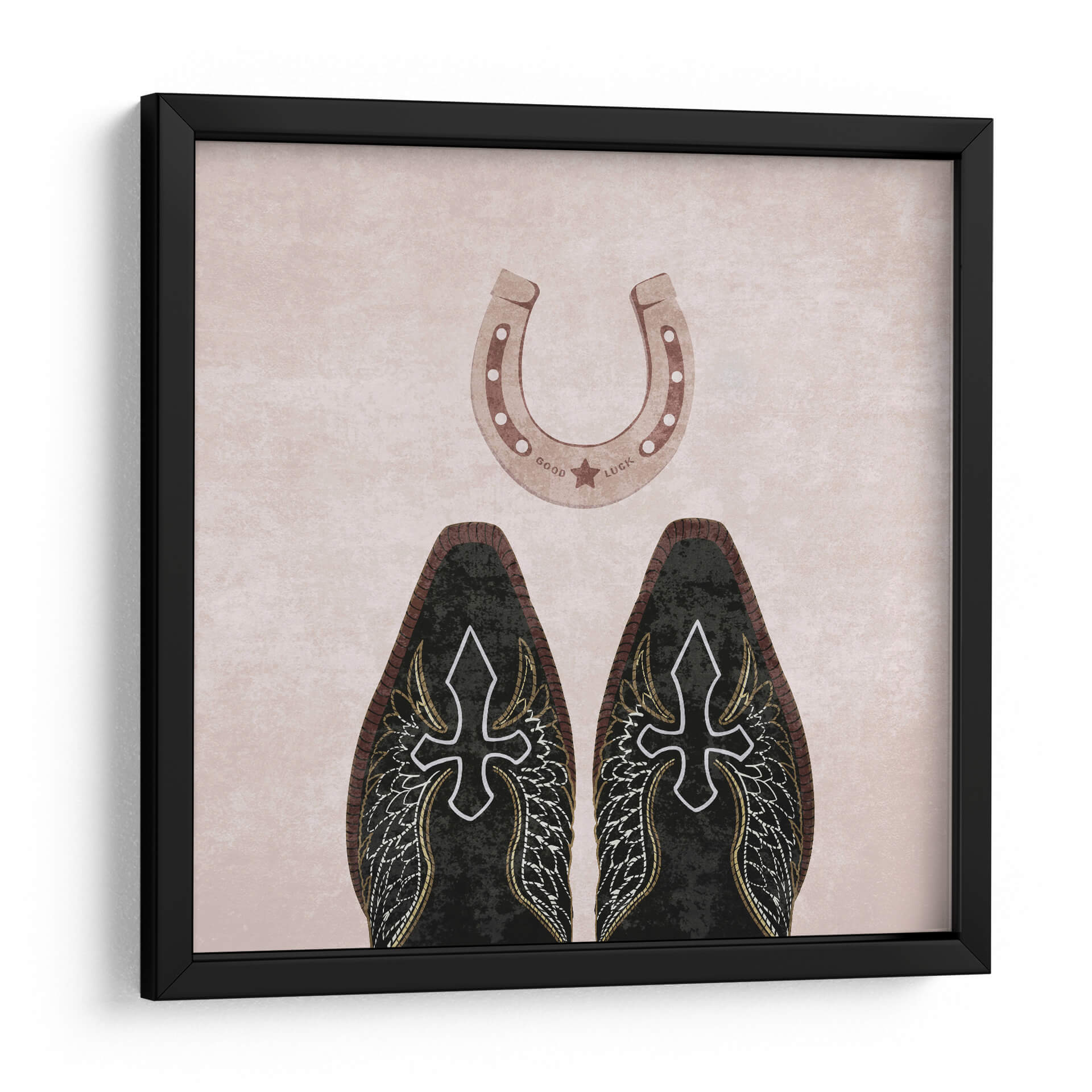 Sumérgete en el espíritu del oeste con "Armonía Occidental", una cautivadora obra de arte de Emel Tunaboylu. Esta pieza evoca una profunda conexión con la tradición y la aventura, presentando un par de botas de vaquero ricamente detalladas y un símbolo de la herradura de la buena suerte. Los colores cálidos y terrosos, combinados con un diseño estilizado, crean una atmósfera acogedora y nostálgica, perfecta para cualquier espacio que busque un toque de carácter rústico y sofisticado. La composición minimalista pero impactante, con sus delicados bordados y el toque simbólico de la herradura, invita a la reflexión sobre el viaje y la fortuna. Ideal para salones, estudios u oficinas que deseen inspirar confianza y un espíritu libre. Este cuadro decorativo es una invitación a traer la esencia del oeste a tu hogar, añadiendo profundidad y un estilo inconfundible a tu decoración.