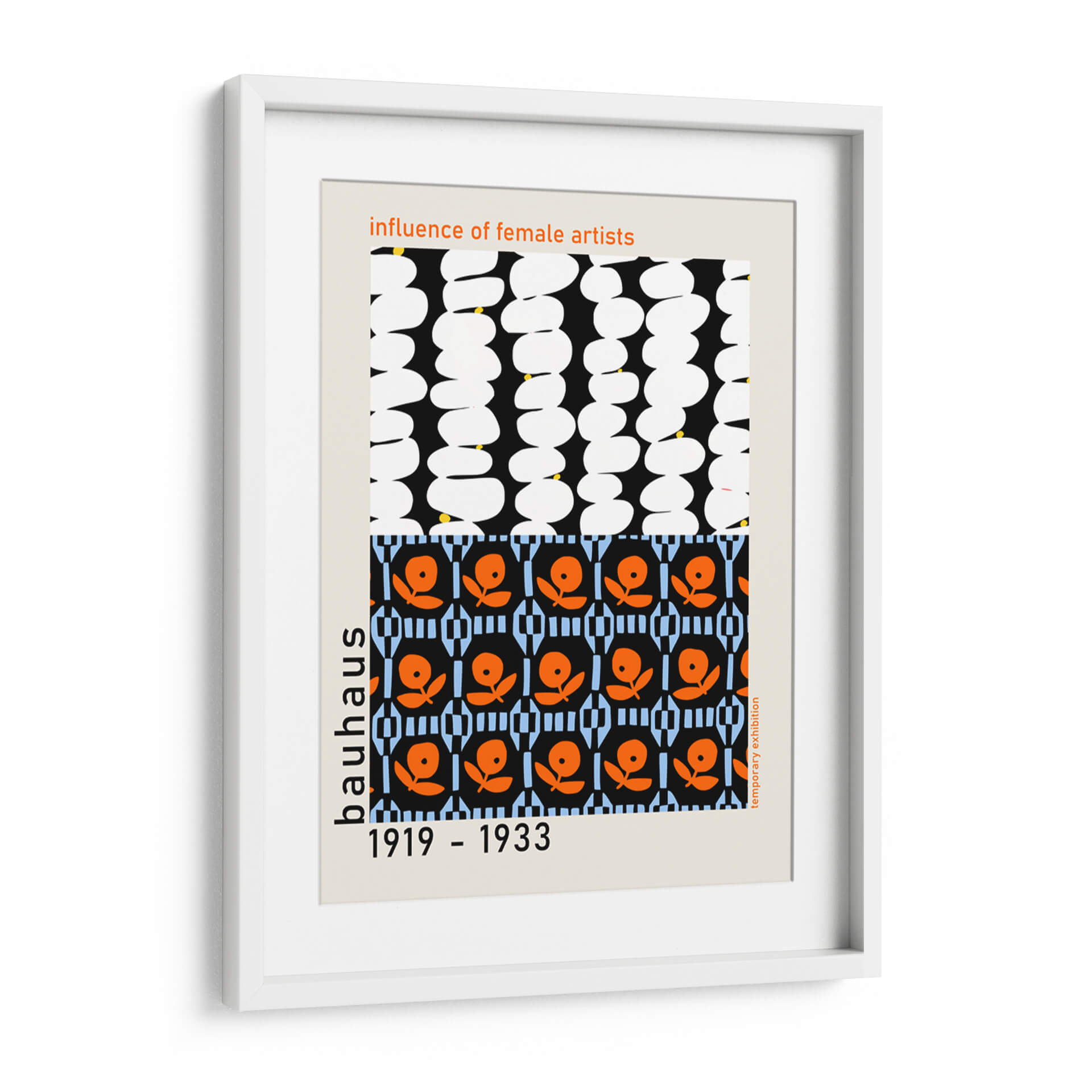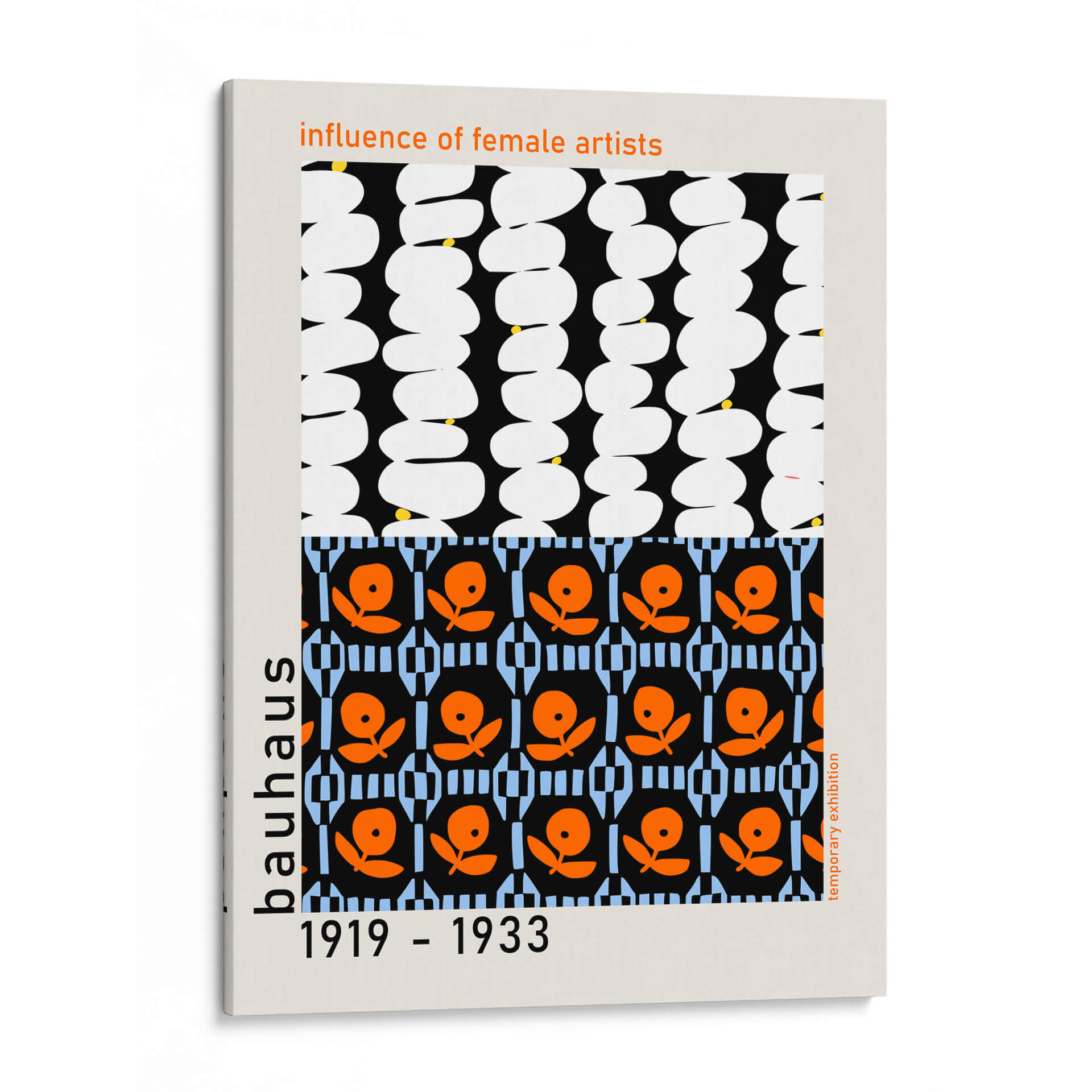 Celebra la influencia perdurable de las artistas femeninas en el diseño Bauhaus con esta cautivadora obra de arte. La pieza presenta una composición audaz y geométrica, dividida en dos secciones distintas que invitan a la contemplación. La mitad superior exhibe una repetición rítmica de formas orgánicas blancas sobre un fondo negro profundo, salpicadas con sutiles toques de amarillo que añaden un destello de vitalidad. La mitad inferior introduce un vibrante patrón de flores estilizadas en naranja brillante sobre un fondo negro, intercalado con bloques de color azul claro y un diseño geométrico que recuerda a las innovaciones textiles de la época. Inspirada en el espíritu vanguardista de la Bauhaus, esta obra evoca una sensación de orden, creatividad y un diseño funcional pero estético. Es una pieza ideal para espacios que buscan un toque de historia del arte moderno y un diseño gráfico impactante. Perfecta para oficinas, salas de estar o estudios, este cuadro decorativo no solo embellece, sino que también dialoga con el legado de las mujeres que rompieron barreras en el arte y el diseño. Aporta un aire de sofisticación intelectual y un guiño a la era dorada del diseño.