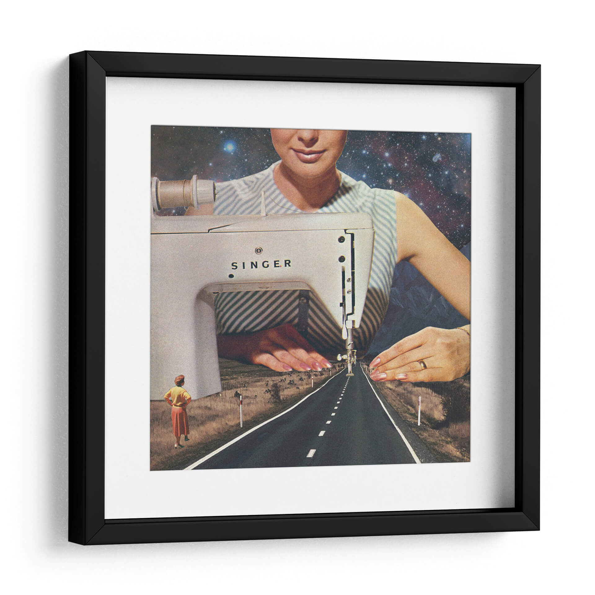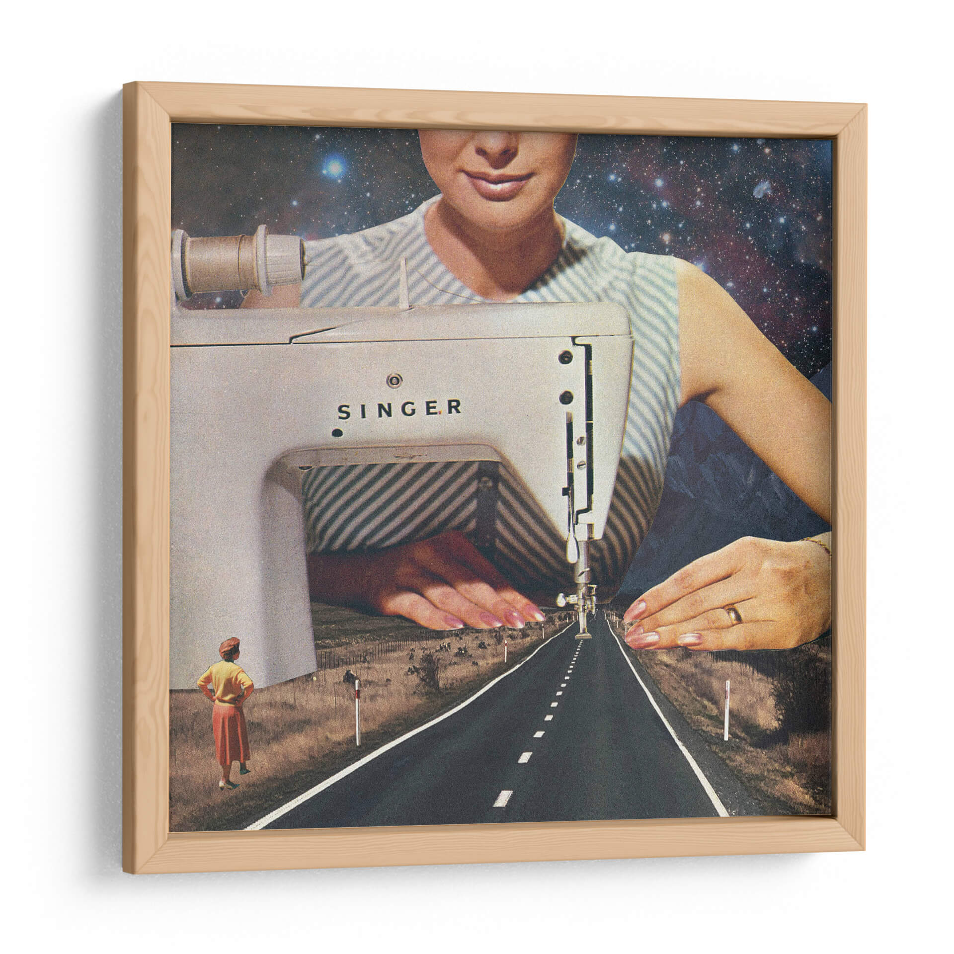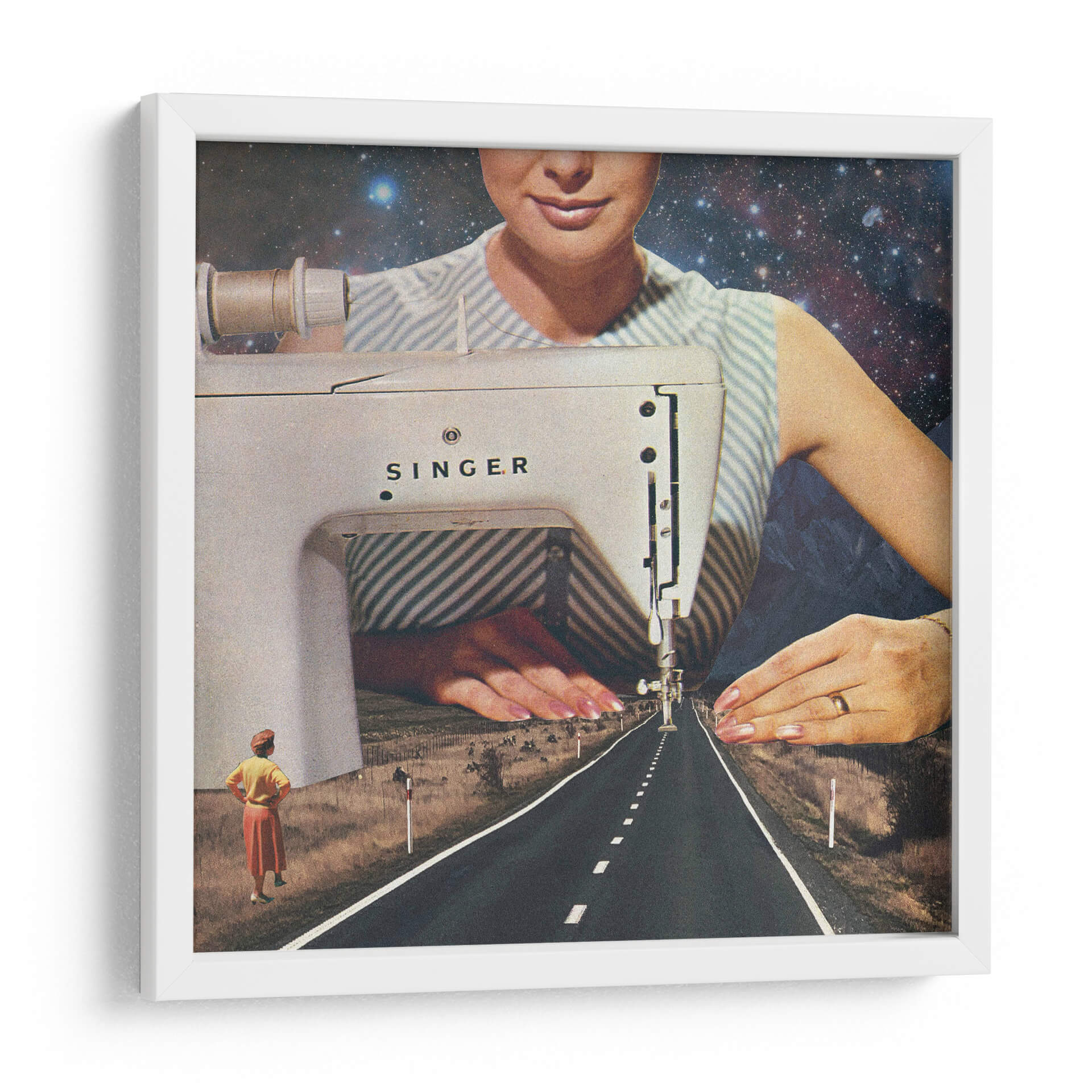 Adéntrate en la fascinante obra de arte "Así es como se hace un camino", una pieza que redefine la perspectiva y la narrativa visual a través de un collage surrealista. La imagen nos presenta una escena onírica donde una máquina de coser Singer parece tejer la propia realidad. El primer plano está dominado por la mecánica detallada de la máquina, con una aguja descendiendo hacia una carretera interminable que se pierde en el horizonte. El cielo estrellado y las montañas crean un telón de fondo cósmico y terrestre, fusionando lo mundano con lo infinito. Dos figuras femeninas en la distancia observan este camino, sugiriendo un viaje, un destino o el inicio de un nuevo sendero. La paleta de colores, aunque sutil, transita entre los tonos tierra del paisaje, el blanco y azul de la vestimenta, y el profundo azul del cosmos. Esta obra es ideal para quienes buscan una decoración única y provocadora, capaz de inspirar conversaciones y reflexiones sobre la creación, el destino y la infinitud de las posibilidades. Añade un toque de misterio y vanguardia a tu hogar u oficina con este cuadro decorativo que rompe esquemas y estimula la imaginación.