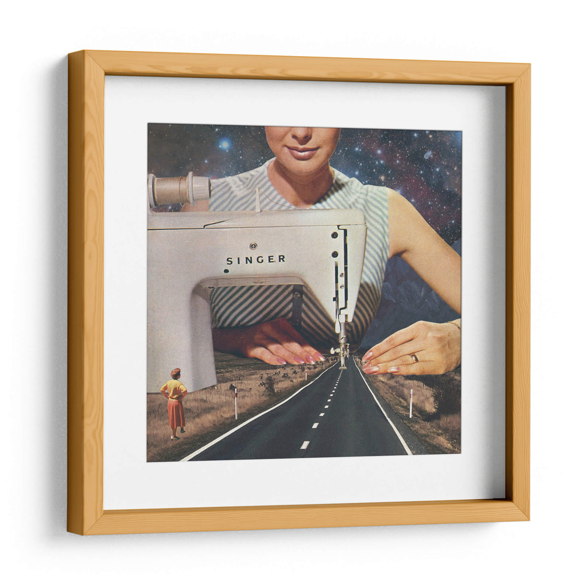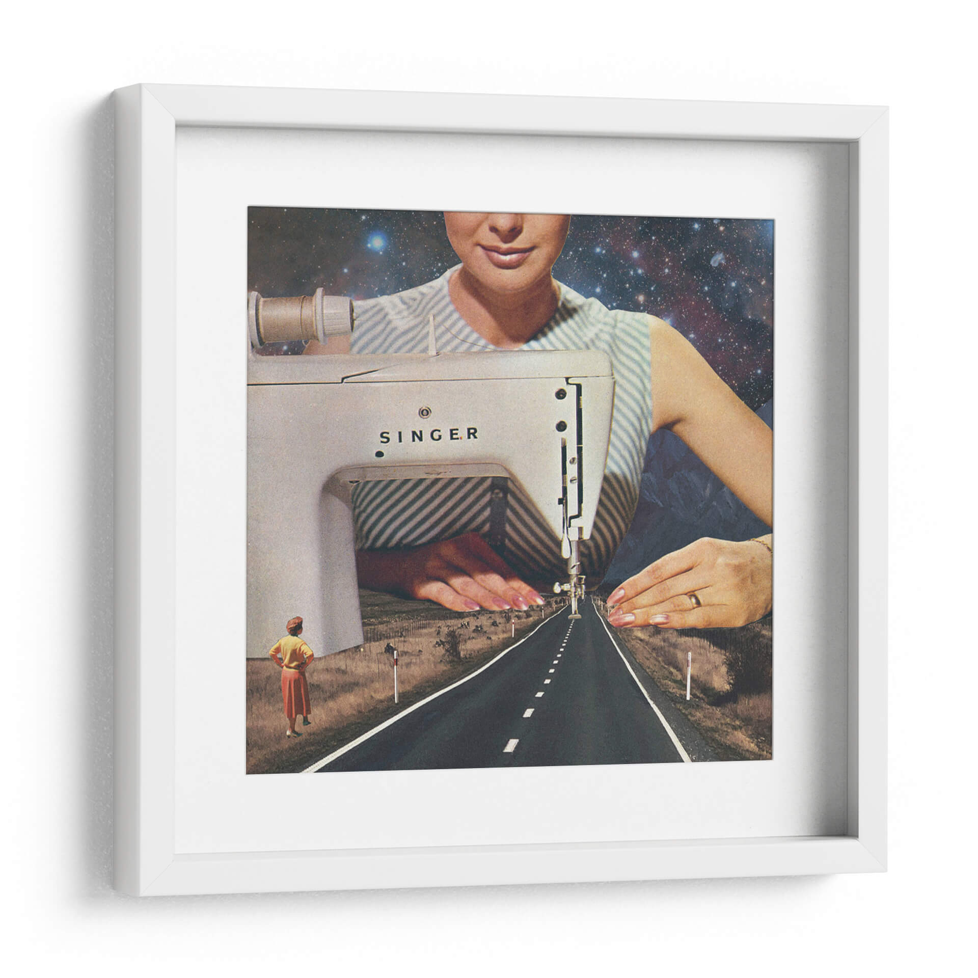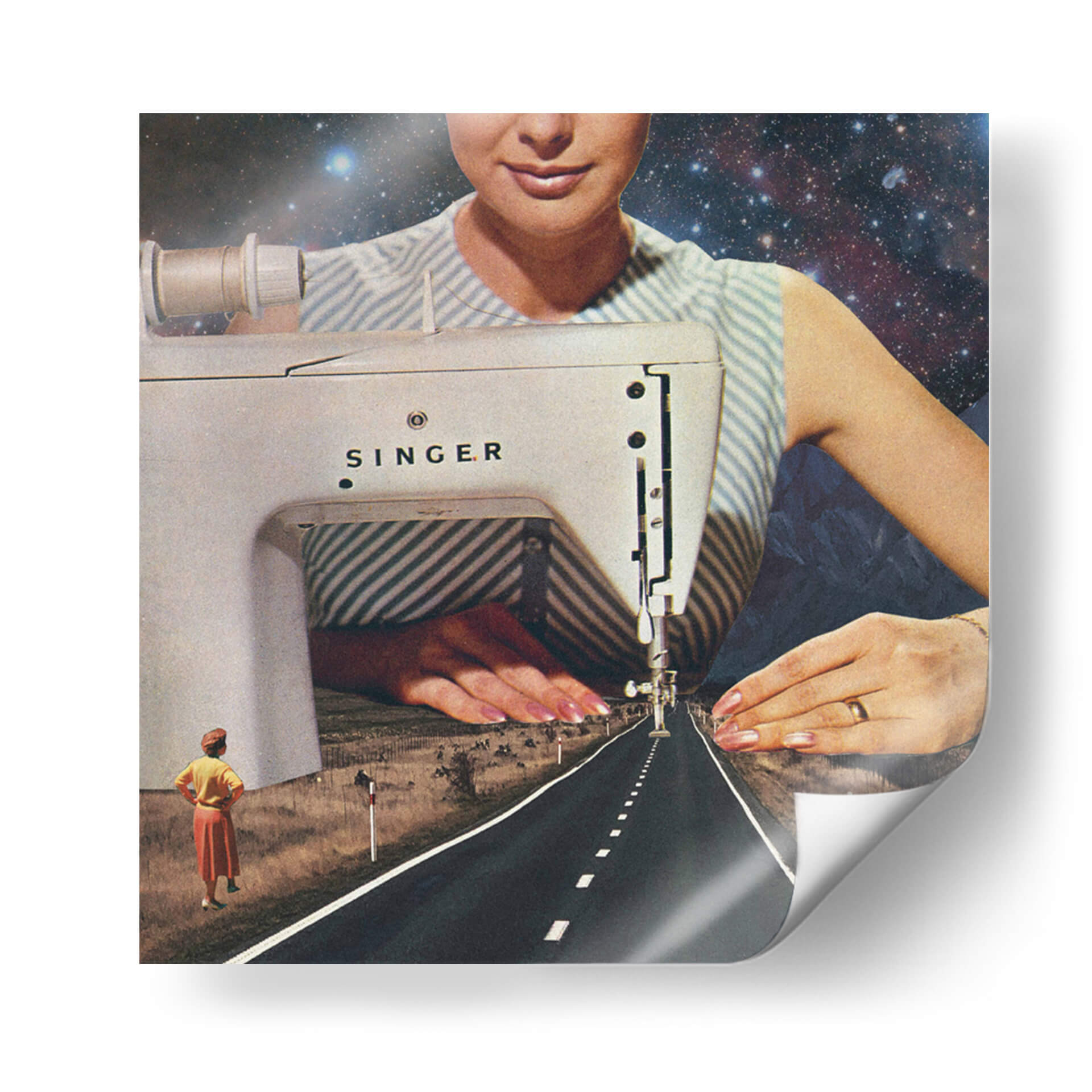 Adéntrate en la fascinante obra de arte "Así es como se hace un camino", una pieza que redefine la perspectiva y la narrativa visual a través de un collage surrealista. La imagen nos presenta una escena onírica donde una máquina de coser Singer parece tejer la propia realidad. El primer plano está dominado por la mecánica detallada de la máquina, con una aguja descendiendo hacia una carretera interminable que se pierde en el horizonte. El cielo estrellado y las montañas crean un telón de fondo cósmico y terrestre, fusionando lo mundano con lo infinito. Dos figuras femeninas en la distancia observan este camino, sugiriendo un viaje, un destino o el inicio de un nuevo sendero. La paleta de colores, aunque sutil, transita entre los tonos tierra del paisaje, el blanco y azul de la vestimenta, y el profundo azul del cosmos. Esta obra es ideal para quienes buscan una decoración única y provocadora, capaz de inspirar conversaciones y reflexiones sobre la creación, el destino y la infinitud de las posibilidades. Añade un toque de misterio y vanguardia a tu hogar u oficina con este cuadro decorativo que rompe esquemas y estimula la imaginación.