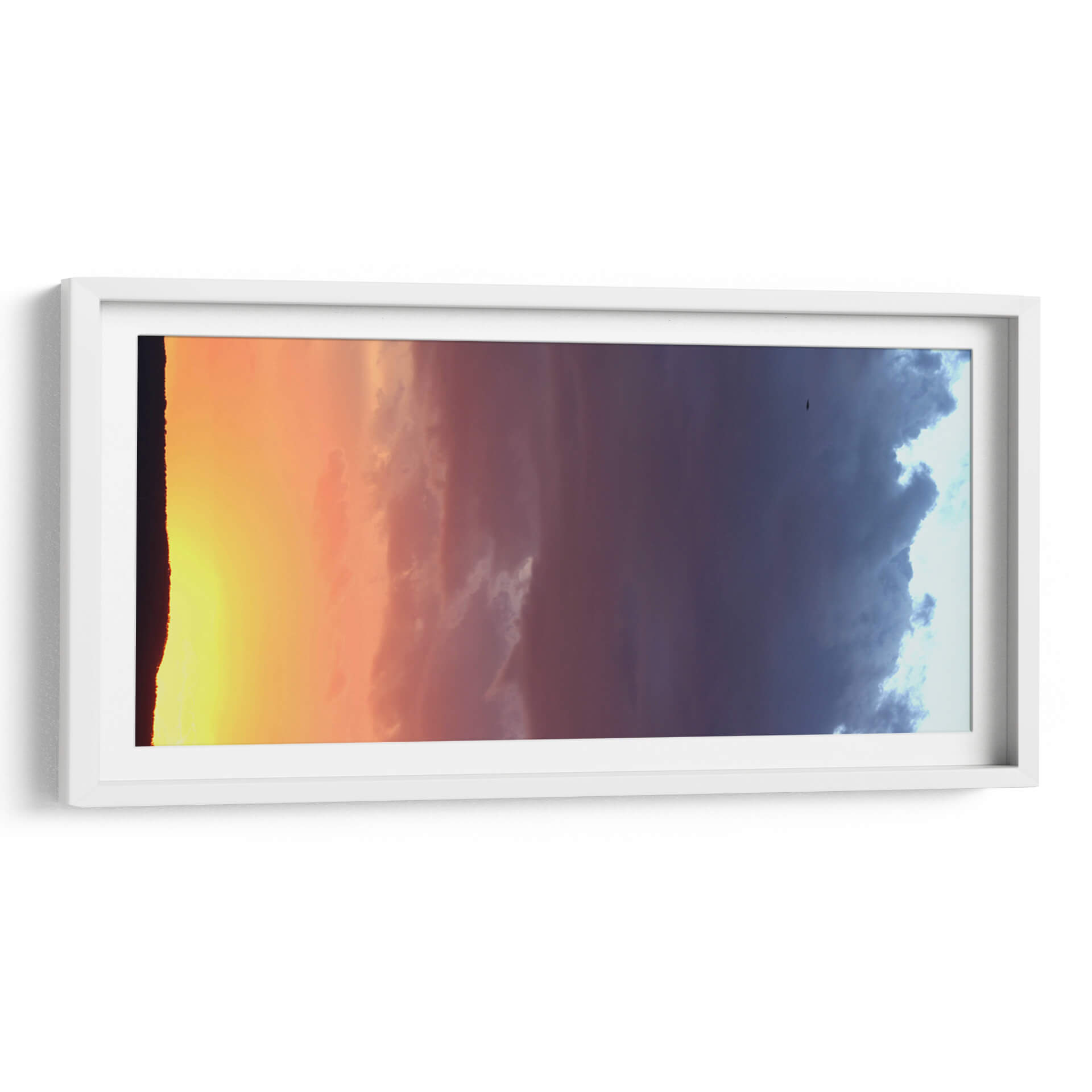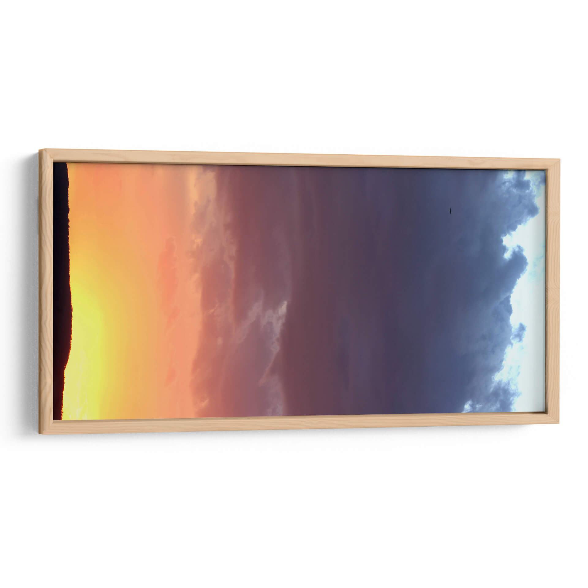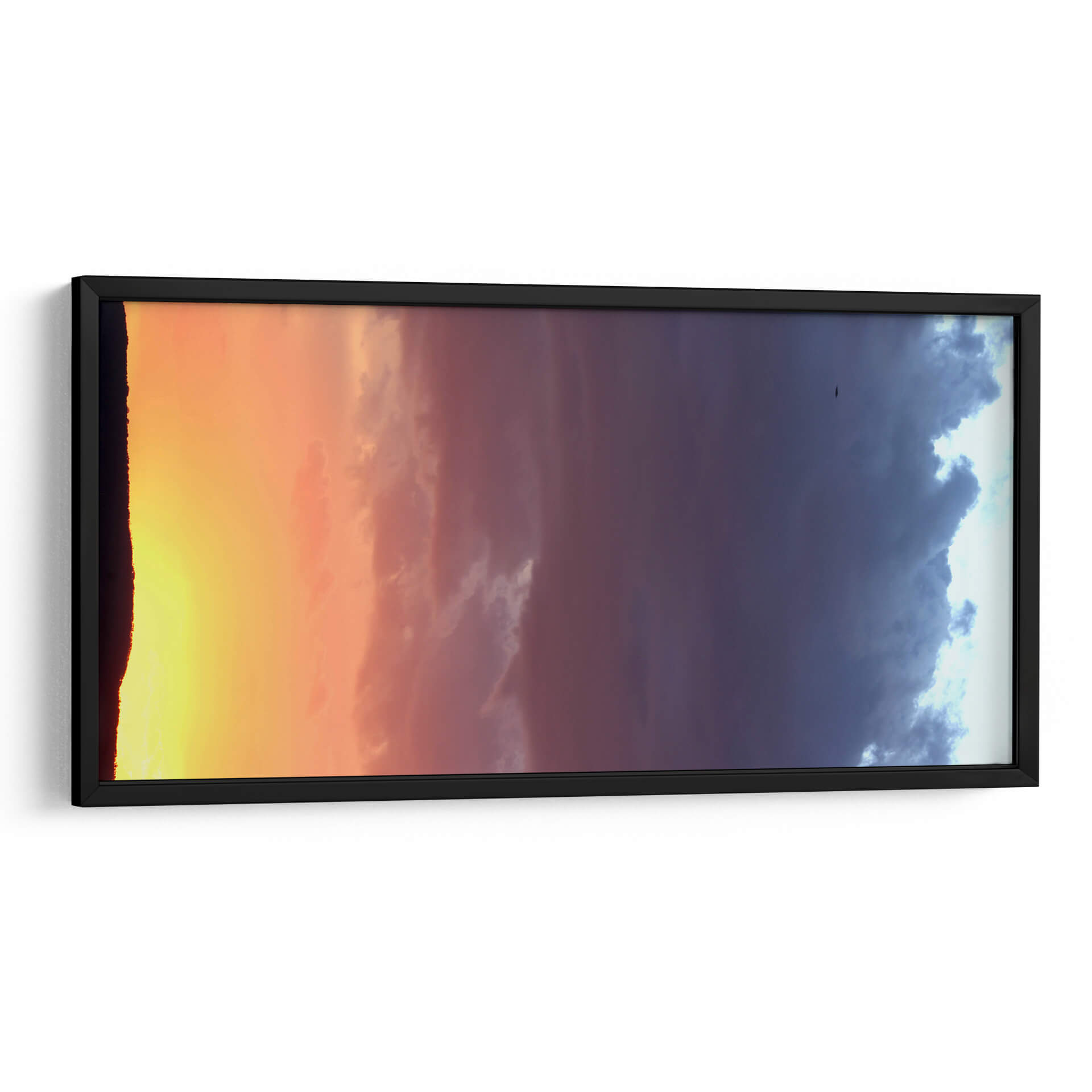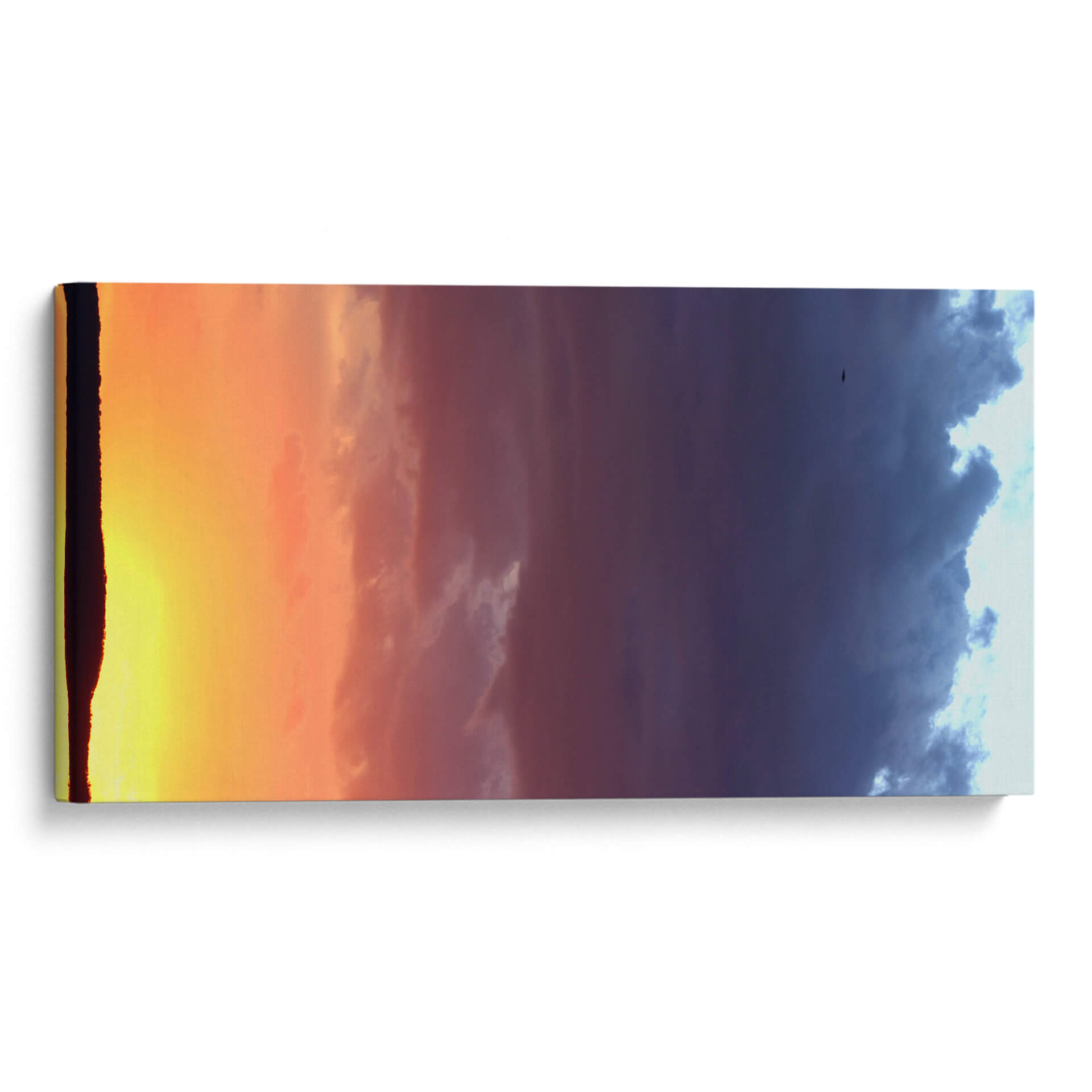 Sumérgete en la serenidad y el drama de "Atardecer en Capas", una obra de arte contemporáneo que captura la transición efímera entre el día y la noche. Este cuadro decorativo te transporta a un momento de profunda calma visual, donde el sol poniente tiñe el cielo de cálidos naranjas y amarillos, contrastando con las sombras púrpuras y azules que emergen a medida que la luz se desvanece. Las nubes, representadas con pinceladas suaves y fluidas, añaden textura y profundidad a la escena, creando una atmósfera casi etérea. La silueta oscura en el borde izquierdo de la composición sugiere un paisaje o una figura distante, añadiendo un toque de misterio y perspectiva. Ideal para quienes buscan infundir sus espacios con una sensación de paz y contemplación, este cuadro es perfecto para salones modernos, dormitorios que invitan al descanso o estudios que buscan inspiración. Su paleta de colores vibrante pero armoniosa lo convierte en un punto focal cautivador que complementa una variedad de estilos decorativos, desde el contemporáneo hasta el minimalista. Añade un toque de la belleza sublime de la naturaleza a tu hogar con esta pieza evocadora.