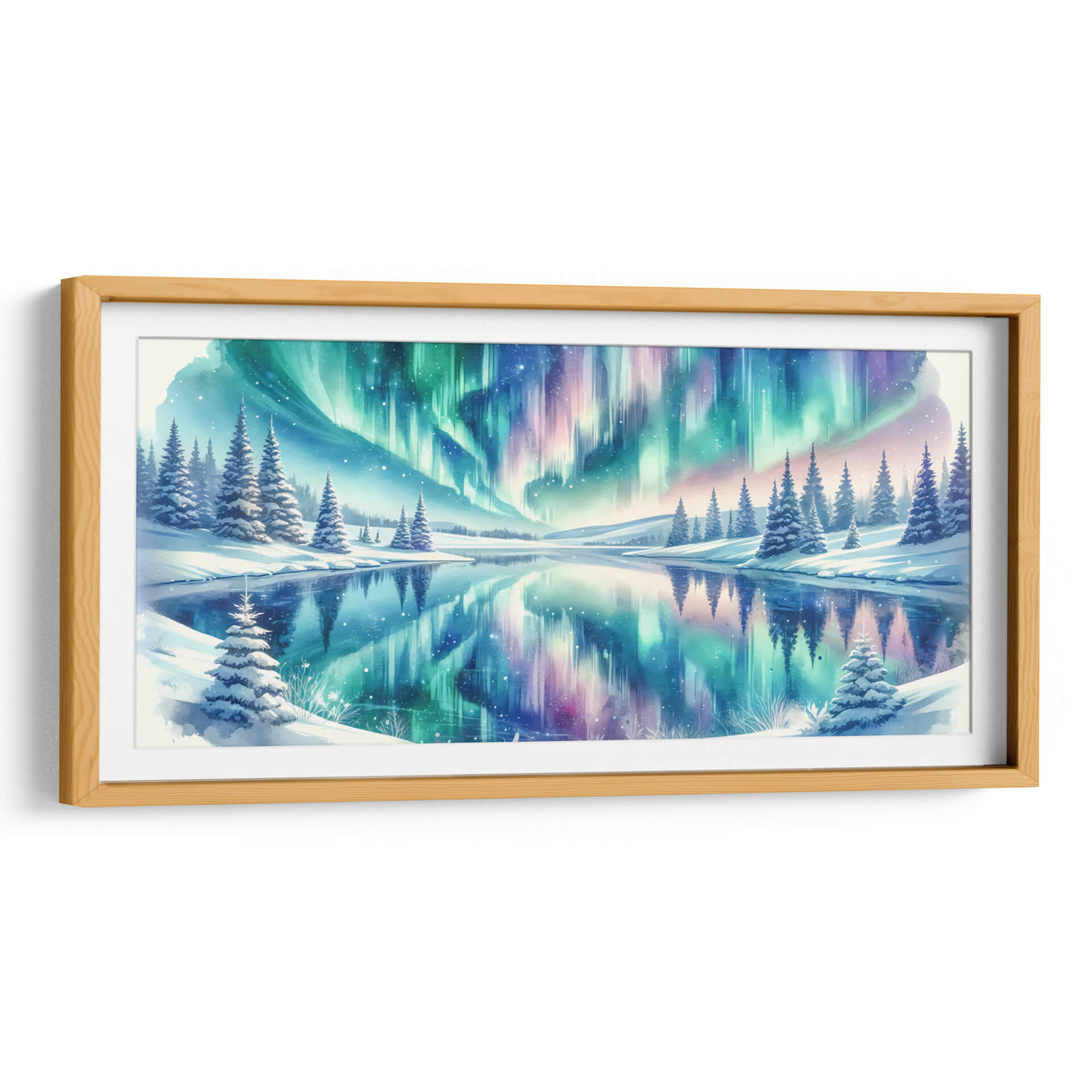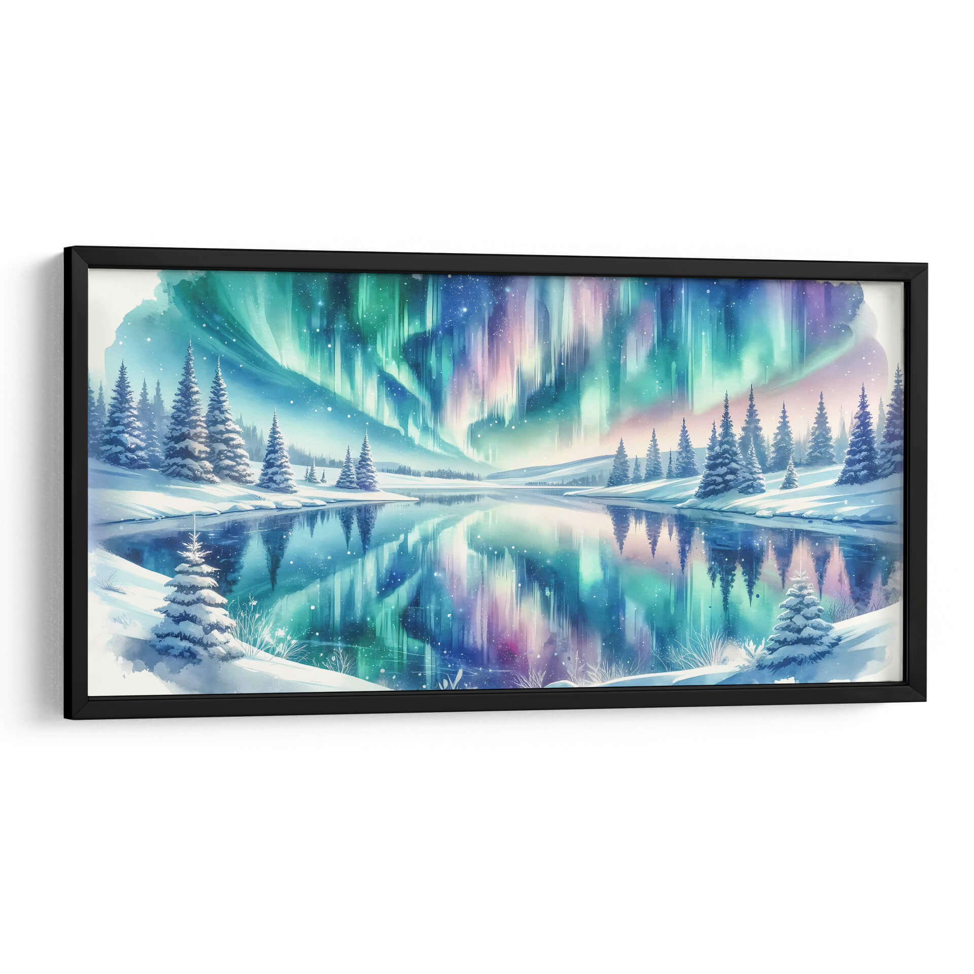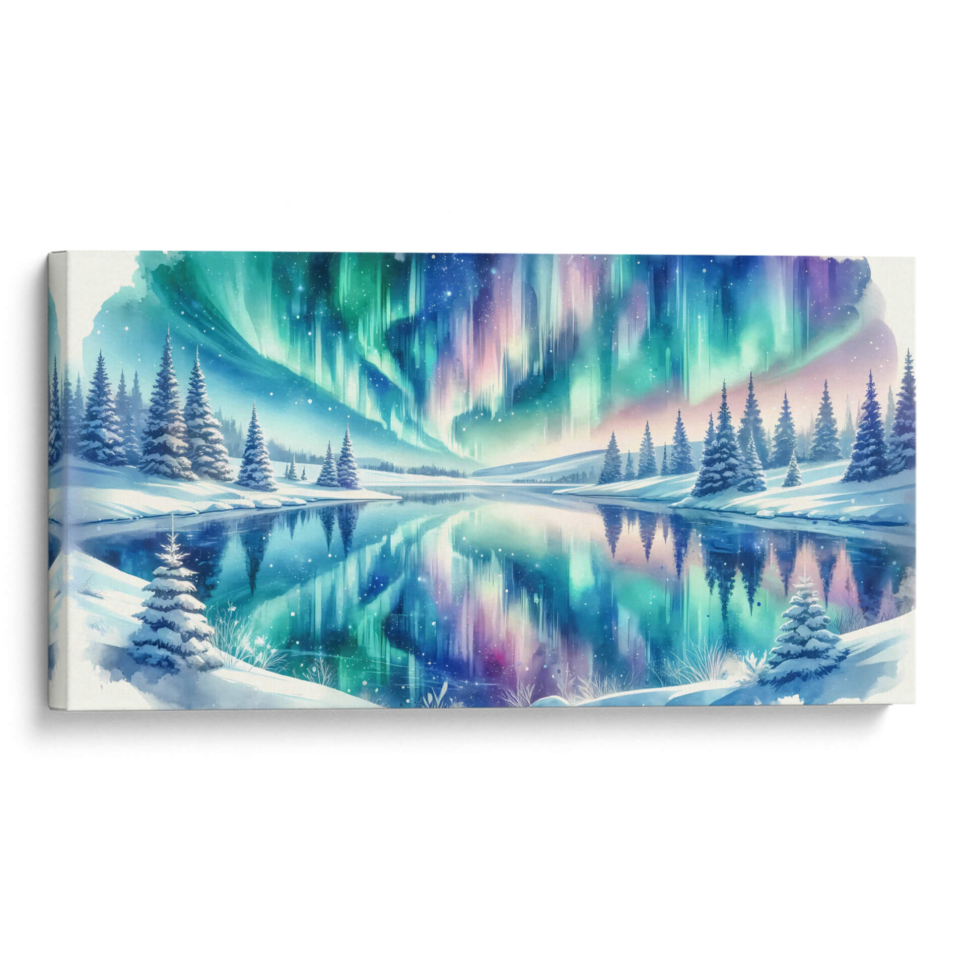 Sumérgete en la mágica danza de luces celestiales con este cautivador cuadro decorativo 'Aurora Boreal en Lago'. La obra captura la majestuosidad de la aurora boreal en todo su esplendor, proyectando vibrantes tonos de verde esmeralda, azul profundo y toques de púrpura y rosa sobre un sereno lago helado. La composición refleja la intensidad del fenómeno natural en el agua tranquila, duplicando la belleza etérea y creando una atmósfera de asombro y paz invernal. Abetos cubiertos de nieve flanquean las orillas, añadiendo un toque de realismo a este paisaje onírico. El estilo, reminiscente de la acuarela digital, dota a la escena de una suavidad y fluidez únicas, invitando a la contemplación. Este cuadro es ideal para infundir calma y un toque de maravilla a cualquier espacio, ya sea tu sala de estar, dormitorio o estudio, transformando tu hogar en un santuario de serenidad natural. La paleta de colores fríos y brillantes lo convierte en una pieza versátil que complementa decoraciones modernas y tradicionales, aportando un punto focal de ensueño y sofisticación.