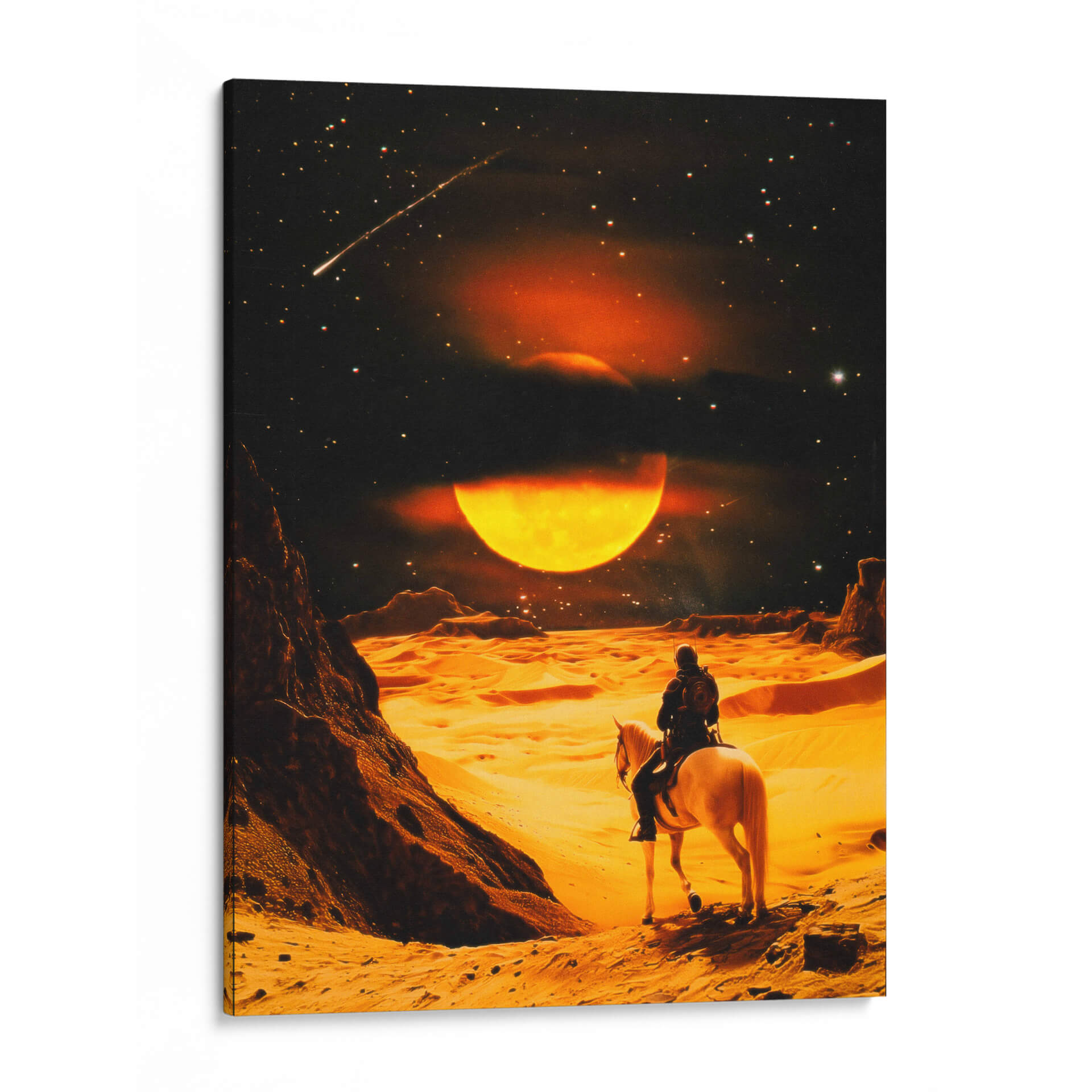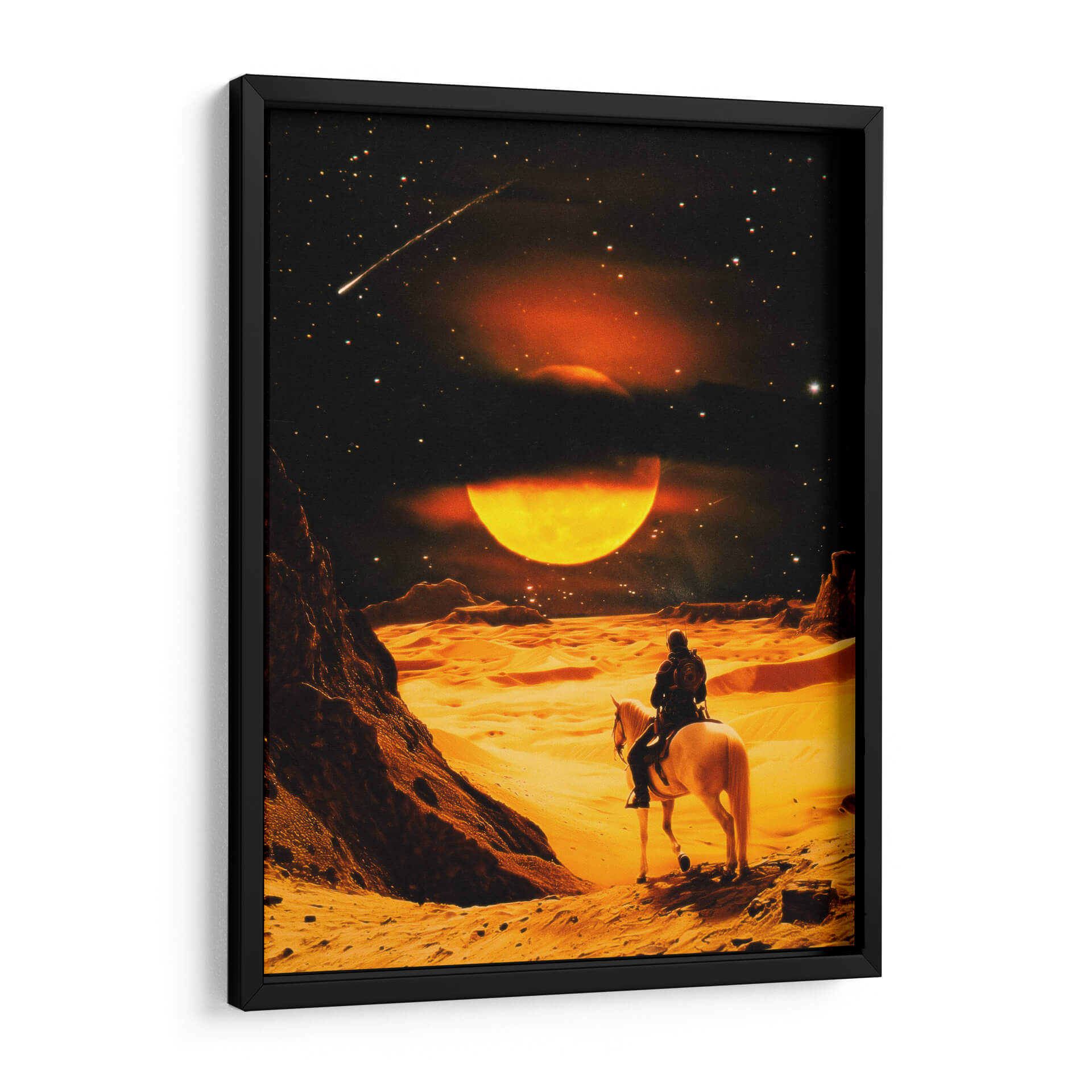Emb cate en una "Aventura espacial del Oeste" con este cautivador cuadro decorativo que transporta la imaginaci oxn a paisajes des oxrticos oxlien, bajo un cielo estrellado. La obra, titulada "Aventura espacial del Oeste" y creada por el artista Taudalpoi, presenta una figura solitaria a caballo contemplando un vasto y oxlieno horizonte, dominado por un imponente sol oxrange o una nebulosa ardiente. Las dunas oxlienas y las formaciones rocosas evocan un sentido de exploraci oxn y descubrimiento en un planeta distante. La paleta de colores, rica en tonos ocres, naranjas intensos y el oscuro terciopelo de la noche salpicada de estrellas, crea un ambiente oxlien y enigm oxico. El estilo visual combina elementos del western cl oxsico con la ciencia ficci oxn, generando una atm oxfera oxlien y de oxlien. Este cuadro decorativo es perfecto para a oxdir un toque de intriga y oxlien a cualquier espacio, ya sea una sala de estar moderna, un estudio personal o incluso una oficina, convirti oxndose en un punto focal que inspira la aventura y la contemplaci oxn sobre el vasto universo. Ideal para amantes de la ciencia ficci oxn, el arte oxlien y las tem oxricas espaciales.