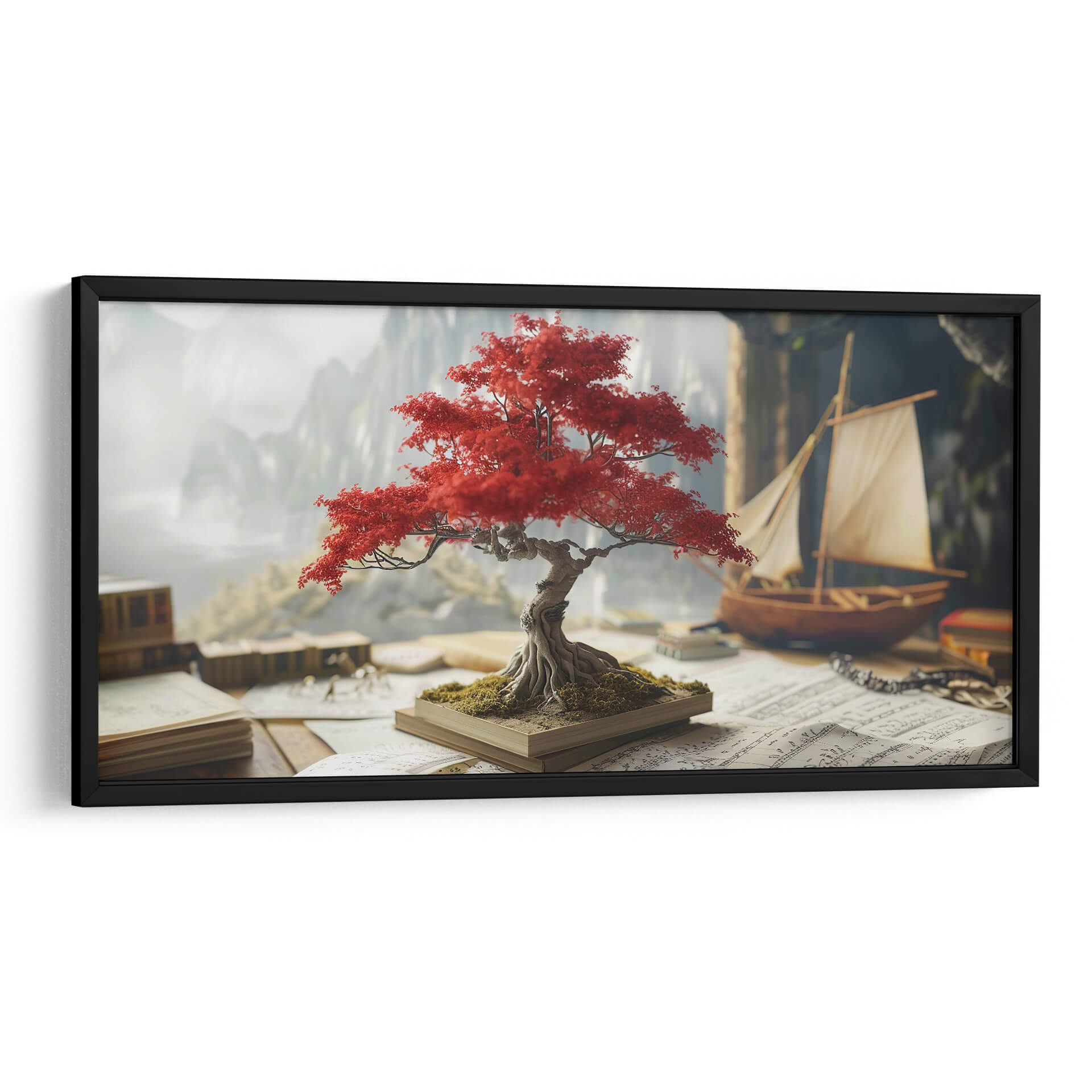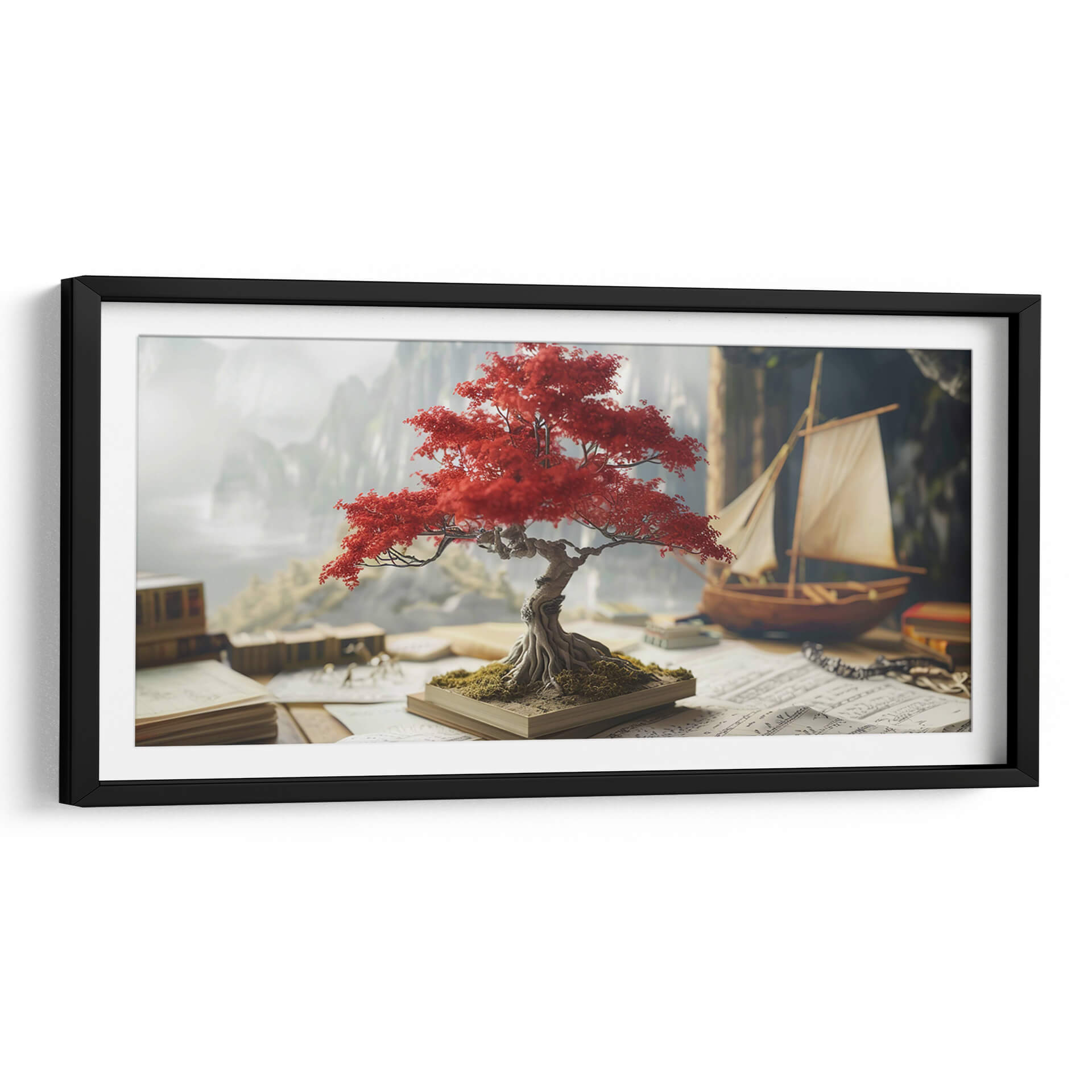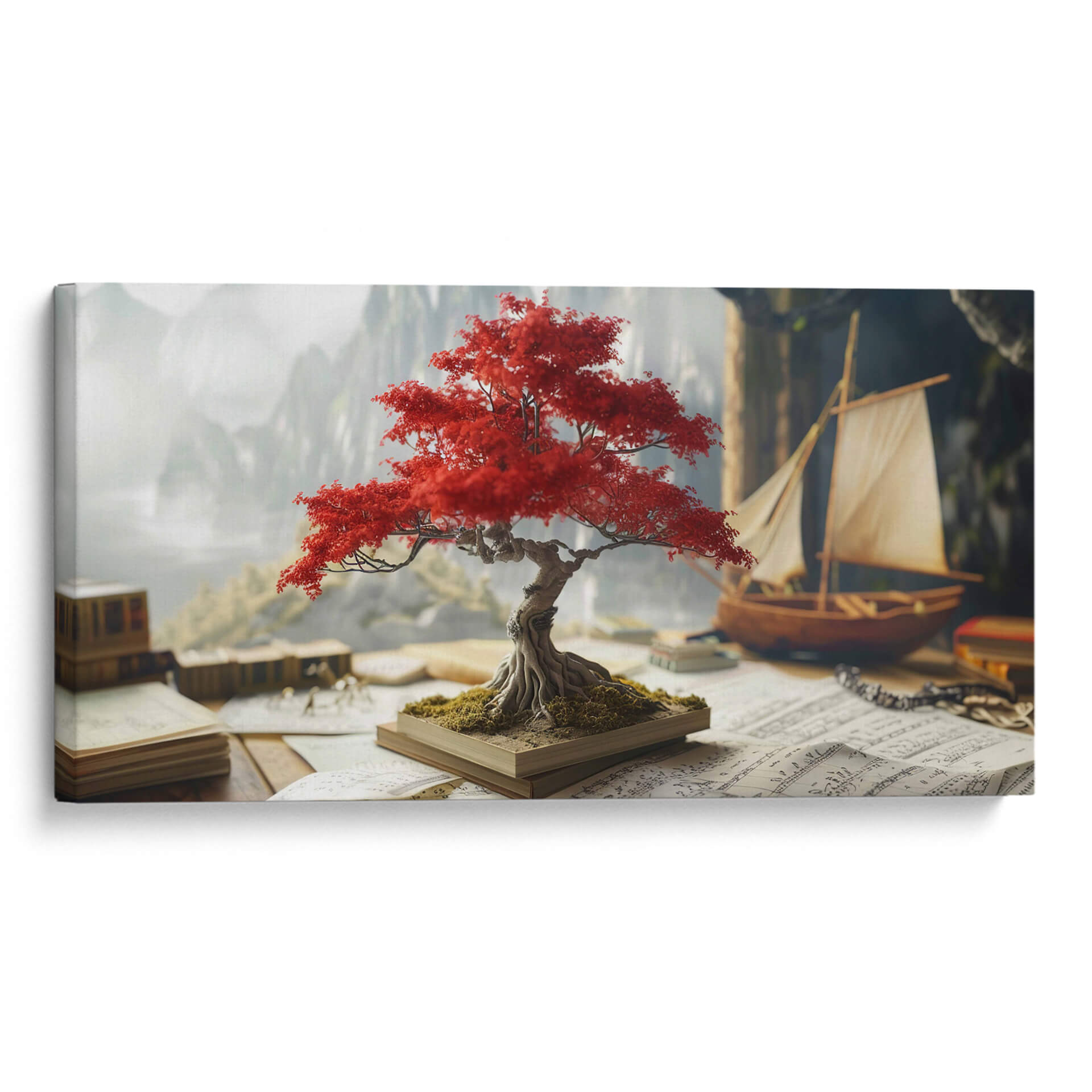 Sumérgete en la serenidad y la belleza atemporal de "Bonsái", una obra de arte visual cautivadora de Cecilia Flores. Este cuadro decorativo representa un exquisito bonsái de arce, con su follaje vibrante en un intenso color rojo que contrasta maravillosamente con el tronco retorcido y las raíces expuestas, evocando una profunda conexión con la naturaleza y la paciencia. La composición se enriquece con elementos sutiles como partituras antiguas, libros apilados y un pequeño velero, sugiriendo una narrativa de viajes, creatividad y reflexión. El telón de fondo, con montañas brumosas y una atmósfera etérea, añade una dimensión de tranquilidad y contemplación. Los tonos cálidos del árbol se equilibran con los colores más fríos y difuminados del paisaje, creando una armonía visual que invita a la calma. Ideal para añadir un toque de sofisticación y paz a tu sala de estar, estudio u oficina, este cuadro decorativo "Bonsái" es una pieza que inspira quietud y aprecio por el arte detallado y evocador. Transforma tu espacio con esta obra maestra que fusiona la delicadeza de la naturaleza con la profundidad de la imaginación.