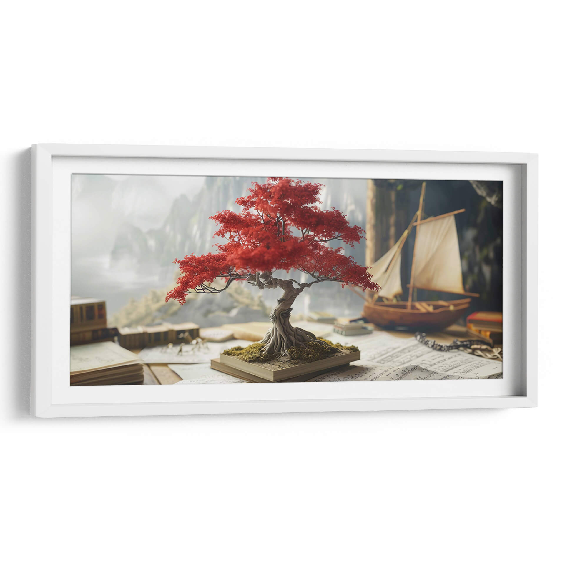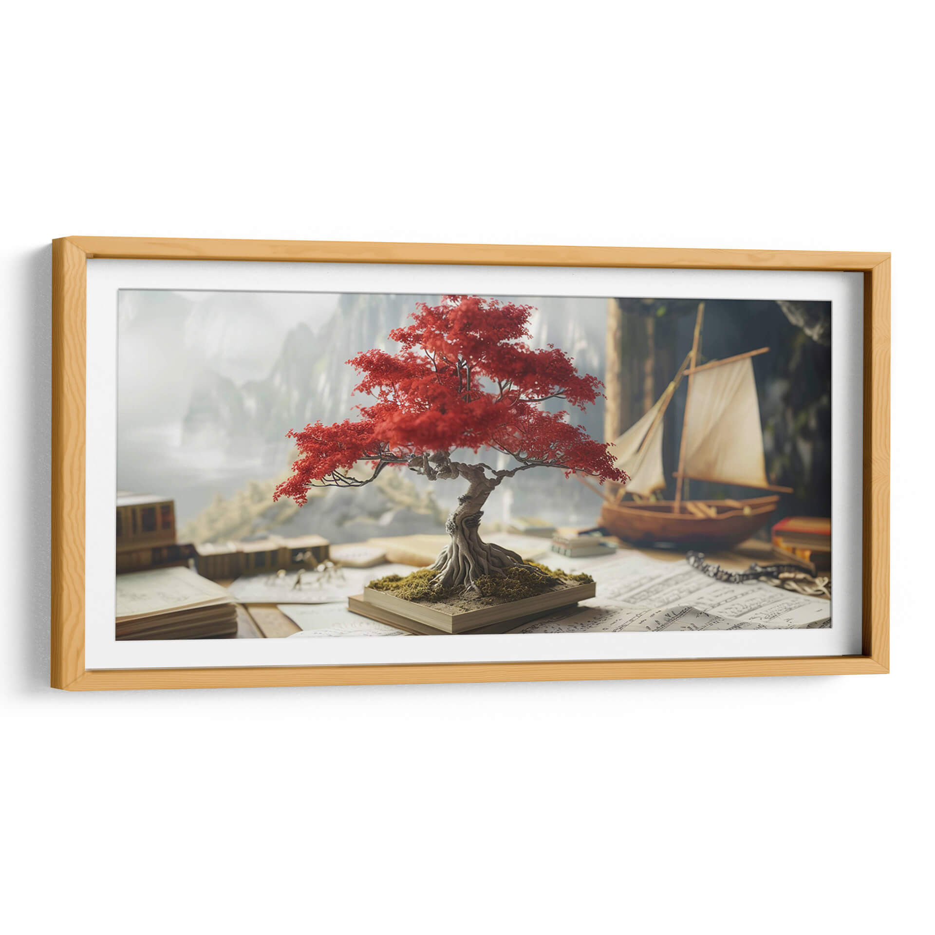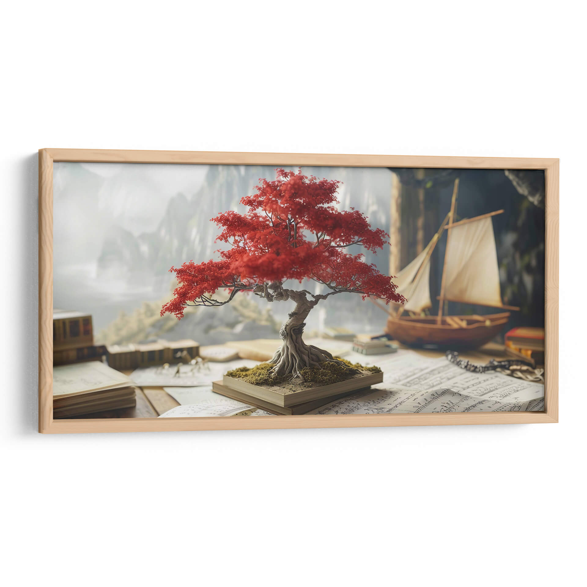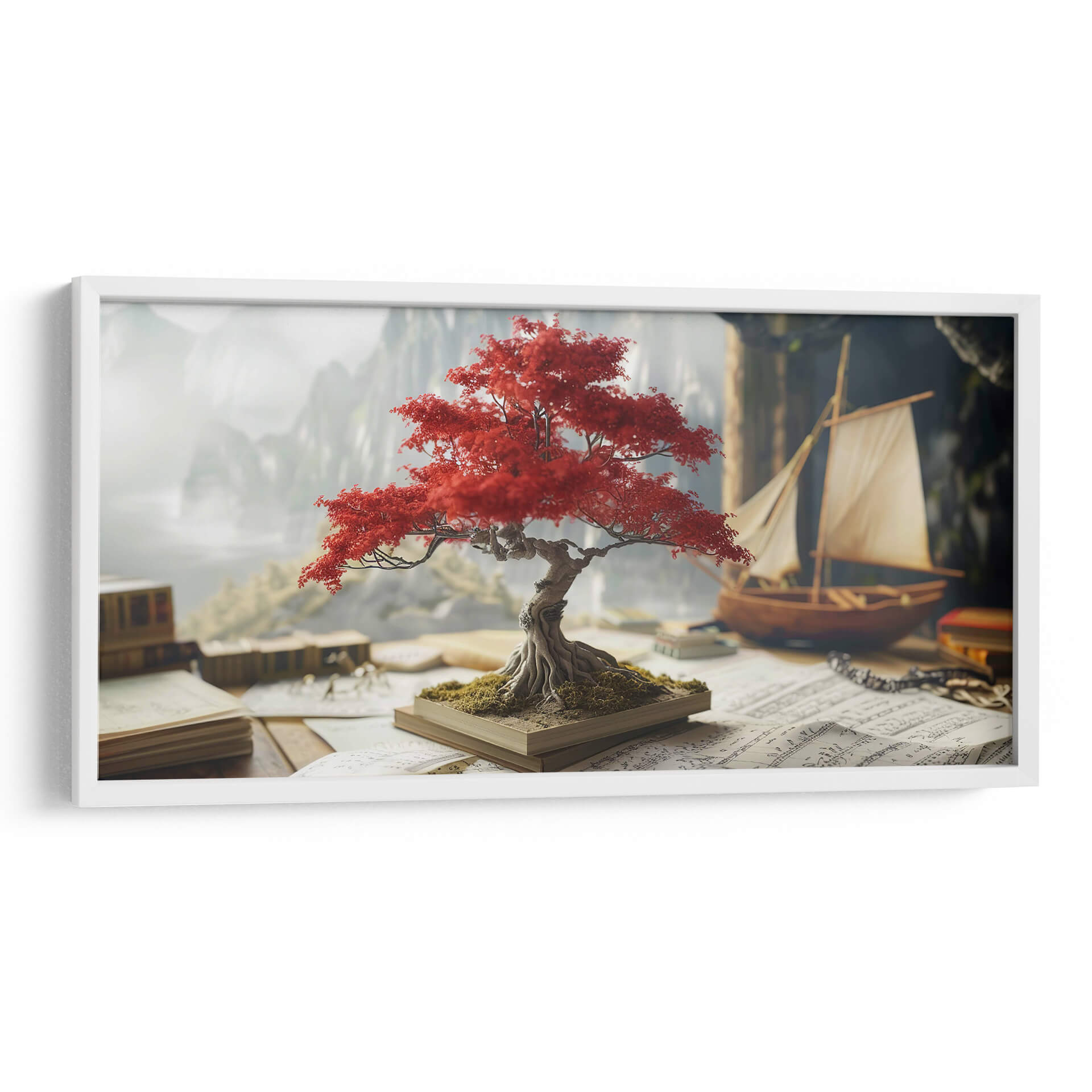 Sumérgete en la serenidad y la belleza atemporal de "Bonsái", una obra de arte visual cautivadora de Cecilia Flores. Este cuadro decorativo representa un exquisito bonsái de arce, con su follaje vibrante en un intenso color rojo que contrasta maravillosamente con el tronco retorcido y las raíces expuestas, evocando una profunda conexión con la naturaleza y la paciencia. La composición se enriquece con elementos sutiles como partituras antiguas, libros apilados y un pequeño velero, sugiriendo una narrativa de viajes, creatividad y reflexión. El telón de fondo, con montañas brumosas y una atmósfera etérea, añade una dimensión de tranquilidad y contemplación. Los tonos cálidos del árbol se equilibran con los colores más fríos y difuminados del paisaje, creando una armonía visual que invita a la calma. Ideal para añadir un toque de sofisticación y paz a tu sala de estar, estudio u oficina, este cuadro decorativo "Bonsái" es una pieza que inspira quietud y aprecio por el arte detallado y evocador. Transforma tu espacio con esta obra maestra que fusiona la delicadeza de la naturaleza con la profundidad de la imaginación.