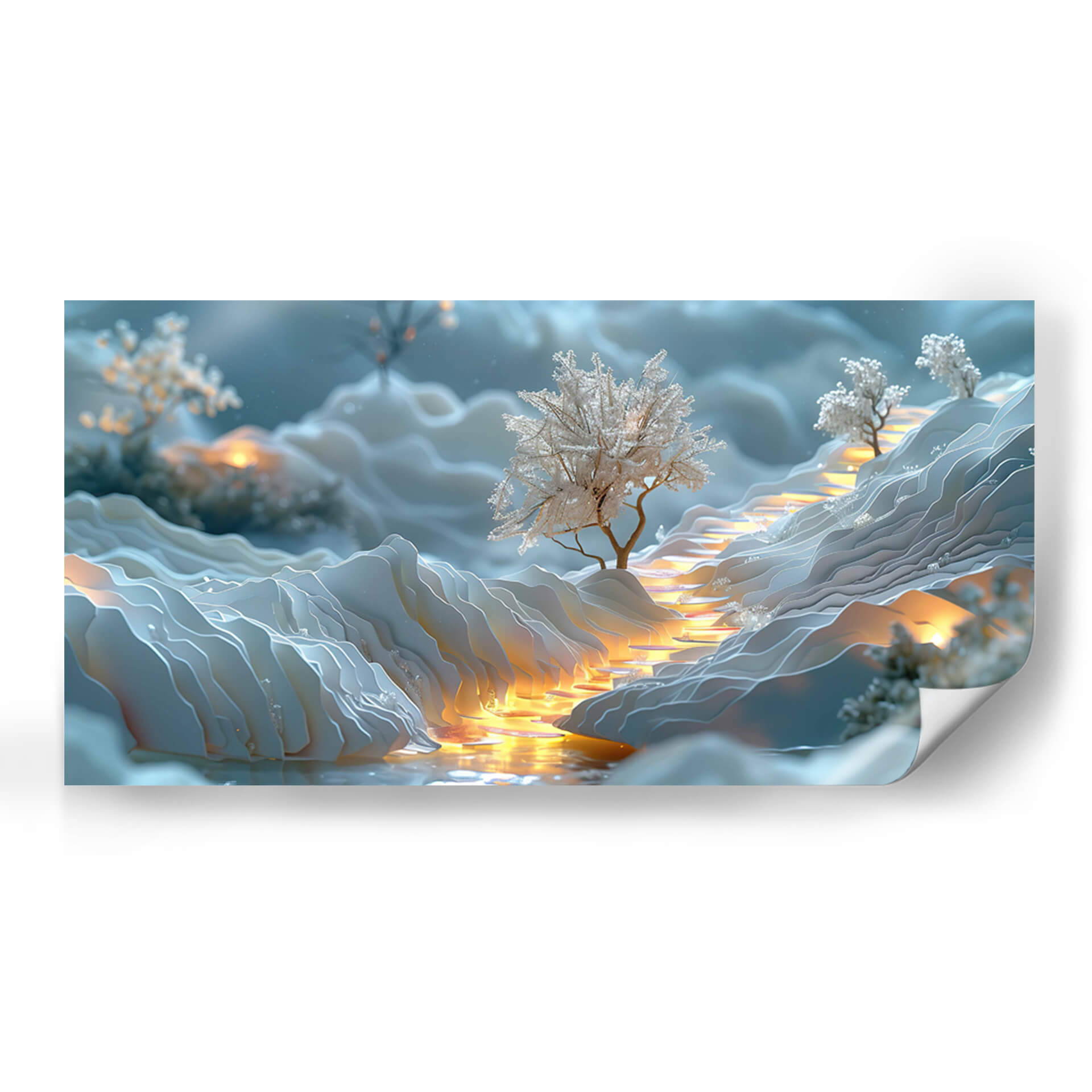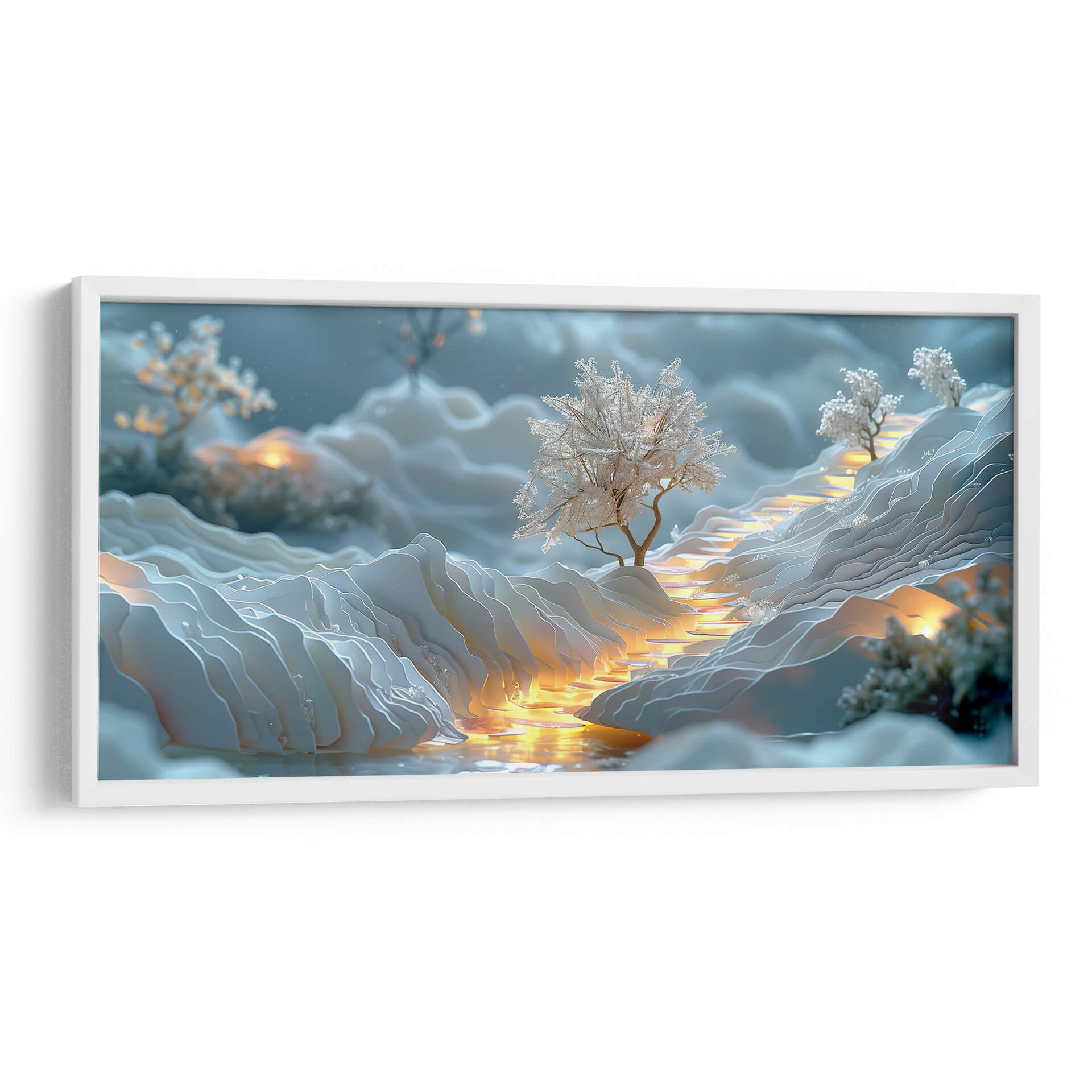 Sumérgete en la serena belleza de "Bosque Blanco" de Cecilia Flores, una obra de arte digital que captura la magia etérea de un paisaje invernal bañado por una luz dorada y cálida. Este cuadro decorativo presenta un camino sinuoso que serpentea entre montañas de formas suaves y onduladas, cubiertas por una delicada capa de nieve que parece cristalina. Los árboles, con sus ramas finas y detalladas, evocan la delicadeza de la escarcha, contrastando con el vibrante resplandor que emana del sendero acuático, creando una atmósfera de ensueño y tranquilidad. La paleta de colores, dominada por blancos puros, azules fríos y toques cálidos de ámbar y naranja, genera un equilibrio visual cautivador que invita a la contemplación y la paz interior. "Bosque Blanco" es una pieza ideal para quienes buscan infundir calma y sofisticación en sus espacios, ya sea en un dormitorio acogedor, un estudio personal o una sala de estar moderna que necesite un toque de naturaleza y serenidad. Su estilo único, que fusiona elementos realistas con toques fantásticos, convierte a este cuadro decorativo en un punto focal que despierta la imaginación y ofrece una ventana a un mundo de fantasía invernal.