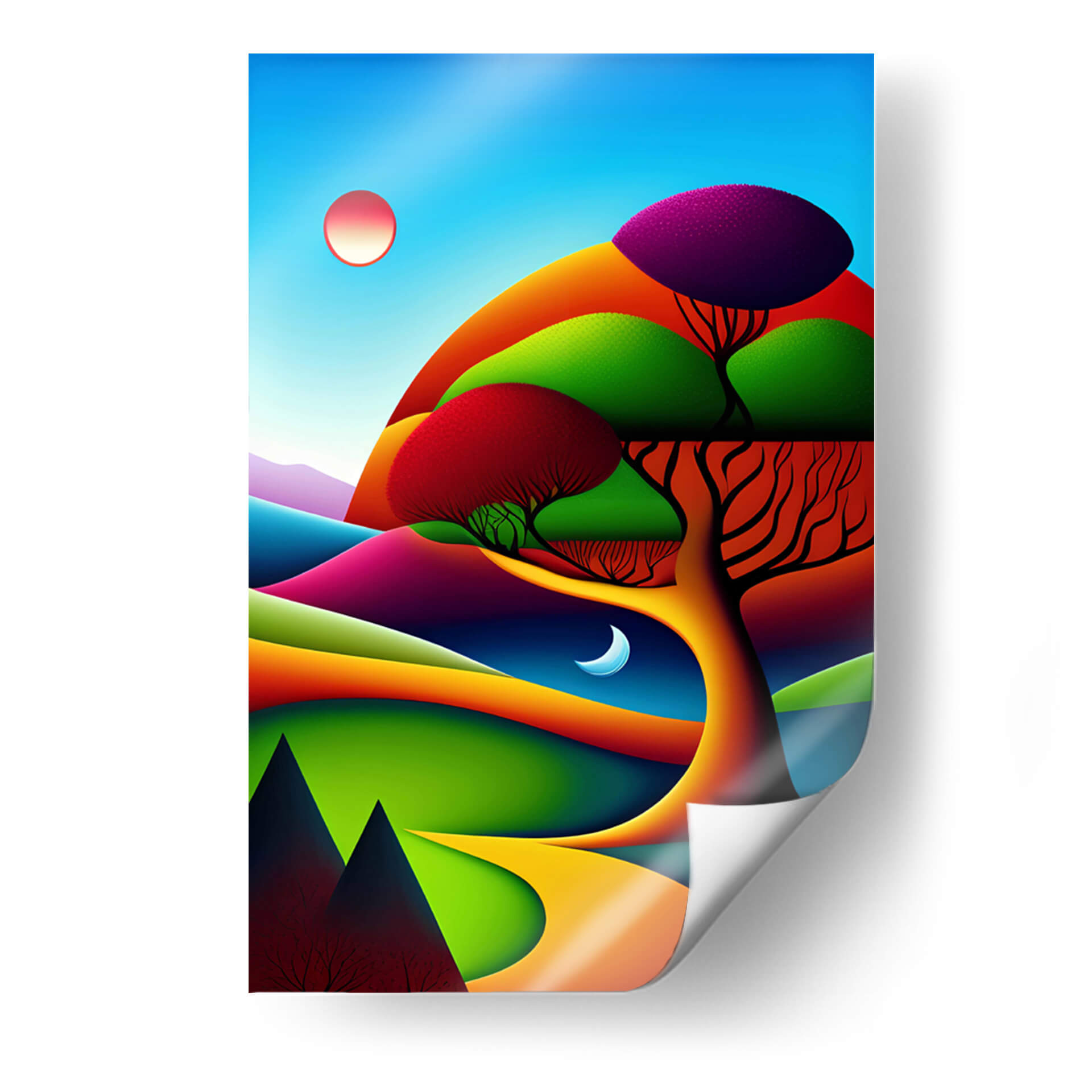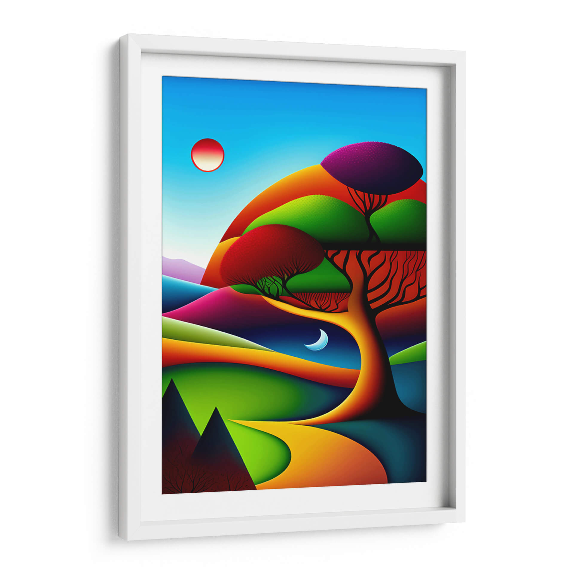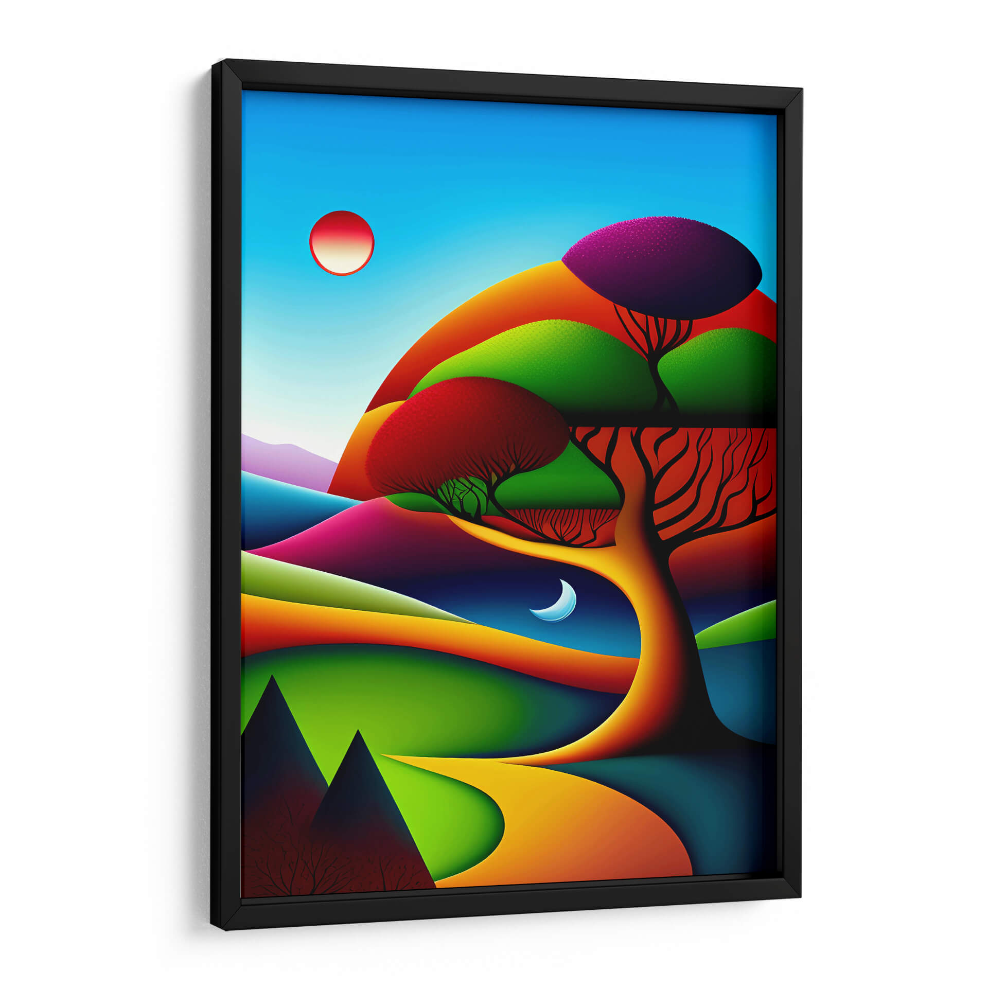 Sumérgete en la enigmática belleza de "Bosque de Lunas", una obra de arte digital que te transportará a un paisaje onírico y vibrante. Esta pieza, creada por DEA Digital Esoteric Art, desafía la percepción con su audaz paleta de colores y formas estilizadas. Montañas ondulantes en tonos naranjas, verdes y púrpuras se mecen bajo un cielo azul intenso, coronado por un sol rojo y un místico creciente lunar. Un árbol central, con ramas oscuras que se extienden como venas, actúa como nexo entre el cielo y la tierra, atrayendo la mirada hacia un camino sinuoso que invita a la exploración. La composición abstracta y las transiciones de color suaves crean una atmósfera de serenidad y misterio, perfecta para infundir calma y sofisticación en cualquier espacio. Este cuadro decorativo contemporáneo es ideal para salas de estar modernas, dormitorios acogedores u oficinas que buscan un toque de originalidad y energía positiva. Deja que "Bosque de Lunas" sea el punto focal que inspire conversaciones y enriquezca tu hogar con su singular visión artística.