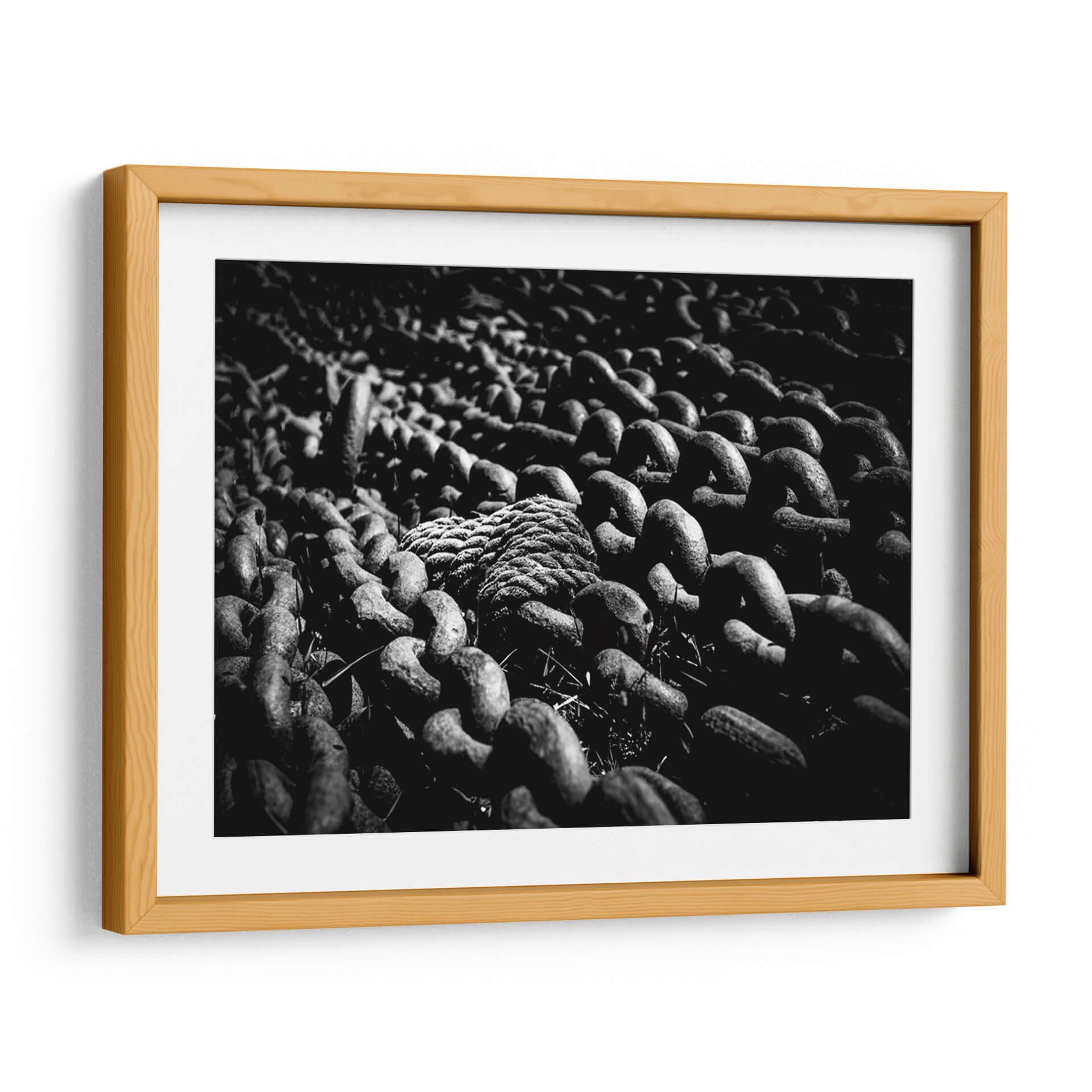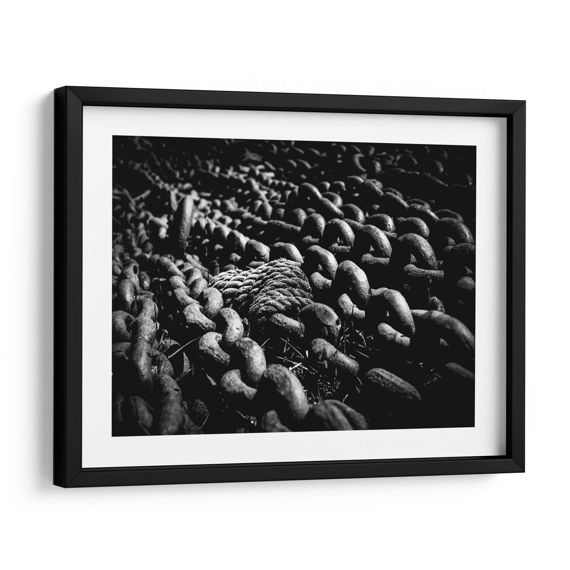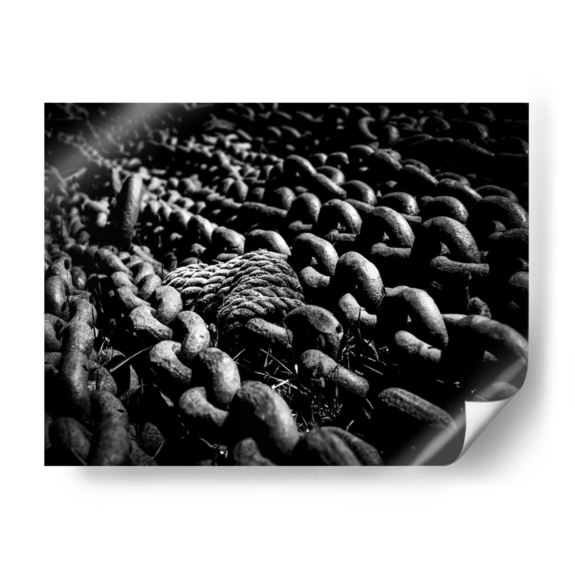 Sumérgete en la potencia visual de "Cadenas", una obra de arte impactante del artista Carlos Montaño. Esta pieza, capturada en una paleta de grises y negros, presenta un primer plano de gruesas cadenas metálicas entrelazadas, interrumpidas por la textura rugosa de una cuerda. La iluminación dramática crea profundos contrastes, resaltando la fuerza y la resistencia inherentes a estos elementos industriales. La composición, con un enfoque nítido en el primer plano y un desenfoque gradual hacia el fondo, guía la mirada del espectador a través de la intrincada textura y el peso visual de las cadenas. "Cadenas" evoca una sensación de solidez, historia y el poder de la conexión, a la vez que sugiere un toque de misterio y fortaleza. Este cuadro decorativo es ideal para espacios que buscan un aire de carácter industrial, fuerza o un simbolismo profundo. Su estética monocromática y su composición audaz lo convierten en una pieza versátil, perfecta para salas de estar modernas, oficinas ejecutivas o cualquier lugar donde se desee añadir un elemento de conversación con un toque de dramatismo y profundidad. Explora la intensidad y la narrativa de esta obra única que trasciende su aparente simplicidad para ofrecer una reflexión sobre la unión y la perseverancia.
