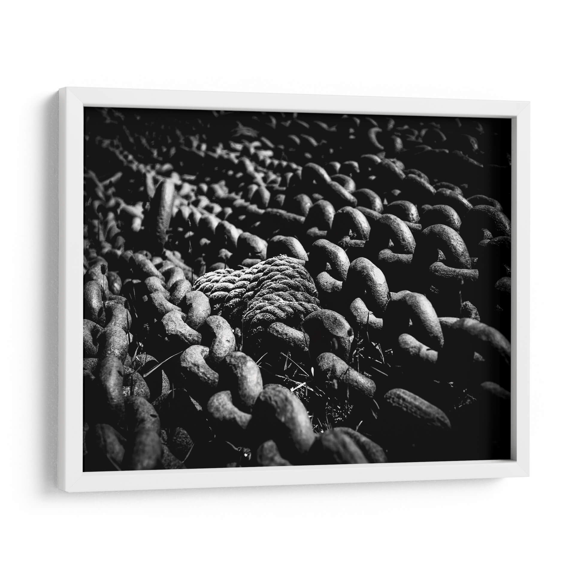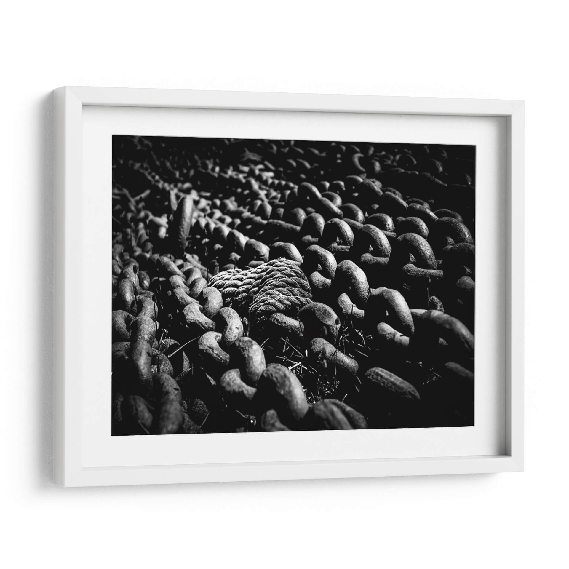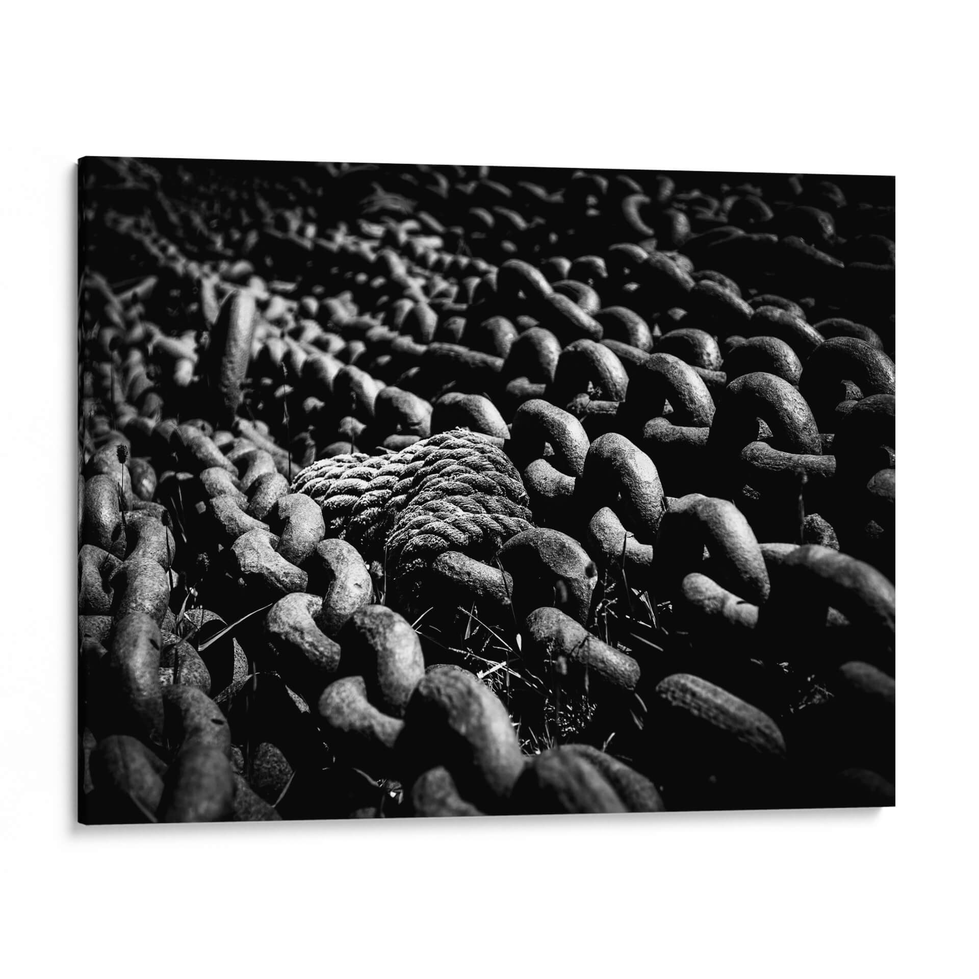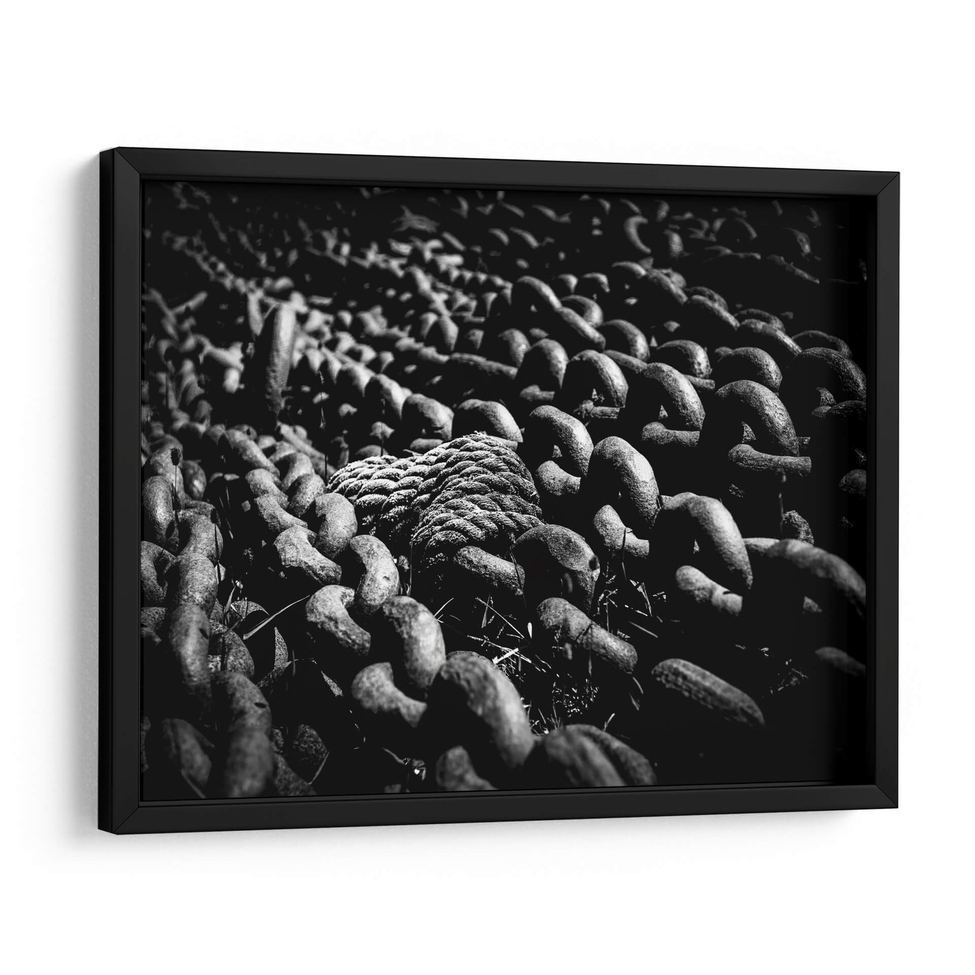Sumérgete en la potencia visual de "Cadenas", una obra de arte impactante del artista Carlos Montaño. Esta pieza, capturada en una paleta de grises y negros, presenta un primer plano de gruesas cadenas metálicas entrelazadas, interrumpidas por la textura rugosa de una cuerda. La iluminación dramática crea profundos contrastes, resaltando la fuerza y la resistencia inherentes a estos elementos industriales. La composición, con un enfoque nítido en el primer plano y un desenfoque gradual hacia el fondo, guía la mirada del espectador a través de la intrincada textura y el peso visual de las cadenas. "Cadenas" evoca una sensación de solidez, historia y el poder de la conexión, a la vez que sugiere un toque de misterio y fortaleza. Este cuadro decorativo es ideal para espacios que buscan un aire de carácter industrial, fuerza o un simbolismo profundo. Su estética monocromática y su composición audaz lo convierten en una pieza versátil, perfecta para salas de estar modernas, oficinas ejecutivas o cualquier lugar donde se desee añadir un elemento de conversación con un toque de dramatismo y profundidad. Explora la intensidad y la narrativa de esta obra única que trasciende su aparente simplicidad para ofrecer una reflexión sobre la unión y la perseverancia.