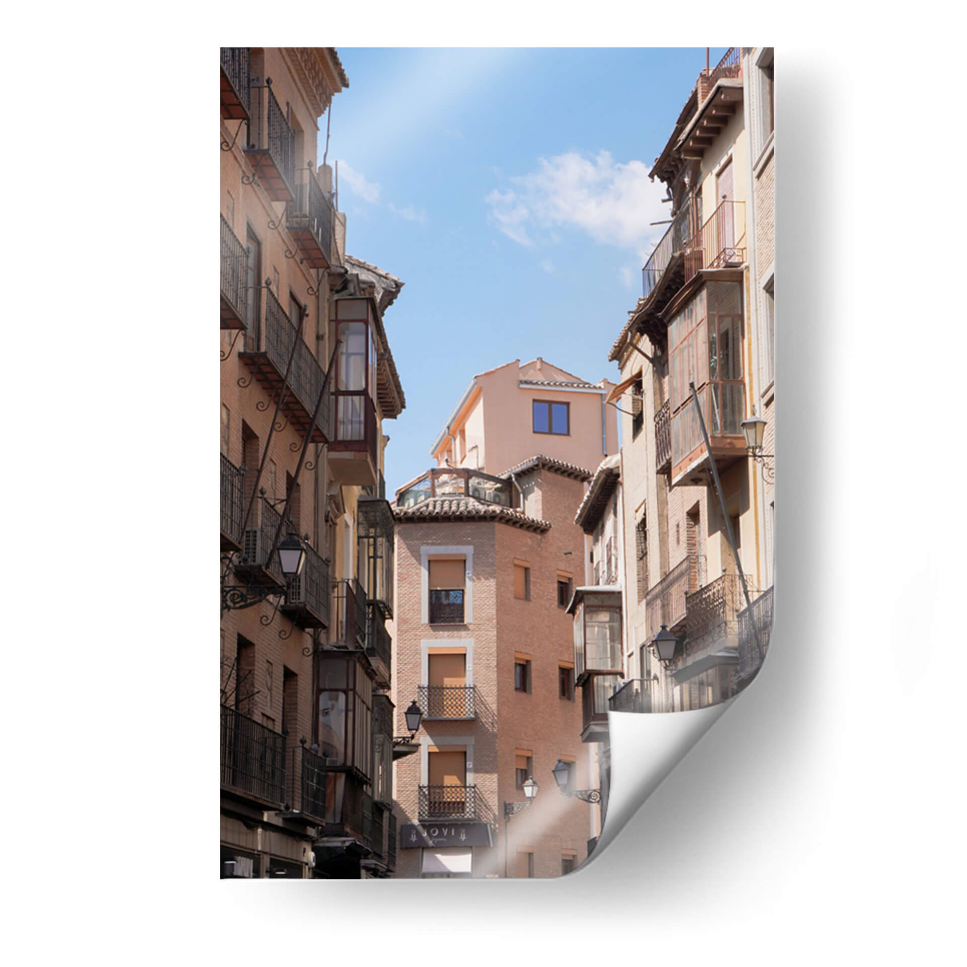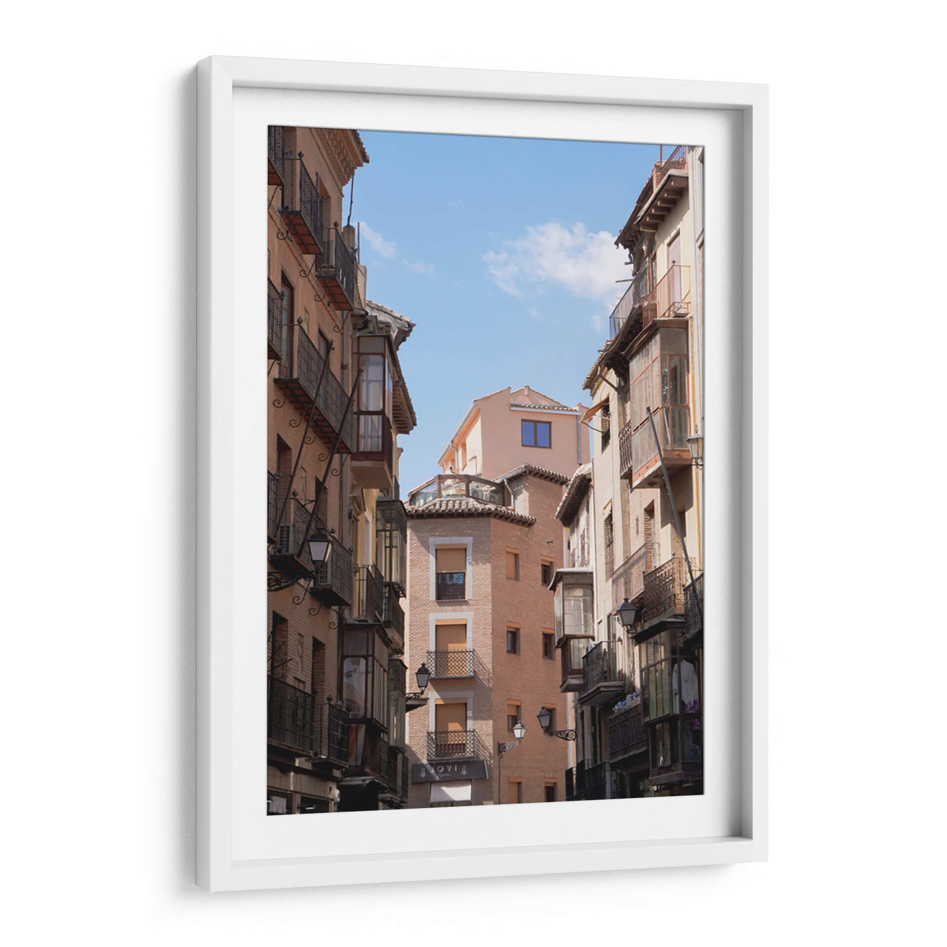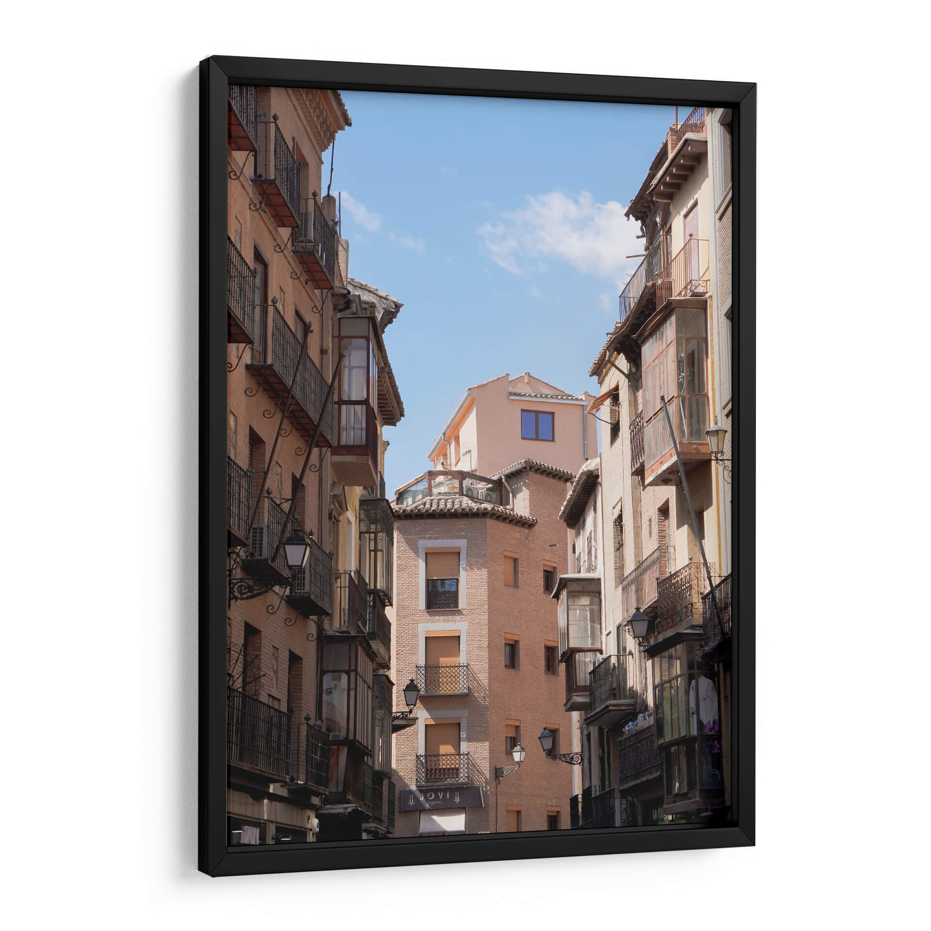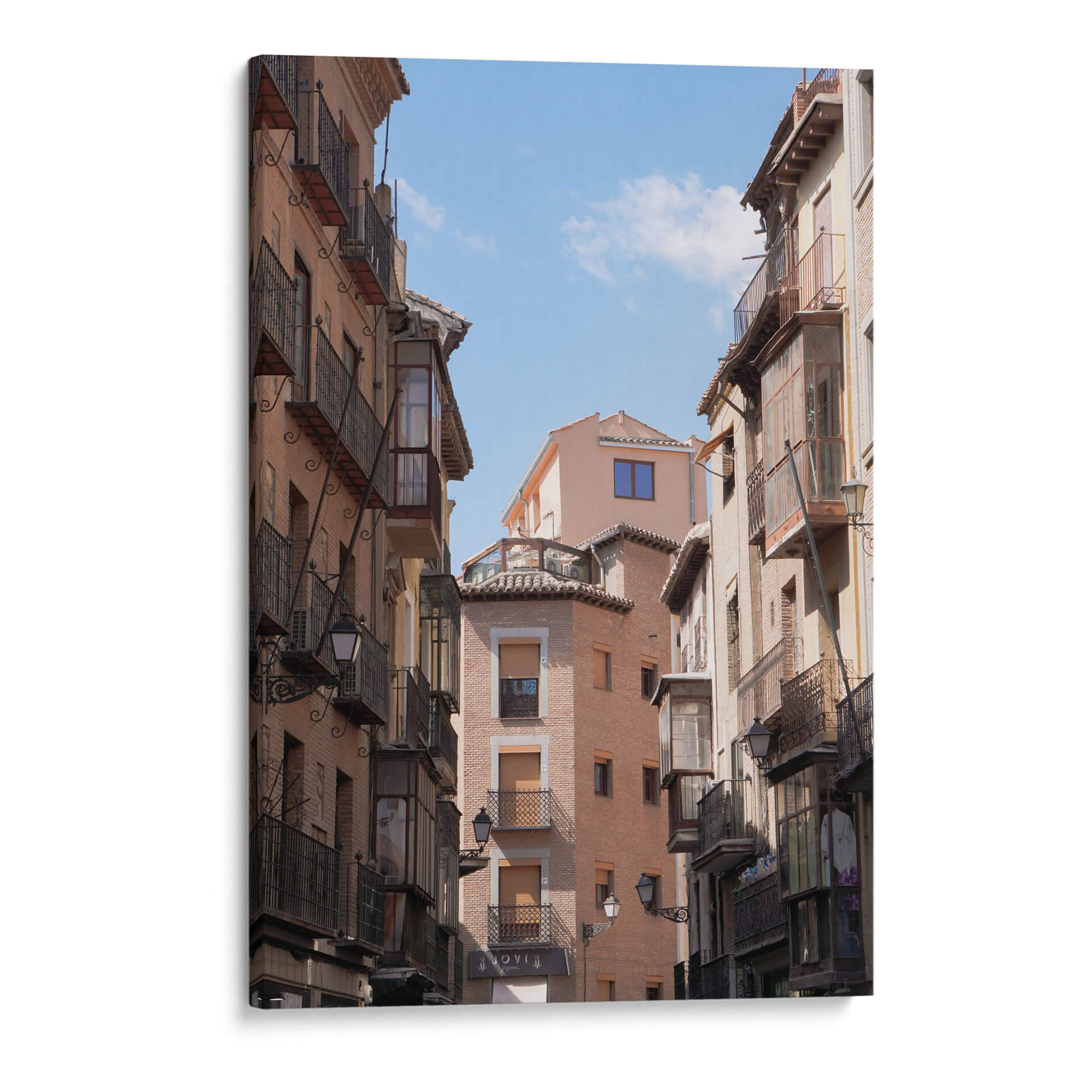 Sumérgete en la atmósfera encantadora de 'Café en Toledo', una obra de Christian Castro que captura la esencia de una callejuela española con un encanto arquitectónico atemporal. Este cuadro decorativo te transporta a un rincón pintoresco, donde los edificios de tonos cálidos se alzan hacia un cielo azul vibrante, salpicado de nubes etéreas. La composición, con sus edificios flanqueando la vista, crea una sensación de profundidad y perspectiva, invitando al espectador a pasear por esta escena urbana. Las texturas de los ladrillos y los detalles de los balcones de hierro forjado aportan un realismo cautivador, mientras que la luz del sol, que baña la escena, realza los volúmenes y crea juegos de sombras sutiles. Los colores terrosos y los acentos de azul del cielo componen una paleta equilibrada que evoca una sensación de calma y nostalgia, perfecta para añadir un toque de carácter y sofisticación a cualquier hogar u oficina. Este cuadro es ideal para espacios que buscan un aire de autenticidad y tradición, convirtiéndose en un punto focal que narra historias de viajes y momentos suspendidos en el tiempo, invitando a la contemplación y al disfrute de la belleza cotidiana.