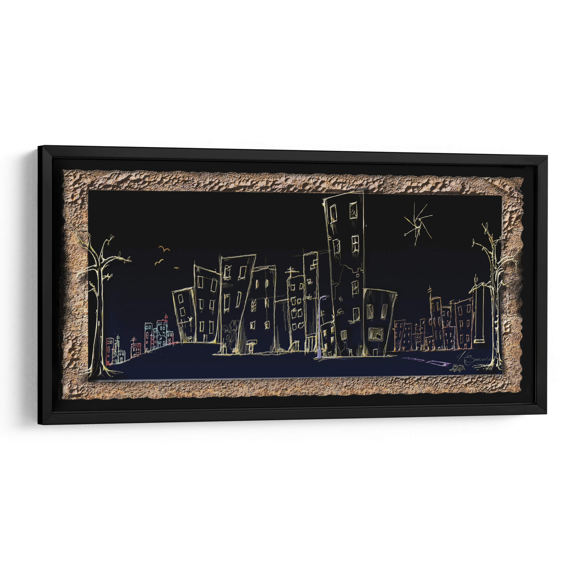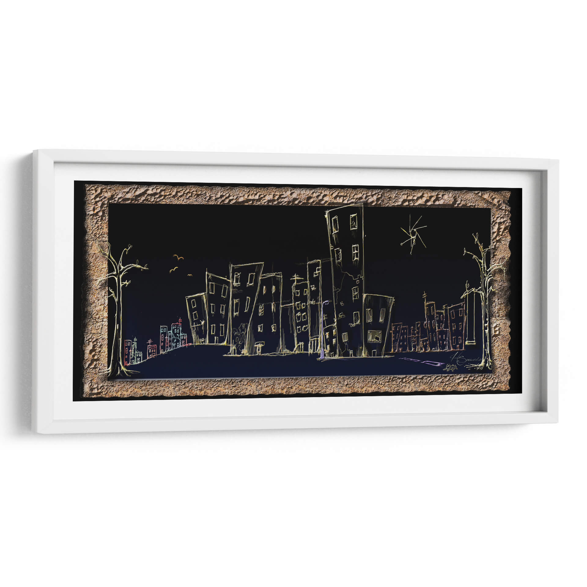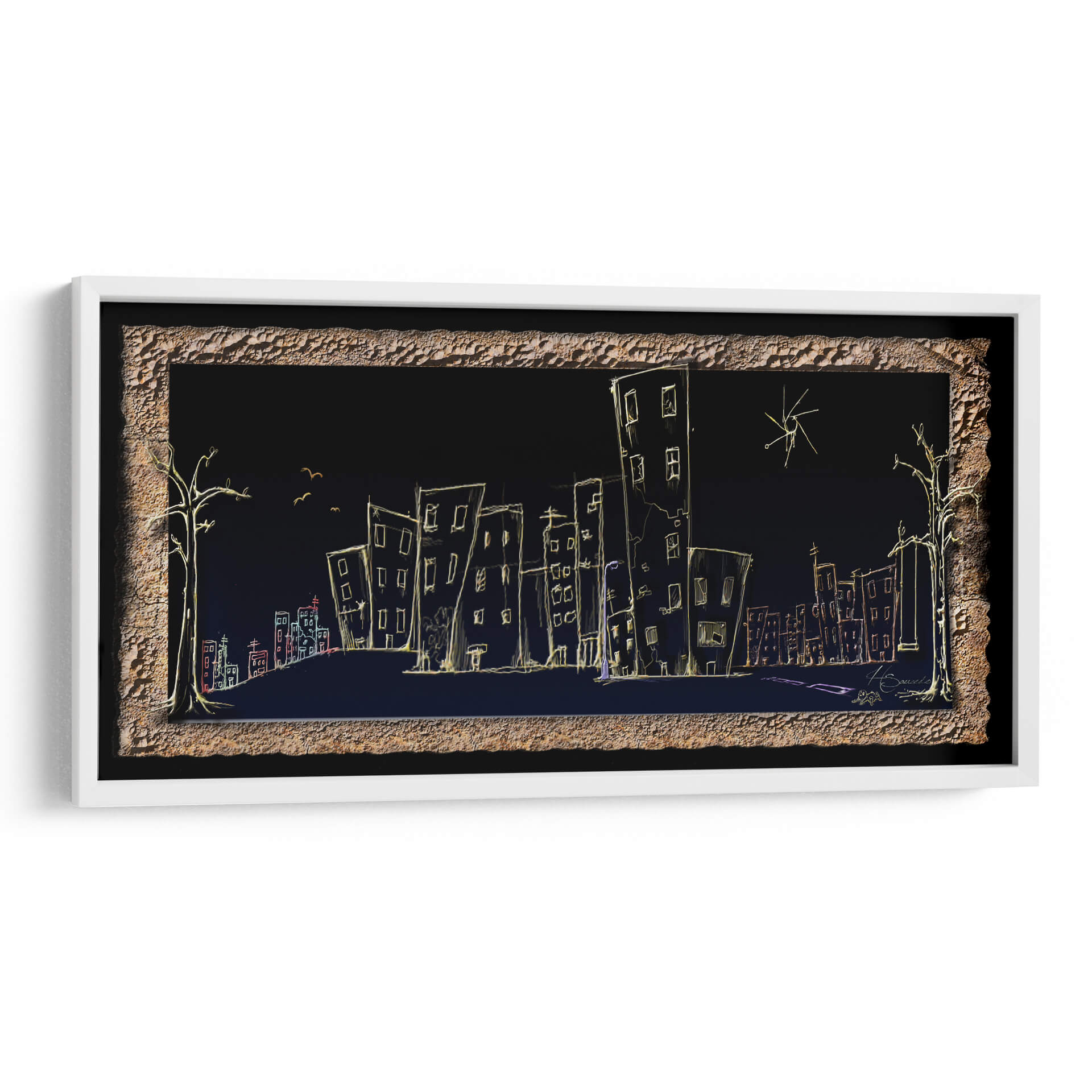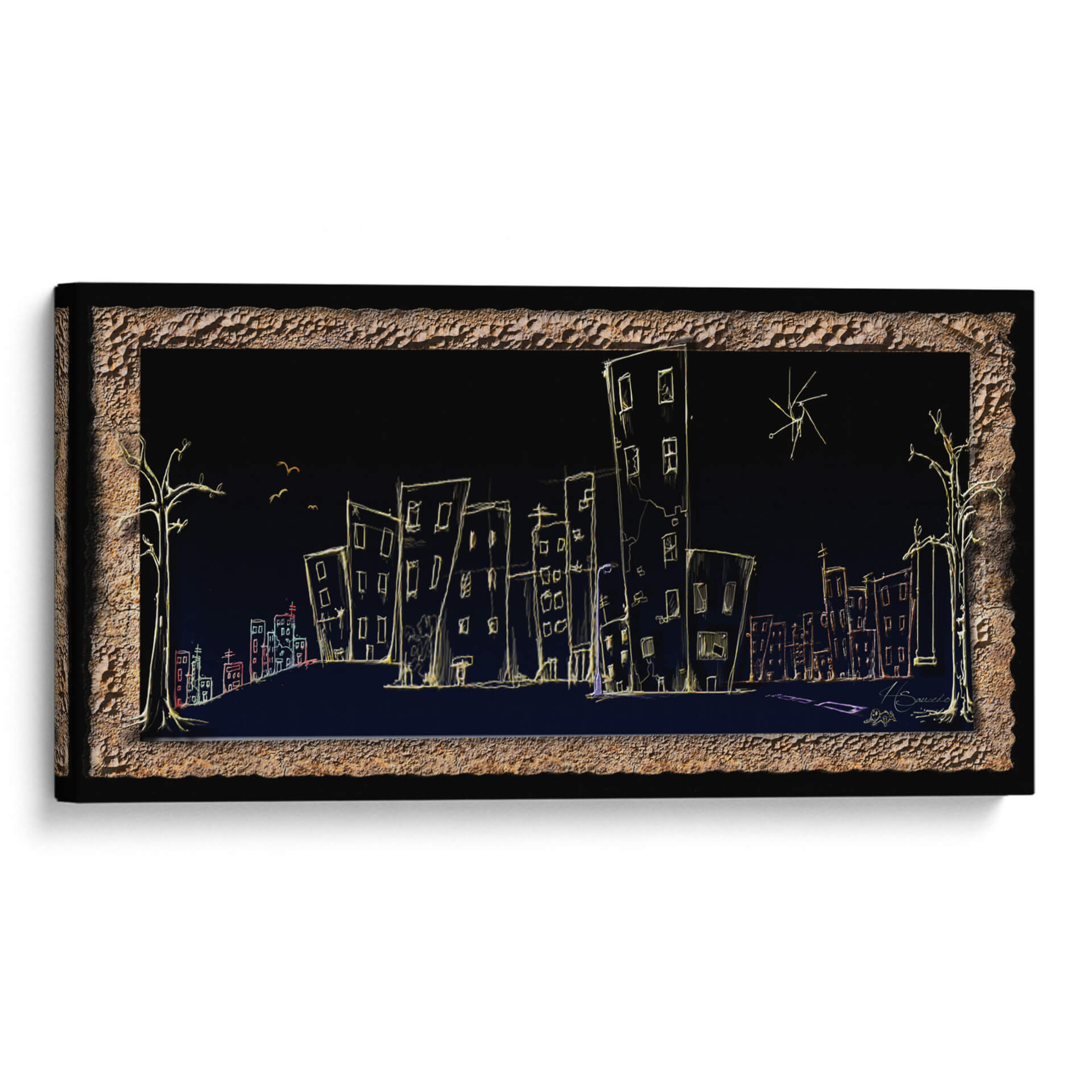 Sumérgete en la atmósfera onírica de "Calle", una obra de arte contemporáneo que captura la esencia de la vida urbana nocturna con un toque enigmático. El artista HSaucedo presenta una silueta de ciudad delineada con trazos luminosos sobre un fondo oscuro y profundo, creando un contraste cautivador. Edificios de formas esquemáticas, algunos inclinados y otros alargados, se alzan como testigos silenciosos de historias no contadas. Una paleta de colores sutil, dominada por el amarillo cálido de las luces y acentos de rojo y azul, evoca una sensación de misterio y tranquilidad a la vez. Los árboles estilizados a los lados y las pequeñas aves en vuelo añaden un toque surrealista, invitando a la contemplación. Esta pieza es ideal para quienes buscan infundir a sus espacios un aire de sofisticación moderna y un toque de ensueño. Perfecta para salones, estudios u oficinas, "Calle" es un cuadro decorativo que no solo embellece, sino que también invita a la reflexión sobre la belleza efímera de la ciudad y la quietud de la noche. Añade un elemento de intriga y estilo a tu decoración con esta pieza única.
