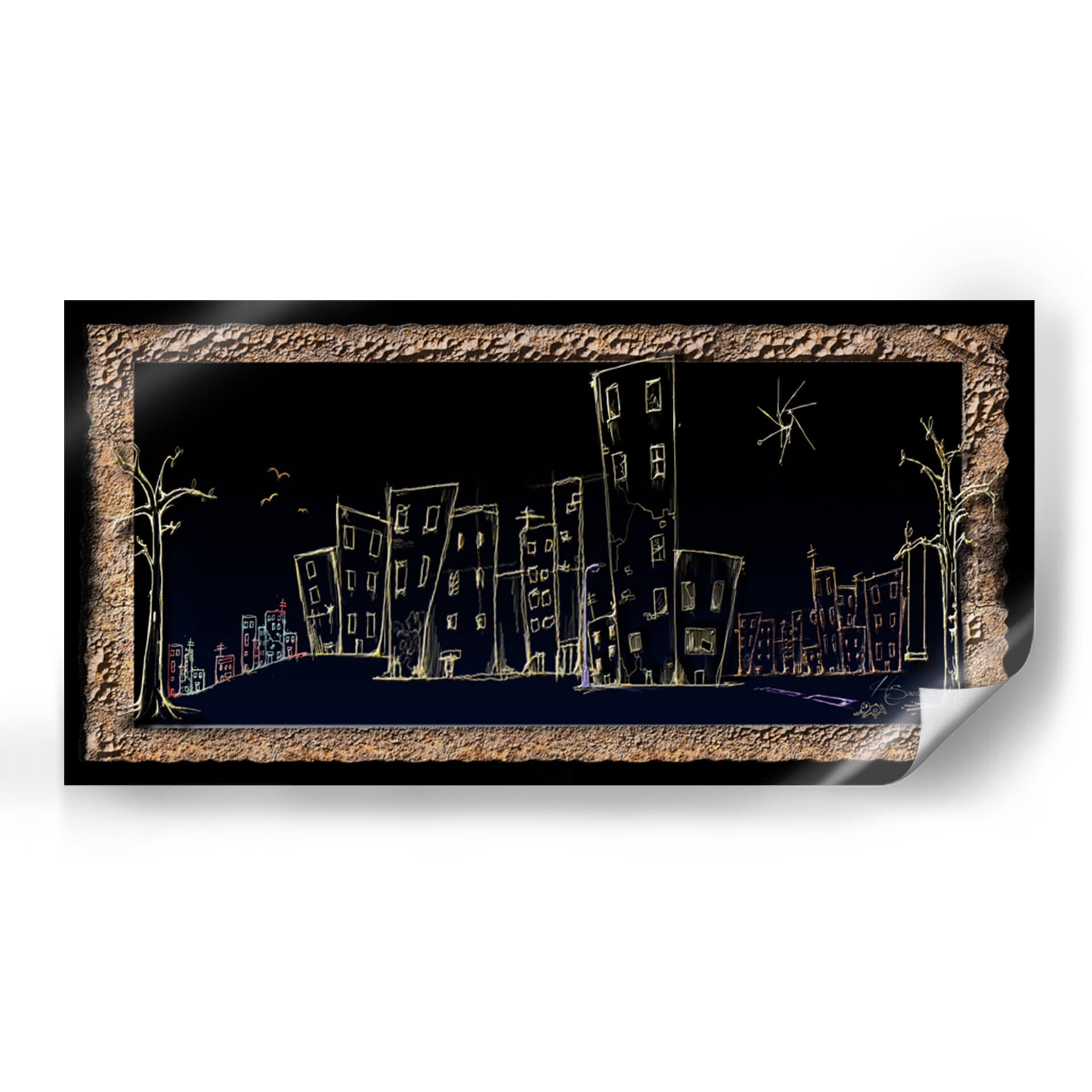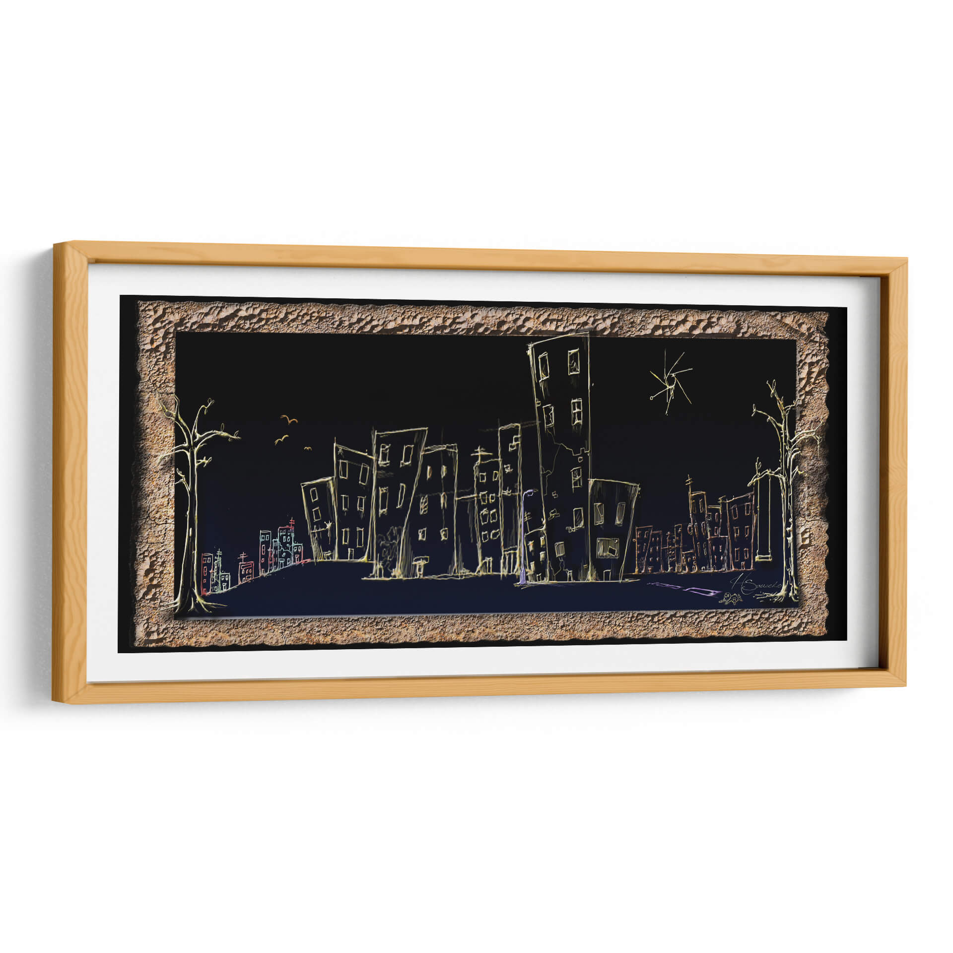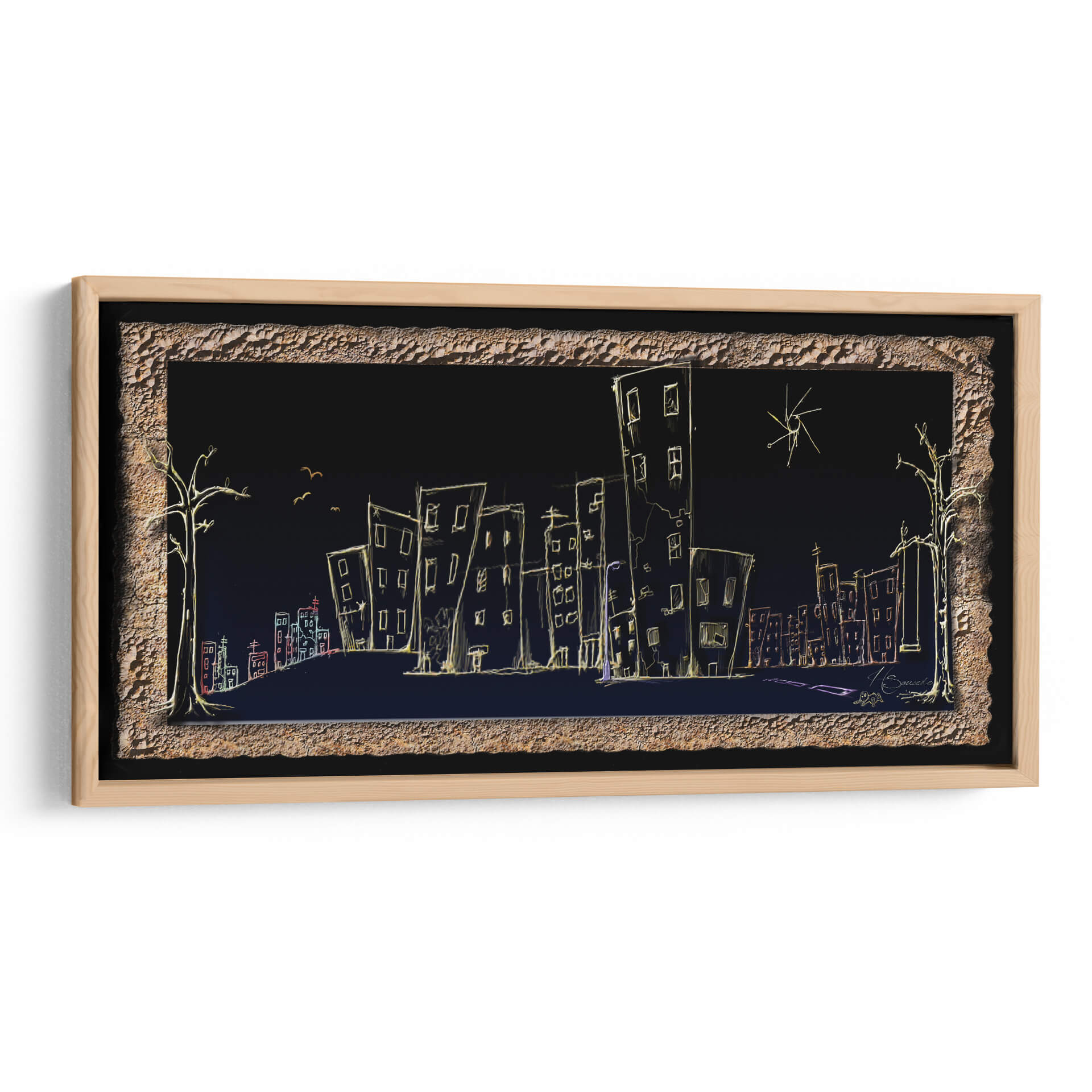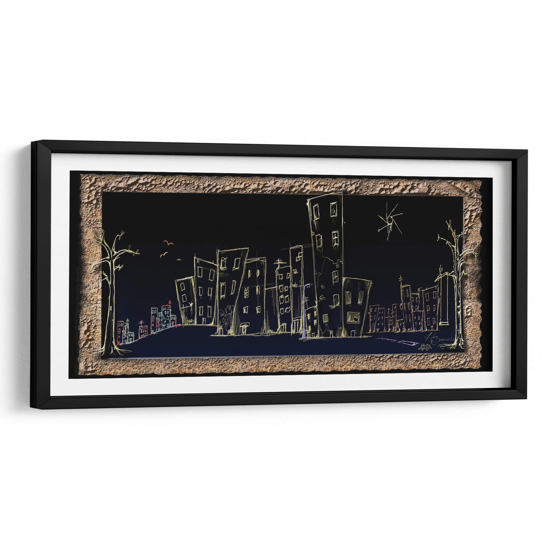 Sumérgete en la atmósfera onírica de "Calle", una obra de arte contemporáneo que captura la esencia de la vida urbana nocturna con un toque enigmático. El artista HSaucedo presenta una silueta de ciudad delineada con trazos luminosos sobre un fondo oscuro y profundo, creando un contraste cautivador. Edificios de formas esquemáticas, algunos inclinados y otros alargados, se alzan como testigos silenciosos de historias no contadas. Una paleta de colores sutil, dominada por el amarillo cálido de las luces y acentos de rojo y azul, evoca una sensación de misterio y tranquilidad a la vez. Los árboles estilizados a los lados y las pequeñas aves en vuelo añaden un toque surrealista, invitando a la contemplación. Esta pieza es ideal para quienes buscan infundir a sus espacios un aire de sofisticación moderna y un toque de ensueño. Perfecta para salones, estudios u oficinas, "Calle" es un cuadro decorativo que no solo embellece, sino que también invita a la reflexión sobre la belleza efímera de la ciudad y la quietud de la noche. Añade un elemento de intriga y estilo a tu decoración con esta pieza única.