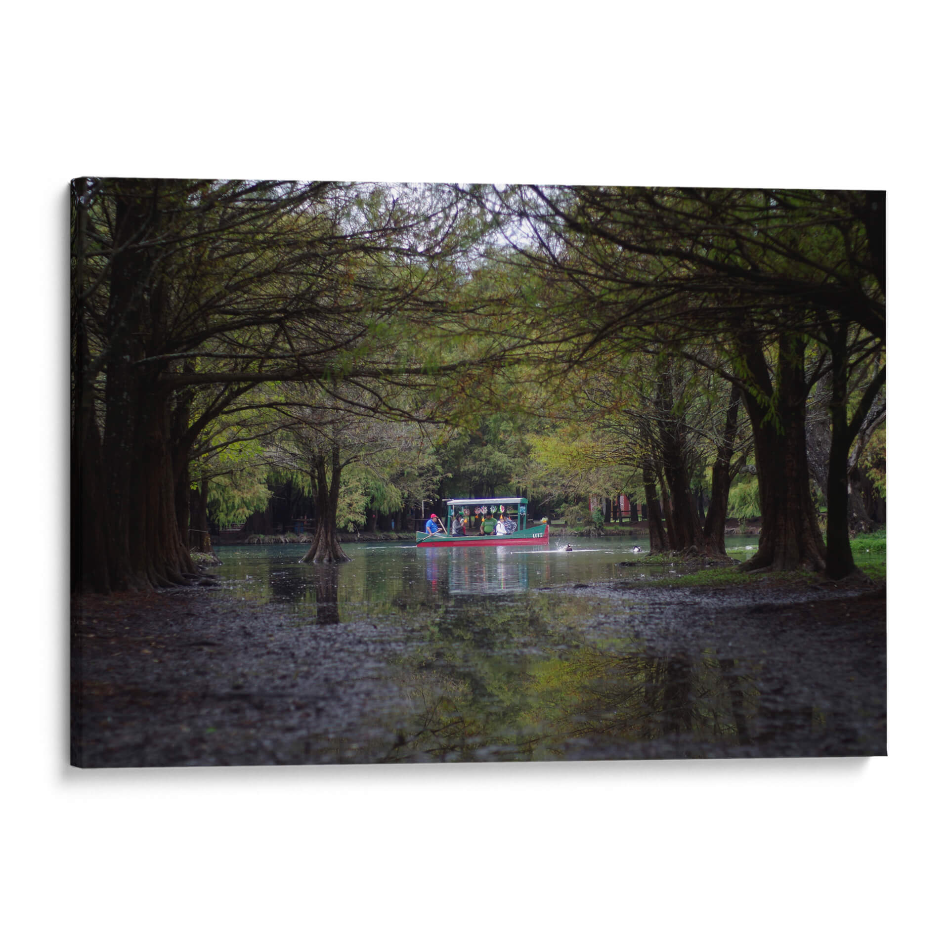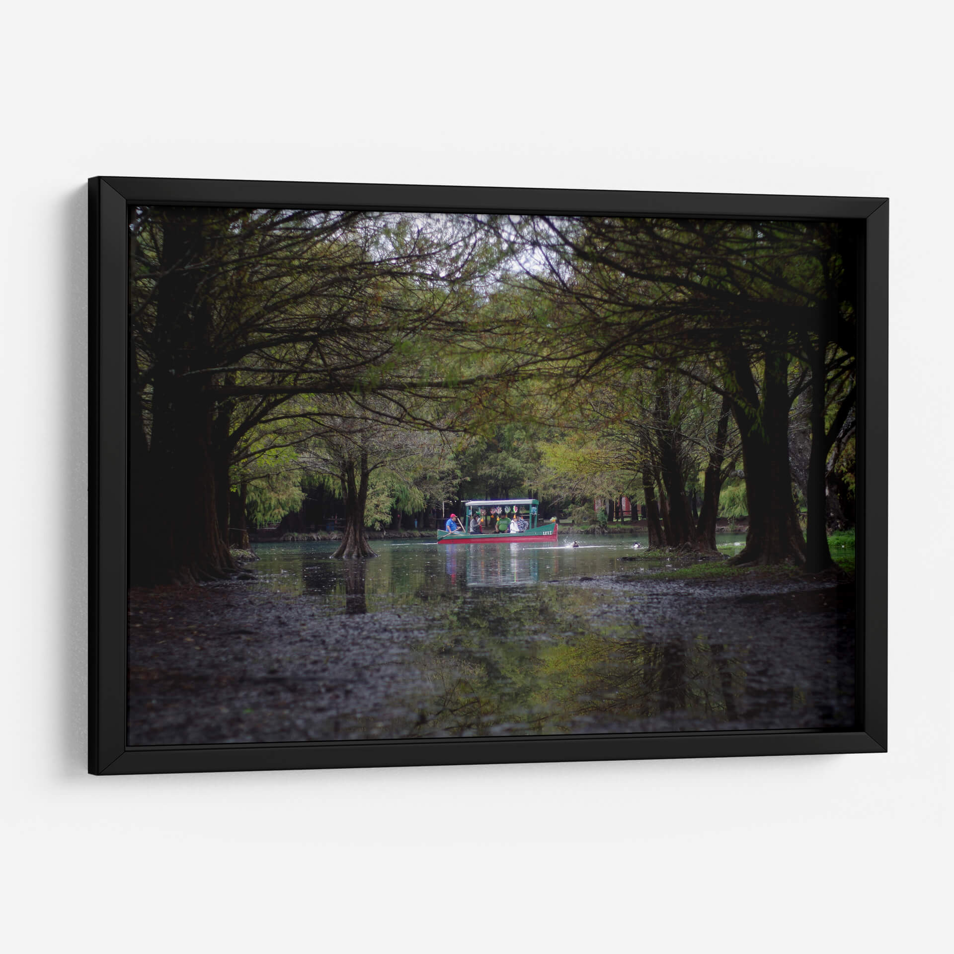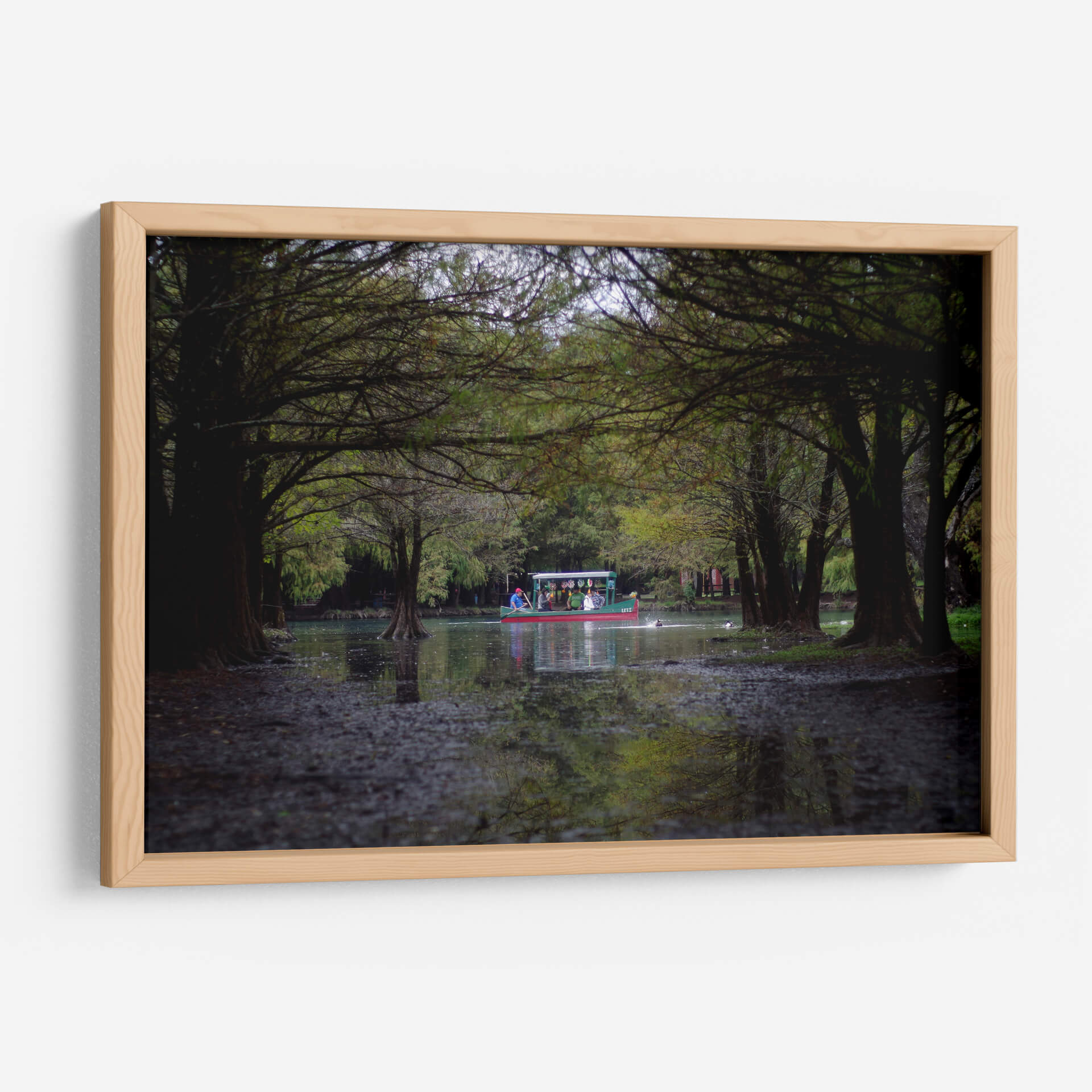 Sumérgete en la serenidad y el encanto del paisaje mexicano con este cautivador cuadro decorativo titulado 'camecuaro' del artista moraviorato. La obra nos transporta a la orilla de un lago rodeado de frondosos árboles, cuyas ramas se entrelazan creando un túnel natural que invita a la contemplación. En el centro, una colorida barca navega apaciblemente, llevando consigo a un grupo de personas que disfrutan de la tranquilidad del entorno. Los tonos verdes profundos de la vegetación se combinan con los reflejos del agua y la luz tenue, creando una atmósfera de calma y armonía. Los detalles sutiles, como las raíces expuestas de los árboles y las pequeñas aves acuáticas, añaden realismo y vida a la escena. Este cuadro es una invitación a la introspección y a la conexión con la naturaleza, ideal para quienes buscan añadir un toque de paz y belleza escénica a su hogar u oficina. Su estilo fotográfico y su composición equilibrada lo convierten en una pieza versátil, perfecta para salones, dormitorios o estudios, aportando una sensación de escapismo y serenidad a cualquier espacio. Descubre la magia de 'camecuaro' y transforma tu ambiente con esta obra de arte única.