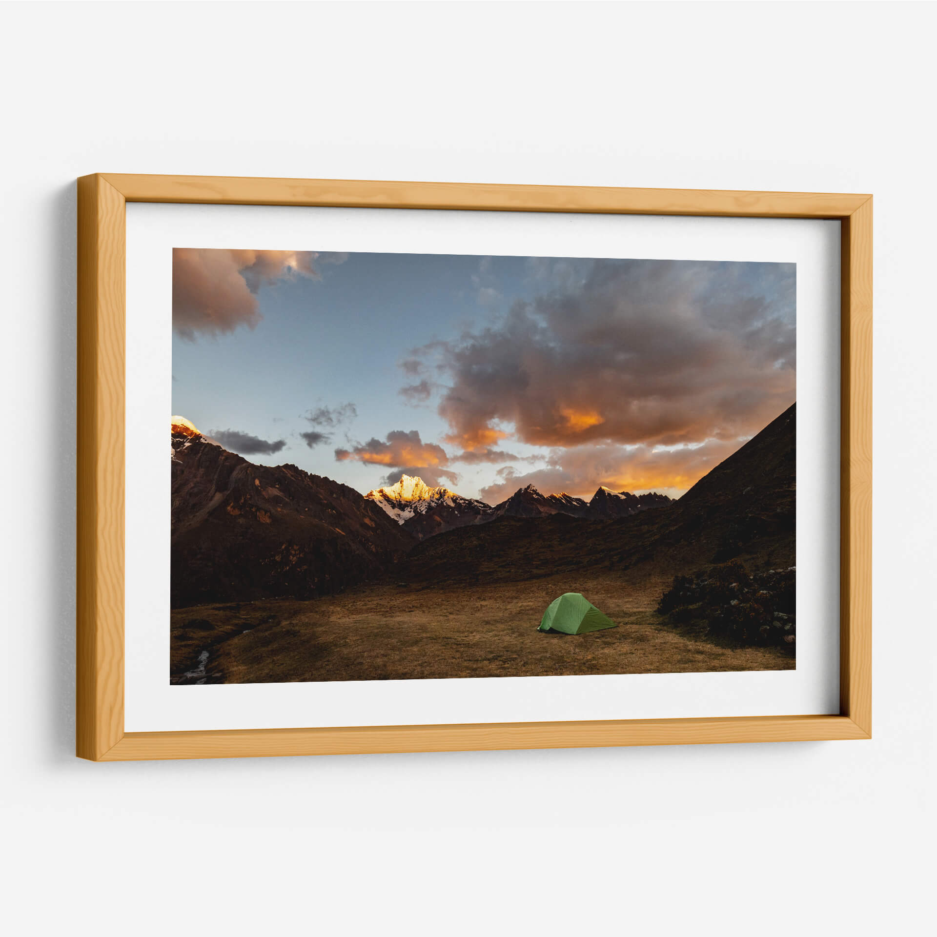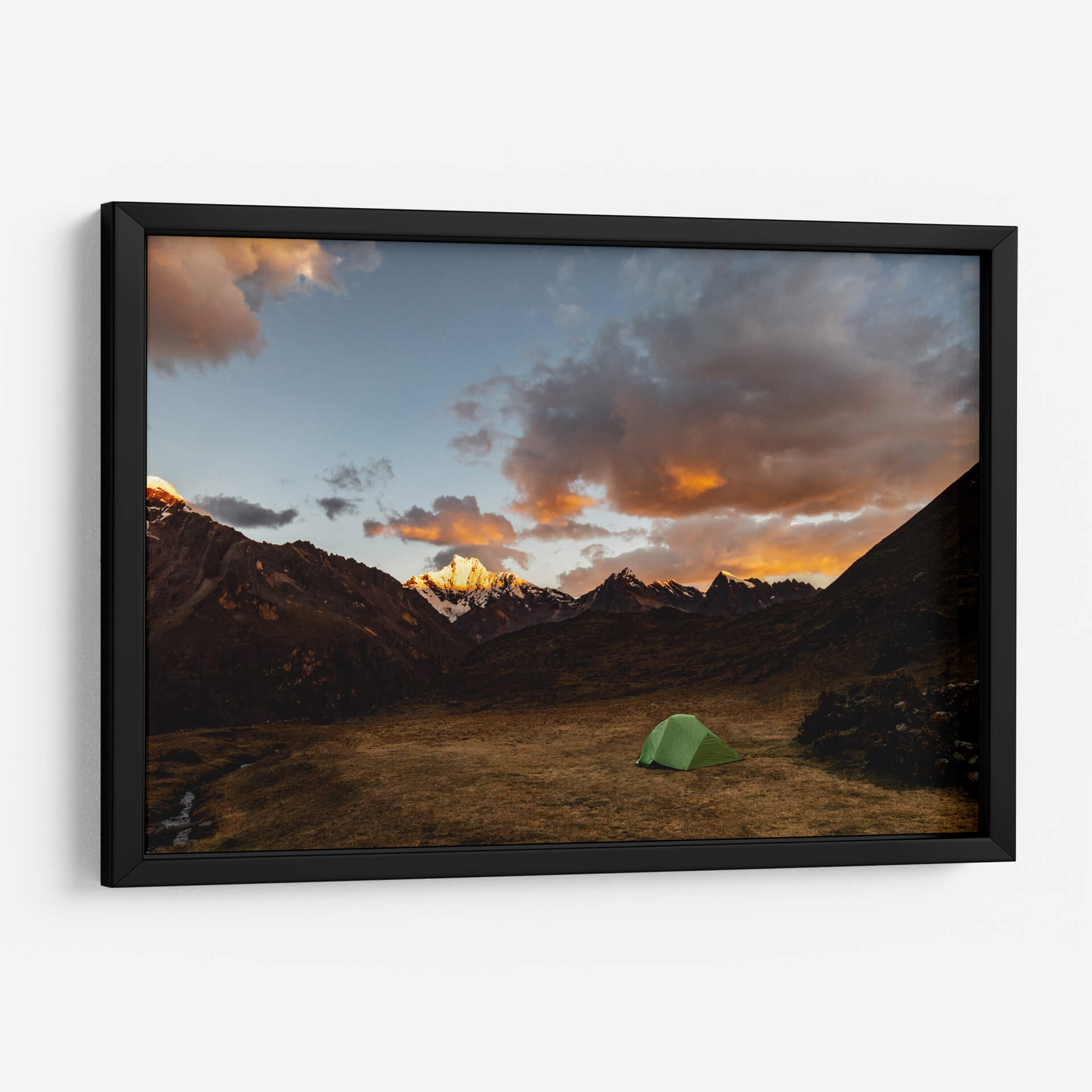 Captura la esencia de la aventura y la serenidad montañosa con el cuadro decorativo 'Camping en los Andes'. Esta obra de Luis Martínez te transporta directamente a un paisaje imponente, donde majestuosas cumbres nevadas se alzan bajo un cielo dramático de atardecer. Las nubes teñidas de tonos anaranjados y dorados contrastan con el azul profundo del firmamento, creando una atmósfera de paz y asombro. En primer plano, un solitario campamento verde descansa sobre un prado de hierba seca, invitando a la contemplación y a la conexión con la naturaleza. La composición, con el cauce de un arroyo serpenteando suavemente y la textura rústica de la montaña, evoca una sensación de tranquilidad y escapismo. Este cuadro decorativo es perfecto para quienes buscan infundir a sus espacios un espíritu explorador, aportando un toque de majestuosidad natural a salones, dormitorios u oficinas. Ideal para amantes del senderismo, la montaña y la fotografía de paisajes, 'Camping en los Andes' es una ventana a la belleza indómita de la naturaleza y la aventura serena, un recordatorio visual de la paz que se encuentra al desconectar en entornos naturales espectaculares. Transforma tu hogar en un refugio de inspiración con esta pieza única.