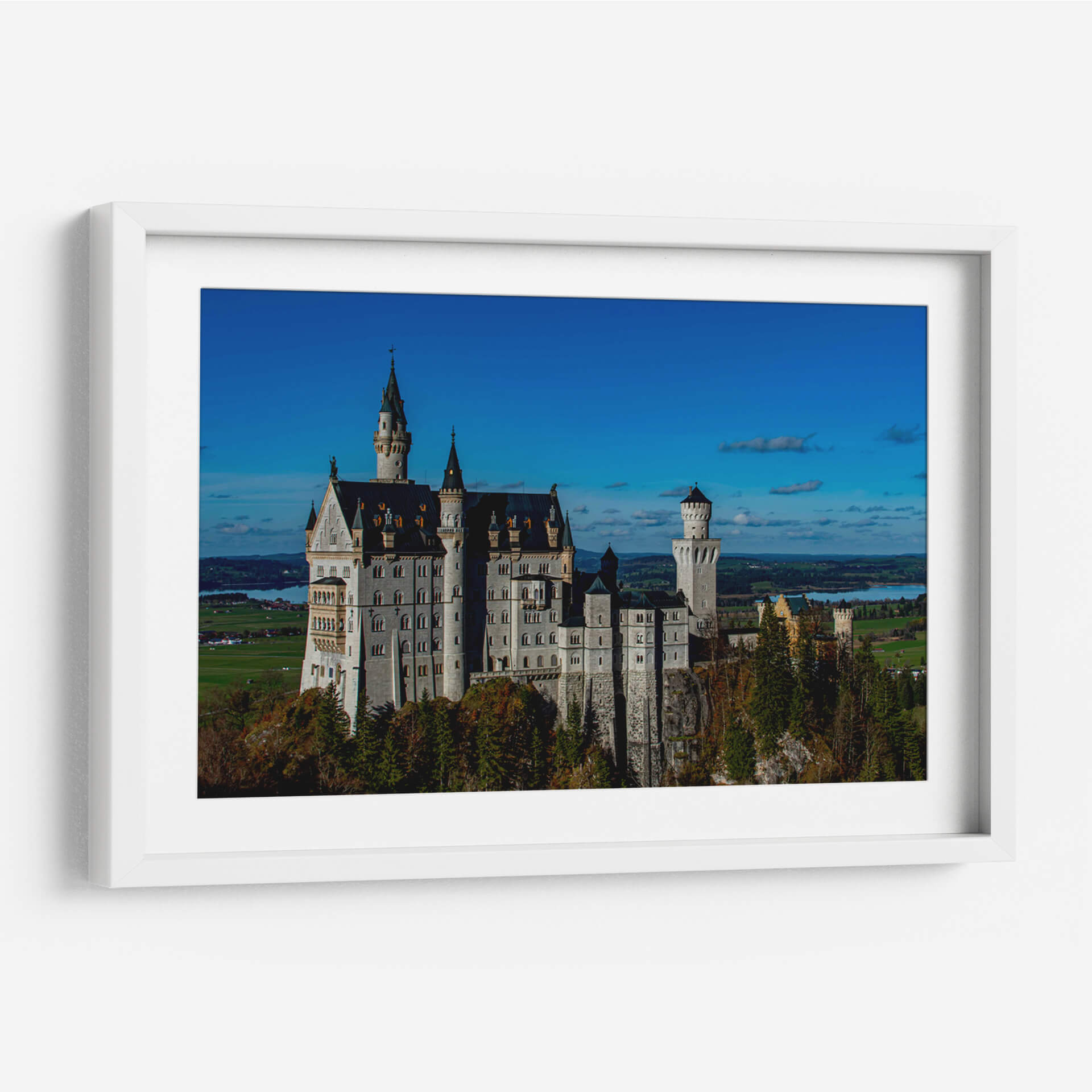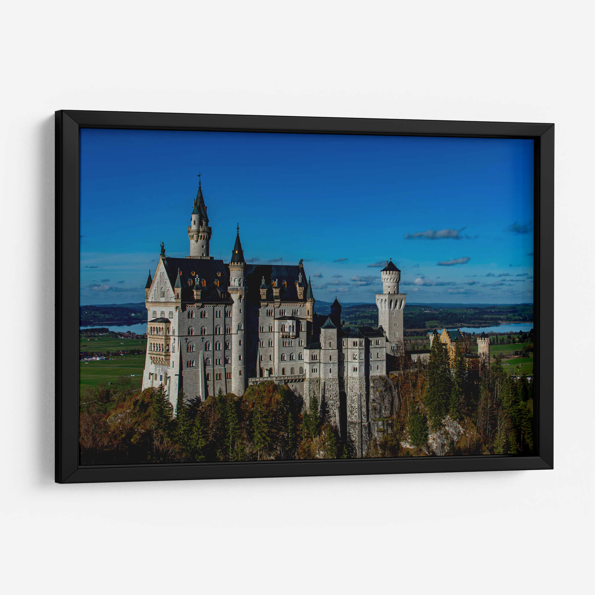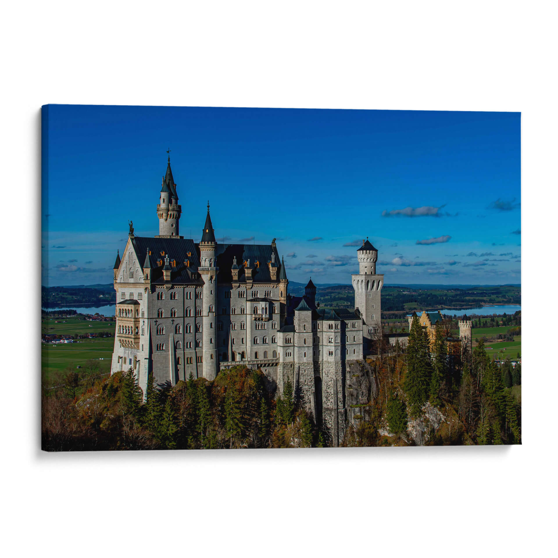 Emb rquese en un viaje visual al ic sico Castillo Neuschwanstein con esta impresionante obra de arte. El cuadro captura la majestuosidad y el encanto de este palacio de cuento de hadas, enclavado en un paisaje pintoresco. La detallada arquitectura del castillo, con sus torres esbeltas y su imponente estructura de piedra gris, se alza contra un cielo azul vibrante, salpicado de nubes algodonosas. El entorno natural circundante, con colinas verdes, bosques frondosos y un sereno lago en la distancia, complementa la grandiosidad del castillo, creando una escena armoniosa y cautivadora. La paleta de colores, dominada por los tonos azules profundos del cielo y el contraste con los verdes y marrones otoñales del paisaje, evoca una sensaci siempre de asombro y tranquilidad. Este cuadro decorativo es ideal para a adir un toque de elegancia, historia y fantas a a cualquier hogar u oficina. Su presencia evoca un sentimiento de aventura y serenidad, transportando al espectador a un mundo de ensue o. Perfecto para salas de estar, dormitorios o estudios, esta pieza se convierte en un punto focal que invita a la contemplaci y la admiraci , trayendo la belleza atemporal de Baviera a su espacio.