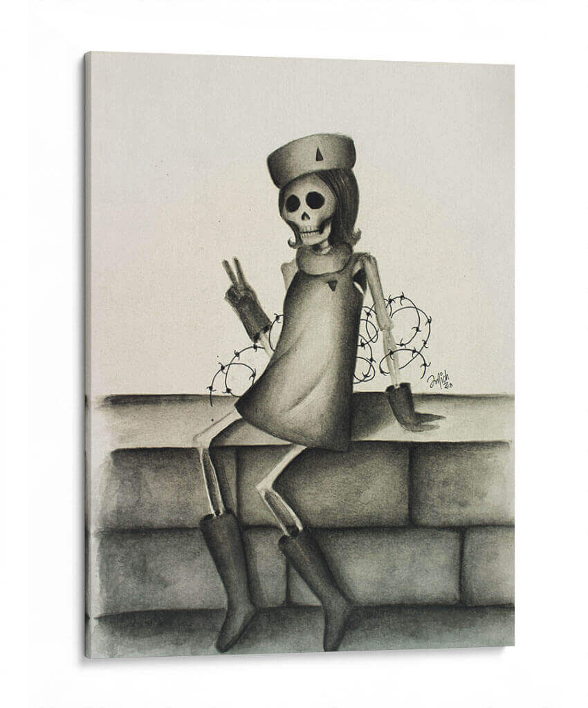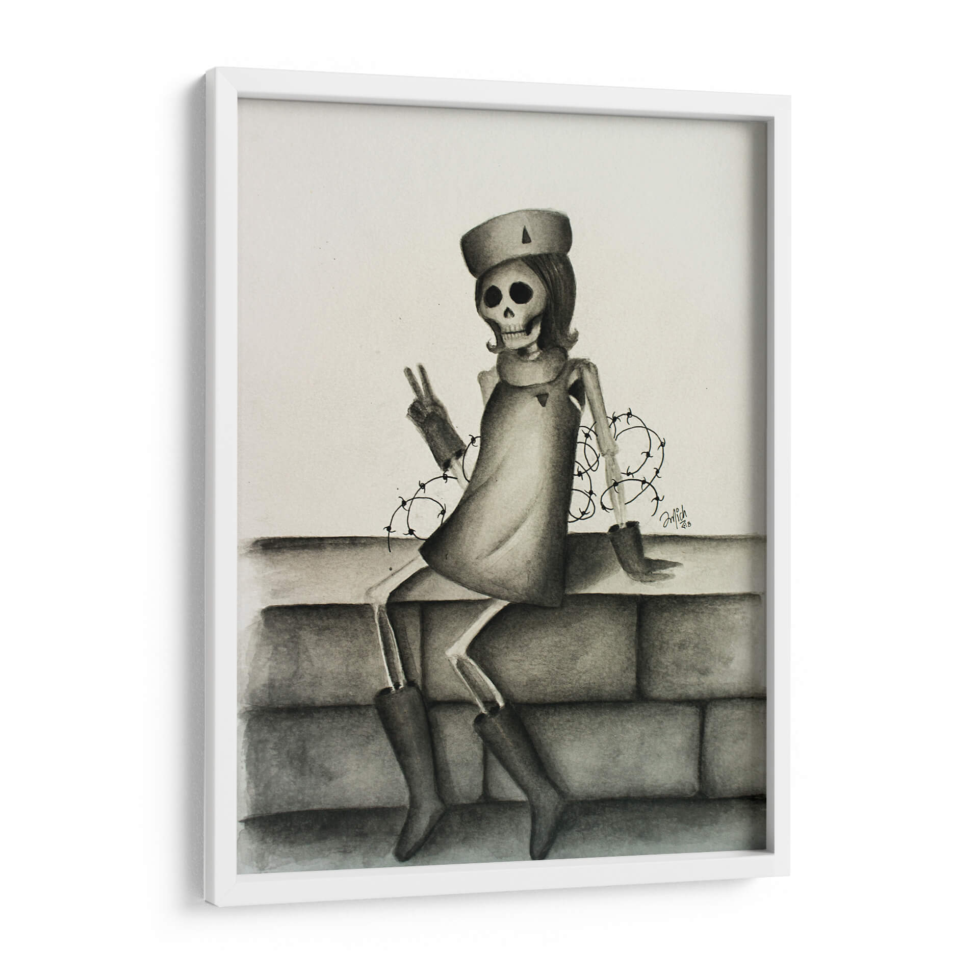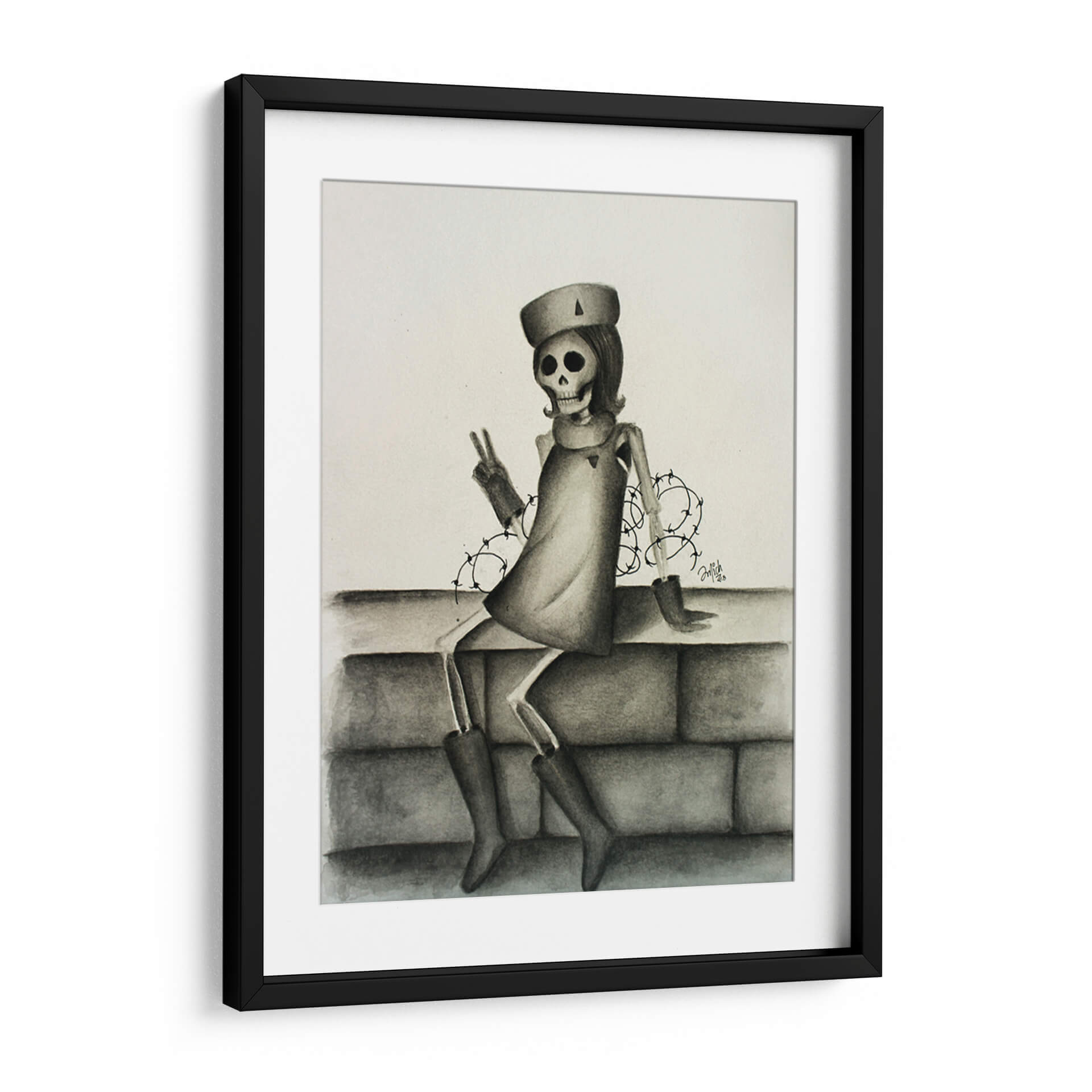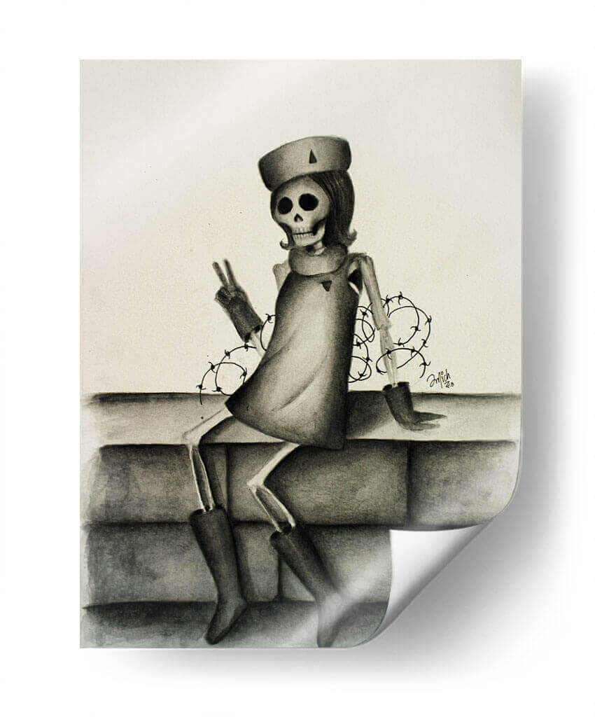 Sumérgete en la enigmática obra de arte 'CATRINAS DE HOY' de Marce Islas, un cuadro decorativo que desafía las convenciones con su impactante representación. Esta pieza visualmente cautivadora presenta una figura esquelética femenina vestida con un atuendo contemporáneo y un tocado distintivo, sentada sobre un muro de ladrillos y rodeada de alambre de púas, un detalle que añade una capa de simbolismo y reflexión. La paleta de colores monocromática, dominada por tonos de gris y blanco, crea una atmósfera sombría pero fascinante, resaltando las texturas y los contrastes que dan profundidad a la composición. El estilo gráfico y detallado de Marce Islas evoca tanto lo tradicional como lo moderno, invitando a la contemplación sobre la dualidad de la vida y la muerte, la tradición y la evolución. Este cuadro decorativo es ideal para aquellos que buscan añadir un toque de audacia, misterio y un punto de conversación a su hogar u oficina, ya sea en una sala de estar vanguardista, un estudio personal o un espacio comercial con carácter. Su diseño único lo convierte en una pieza central que inspira intriga y admiración, perfecto para coleccionistas de arte contemporáneo y amantes de las estéticas que rompen moldes.