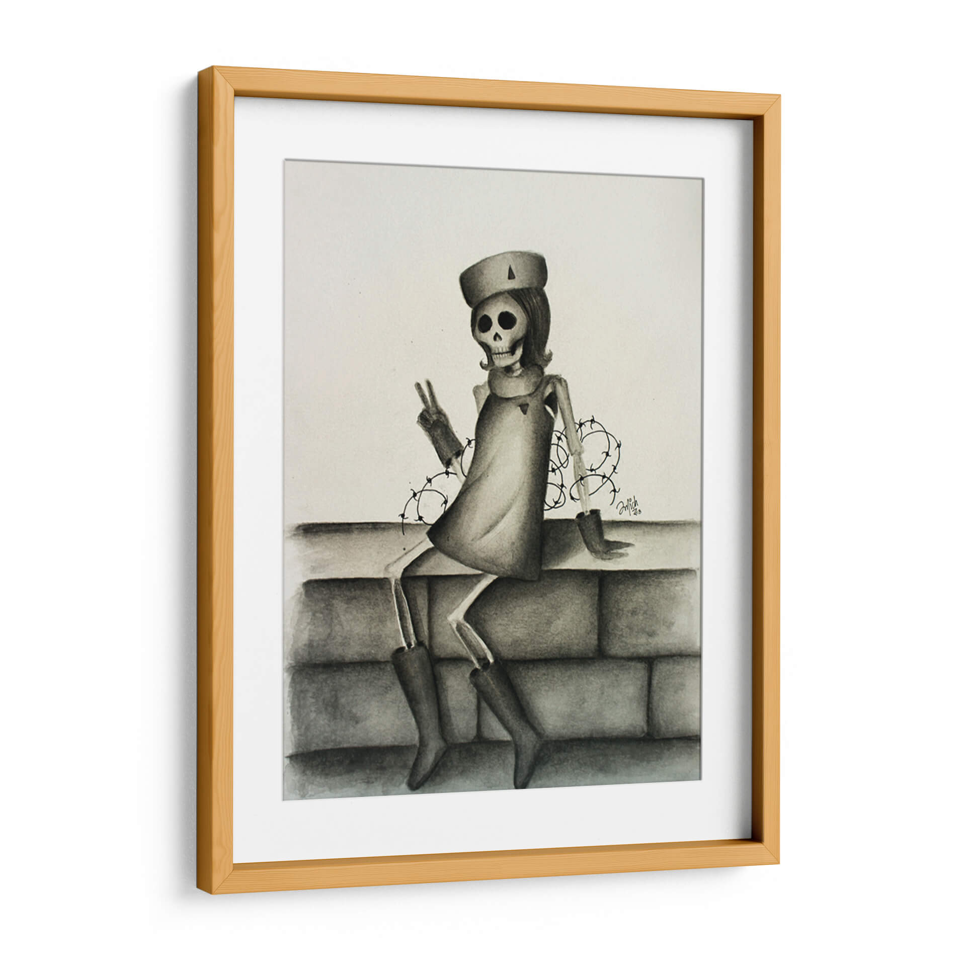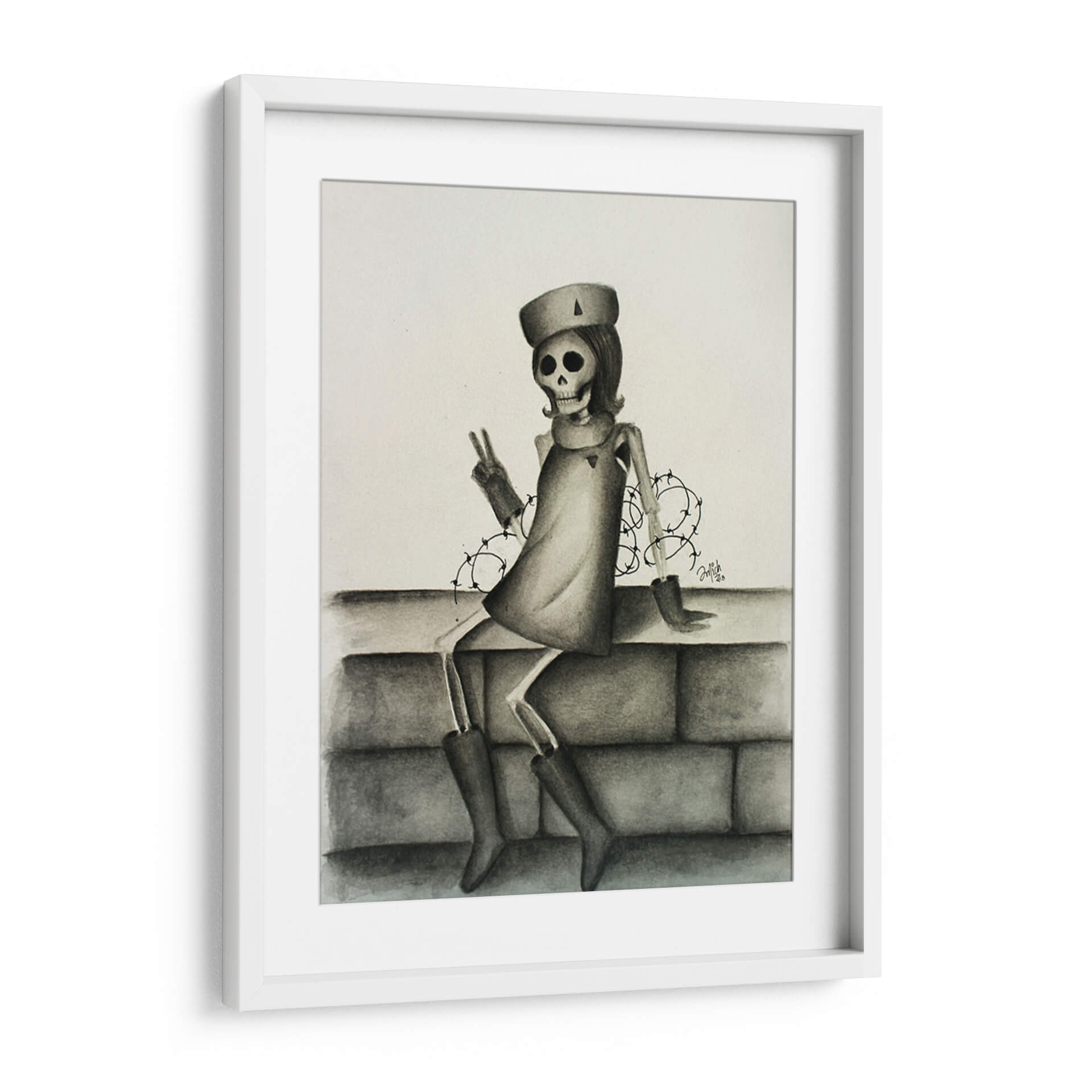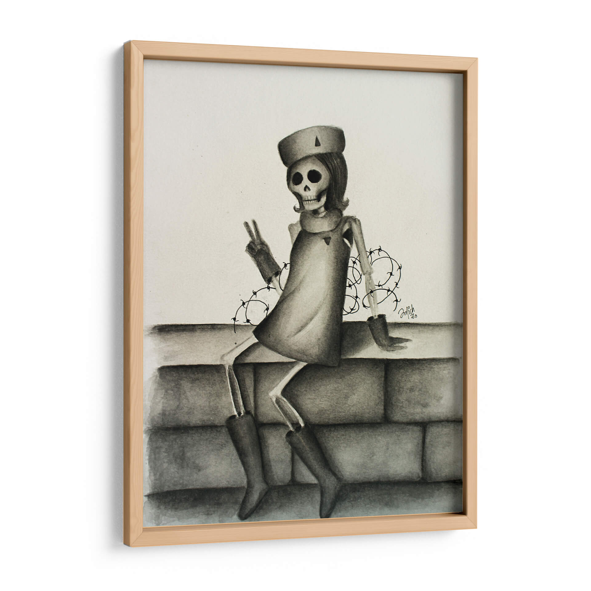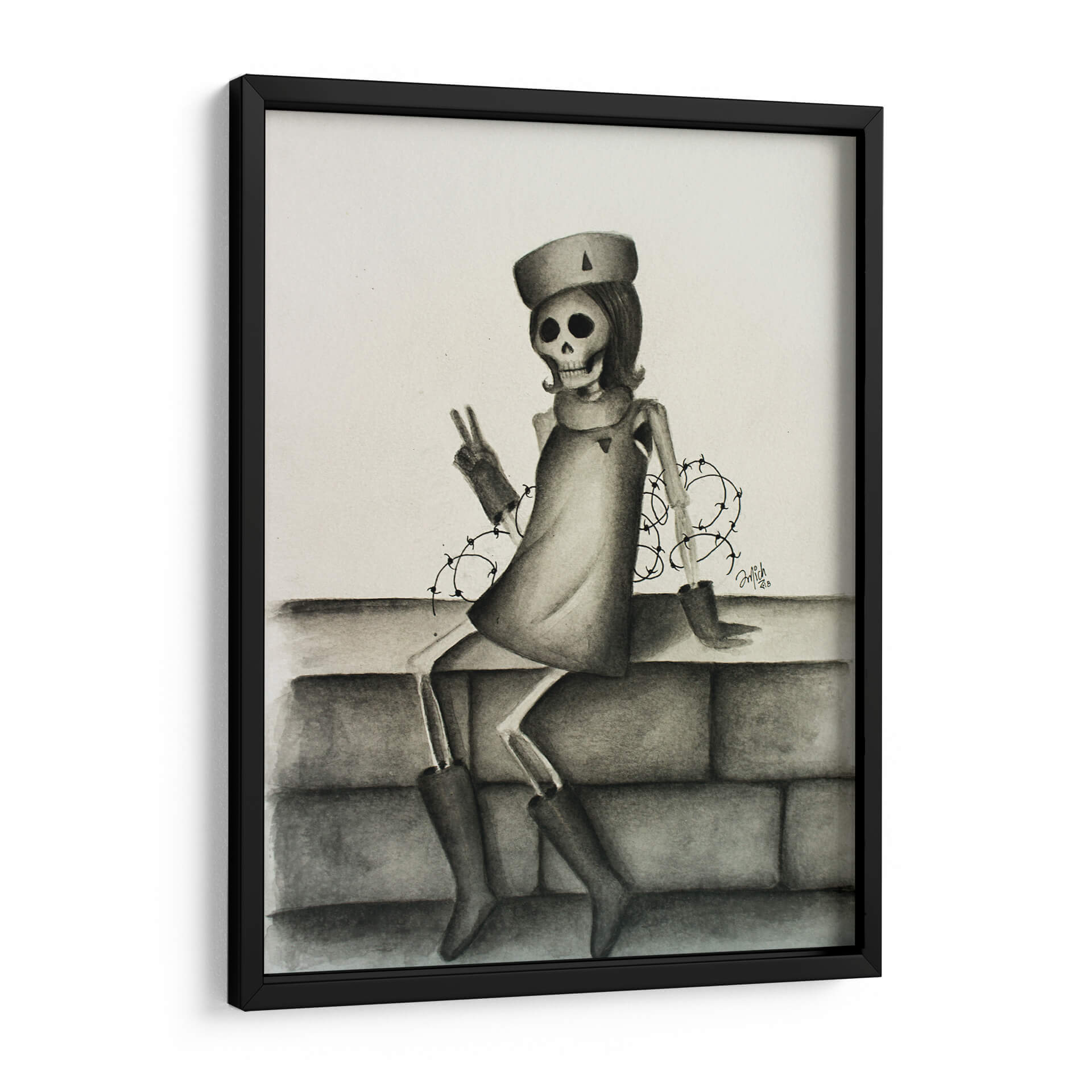 Sumérgete en la enigmática obra de arte 'CATRINAS DE HOY' de Marce Islas, un cuadro decorativo que desafía las convenciones con su impactante representación. Esta pieza visualmente cautivadora presenta una figura esquelética femenina vestida con un atuendo contemporáneo y un tocado distintivo, sentada sobre un muro de ladrillos y rodeada de alambre de púas, un detalle que añade una capa de simbolismo y reflexión. La paleta de colores monocromática, dominada por tonos de gris y blanco, crea una atmósfera sombría pero fascinante, resaltando las texturas y los contrastes que dan profundidad a la composición. El estilo gráfico y detallado de Marce Islas evoca tanto lo tradicional como lo moderno, invitando a la contemplación sobre la dualidad de la vida y la muerte, la tradición y la evolución. Este cuadro decorativo es ideal para aquellos que buscan añadir un toque de audacia, misterio y un punto de conversación a su hogar u oficina, ya sea en una sala de estar vanguardista, un estudio personal o un espacio comercial con carácter. Su diseño único lo convierte en una pieza central que inspira intriga y admiración, perfecto para coleccionistas de arte contemporáneo y amantes de las estéticas que rompen moldes.