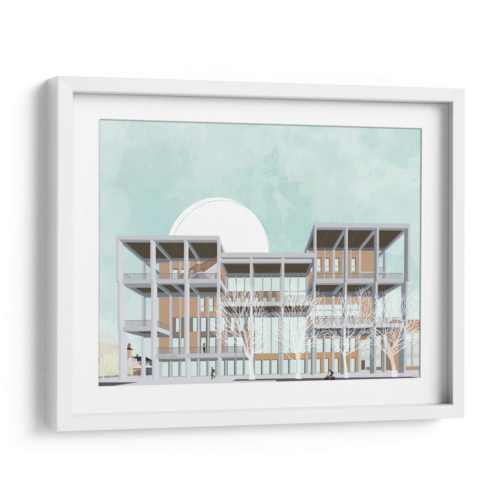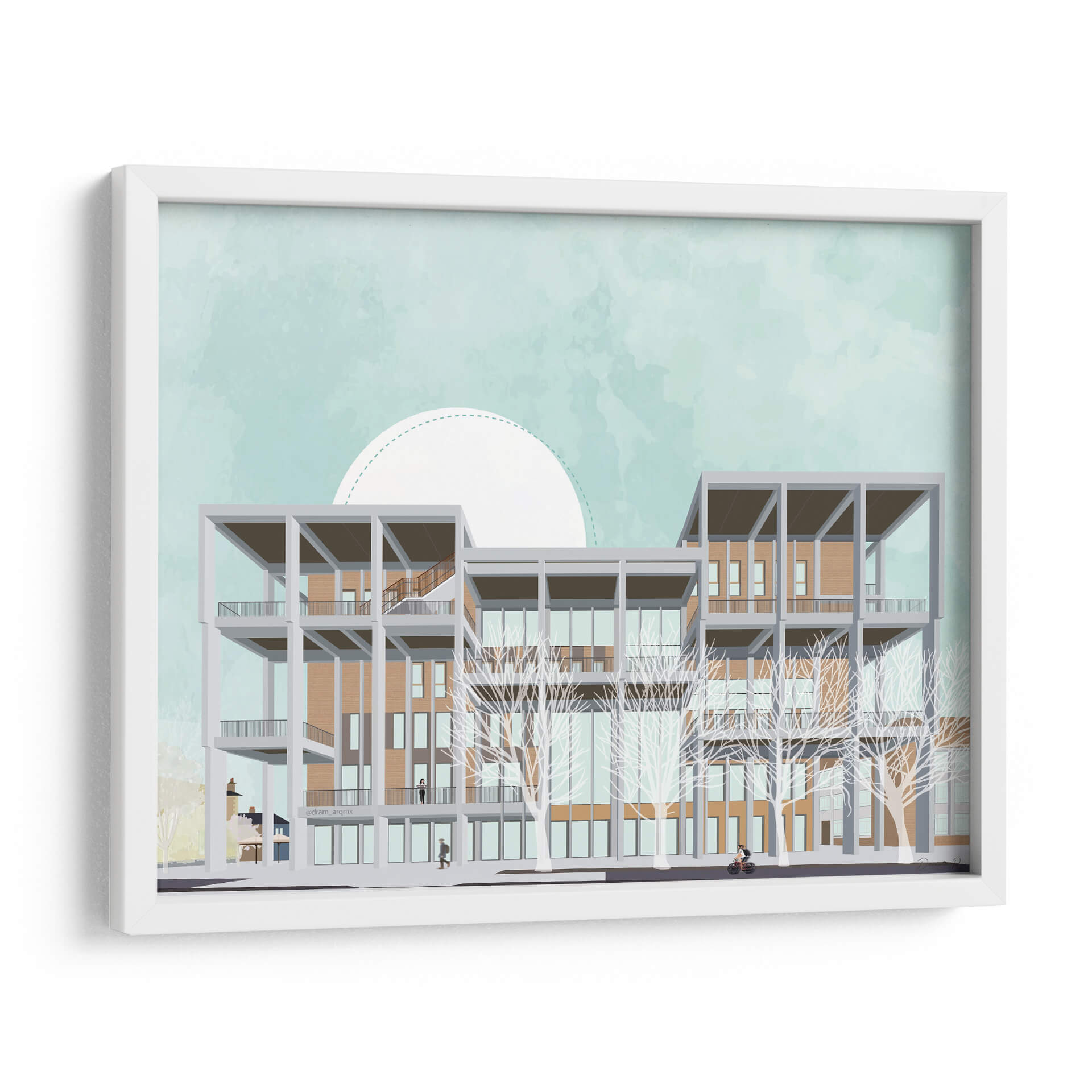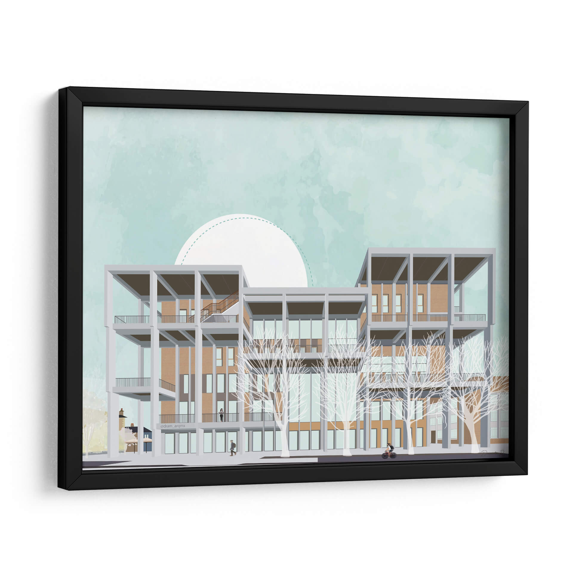 Transforma tu espacio con este evocador cuadro decorativo que captura la arquitectura moderna del Centro de Aprendizaje de Kingston University. La obra presenta una detallada ilustración de un edificio multifacético, con una estructura geométrica de concreto gris que contrasta con los tonos cálidos de los ladrillos y la gran cantidad de ventanas. Las ramas desnudas de árboles estilizados añaden un toque etéreo y artístico al frente, mientras que el cielo de un suave color aguamarina, adornado con un gran semicírculo blanco punteado, crea una atmósfera serena y soñadora. La paleta de colores, dominada por azules pálidos, ocres, grises y blancos, transmite una sensación de calma y sofisticación, perfecta para espacios que buscan un equilibrio entre lo contemporáneo y lo artístico. Este cuadro es ideal para oficinas, estudios o salas de estar modernas, aportando un punto focal intelectual y estético. Su composición, que combina elementos arquitectónicos precisos con un estilo casi acuarelado en el fondo, invita a la contemplación y añade profundidad a cualquier decoración. Descubre cómo esta pieza puede inspirar y elevar tu entorno, fusionando la visión del artista DRAM con un diseño que resuena con la estética contemporánea.