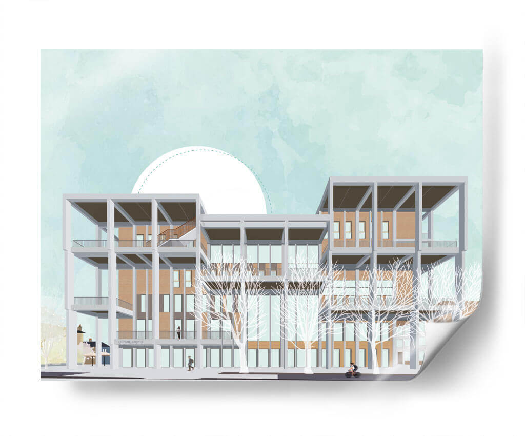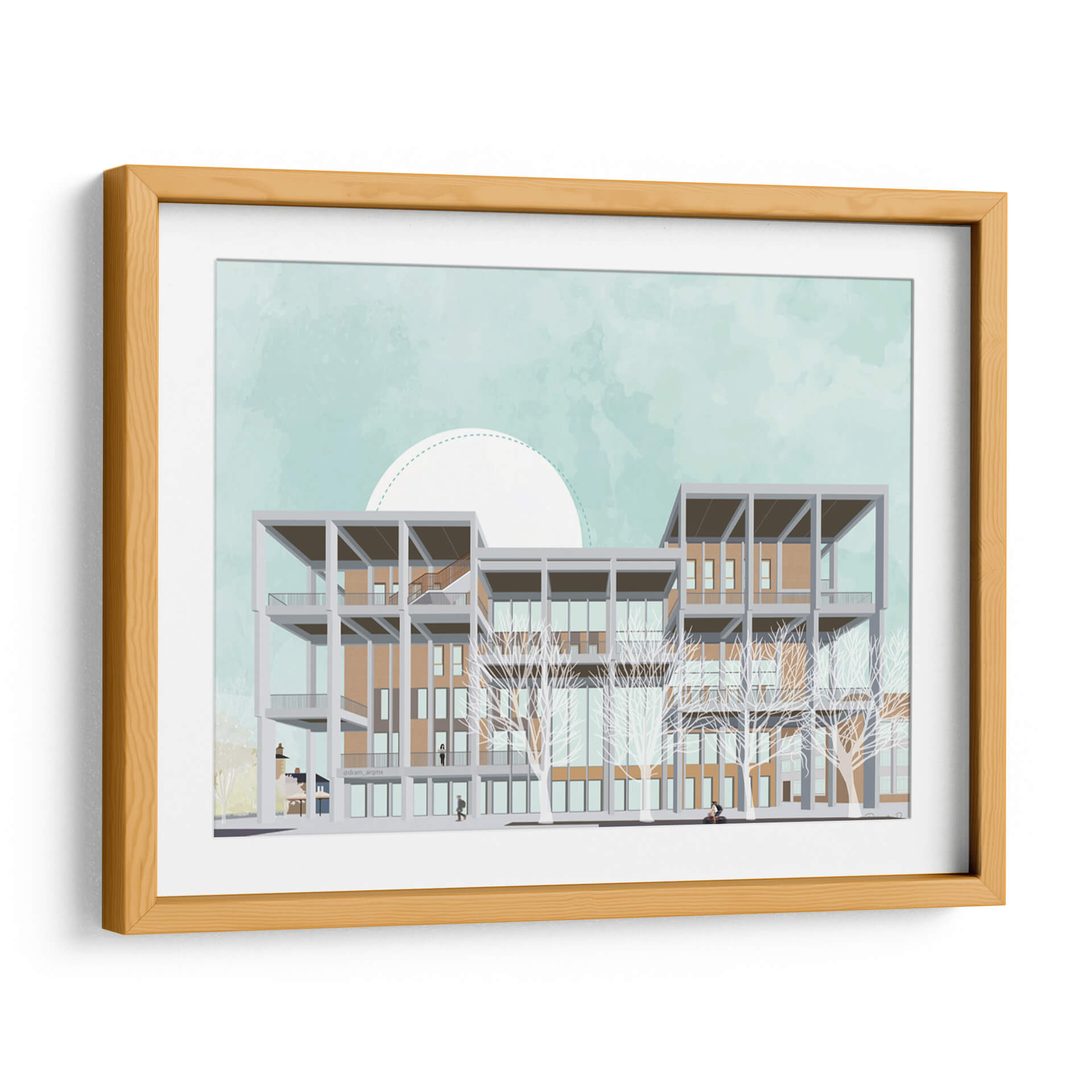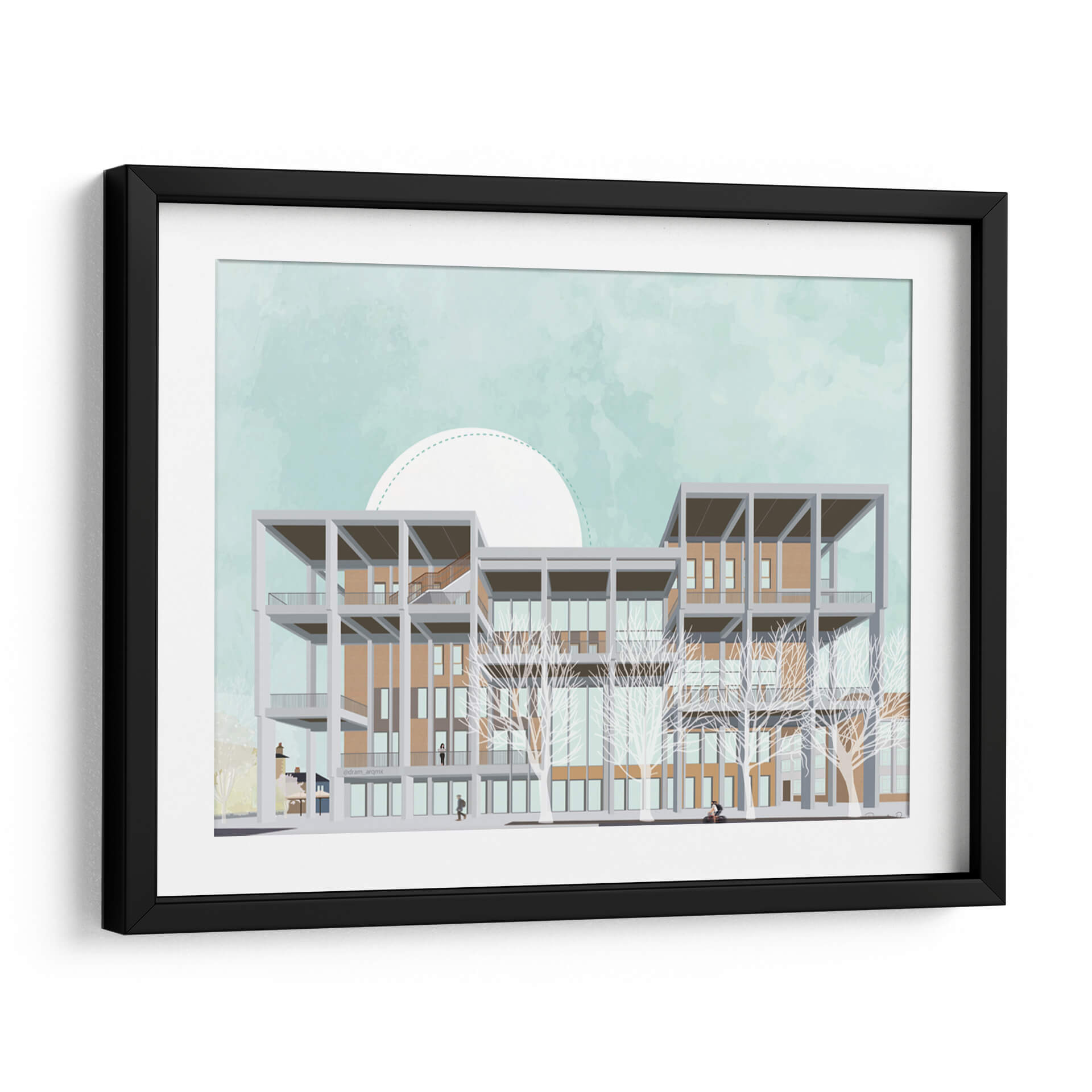 Transforma tu espacio con este evocador cuadro decorativo que captura la arquitectura moderna del Centro de Aprendizaje de Kingston University. La obra presenta una detallada ilustración de un edificio multifacético, con una estructura geométrica de concreto gris que contrasta con los tonos cálidos de los ladrillos y la gran cantidad de ventanas. Las ramas desnudas de árboles estilizados añaden un toque etéreo y artístico al frente, mientras que el cielo de un suave color aguamarina, adornado con un gran semicírculo blanco punteado, crea una atmósfera serena y soñadora. La paleta de colores, dominada por azules pálidos, ocres, grises y blancos, transmite una sensación de calma y sofisticación, perfecta para espacios que buscan un equilibrio entre lo contemporáneo y lo artístico. Este cuadro es ideal para oficinas, estudios o salas de estar modernas, aportando un punto focal intelectual y estético. Su composición, que combina elementos arquitectónicos precisos con un estilo casi acuarelado en el fondo, invita a la contemplación y añade profundidad a cualquier decoración. Descubre cómo esta pieza puede inspirar y elevar tu entorno, fusionando la visión del artista DRAM con un diseño que resuena con la estética contemporánea.
