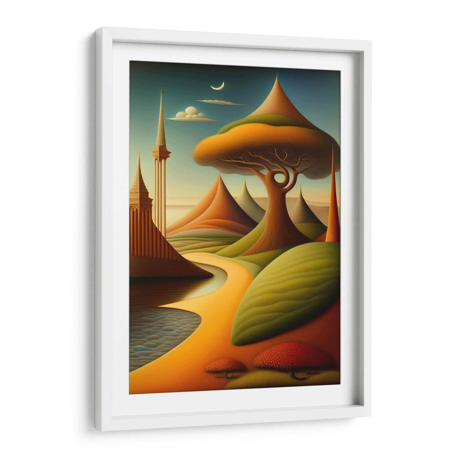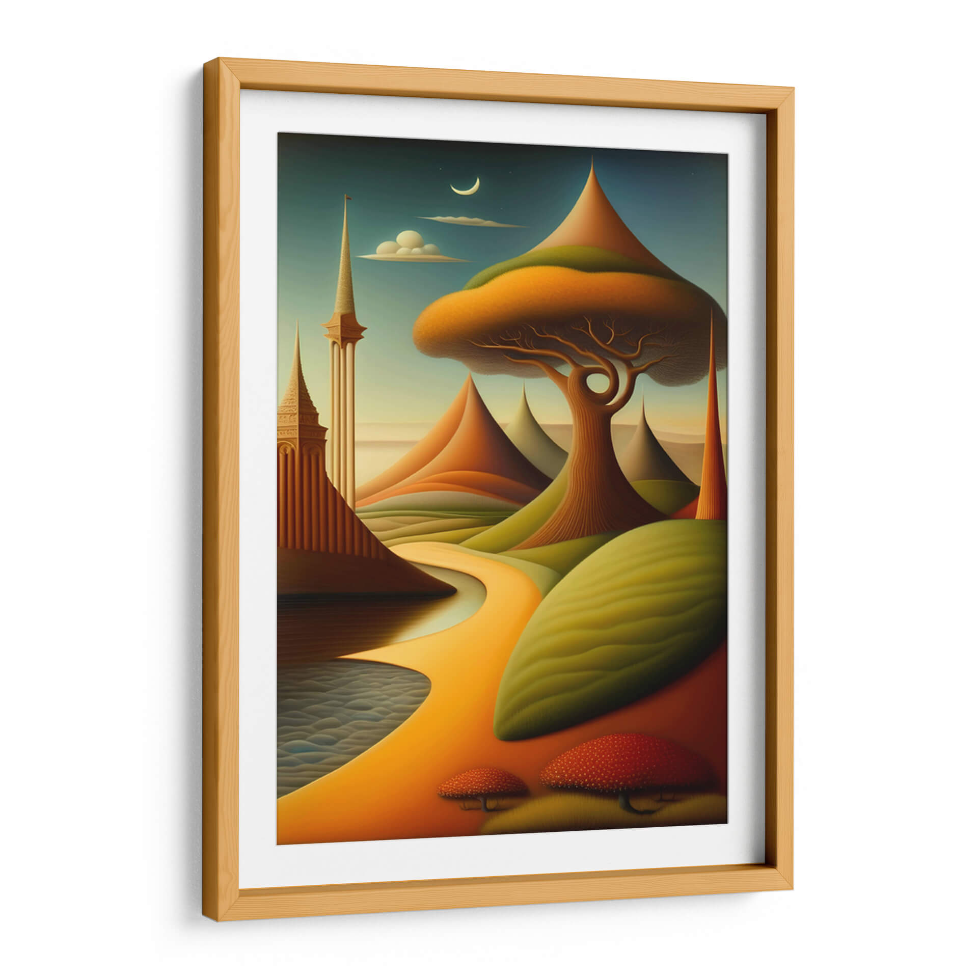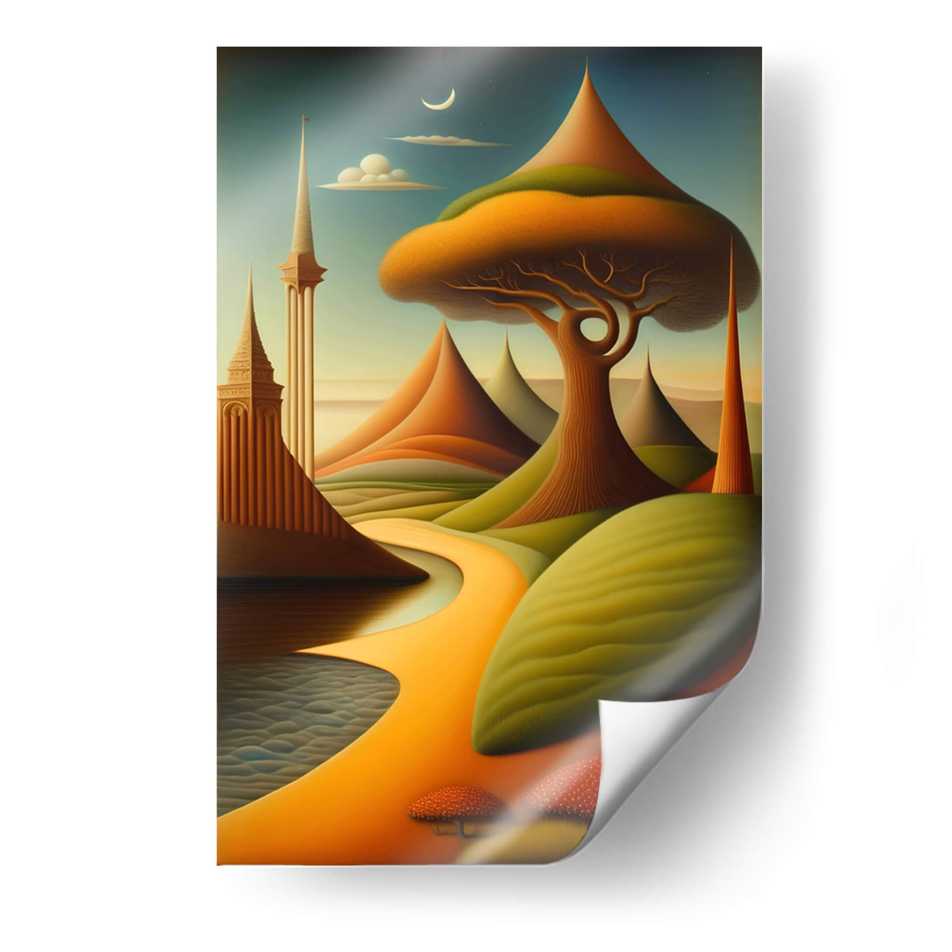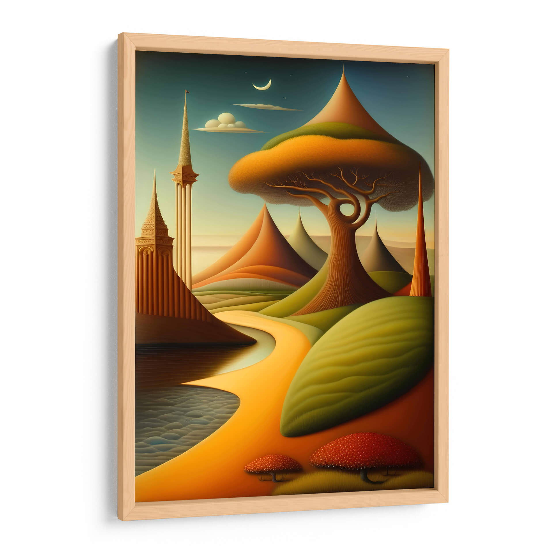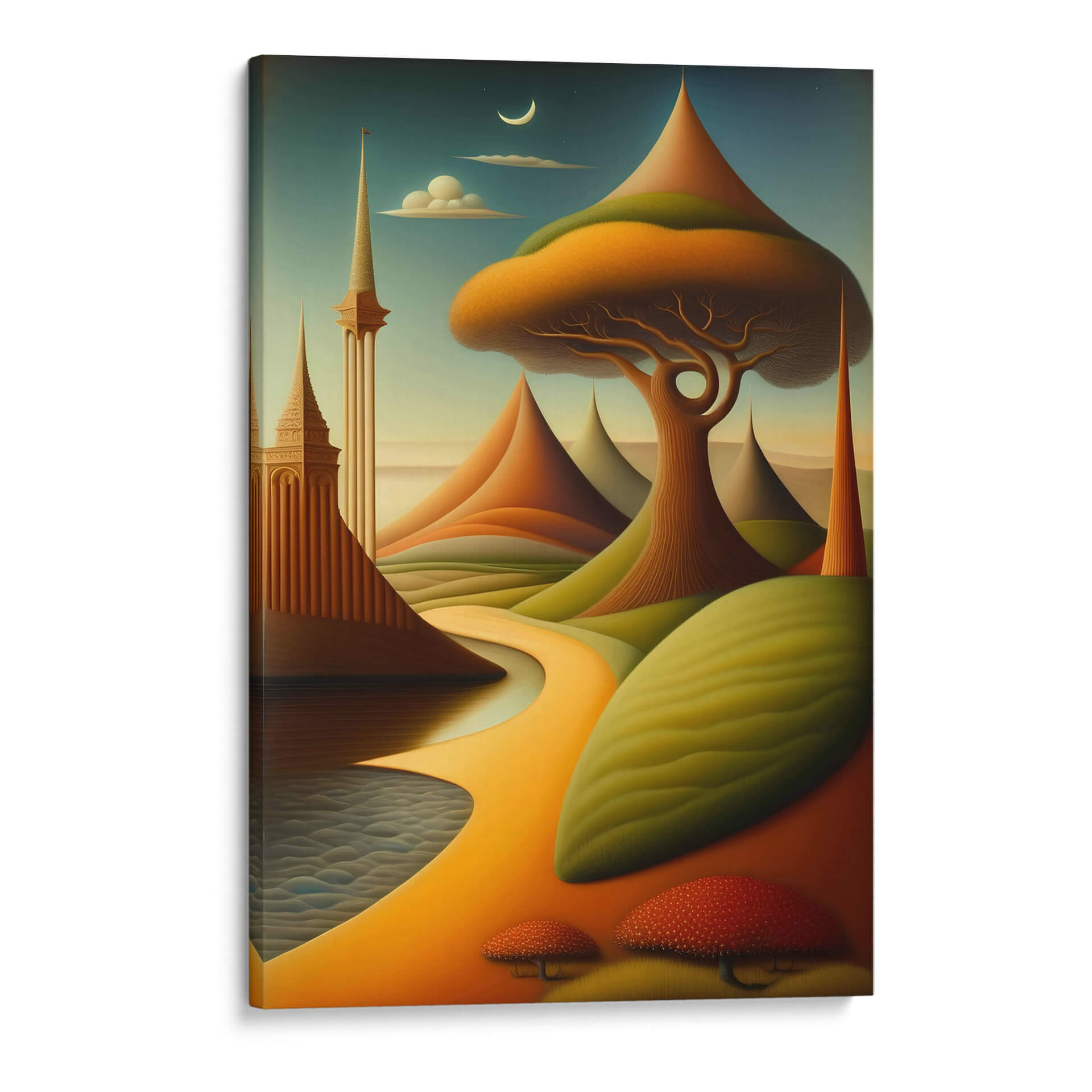 Embárcate en un viaje visual hacia lo desconocido con "Ciudad Portal", una obra de arte digital que trasciende la realidad. Esta pieza cautivadora te transporta a un paisaje onírico donde la arquitectura fantástica se entrelaza con elementos naturales estilizados. Observa las esbeltas torres que evocan civilizaciones antiguas y el gran árbol central con su copa exuberante, símbolo de vida y conexión. Los tonos cálidos de naranja y ocre, contrastados con verdes suaves y un cielo azul profundo salpicado de una luna creciente, crean una atmósfera de misterio y serenidad. El sendero sinuoso y el cuerpo de agua a su lado invitan a la contemplación, sugiriendo un camino hacia la aventura o la introspección. "Ciudad Portal" es ideal para quienes buscan una decoración que despierte la imaginación y añada un toque de ensueño a su hogar u oficina. Este cuadro decorativo moderno y abstracto, con influencias surreales, se convertirá en un punto focal que inspira conversaciones y admiración, aportando una dimensión única a cualquier espacio.