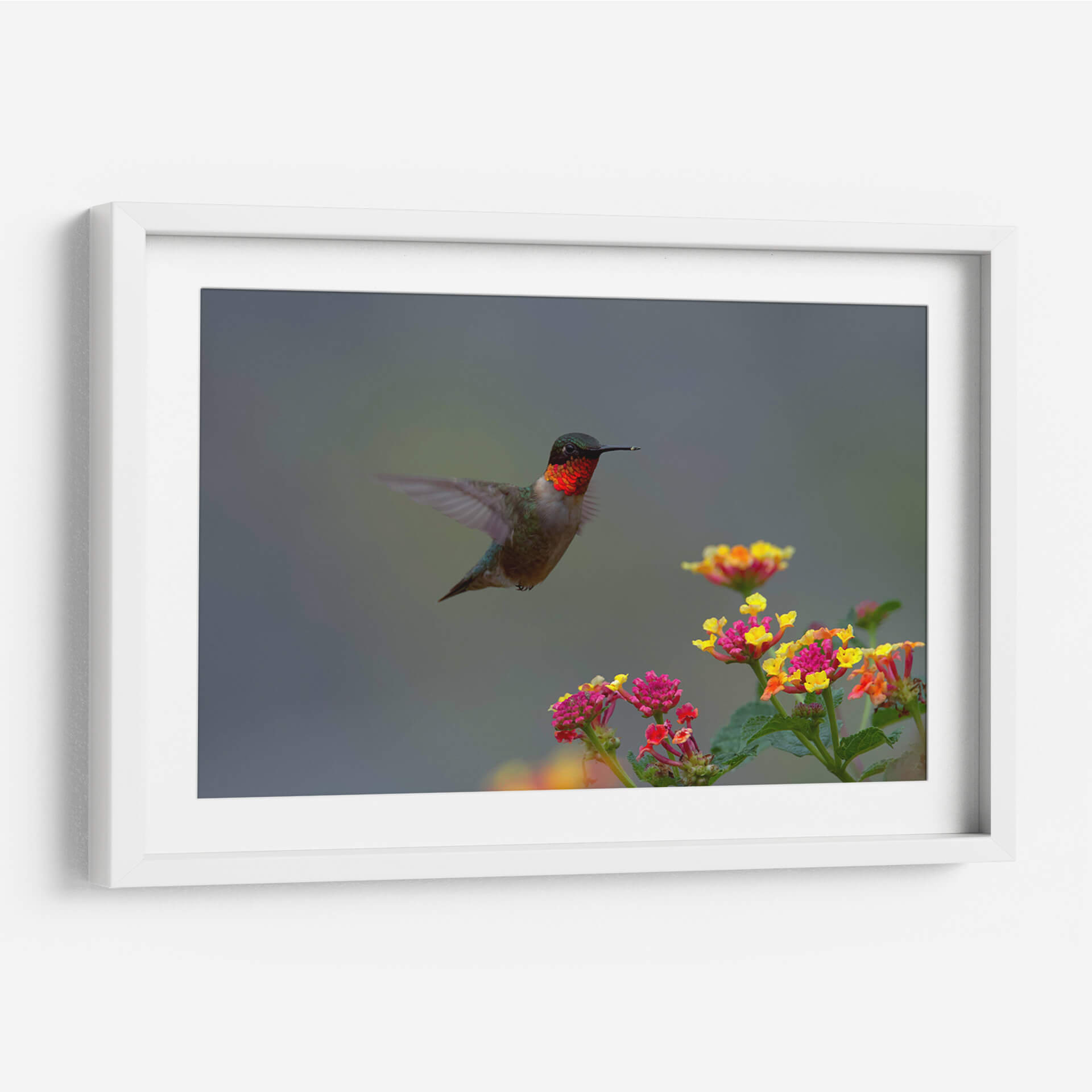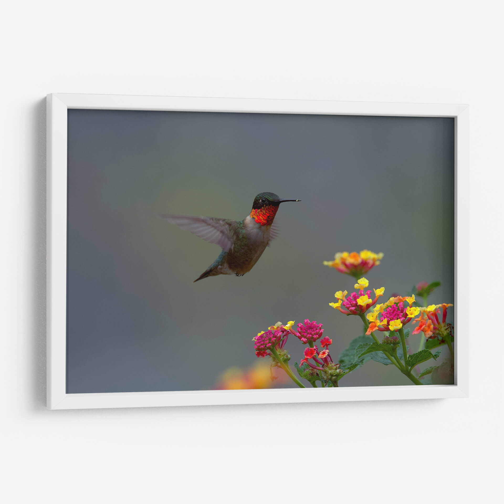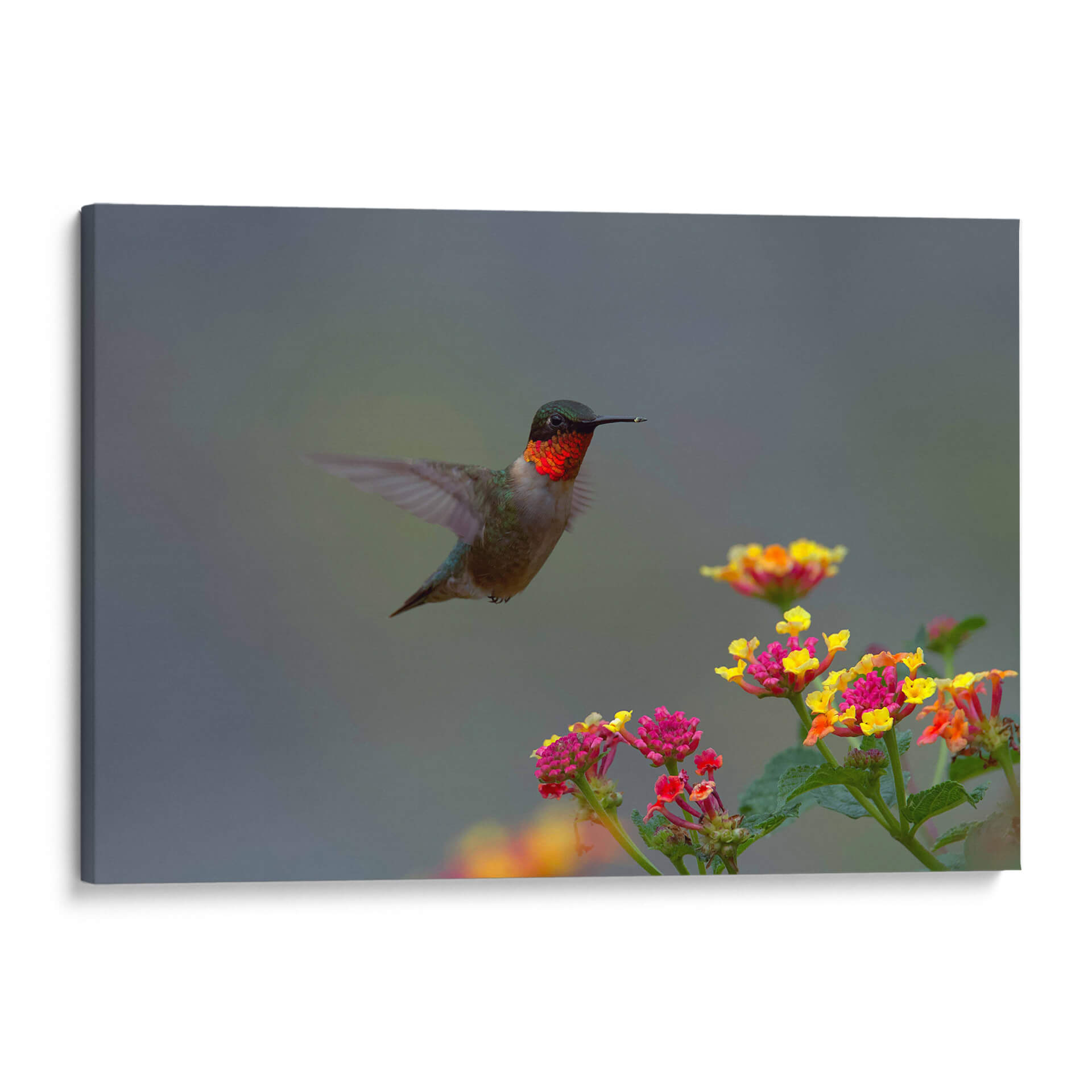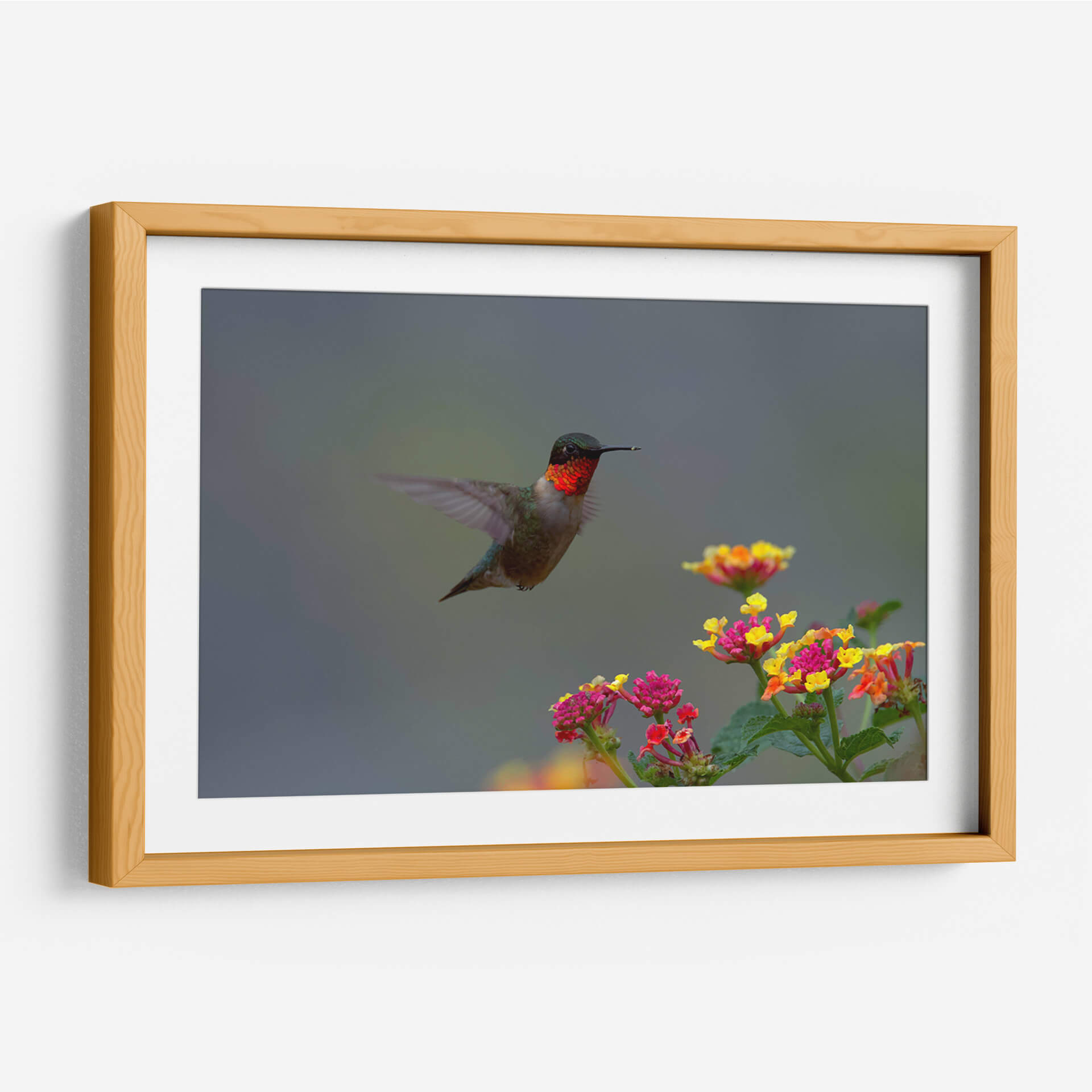 Captura la delicadeza y vibrante energía de la naturaleza con este exquisito cuadro decorativo de un colibrí garganta rubí. La obra presenta a esta pequeña maravilla alada en pleno vuelo, con sus alas etéreas capturadas en un instante de movimiento, mientras se acerca a un racimo de flores coloridas en tonos fucsia, amarillo y naranja. El contraste entre el plumaje iridiscente del colibrí, especialmente su garganta escarlata, y la suavidad del fondo grisáceo crea una atmósfera de serenidad y asombro. Este cuadro es ideal para añadir un toque de vida y color a cualquier espacio, desde una sala de estar moderna hasta un rincón tranquilo en tu oficina o dormitorio. Su estilo fotográfico y detallado, combinado con la belleza intrínseca del sujeto, lo convierte en una pieza de arte de pared que evoca la magia de los momentos efímeros y la exuberancia del mundo natural. Es una invitación a apreciar la fragilidad y la fuerza de la vida en su máxima expresión, transformando tu hogar en un santuario de paz y belleza natural.