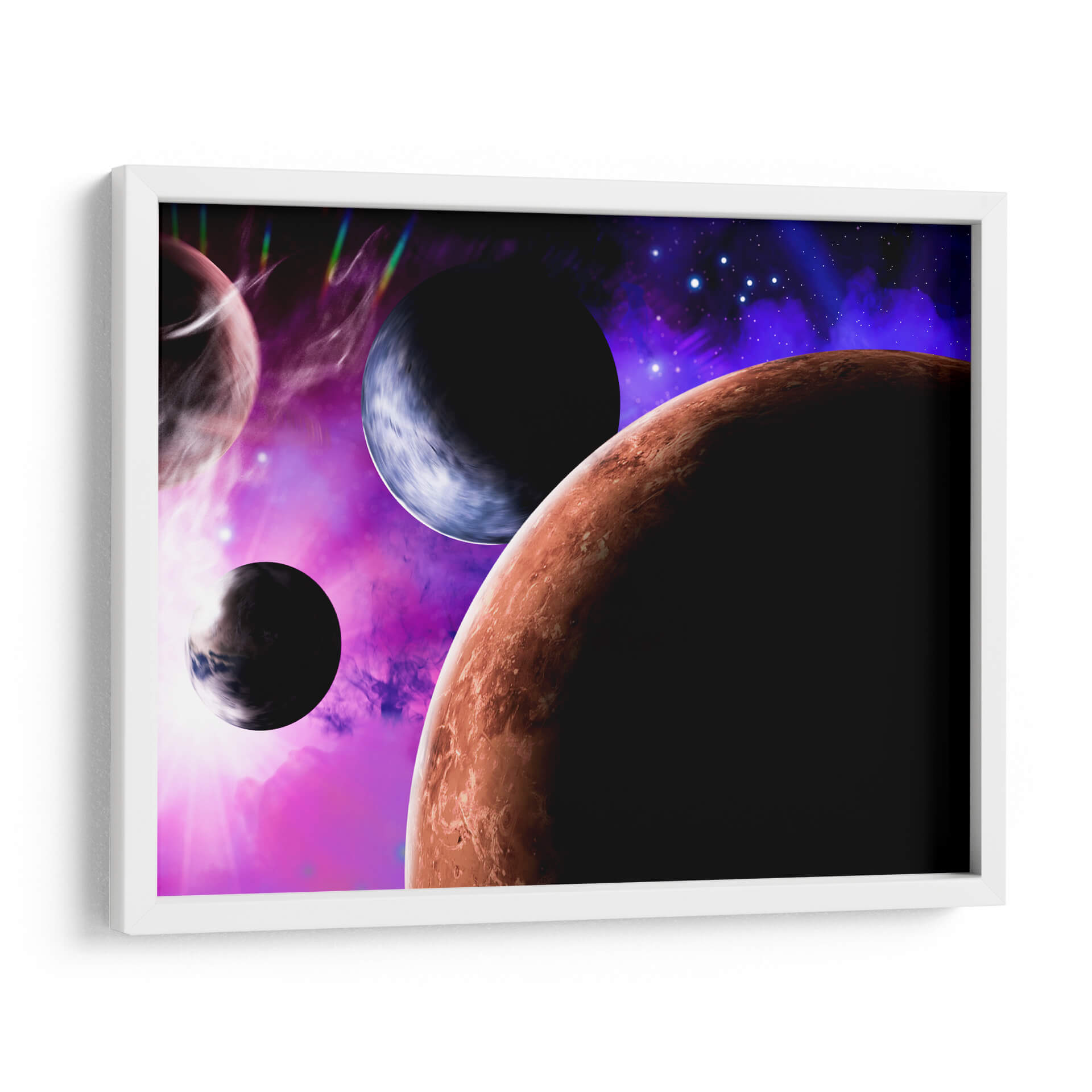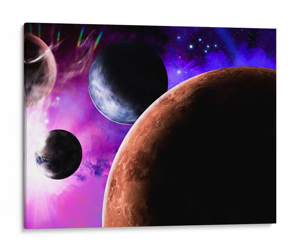 Sumérgete en la vastedad del cosmos con 'Colisión Planetaria', una obra de arte digital que captura la majestuosidad y el misterio del espacio exterior. Este cuadro decorativo te transporta a un universo vibrante, donde planetas de texturas ricas y colores intensos interactúan en una danza cósmica. La paleta de colores, dominada por profundos azules, púrpuras etéreos y un cálido tono terracota, crea una atmósfera de asombro y descubrimiento. La composición, con sus esferas celestes en primer plano y un fondo estrellado, evoca una sensación de escala y profundidad, invitando a la contemplación. Ideal para quienes buscan añadir un toque de ciencia ficción y maravilla a su hogar u oficina, este cuadro es perfecto para salas de estar, estudios o cualquier espacio que desee una declaración visual audaz y enigmática. Transforma tu pared en una ventana al universo y deja que la energía de 'Colisión Planetaria' inspire tu imaginación.