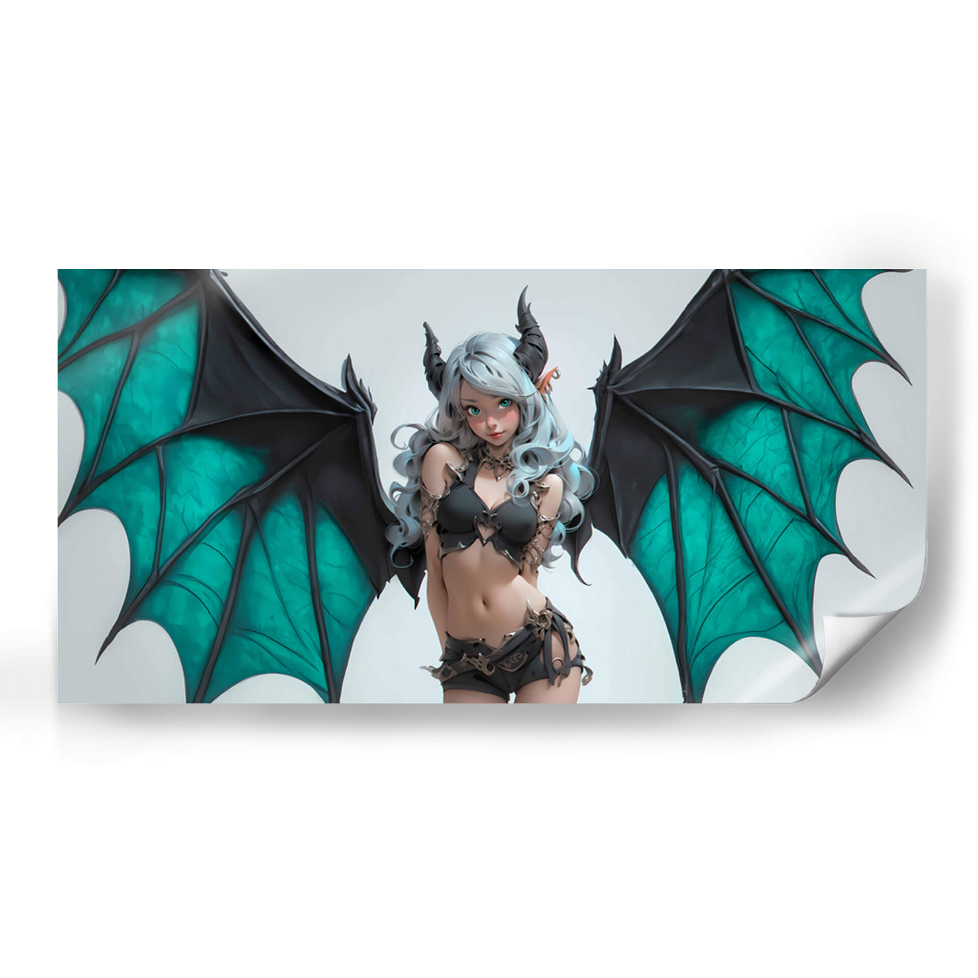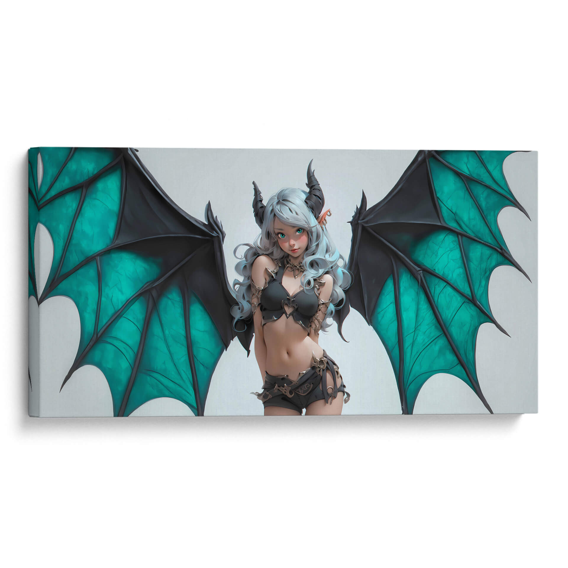 Sumérgete en el enigmático mundo de "Demonia Turquesa", una obra de arte digital que captura la esencia de la fantasía y el misterio. Esta pieza presenta una figura femenina etérea, adornada con imponentes alas que despliegan un vibrante tono turquesa, contrastando con el negro profundo de su estructura. Sus cabellos plateados y ojos penetrantes añaden un aura de seducción y poder, mientras que los detalles de su vestimenta y sus cuernos evocan una estética de demonio moderno. La composición, centrada en la figura, crea un fuerte impacto visual y una conexión directa con el espectador. La paleta de colores, dominada por el turquesa eléctrico y los grises suaves, junto con toques oscuros, genera una atmósfera cautivadora, perfecta para espacios que buscan un toque de originalidad y audacia. Este cuadro decorativo es ideal para salas de estar, dormitorios o estudios que deseen una pieza de conversación que despierte la imaginación y añada un carácter único a la decoración.