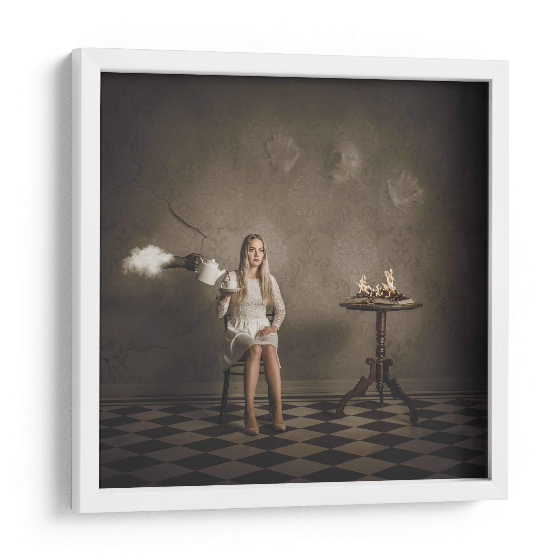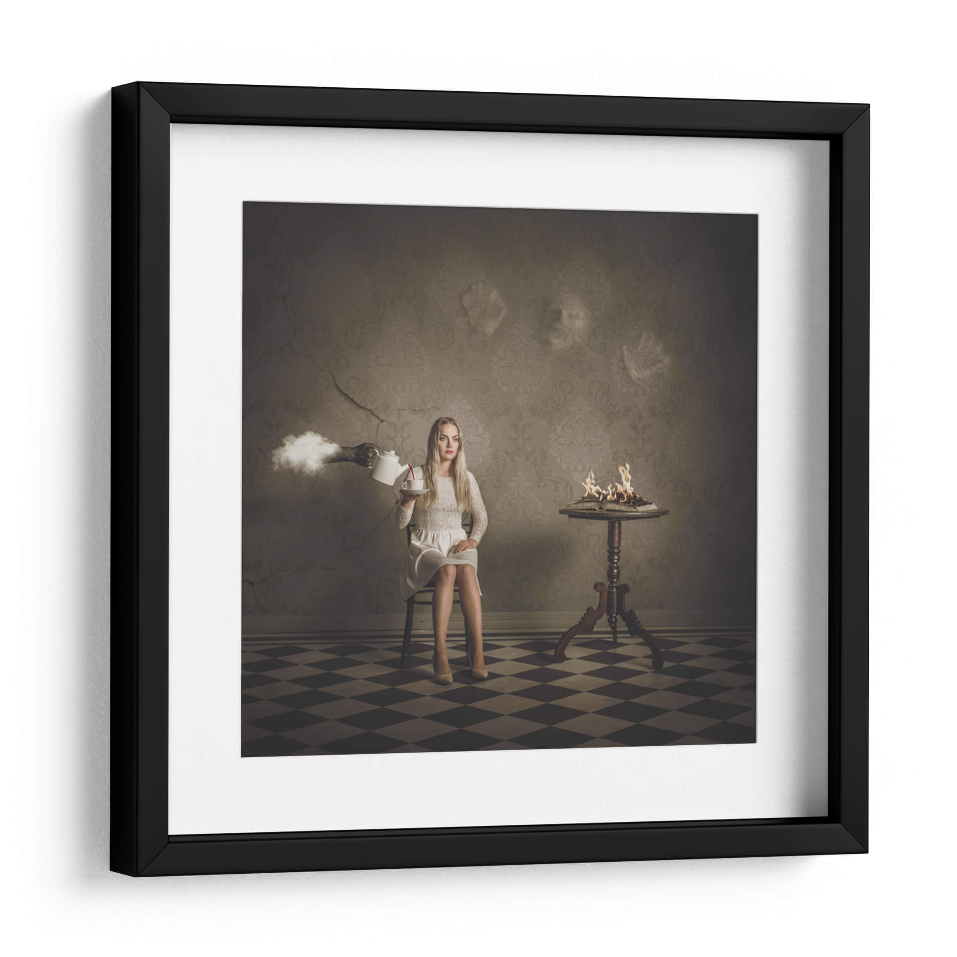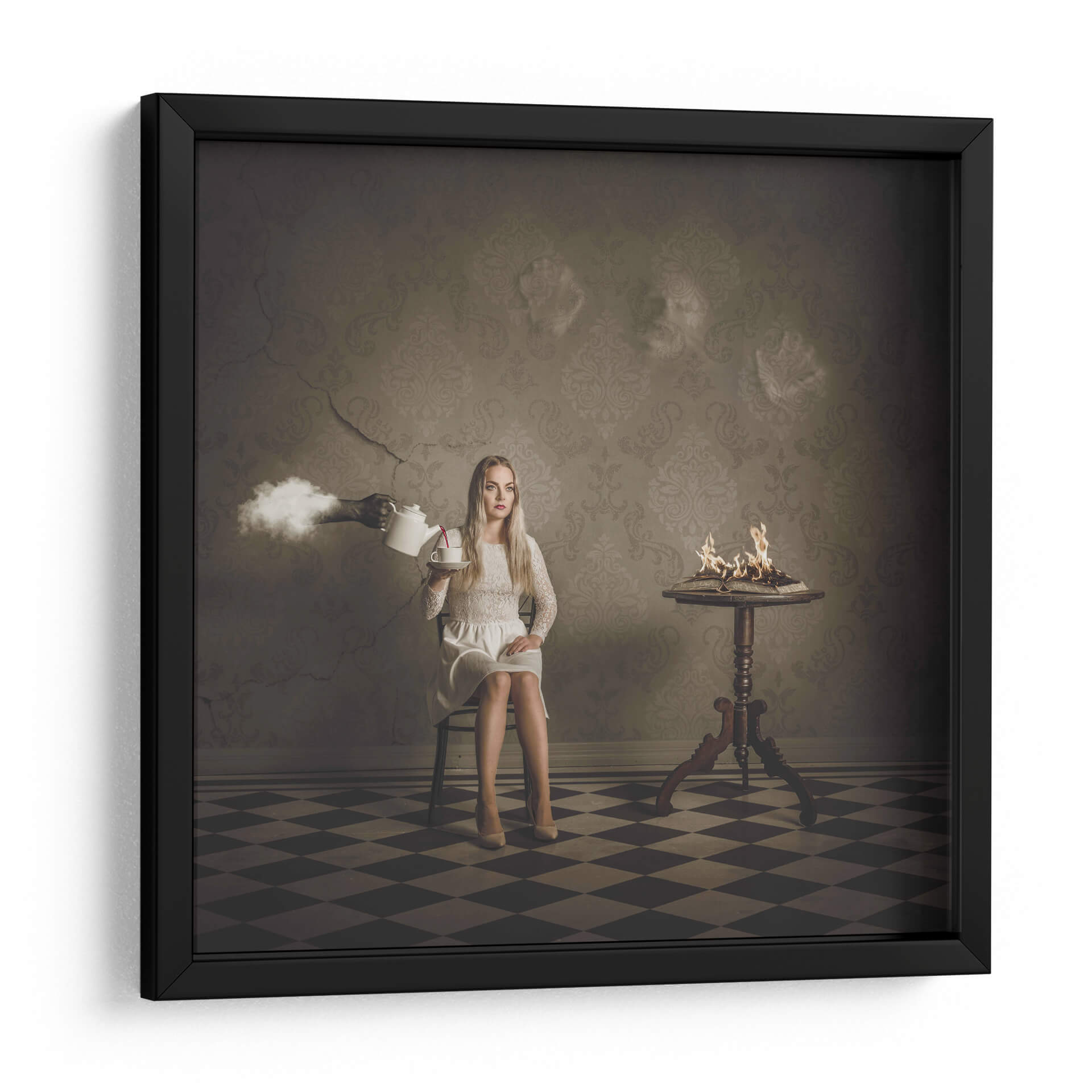 Sumérgete en la enigmática obra de Petri Damsten, titulada "Desayuno Ardiente", un cuadro decorativo que trasciende la realidad. Esta pieza visualmente cautivadora presenta a una mujer etérea sentada, en medio de una escena surrealista donde una tetera vierte vapor, mientras un libro arde sobre una mesa ornamentada. Los tonos tierra y grises predominantes, junto con el patrón damasco de la pared y el suelo de ajedrez, crean una atmósfera de ensueño y misterio. La iluminación sutil realza la delicadeza de la mujer y el drama del fuego, invitando a la reflexión sobre la dualidad de la vida, la calma versus el caos. "Desayuno Ardiente" es perfecto para añadir un toque de intriga y sofisticación a tu sala de estar, estudio o incluso una oficina moderna. Este cuadro decorativo abstracto invita a la contemplación y será un punto de conversación fascinante, aportando una dimensión única a tu decoración de pared y al diseño interior de tu hogar, fusionando elementos clásicos con una narrativa contemporánea sorprendente y evocadora.