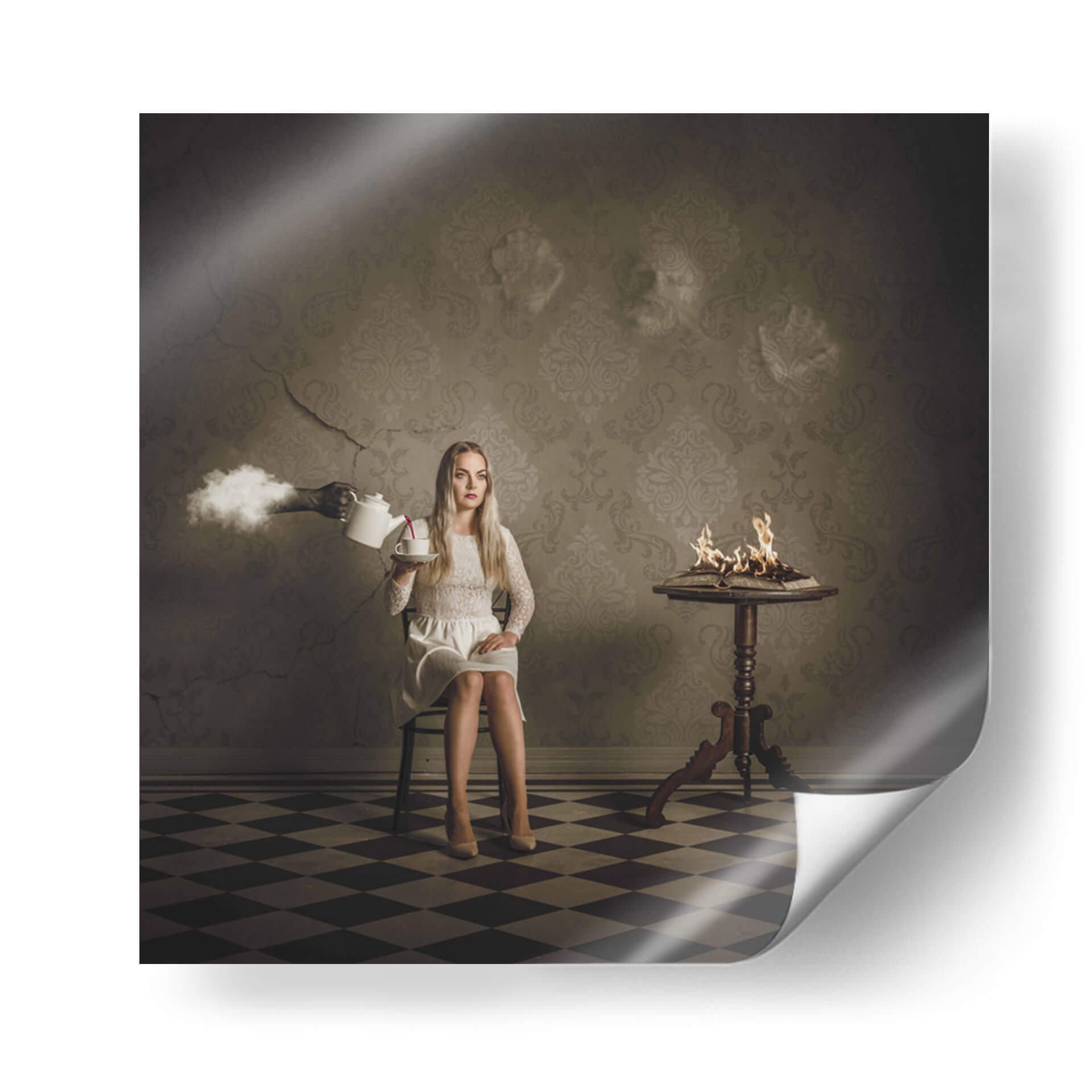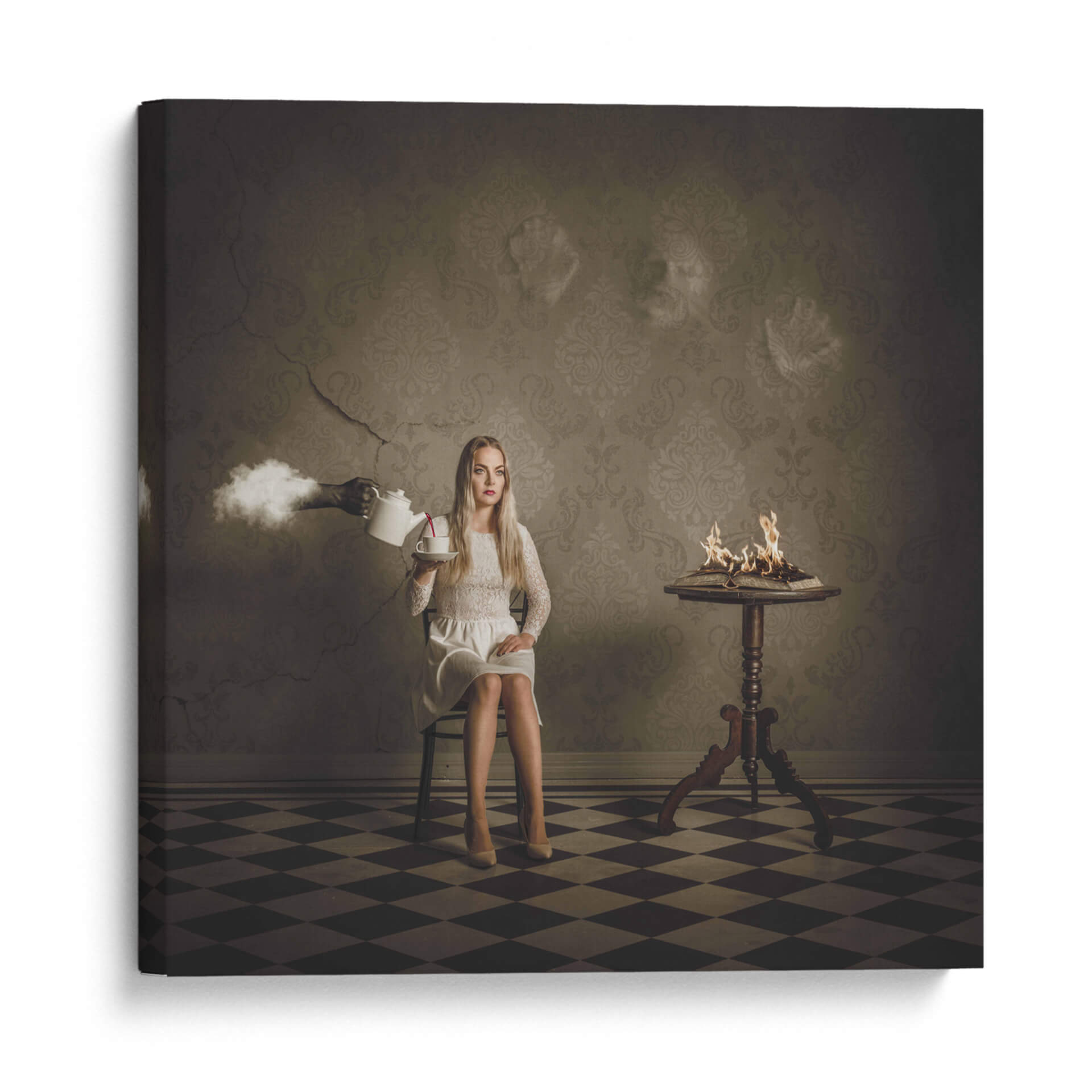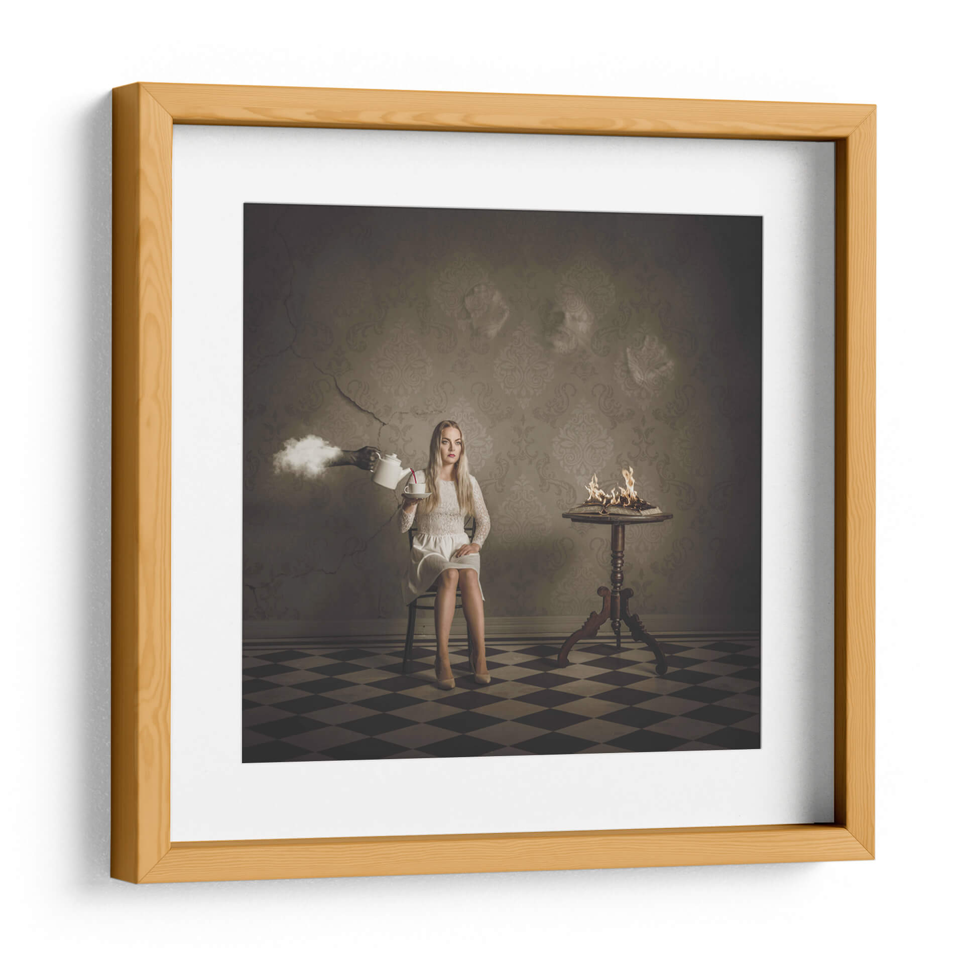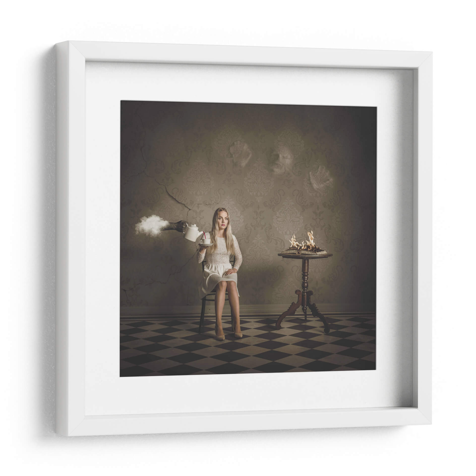 Sumérgete en la enigmática obra de Petri Damsten, titulada "Desayuno Ardiente", un cuadro decorativo que trasciende la realidad. Esta pieza visualmente cautivadora presenta a una mujer etérea sentada, en medio de una escena surrealista donde una tetera vierte vapor, mientras un libro arde sobre una mesa ornamentada. Los tonos tierra y grises predominantes, junto con el patrón damasco de la pared y el suelo de ajedrez, crean una atmósfera de ensueño y misterio. La iluminación sutil realza la delicadeza de la mujer y el drama del fuego, invitando a la reflexión sobre la dualidad de la vida, la calma versus el caos. "Desayuno Ardiente" es perfecto para añadir un toque de intriga y sofisticación a tu sala de estar, estudio o incluso una oficina moderna. Este cuadro decorativo abstracto invita a la contemplación y será un punto de conversación fascinante, aportando una dimensión única a tu decoración de pared y al diseño interior de tu hogar, fusionando elementos clásicos con una narrativa contemporánea sorprendente y evocadora.