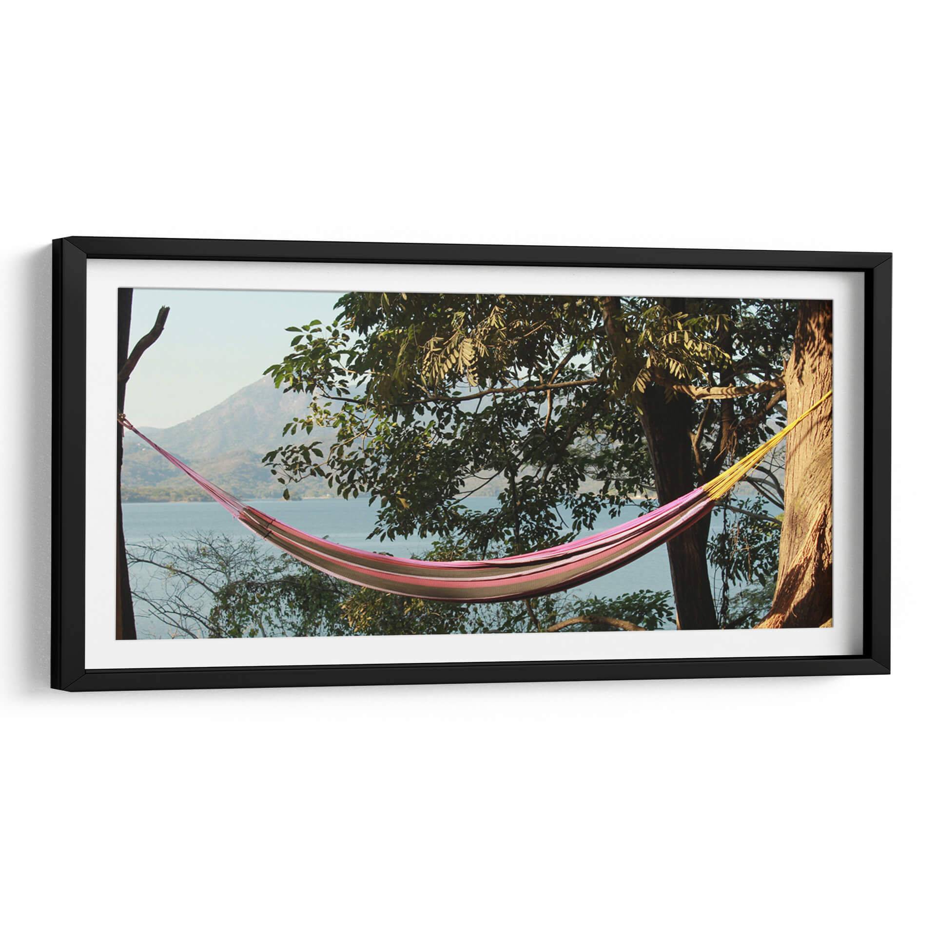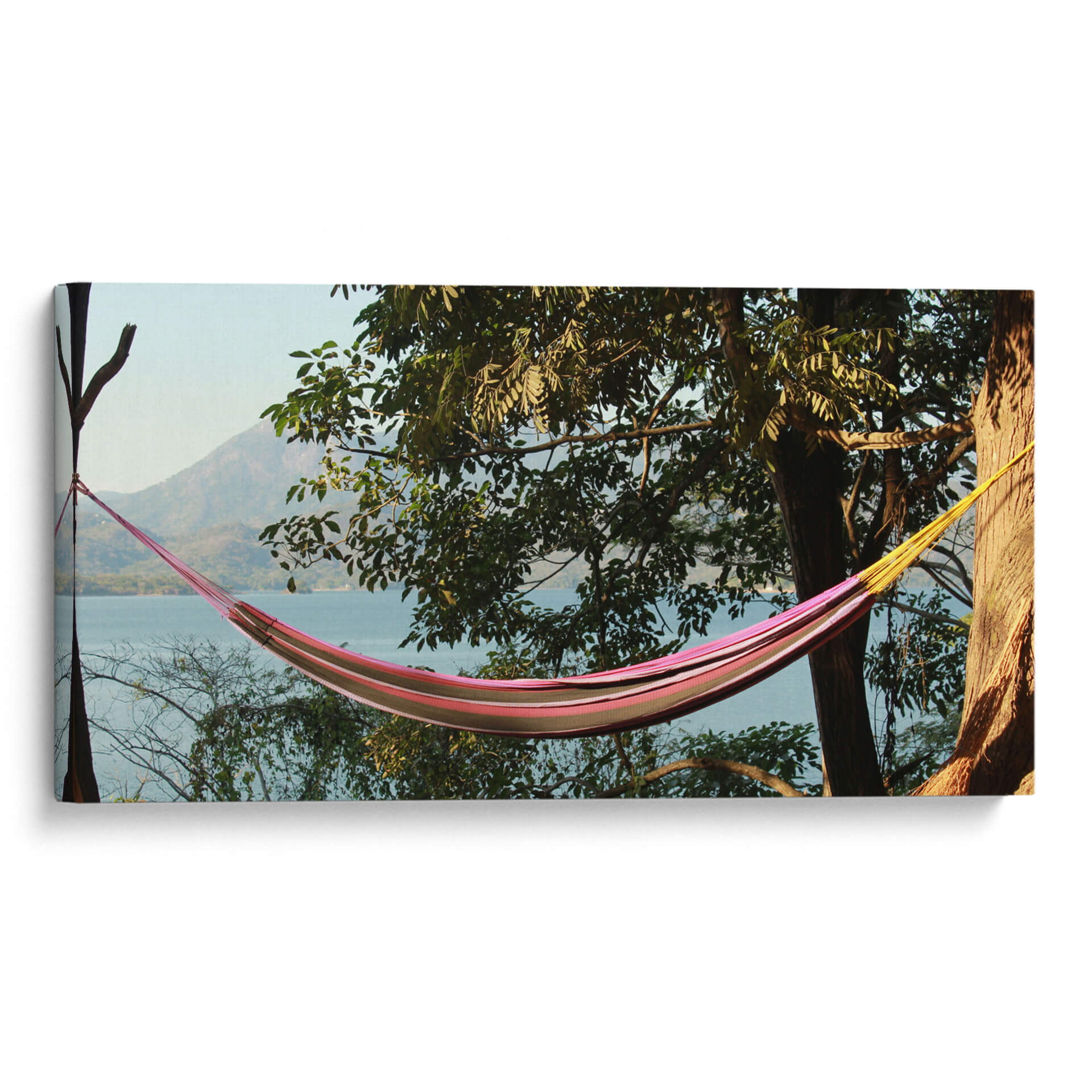Sumérgete en la serenidad de 'Descanso', una obra de arte que captura la esencia de la relajación y la conexión con la naturaleza. Este cuadro decorativo presenta una hamaca vibrante, adornada con rayas rosas y marrones, suspendida entre dos árboles frondosos. Al fondo, un vasto lago de color azul sereno se extiende hasta un horizonte montañoso bañado por la luz tenue de un día claro. La paleta de colores, dominada por verdes profundos de la vegetación, azules acuosos y toques cálidos de rosa y marrón en la hamaca, crea una atmósfera de paz y tranquilidad. El estilo, que evoca la fotografía de paisajes con un toque artístico, se centra en la composición armónica y la captura de un momento idílico. Es la pieza perfecta para transformar cualquier espacio en un santuario de calma, ideal para dormitorios, salas de estar o estudios donde se busca un refugio visual del ajetreo diario. Inspira tus sentidos y trae la promesa de un merecido descanso a tu hogar con este cautivador cuadro decorativo.