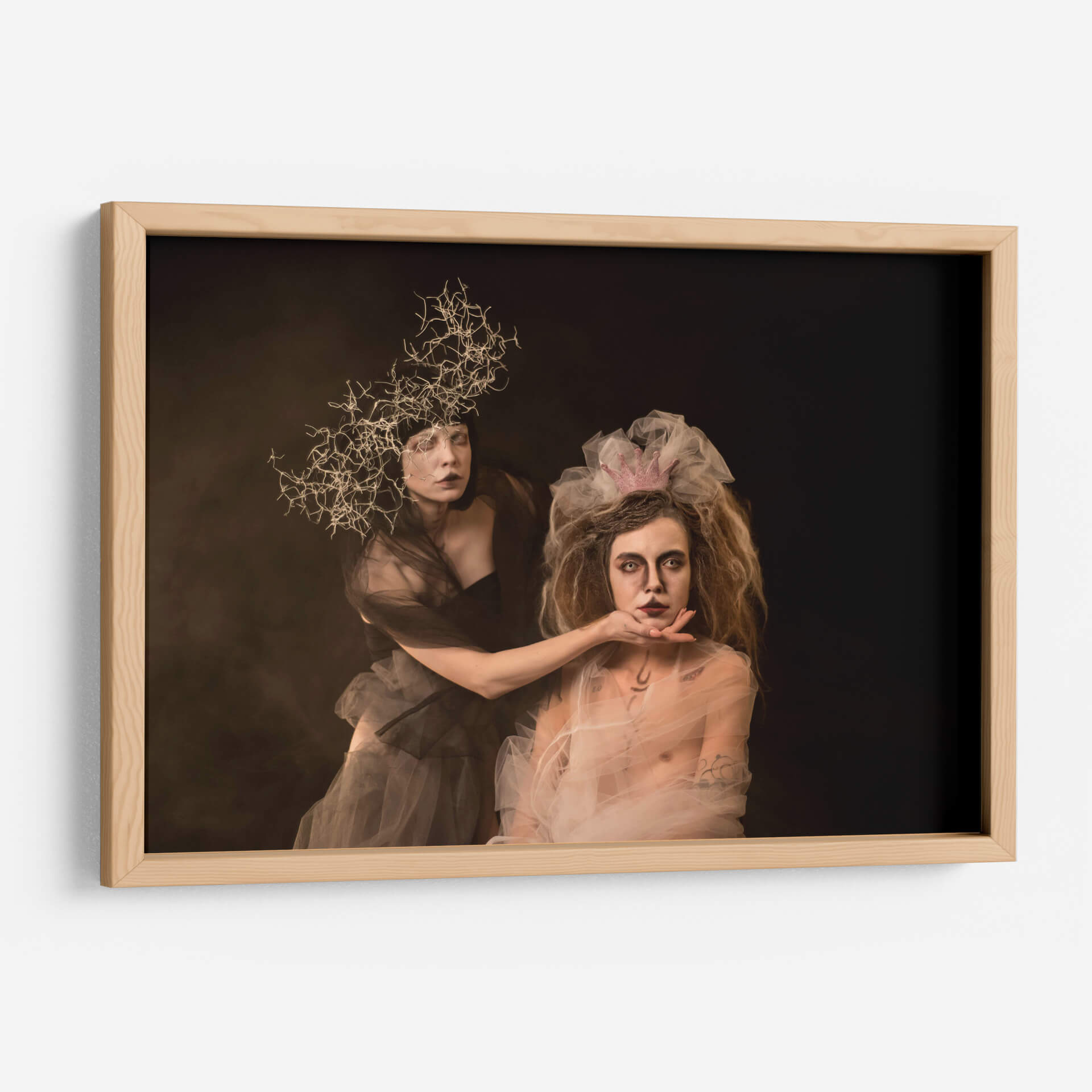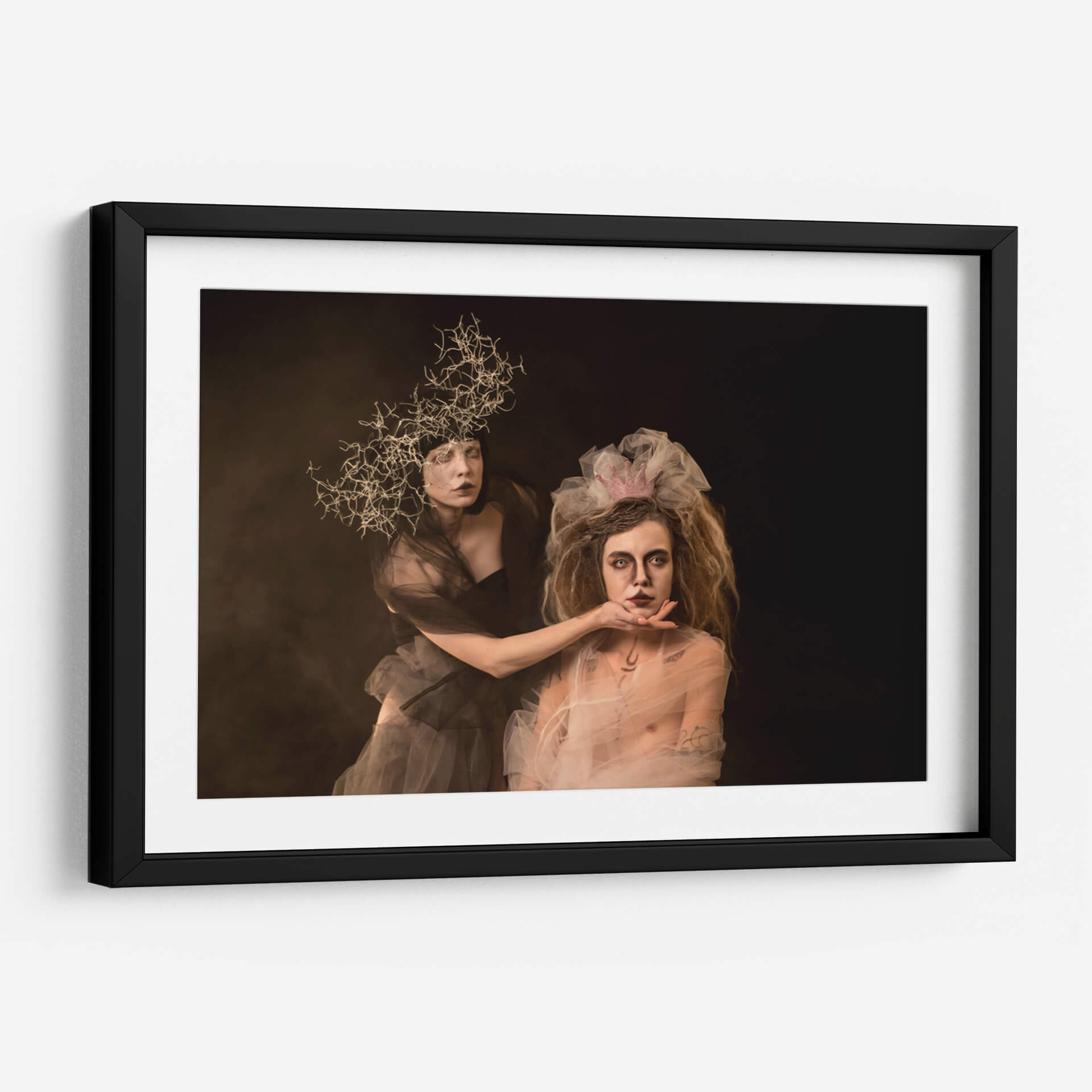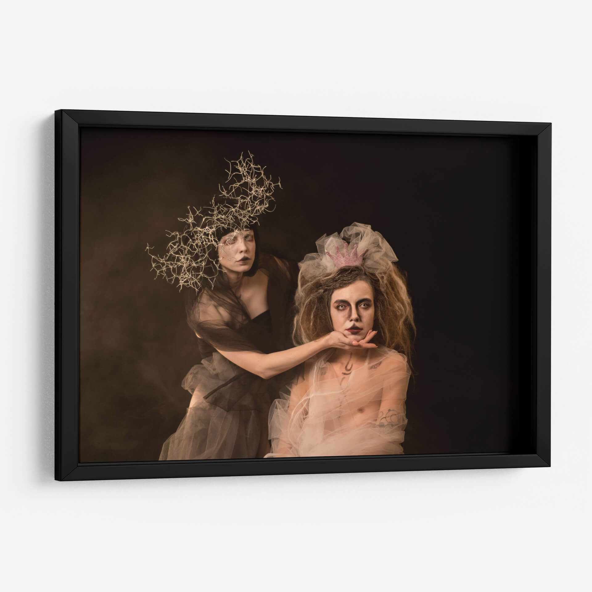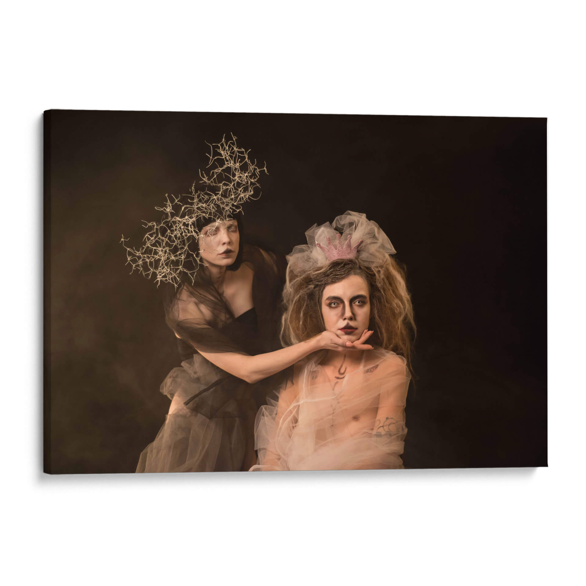 Sumérgete en la dualidad intrigante de 'El Bien y el Mal', una obra de arte visualmente impactante de Anca Milushev. Esta pieza captura la tensión entre dos fuerzas opuestas a través de una composición evocadora y una paleta de colores sombría y cautivadora. Dos figuras se presentan en un primer plano dramático, envueltas en velos etéreos que contrastan con sus expresiones enigmáticas. La figura de la izquierda, con un intrincado tocado que recuerda a ramas secas, extiende su mano para tocar el rostro de la figura de la derecha. Esta última, con un aura de fragilidad y una corona tenue, parece aceptar el gesto con una mirada introspectiva y casi ausente. Los tonos oscuros del fondo y la iluminación selectiva crean una atmósfera de misterio y reflexión profunda. El uso de velos y maquillajes dramáticos añade un elemento teatral y surrealista a la imagen, invitando a la interpretación personal. 'El Bien y el Mal' es una adición poderosa para cualquier espacio que busque un toque de drama sofisticado y contemplación. Ideal para salas de estar, estudios o cualquier rincón que invite a la introspección, este cuadro decorativo contemporáneo promete ser un punto focal que genere conversación y admiración. Añade profundidad y carácter a tu decoración con esta pieza única.