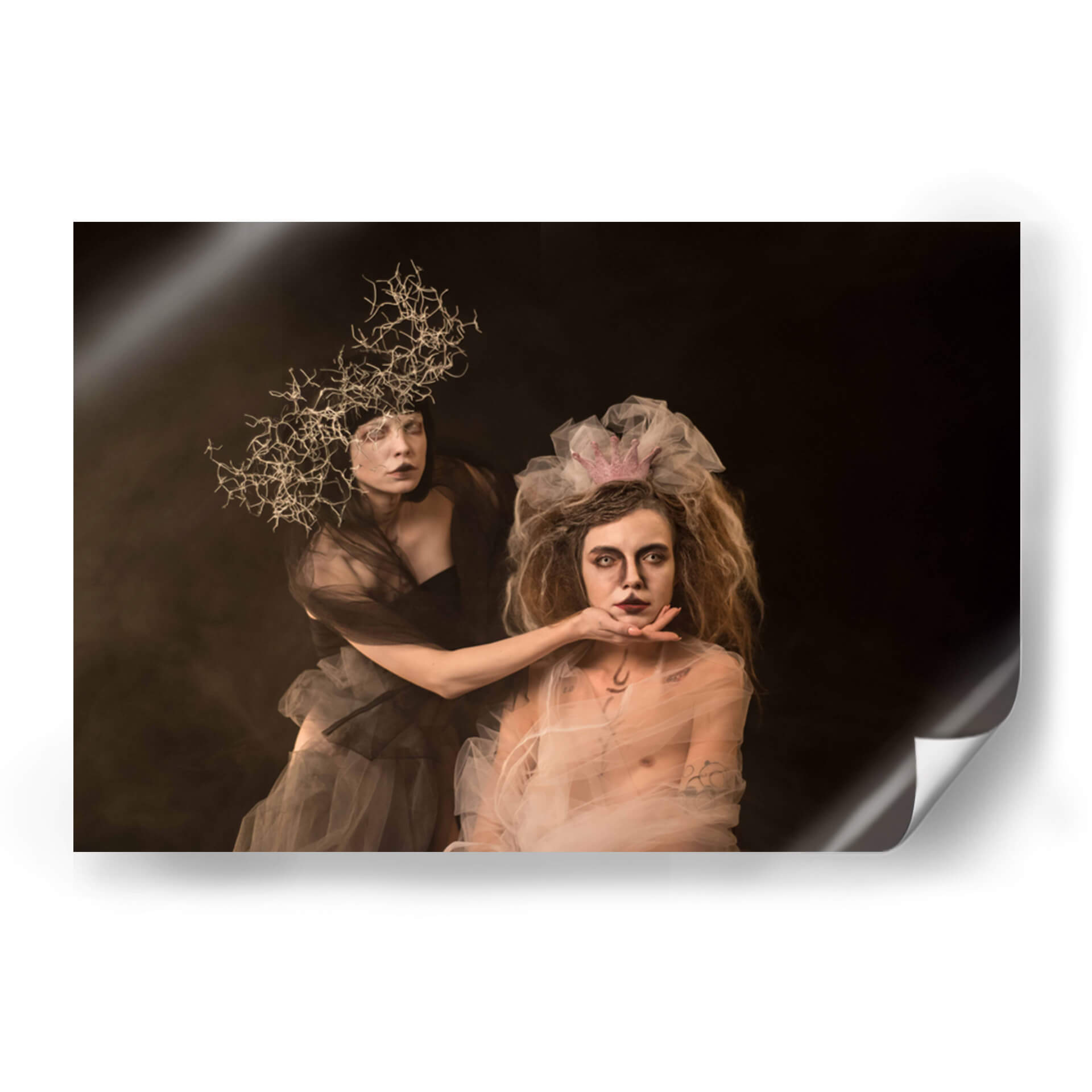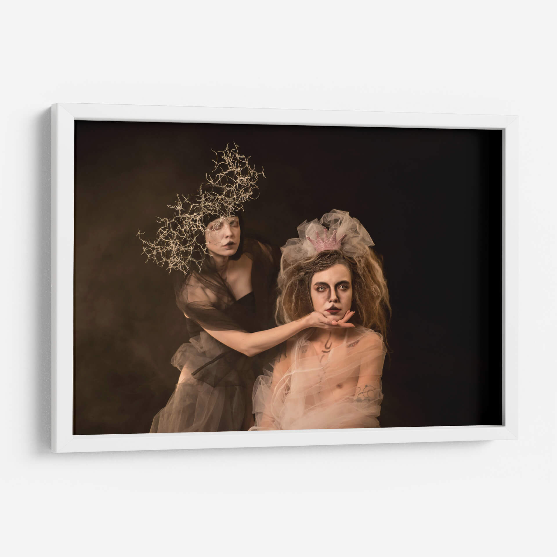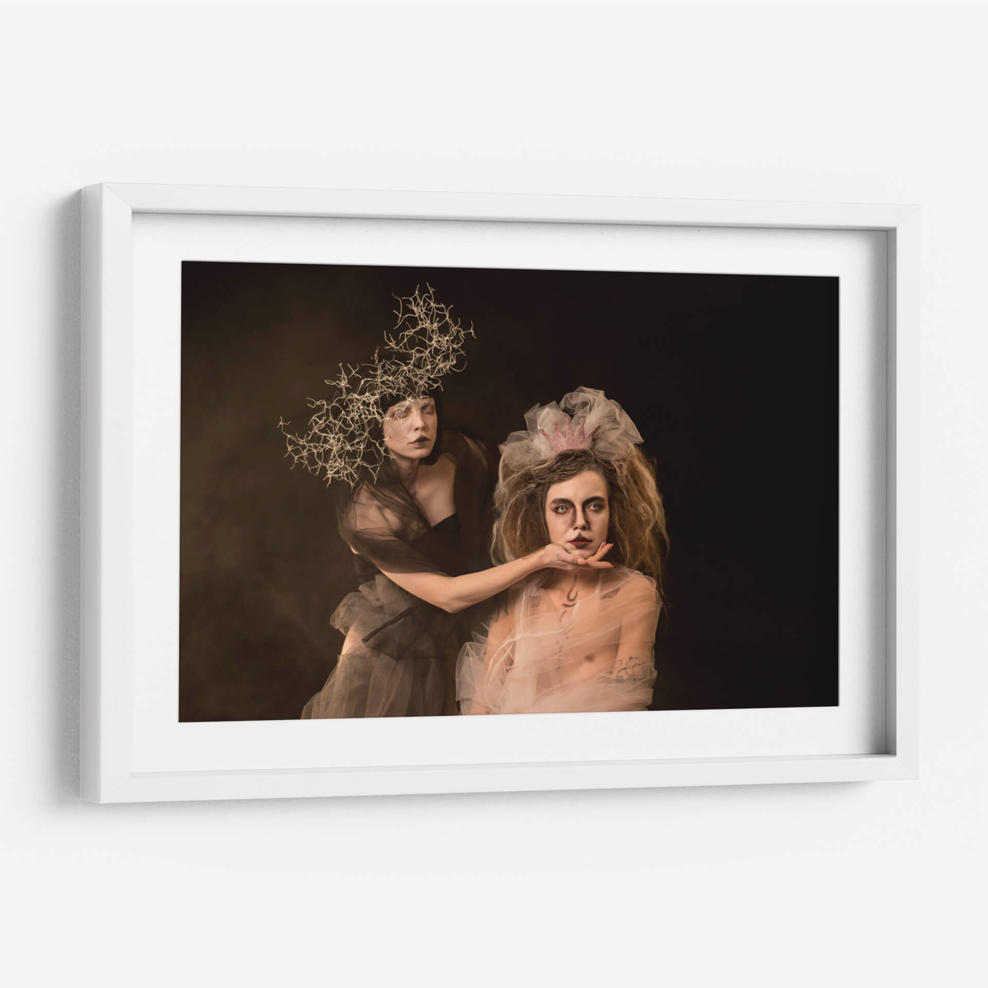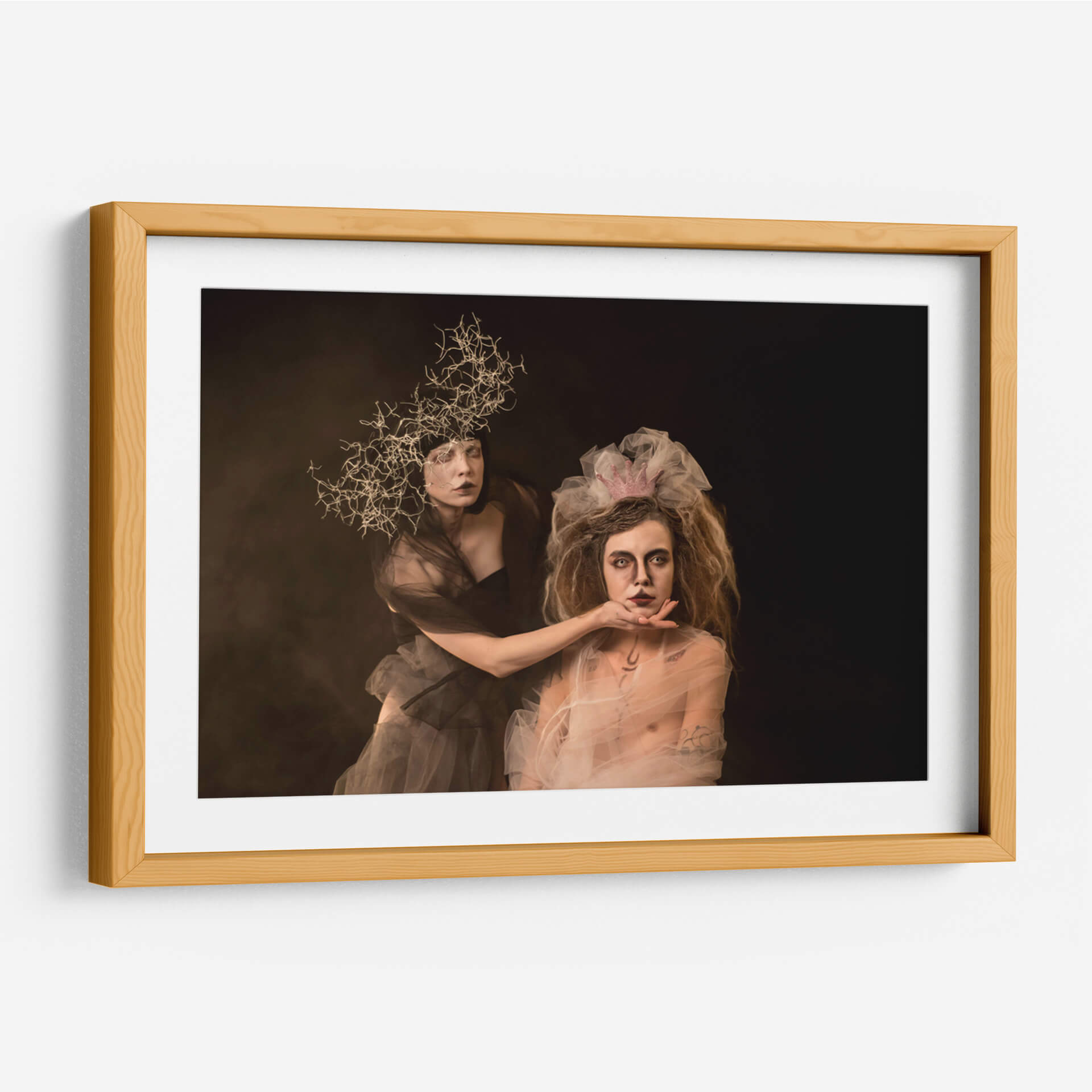Sumérgete en la dualidad intrigante de 'El Bien y el Mal', una obra de arte visualmente impactante de Anca Milushev. Esta pieza captura la tensión entre dos fuerzas opuestas a través de una composición evocadora y una paleta de colores sombría y cautivadora. Dos figuras se presentan en un primer plano dramático, envueltas en velos etéreos que contrastan con sus expresiones enigmáticas. La figura de la izquierda, con un intrincado tocado que recuerda a ramas secas, extiende su mano para tocar el rostro de la figura de la derecha. Esta última, con un aura de fragilidad y una corona tenue, parece aceptar el gesto con una mirada introspectiva y casi ausente. Los tonos oscuros del fondo y la iluminación selectiva crean una atmósfera de misterio y reflexión profunda. El uso de velos y maquillajes dramáticos añade un elemento teatral y surrealista a la imagen, invitando a la interpretación personal. 'El Bien y el Mal' es una adición poderosa para cualquier espacio que busque un toque de drama sofisticado y contemplación. Ideal para salas de estar, estudios o cualquier rincón que invite a la introspección, este cuadro decorativo contemporáneo promete ser un punto focal que genere conversación y admiración. Añade profundidad y carácter a tu decoración con esta pieza única.