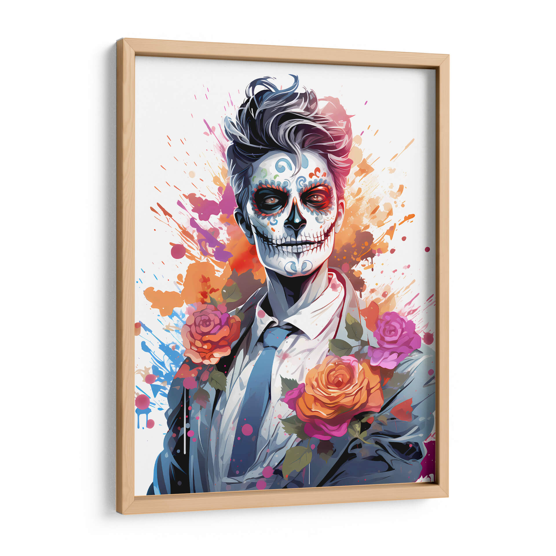 Sumérgete en la vibrante tradición del Día de Muertos con este cautivador cuadro decorativo, 'El Catrín - Día de Muertos - 12'. La obra presenta un retrato estilizado de un catrín, con el icónico maquillaje de calavera que fusiona elementos festivos y solemnes. Los colores explotan en un estallido de acuarelas salpicadas, con tonos vibrantes de naranja, rosa, azul y morado que contrastan maravillosamente con el rostro detallado y el traje elegante del personaje. Las rosas rojas y fucsias añaden un toque de belleza y romanticismo, equilibrando la intensidad del tema. Este cuadro decorativo es una pieza de arte contemporáneo que evoca tanto la solemnidad de la celebración como la alegría de la vida. Su estilo digital único, con pinceladas audaces y una composición dinámica, lo convierte en un punto focal impresionante para cualquier espacio. Ideal para quienes buscan añadir un toque de cultura, color y misterio a su hogar u oficina, este cuadro es perfecto para salas de estar, estudios o cualquier rincón que necesite una inyección de personalidad y carácter.