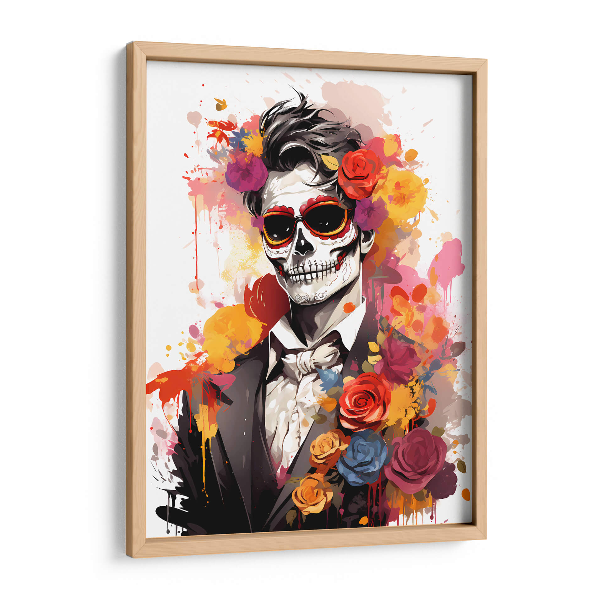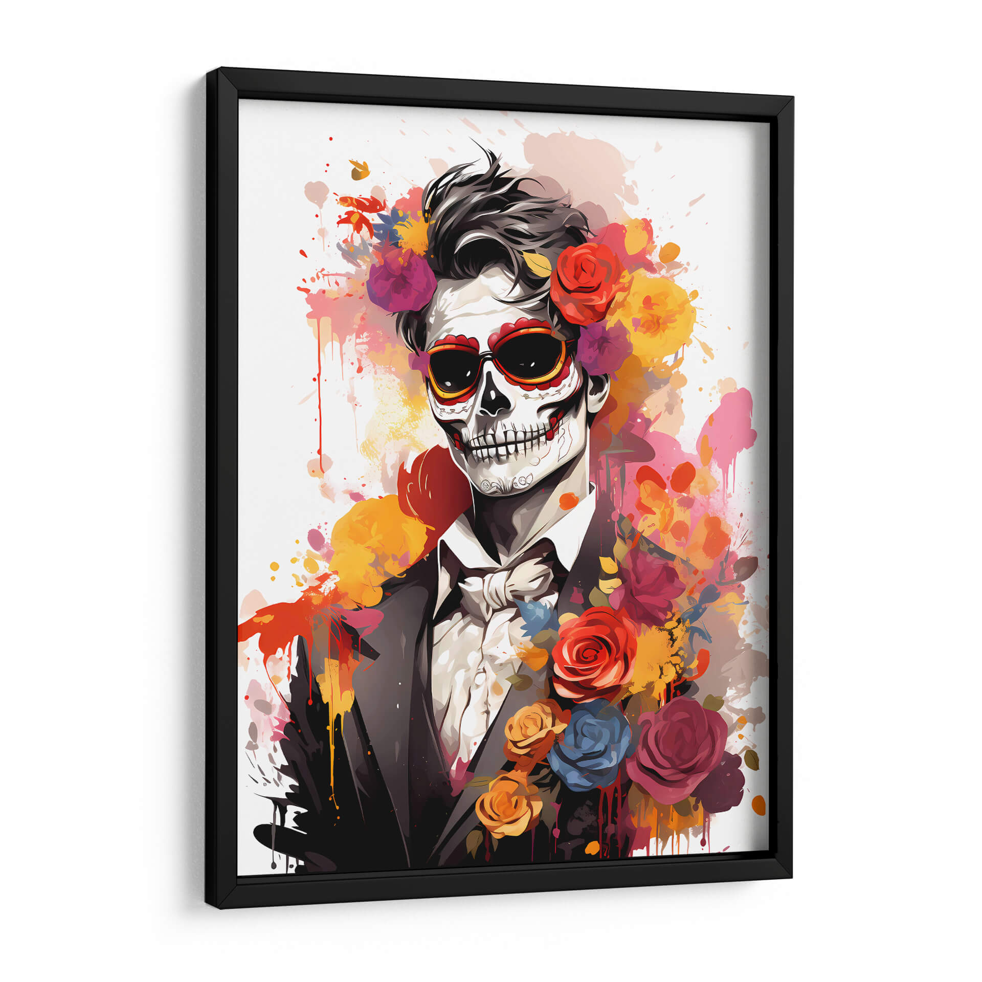 Sumérgete en la vibrante tradición mexicana con este impactante cuadro decorativo inspirado en el Día de Muertos. La obra presenta un enigmático "Catrín", una figura icónica que fusiona la calavera tradicional con un estilo moderno y audaz. Destaca su rostro maquillado con el clásico "calavera", resaltado por unas llamativas gafas de sol con detalles rojos y amarillos, y un peinado elegante. La composición se ve enriquecida por una explosión de colores vibrantes y fluidos, simulando acuarelas, que rodean al personaje. Las flores, rojas, naranjas, amarillas y púrpuras, añaden un toque de vitalidad y celebración a la pieza, contrastando con el traje oscuro del Catrín y el fondo blanco salpicado de pintura. Este cuadro es una fusión única de lo ancestral y lo contemporáneo, ideal para añadir un toque de misterio, color y cultura a cualquier espacio. Perfecto para salas de estar, recibidores o incluso oficinas que buscan una decoración de pared con carácter y significado. Deja que esta obra maestra textil transforme tu hogar en un lienzo de expresión artística y celebración cultural.