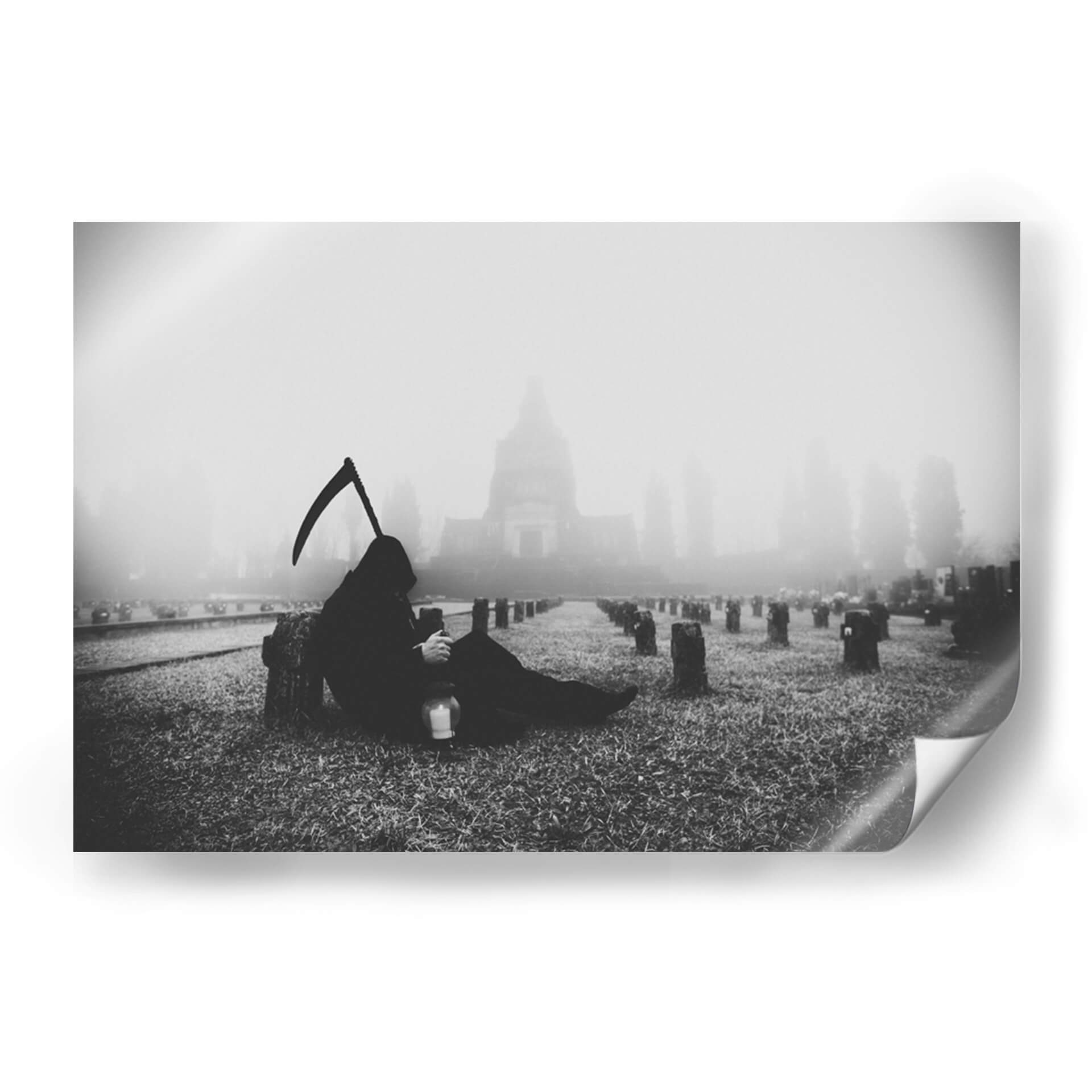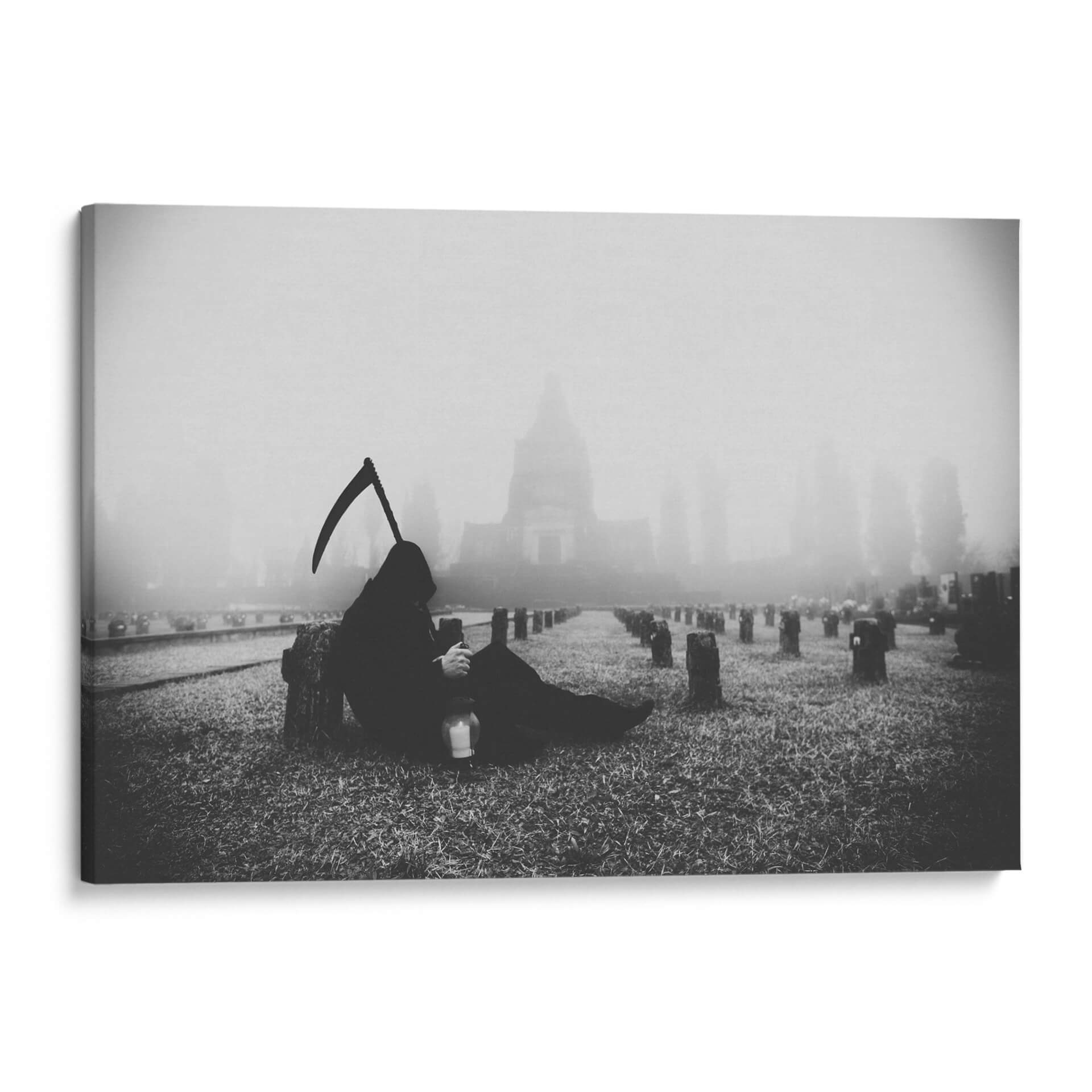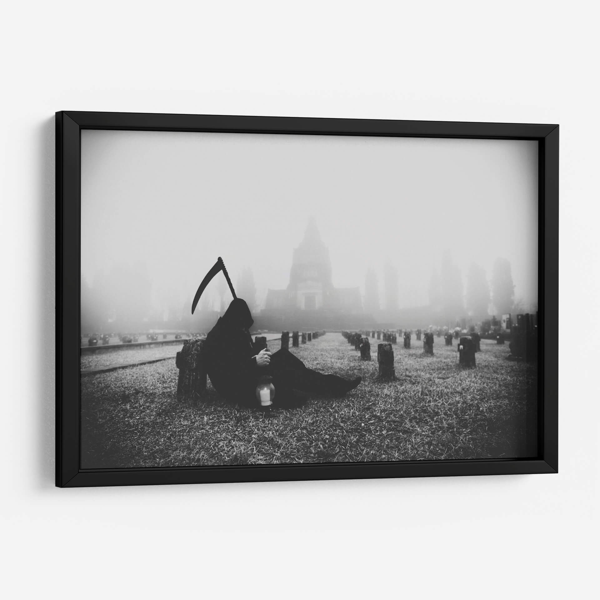 Sumérgete en la atmósfera enigmática y contemplativa de "El descanso de la Parca" de Marco Redaelli. Esta impactante obra de arte decorativo captura la figura icónica de la Parca sentada en un cementerio neblinoso, sosteniendo una vela que ilumina tenues destellos de esperanza o reflexión en medio de la quietud eterna. La paleta de colores monocromática, dominada por grises profundos y blancos etéreos, crea un ambiente melancólico y sereno, invitando a la introspección sobre la vida y el tiempo. Las filas de lápidas y la silueta de una estructura arquitectónica en el fondo, envueltas en una bruma misteriosa, intensifican la sensación de paz sombría y atemporalidad. "El descanso de la Parca" es ideal para espacios que buscan un toque de profundidad emocional y un punto de conversación único, como un estudio, una sala de estar con un estilo gótico o moderno, o incluso un dormitorio para aquellos que aprecian la belleza en lo efímero. Este cuadro decorativo contemporáneo no solo embellece tu pared, sino que también evoca una profunda meditación sobre la existencia, transformando tu hogar en un santuario de arte reflexivo y estéticamente poderoso.