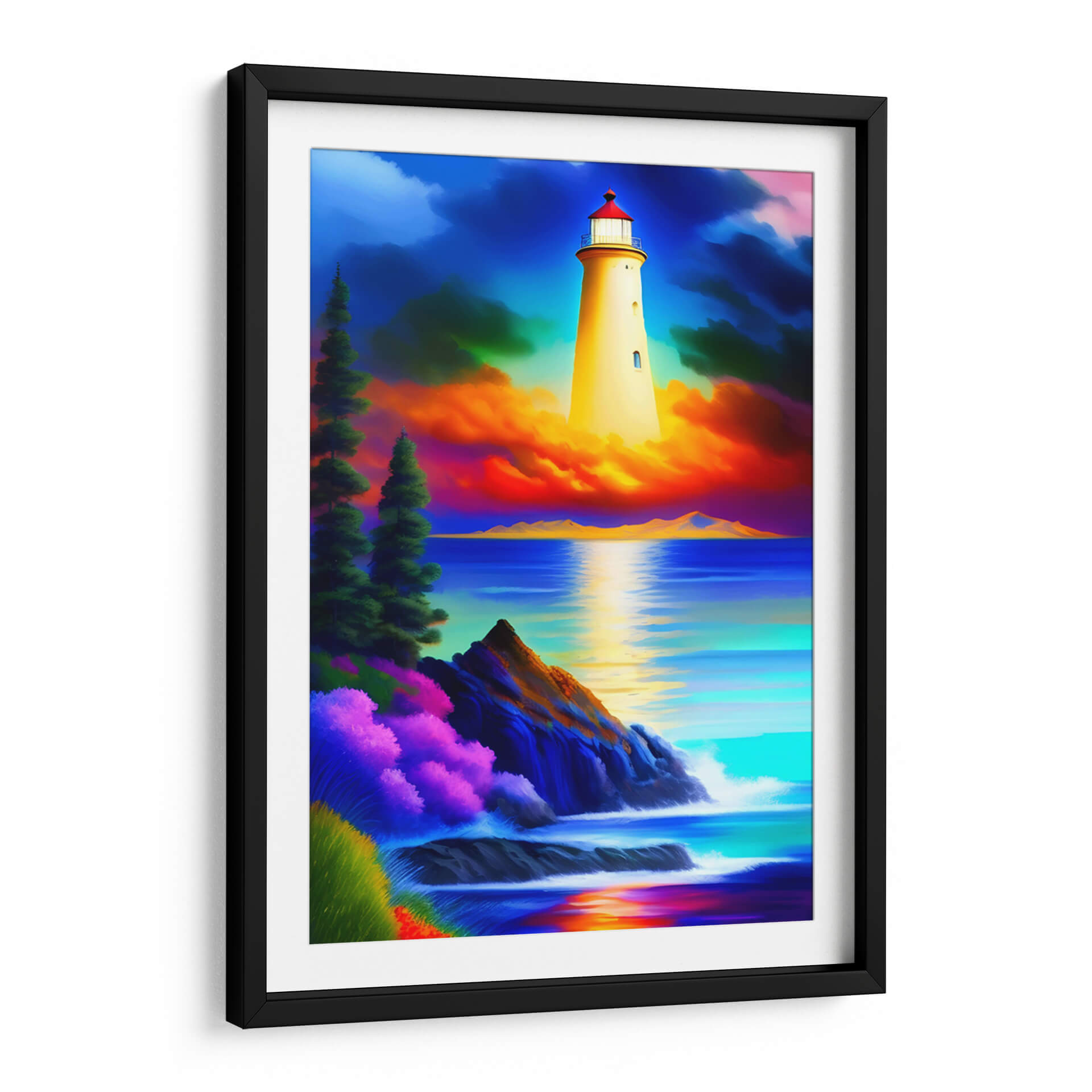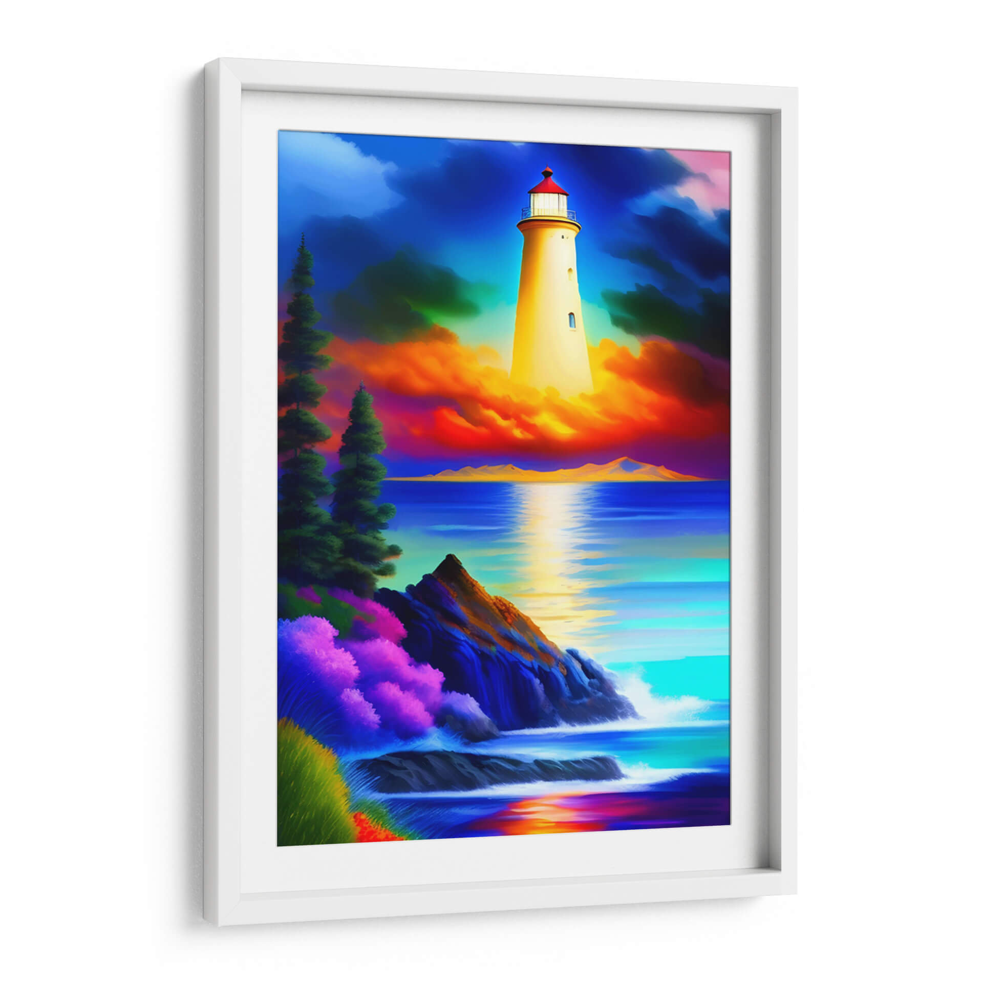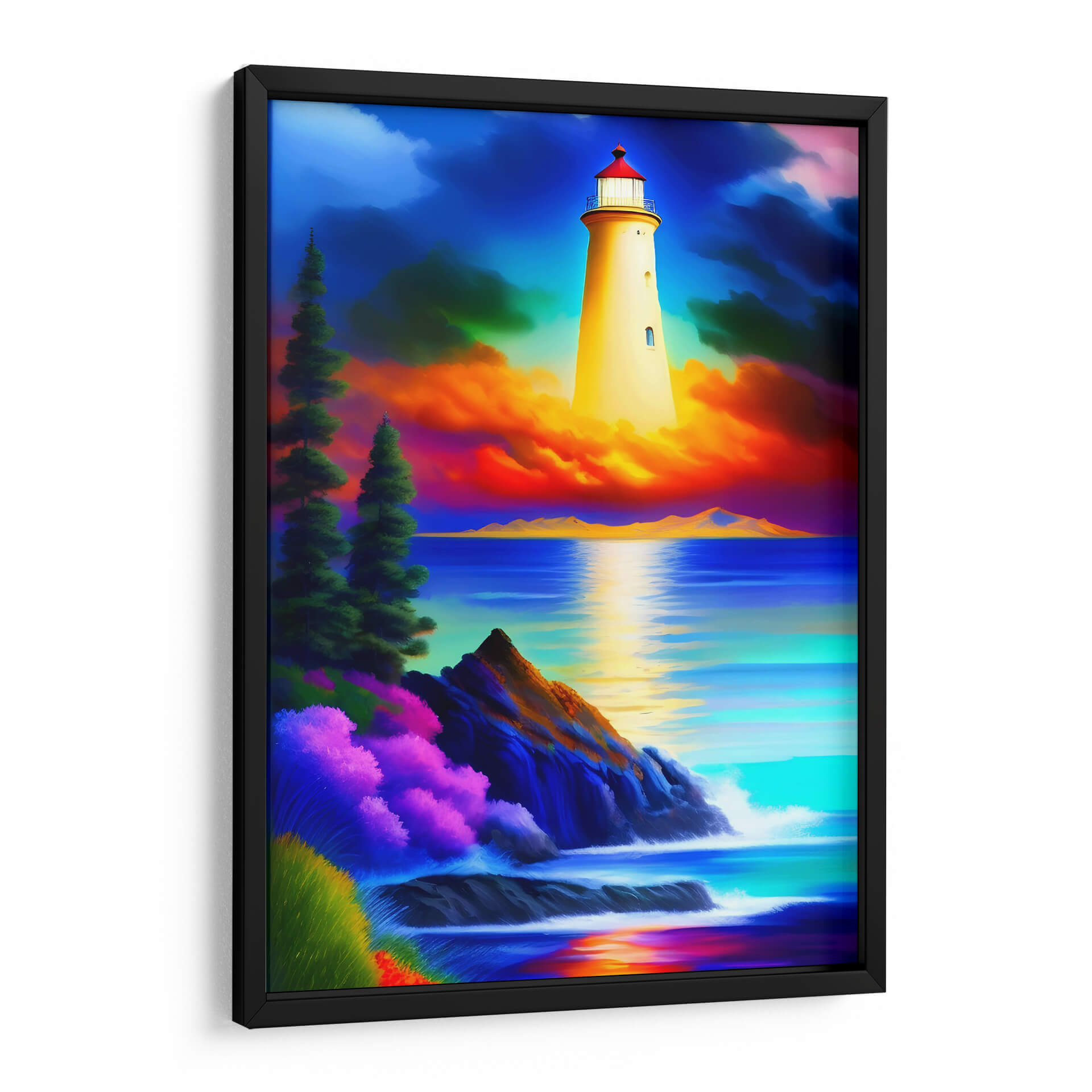 Sumérgete en la serenidad y el poder de la naturaleza con "El Faro de Monet", una obra de arte digital que captura la esencia de la costa con una paleta de colores vibrante y evocadora. Este cuadro decorativo presenta un imponente faro de color amarillo brillante, erigido majestuosamente sobre una escena marina dramática. El cielo, un tapiz de azules profundos y nubes teñidas de intensos naranjas y rosas, contrasta con el azul turquesa y zafiro del mar. La composición se enriquece con detalles costeros, donde rocas escarpadas se encuentran con el embate de las olas y una exuberante vegetación en tonos púrpuras y verdes añade un toque de vitalidad. La luz del faro se refleja en el agua, creando un camino de serenidad y esperanza. "El Faro de Monet" es una pieza que invita a la contemplación, ideal para añadir un punto focal de color y emoción a salas de estar, dormitorios o estudios. Su estilo, que fusiona elementos realistas con una interpretación artística audaz, lo convierte en una adición perfecta para quienes buscan un arte que inspire calma y admiración. Este cuadro decorativo transformará cualquier espacio en un refugio de tranquilidad y belleza natural.