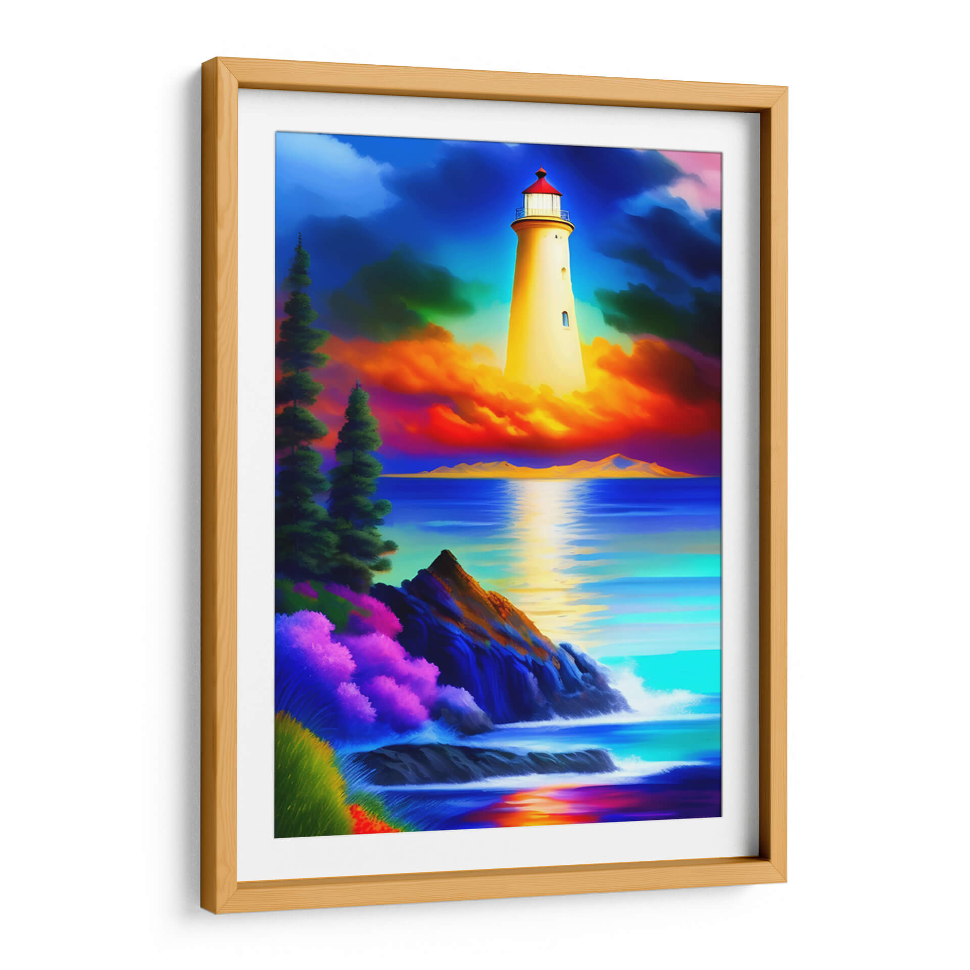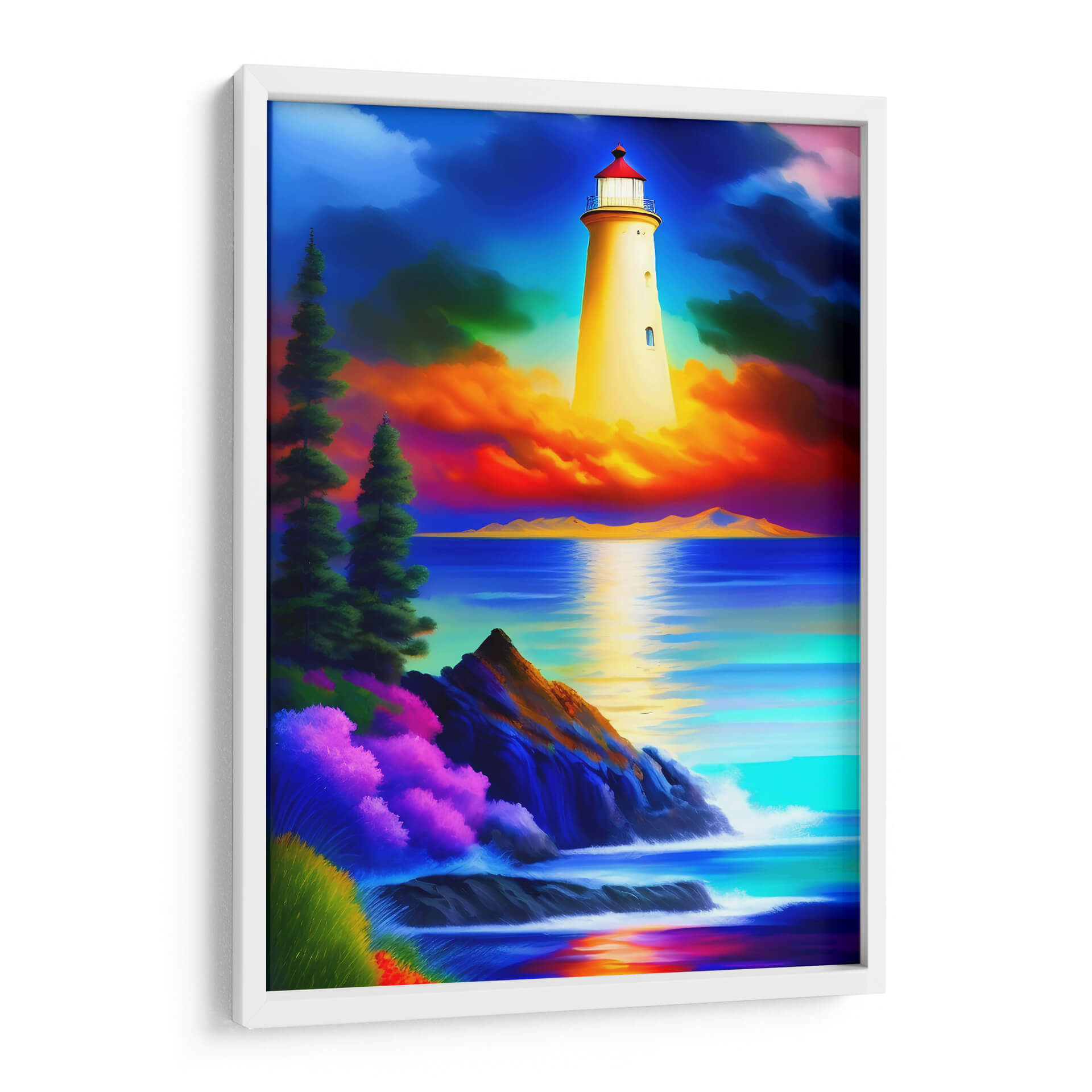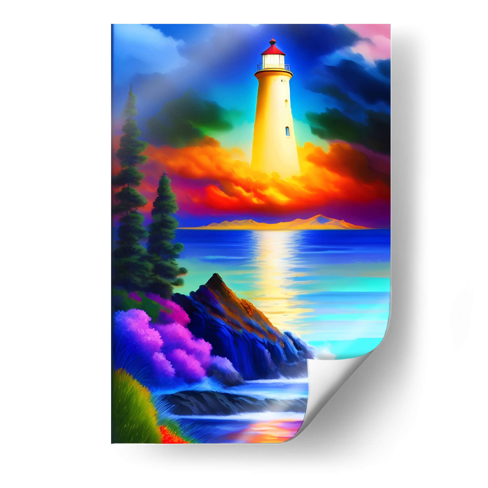 Sumérgete en la serenidad y el poder de la naturaleza con "El Faro de Monet", una obra de arte digital que captura la esencia de la costa con una paleta de colores vibrante y evocadora. Este cuadro decorativo presenta un imponente faro de color amarillo brillante, erigido majestuosamente sobre una escena marina dramática. El cielo, un tapiz de azules profundos y nubes teñidas de intensos naranjas y rosas, contrasta con el azul turquesa y zafiro del mar. La composición se enriquece con detalles costeros, donde rocas escarpadas se encuentran con el embate de las olas y una exuberante vegetación en tonos púrpuras y verdes añade un toque de vitalidad. La luz del faro se refleja en el agua, creando un camino de serenidad y esperanza. "El Faro de Monet" es una pieza que invita a la contemplación, ideal para añadir un punto focal de color y emoción a salas de estar, dormitorios o estudios. Su estilo, que fusiona elementos realistas con una interpretación artística audaz, lo convierte en una adición perfecta para quienes buscan un arte que inspire calma y admiración. Este cuadro decorativo transformará cualquier espacio en un refugio de tranquilidad y belleza natural.