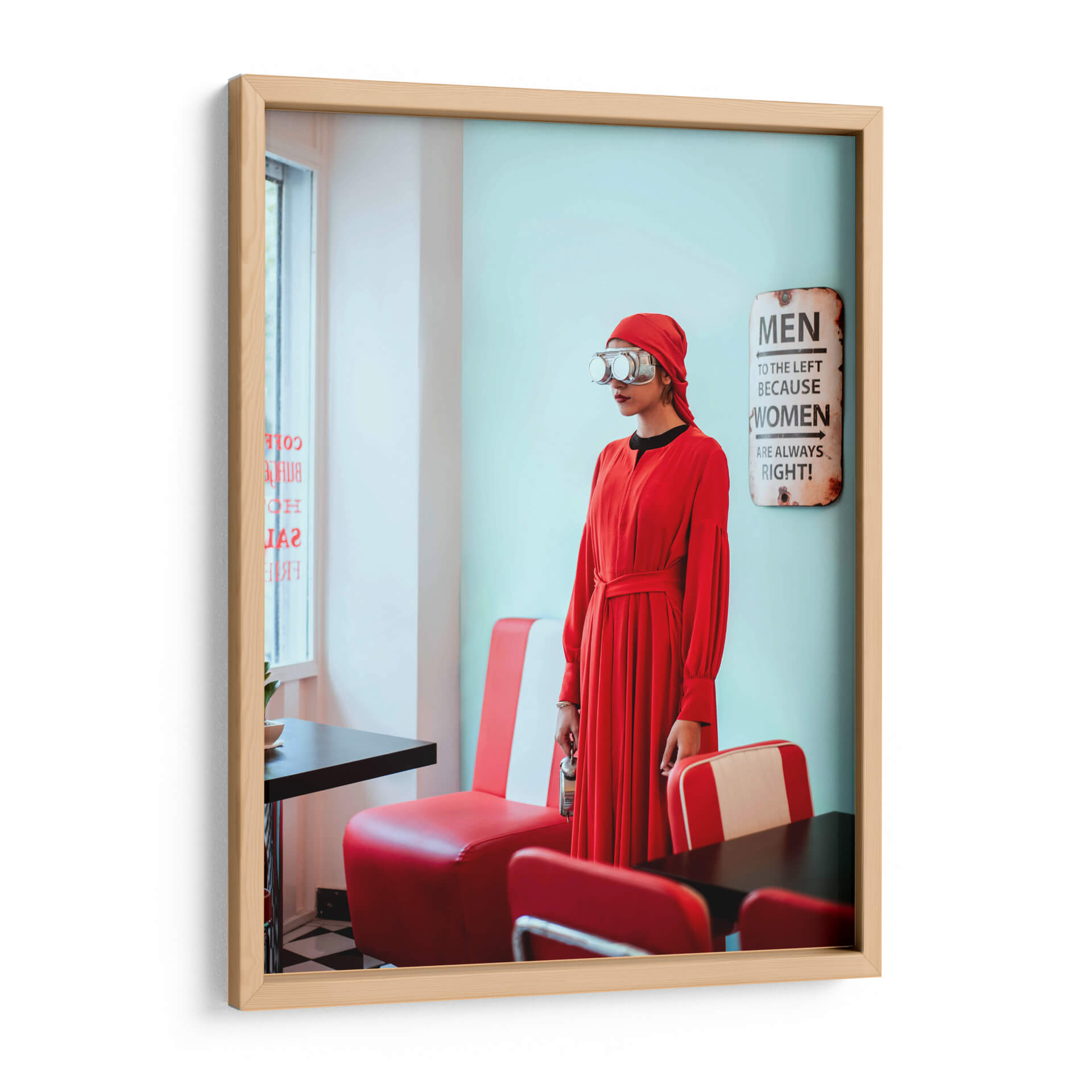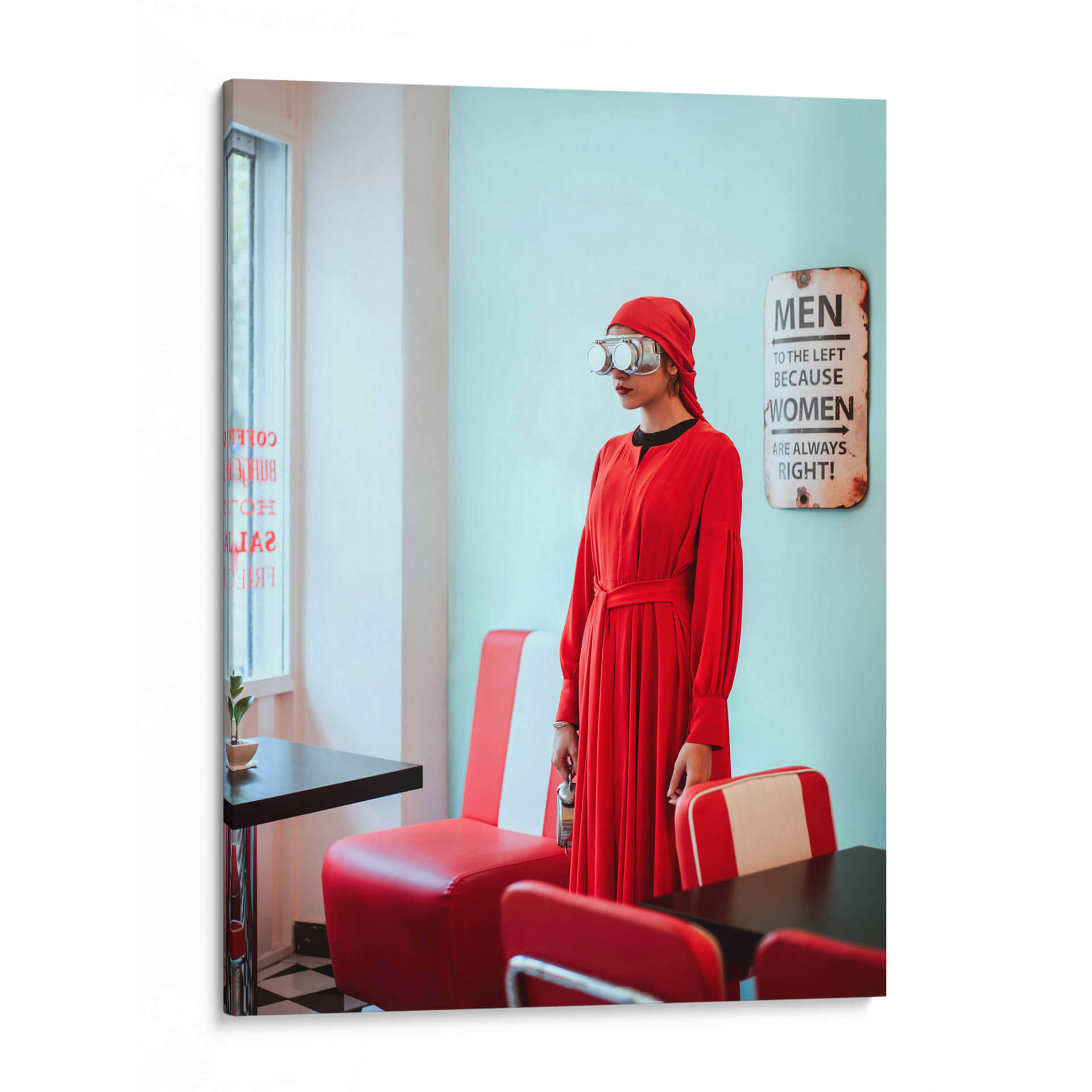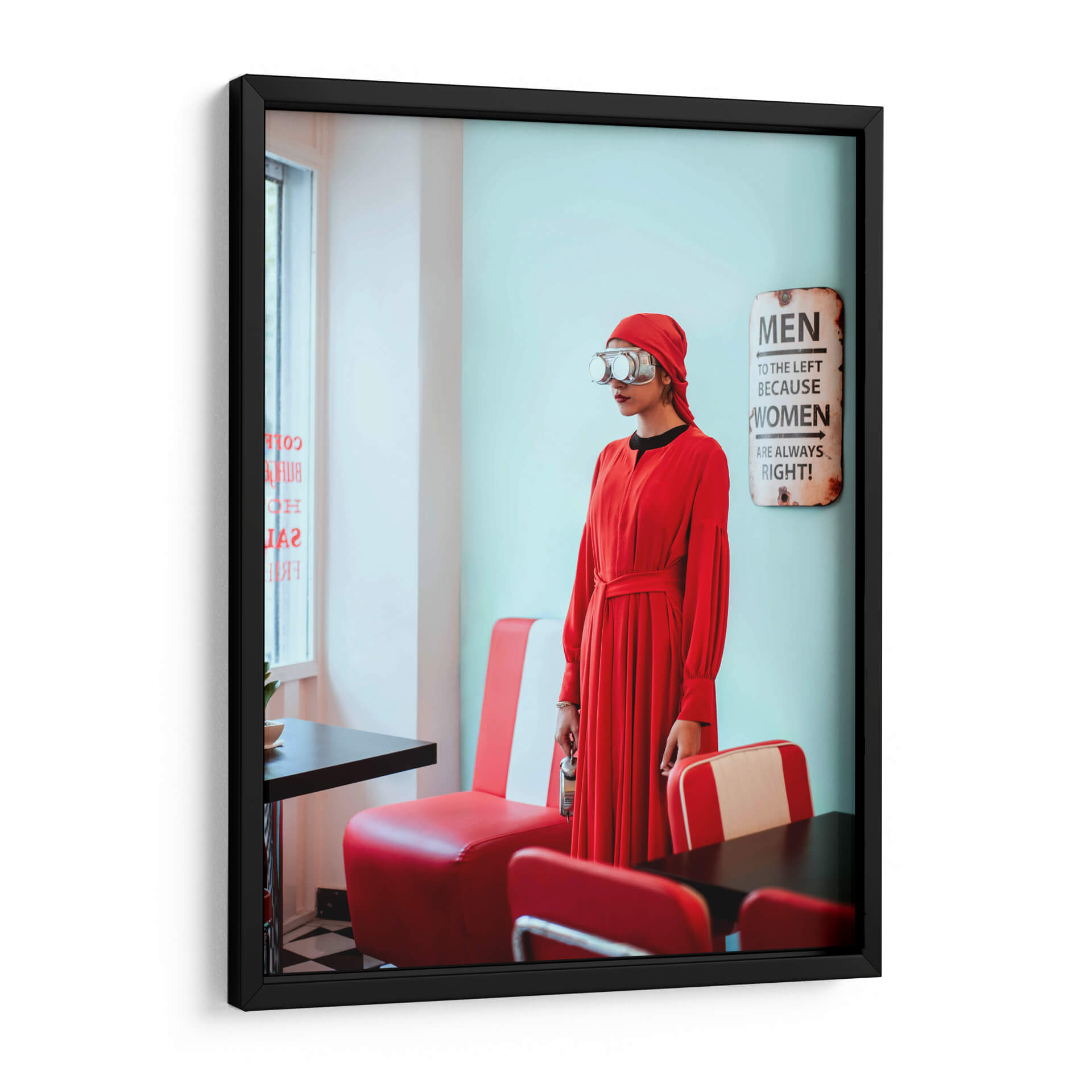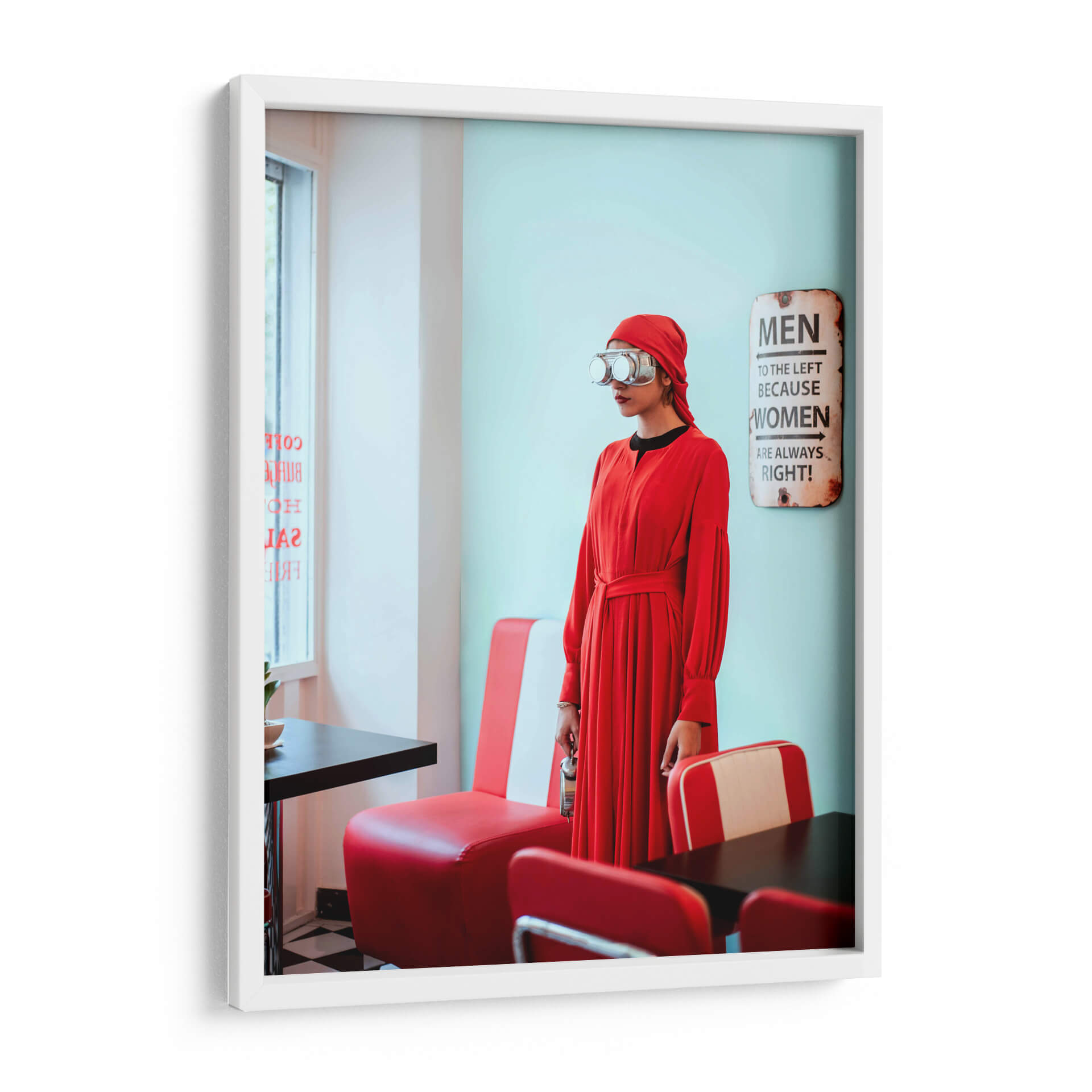 Adéntrate en la enigmática obra "El Paso del Tiempo I" de Mohammad Metri, una pieza que desafía las convenciones y cautiva la imaginación. Esta cautivadora imagen presenta a una figura femenina vestida con un vibrante traje rojo, adornada con unas singulares gafas de estilo retrofuturista que ocultan su mirada, dotándola de un aura de misterio y modernidad. El fondo, de un sereno color turquesa, contrasta marcadamente con el rojo intenso de la figura y los asientos de estilo diner en primer plano, creando una atmósfera visualmente impactante. La composición evoca una sensación de introspección y quizás una reflexión sobre la identidad o la percepción en un mundo en constante cambio. El juego de luces y sombras, junto con los detalles como el letrero vintage de "MEN TO THE LEFT BECAUSE WOMEN ARE ALWAYS RIGHT!" añaden capas de significado y un toque de humor irónico. Este cuadro decorativo es perfecto para espacios que buscan un punto focal audaz y conversacional, desde salas de estar contemporáneas hasta oficinas creativas. "El Paso del Tiempo I" no es solo una imagen, es una invitación a explorar el enigma del tiempo y la condición humana a través del arte visual. Una obra que inspira diálogos y añade una dimensión de sofisticación única a tu decoración.