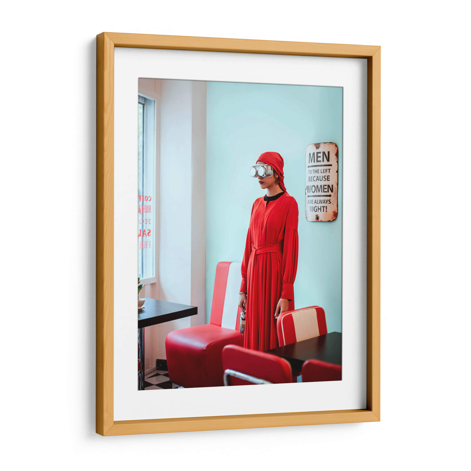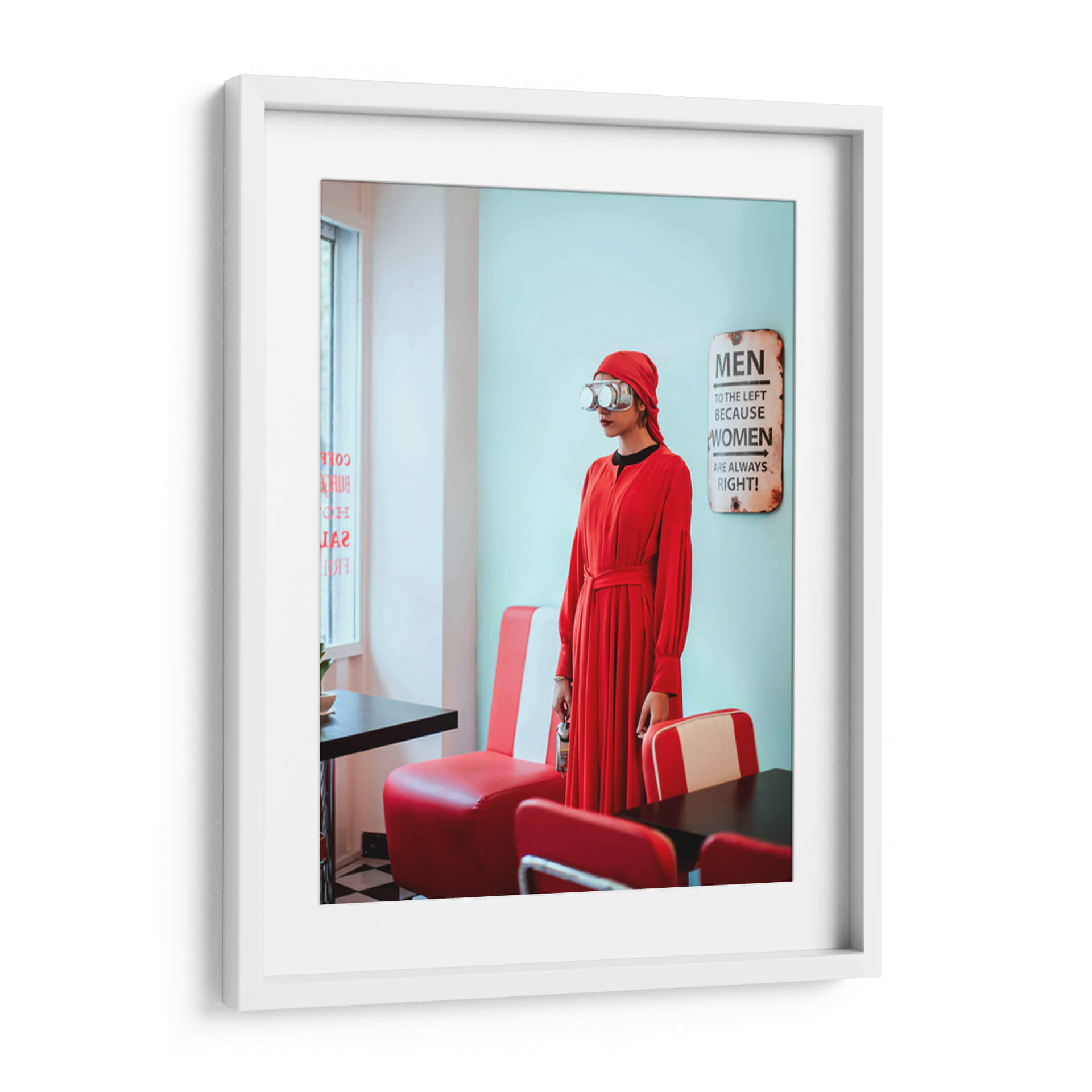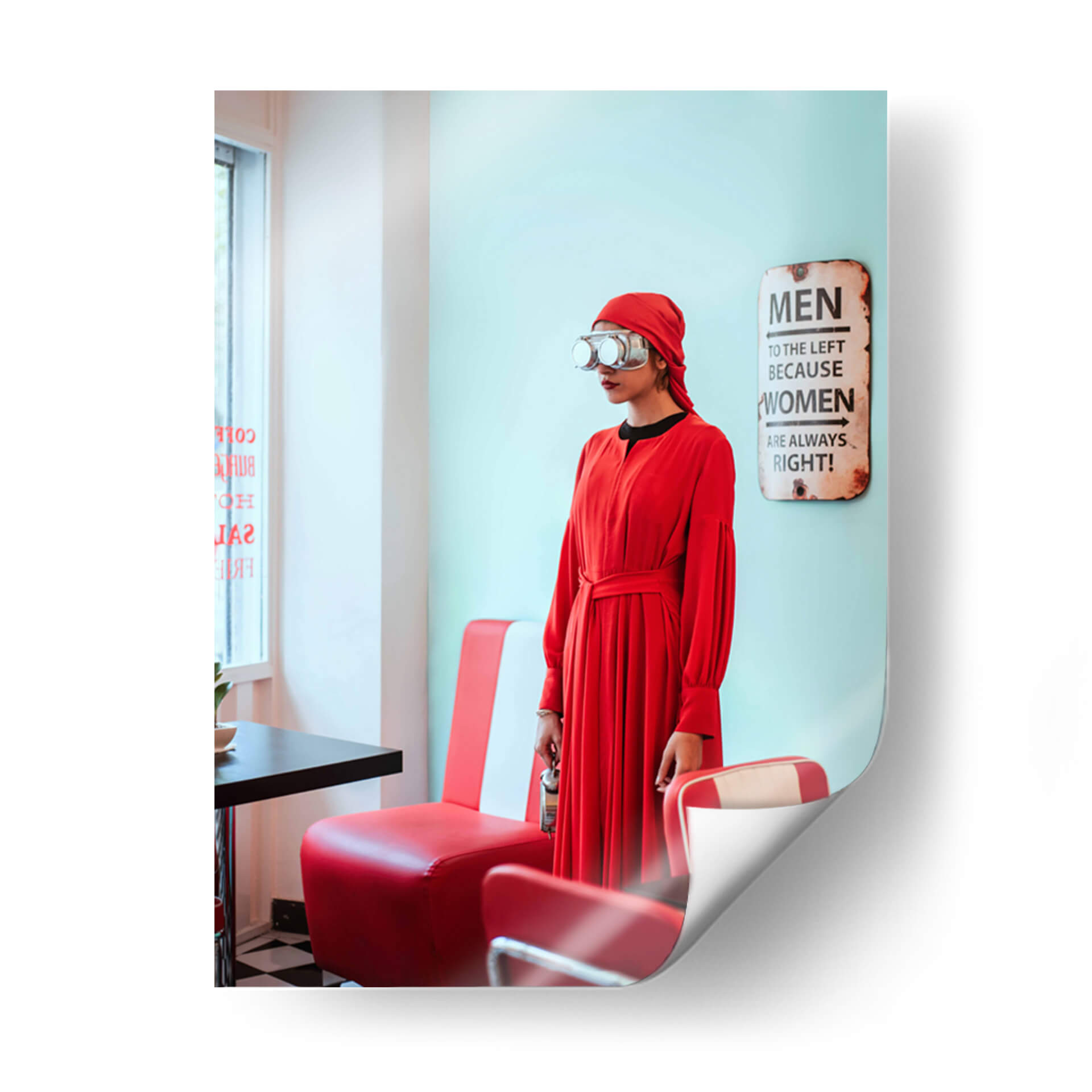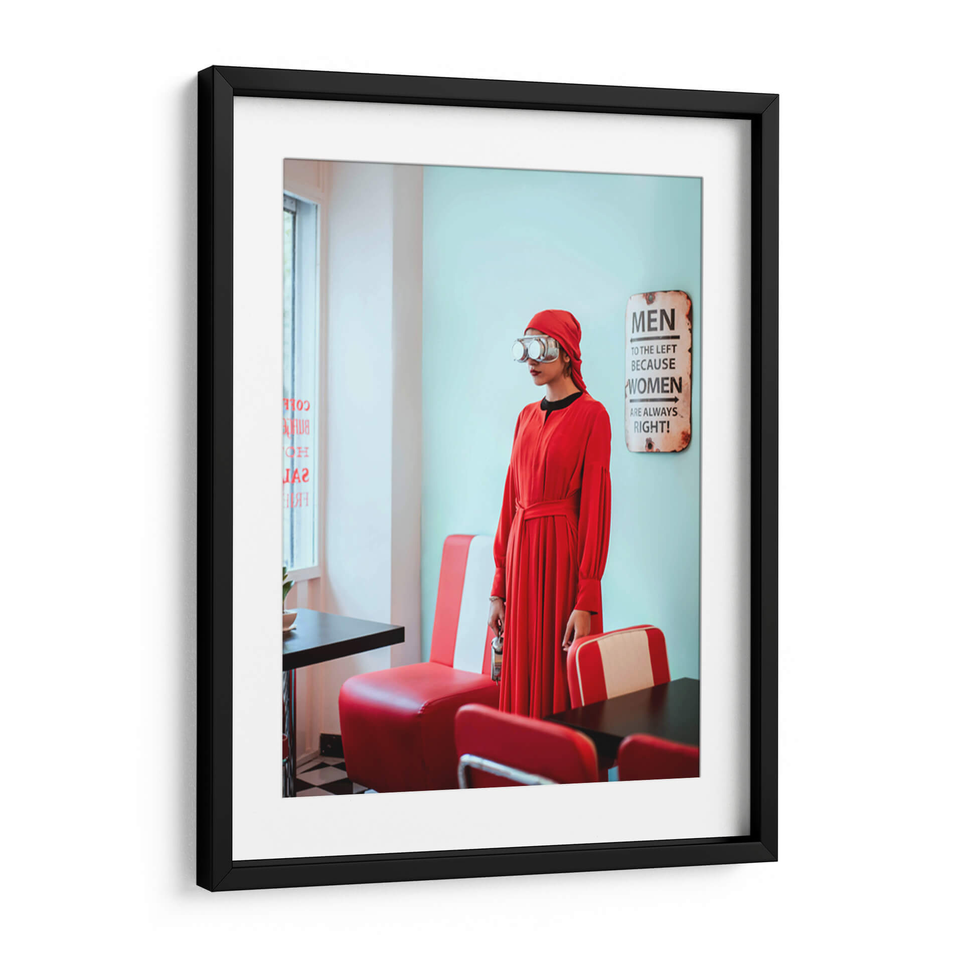 Adéntrate en la enigmática obra "El Paso del Tiempo I" de Mohammad Metri, una pieza que desafía las convenciones y cautiva la imaginación. Esta cautivadora imagen presenta a una figura femenina vestida con un vibrante traje rojo, adornada con unas singulares gafas de estilo retrofuturista que ocultan su mirada, dotándola de un aura de misterio y modernidad. El fondo, de un sereno color turquesa, contrasta marcadamente con el rojo intenso de la figura y los asientos de estilo diner en primer plano, creando una atmósfera visualmente impactante. La composición evoca una sensación de introspección y quizás una reflexión sobre la identidad o la percepción en un mundo en constante cambio. El juego de luces y sombras, junto con los detalles como el letrero vintage de "MEN TO THE LEFT BECAUSE WOMEN ARE ALWAYS RIGHT!" añaden capas de significado y un toque de humor irónico. Este cuadro decorativo es perfecto para espacios que buscan un punto focal audaz y conversacional, desde salas de estar contemporáneas hasta oficinas creativas. "El Paso del Tiempo I" no es solo una imagen, es una invitación a explorar el enigma del tiempo y la condición humana a través del arte visual. Una obra que inspira diálogos y añade una dimensión de sofisticación única a tu decoración.