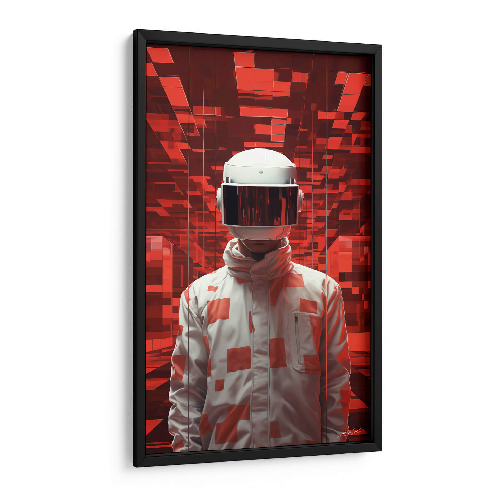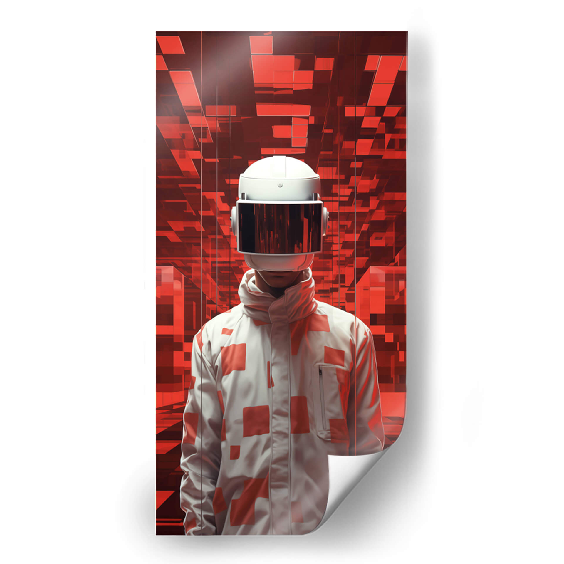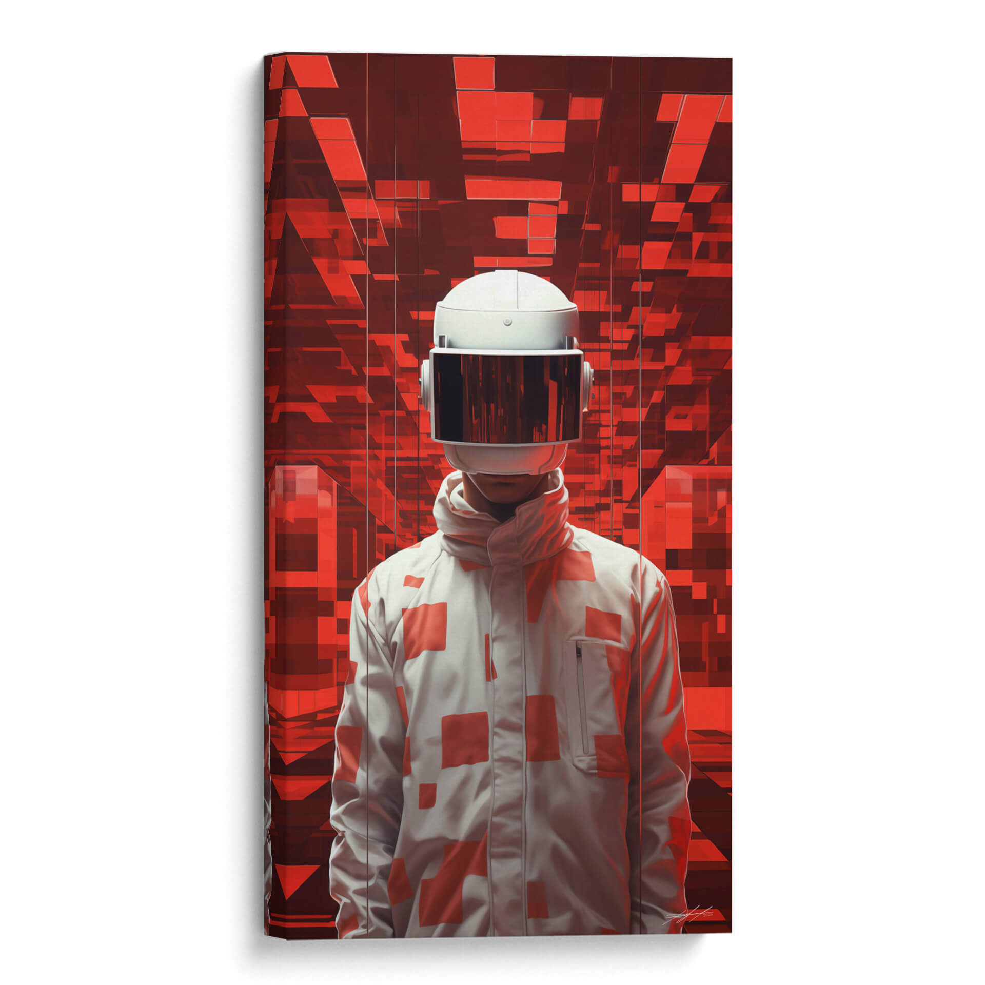 Sumérgete en el misterio y la intriga con "El Viajero - 1", una obra de arte digital que te transportará a mundos desconocidos. Esta cautivadora pieza presenta una figura enigmática con un casco futurista, de pie ante un fondo abstracto de vibrantes tonos rojos y formas geométricas interconectadas. La paleta de colores, dominada por rojos intensos y contrastes de blanco y gris, crea una atmósfera de energía, tecnología y exploración. El estilo artístico, que combina elementos de ciencia ficción con un toque surrealista, invita a la reflexión sobre la identidad, el futuro y la aventura. El diseño de la chaqueta, adornada con patrones geométricos en rojo sobre blanco, añade un elemento de moda vanguardista a la figura central. Este cuadro decorativo es perfecto para aquellos que buscan añadir un toque moderno y audaz a su hogar u oficina, creando un punto focal que estimula la imaginación y genera conversación. Ideal para salas de estar contemporáneas, estudios de diseño o cualquier espacio que desee una dosis de arte innovador y con carácter. "El Viajero - 1" no es solo una decoración, es una invitación a un viaje interior.