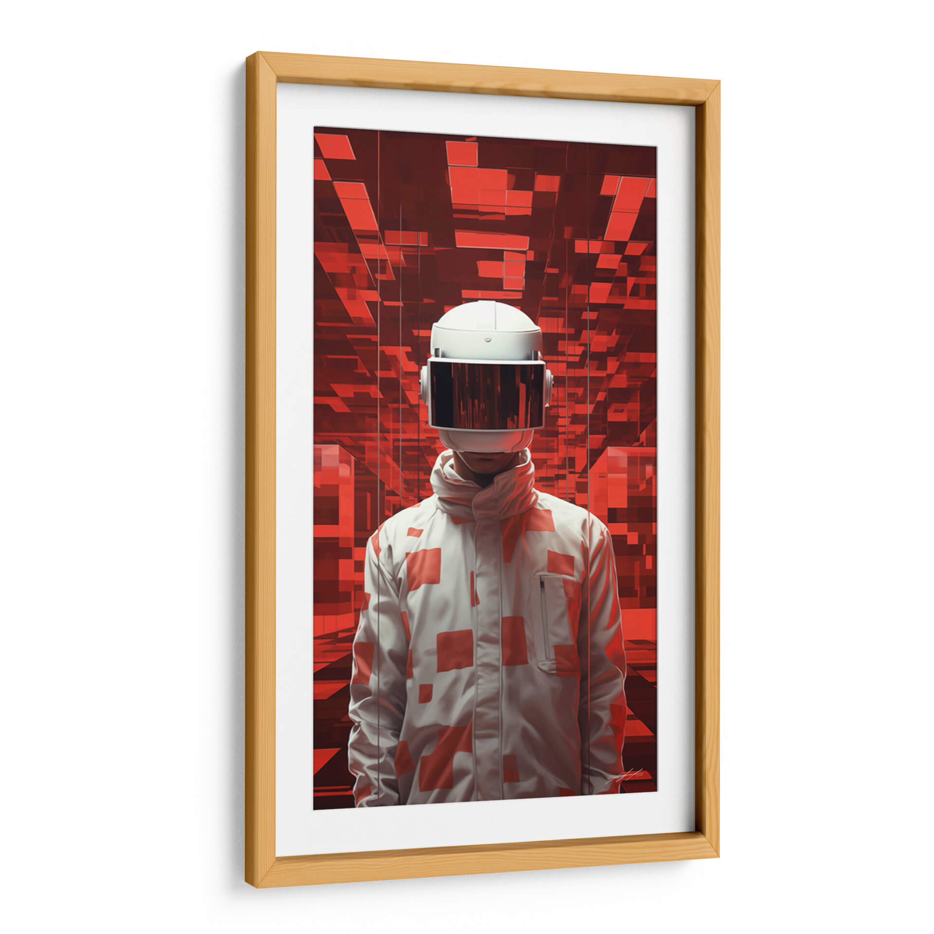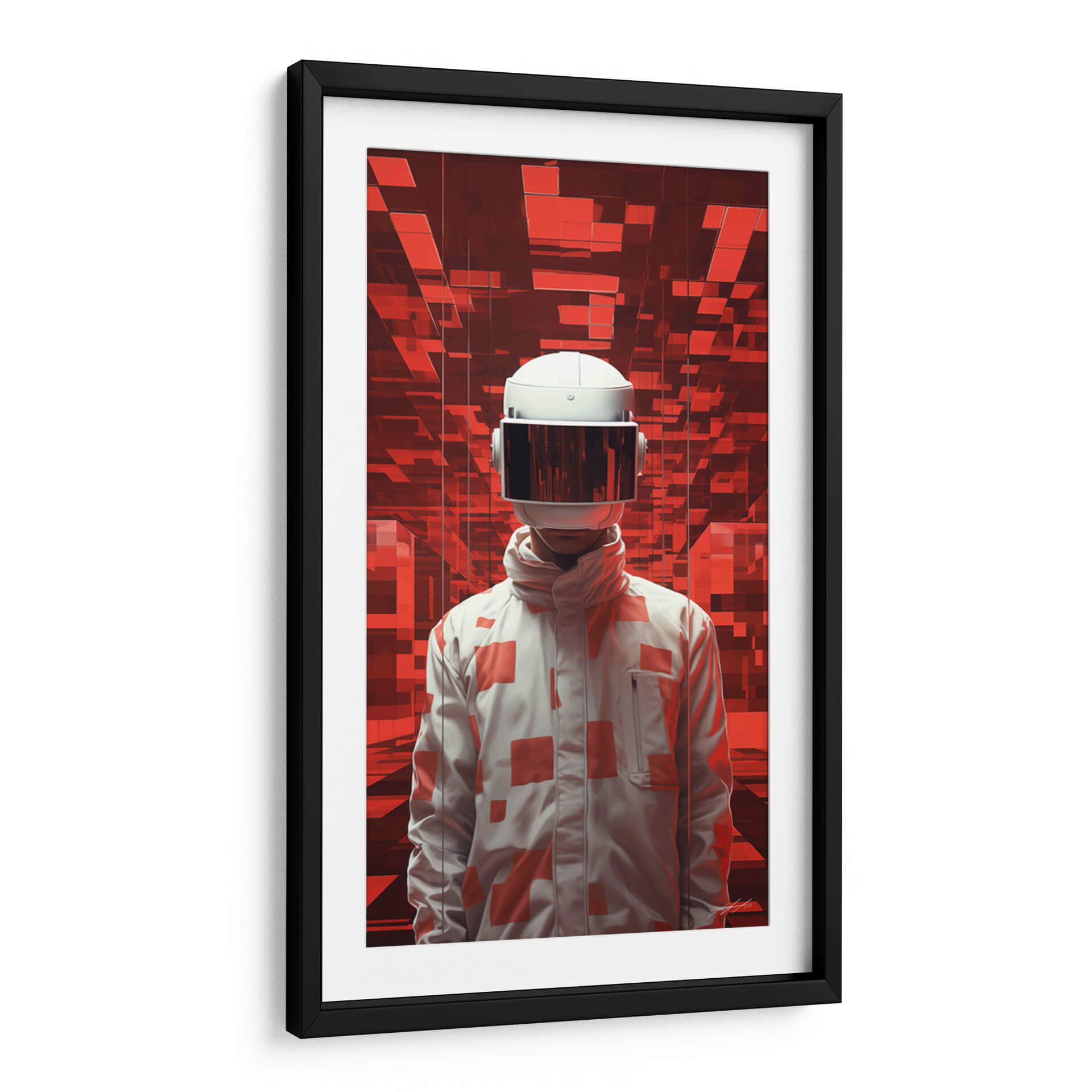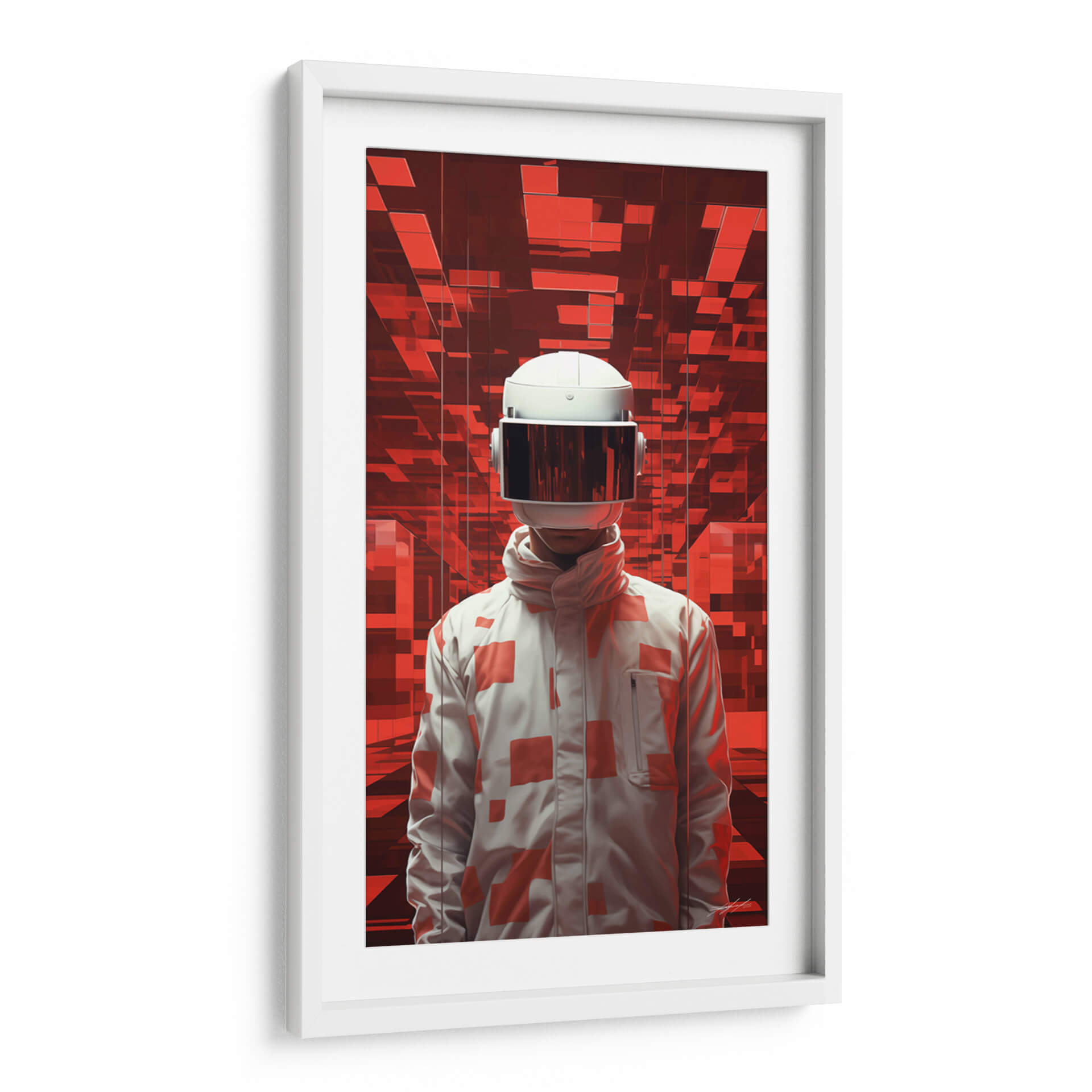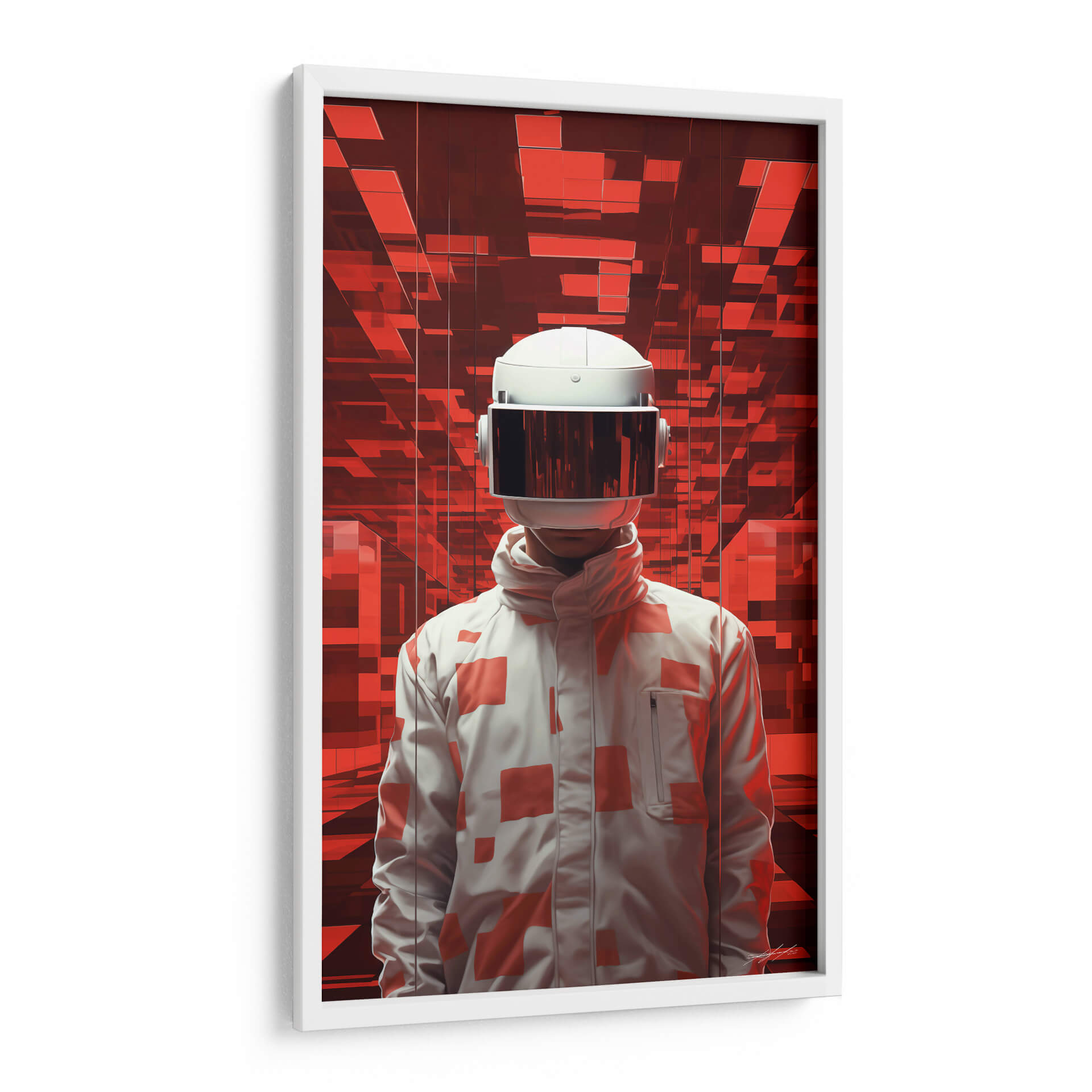 Sumérgete en el misterio y la intriga con "El Viajero - 1", una obra de arte digital que te transportará a mundos desconocidos. Esta cautivadora pieza presenta una figura enigmática con un casco futurista, de pie ante un fondo abstracto de vibrantes tonos rojos y formas geométricas interconectadas. La paleta de colores, dominada por rojos intensos y contrastes de blanco y gris, crea una atmósfera de energía, tecnología y exploración. El estilo artístico, que combina elementos de ciencia ficción con un toque surrealista, invita a la reflexión sobre la identidad, el futuro y la aventura. El diseño de la chaqueta, adornada con patrones geométricos en rojo sobre blanco, añade un elemento de moda vanguardista a la figura central. Este cuadro decorativo es perfecto para aquellos que buscan añadir un toque moderno y audaz a su hogar u oficina, creando un punto focal que estimula la imaginación y genera conversación. Ideal para salas de estar contemporáneas, estudios de diseño o cualquier espacio que desee una dosis de arte innovador y con carácter. "El Viajero - 1" no es solo una decoración, es una invitación a un viaje interior.