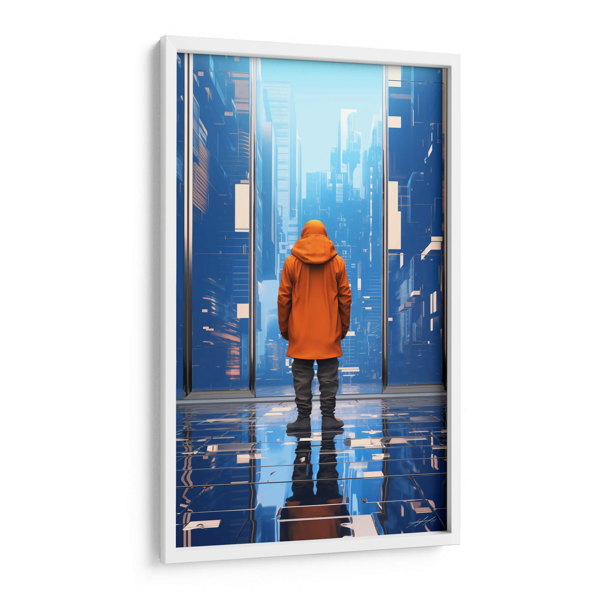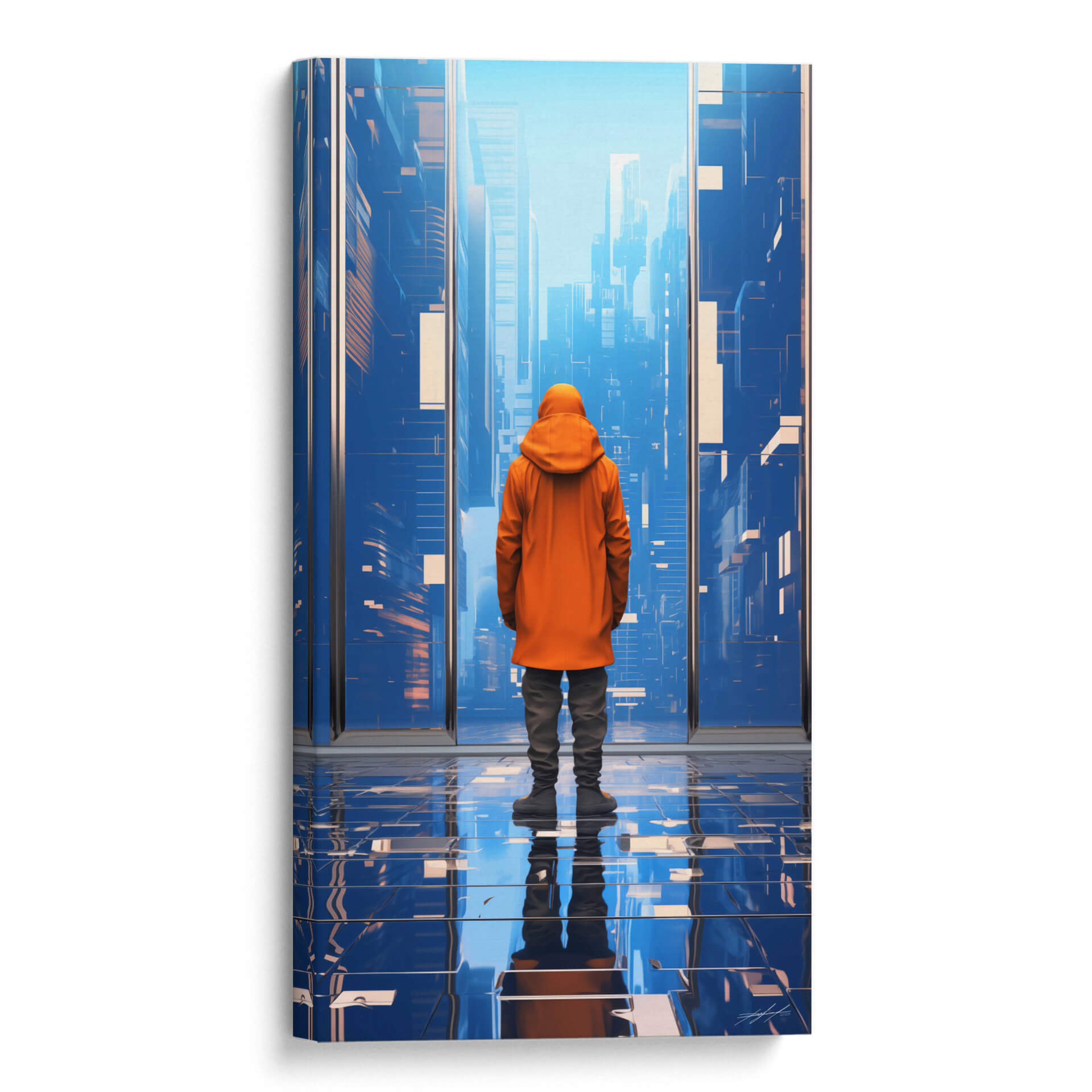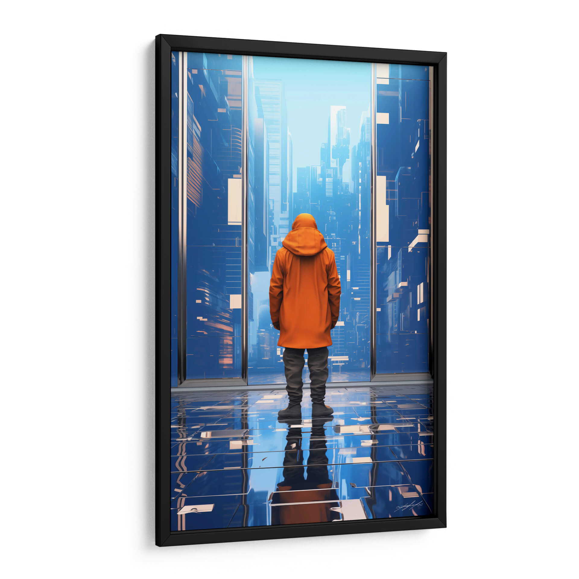 Adéntrate en un futuro cautivador con "El Viajero - 4", una obra de arte digital que evoca la exploración de paisajes urbanos futuristas. La pieza presenta a una figura solitaria de espaldas, vestida con un llamativo abrigo naranja, que se asoma a una metrópolis de rascacielos de ciencia ficción bañada en tonos azules vibrantes y reflejos luminosos. La composición, con sus líneas limpias y la simetría sutil de la arquitectura, crea una sensación de asombro y anticipación. El contraste entre la figura humana y la escala monumental del entorno urbano genera una narrativa visual de descubrimiento y contemplación. Este cuadro decorativo es perfecto para inspirar conversaciones y añadir un toque de modernidad y misterio a cualquier espacio, desde una oficina vanguardista hasta una sala de estar contemporánea. Su paleta de colores, dominada por el azul eléctrico y el naranja enérgico, crea un impacto visual memorable. Imagina este cuadro como el punto focal de tu decoración, invitando a la reflexión sobre el viaje y el descubrimiento personal en un mundo en constante evolución. "El Viajero - 4" no es solo una imagen, es una ventana a la imaginación.