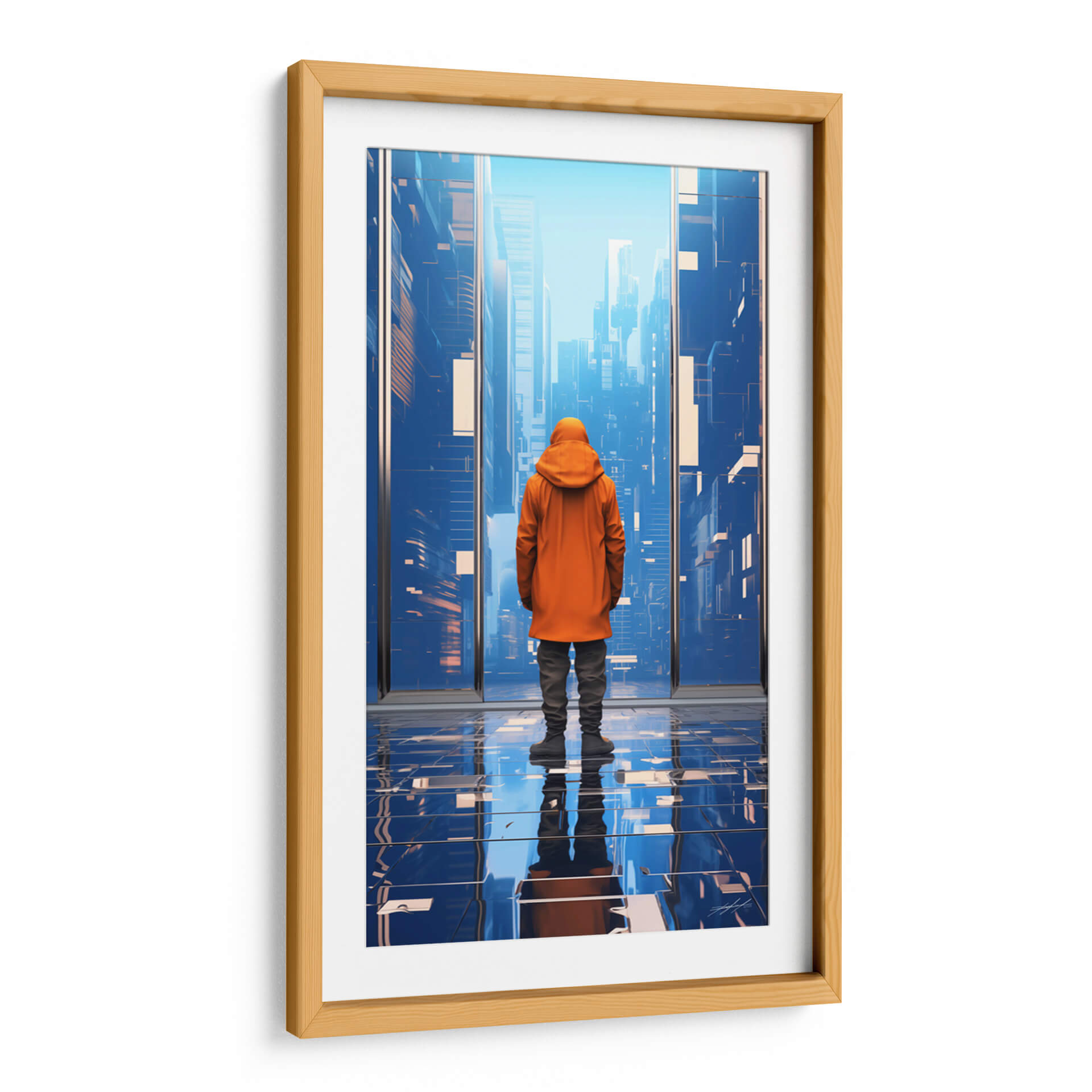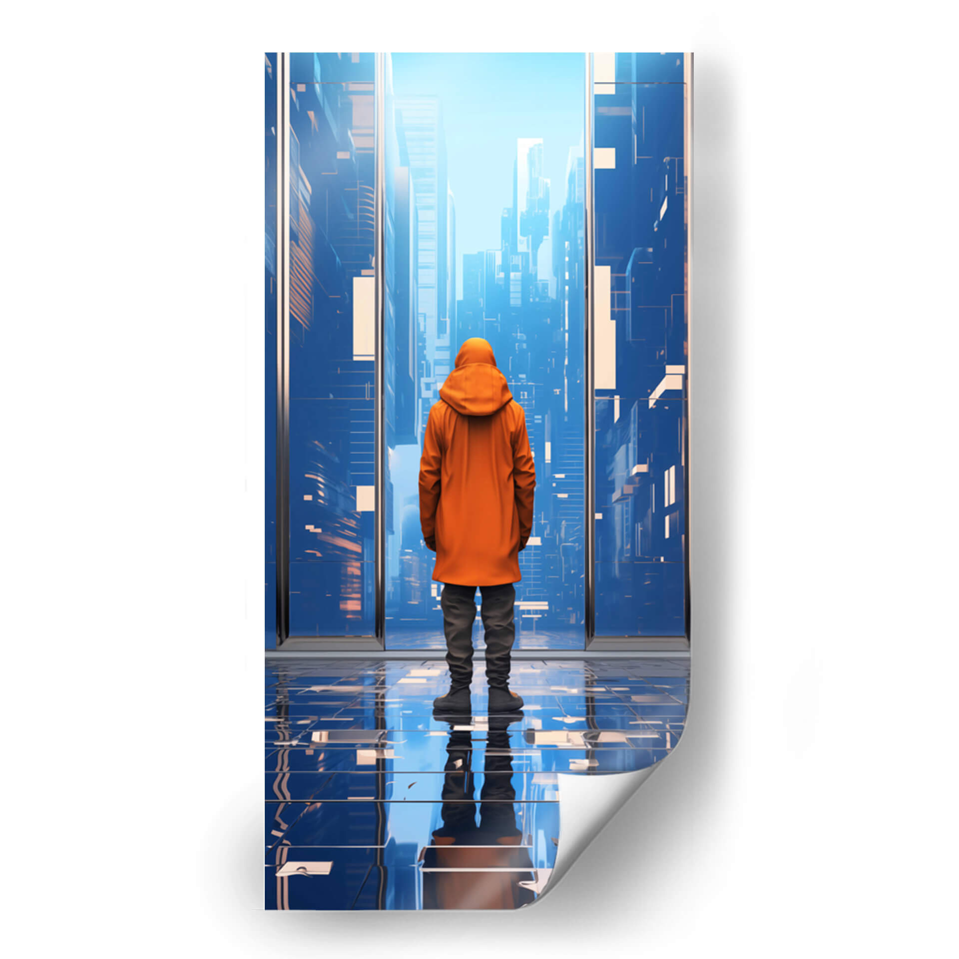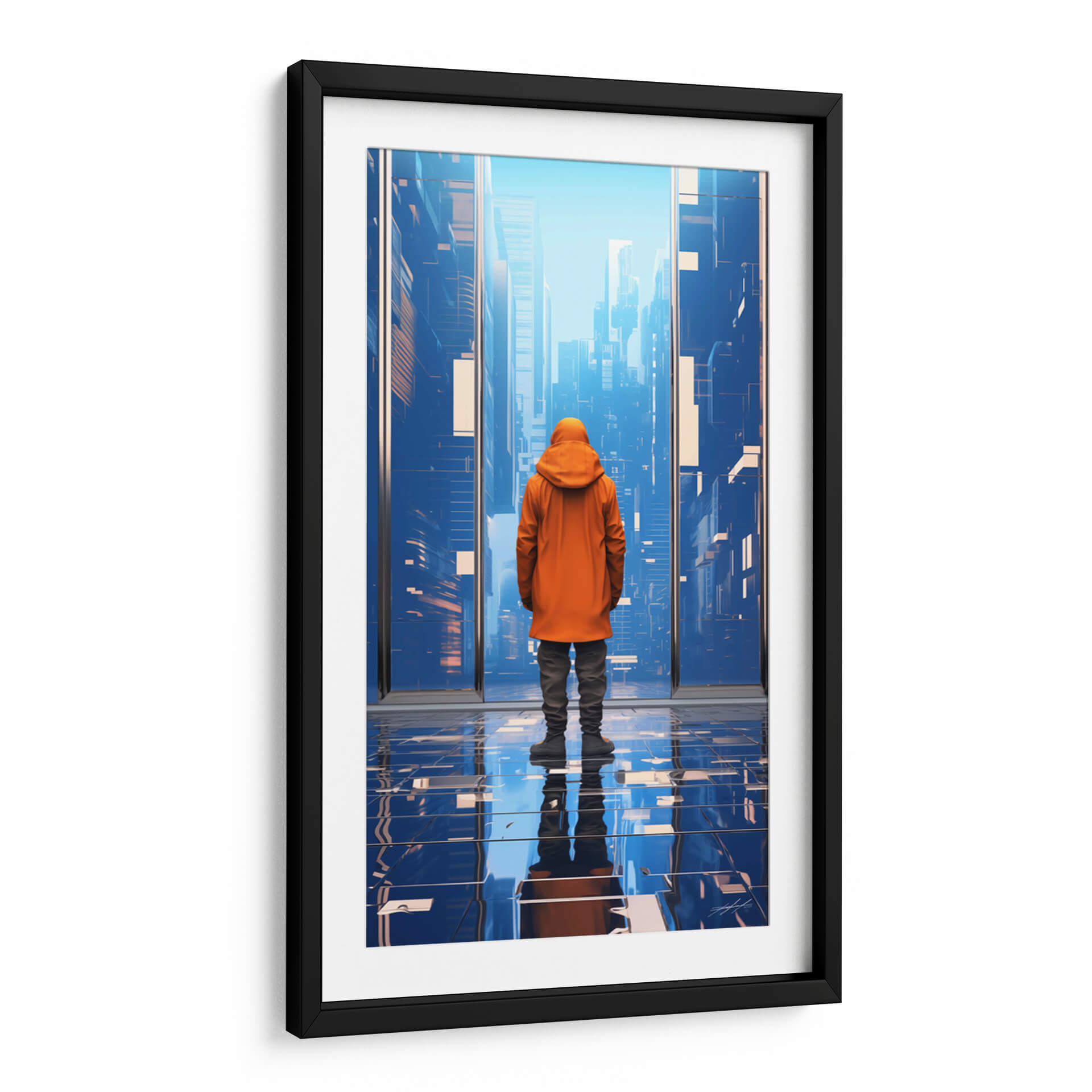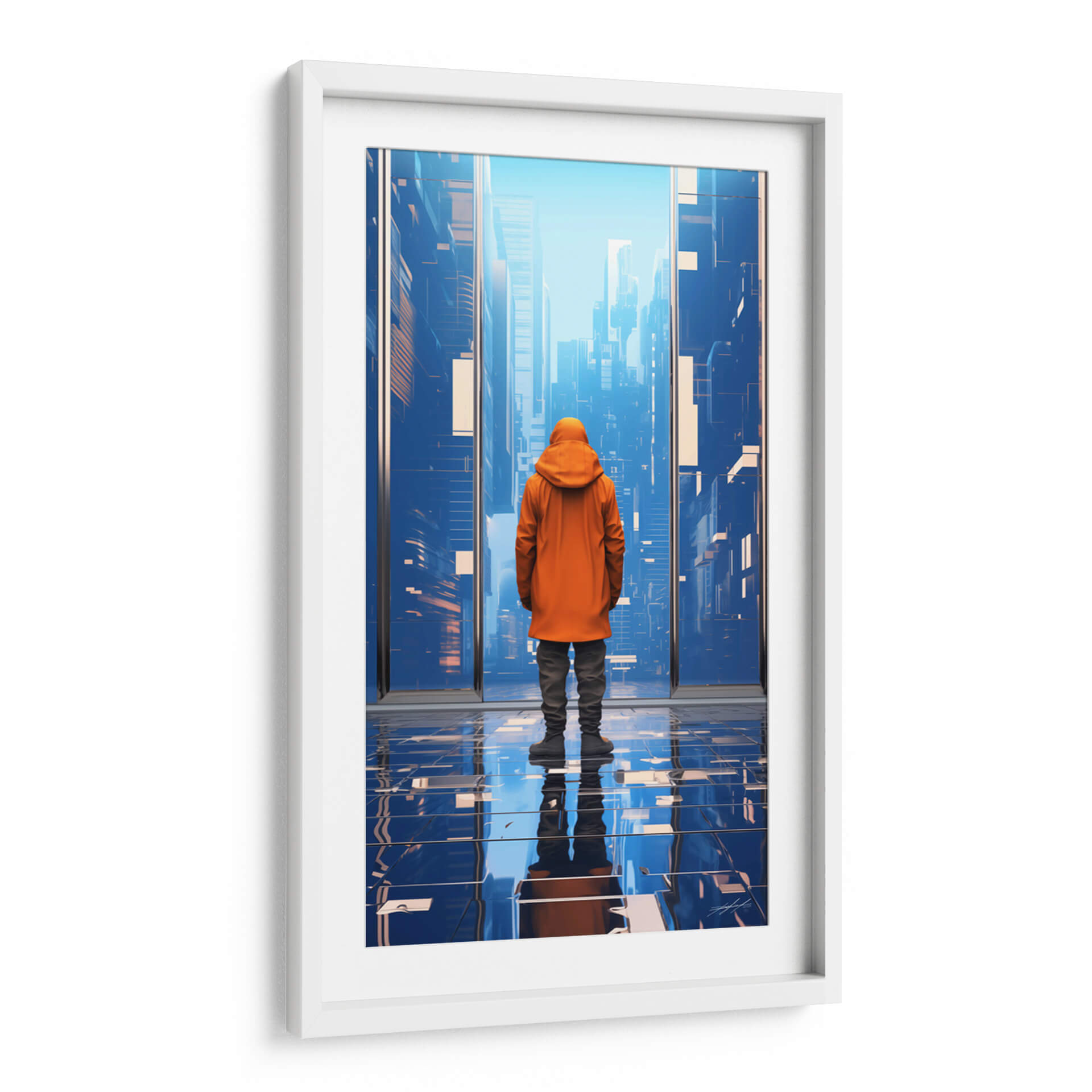 Adéntrate en un futuro cautivador con "El Viajero - 4", una obra de arte digital que evoca la exploración de paisajes urbanos futuristas. La pieza presenta a una figura solitaria de espaldas, vestida con un llamativo abrigo naranja, que se asoma a una metrópolis de rascacielos de ciencia ficción bañada en tonos azules vibrantes y reflejos luminosos. La composición, con sus líneas limpias y la simetría sutil de la arquitectura, crea una sensación de asombro y anticipación. El contraste entre la figura humana y la escala monumental del entorno urbano genera una narrativa visual de descubrimiento y contemplación. Este cuadro decorativo es perfecto para inspirar conversaciones y añadir un toque de modernidad y misterio a cualquier espacio, desde una oficina vanguardista hasta una sala de estar contemporánea. Su paleta de colores, dominada por el azul eléctrico y el naranja enérgico, crea un impacto visual memorable. Imagina este cuadro como el punto focal de tu decoración, invitando a la reflexión sobre el viaje y el descubrimiento personal en un mundo en constante evolución. "El Viajero - 4" no es solo una imagen, es una ventana a la imaginación.