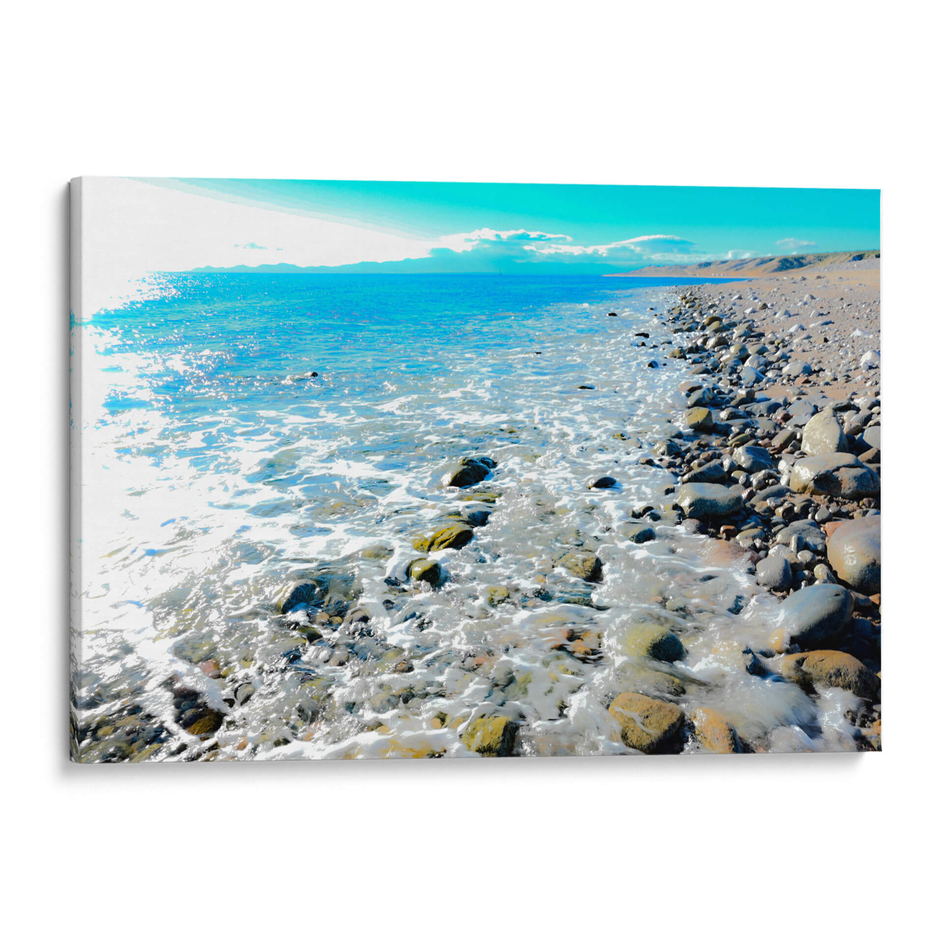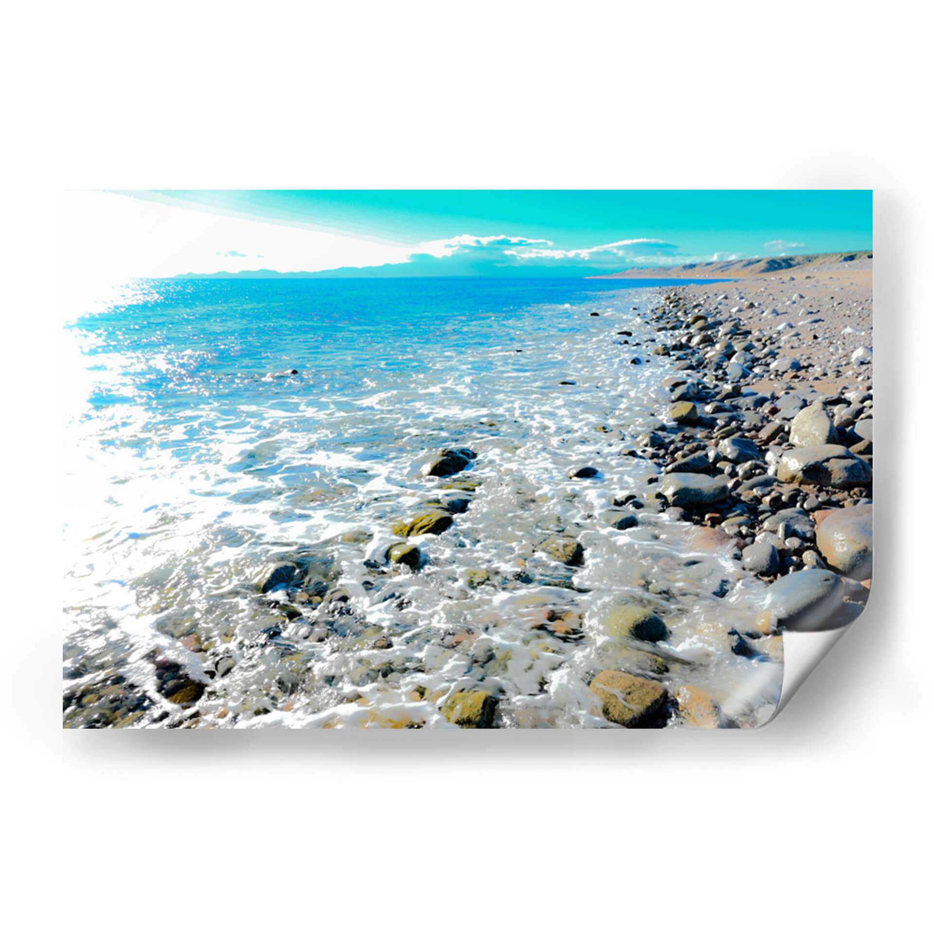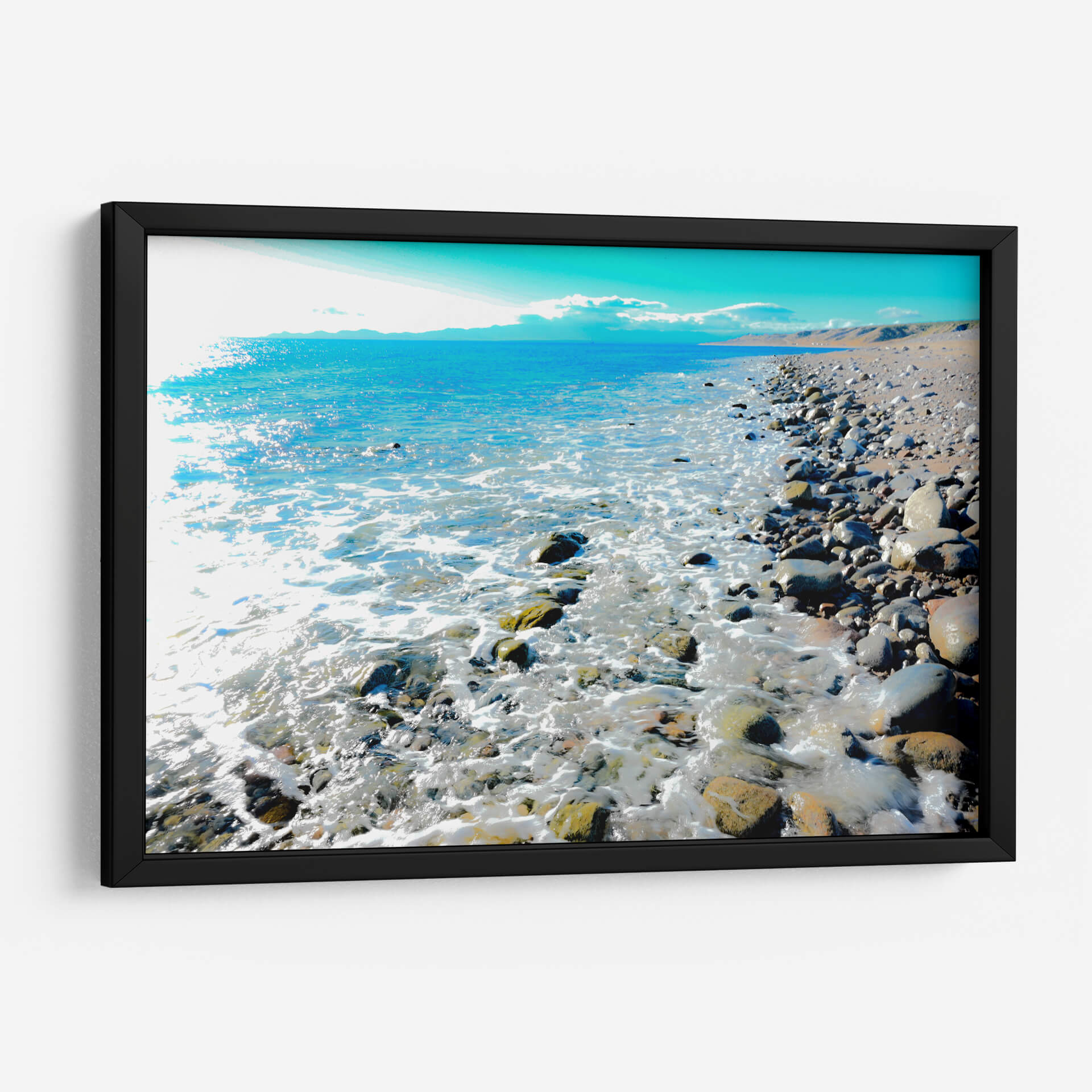 Sumérgete en la serena belleza del "Encuentro de mar y tierra", una obra de arte que captura la mágica transición entre el océano y la costa rocosa. Los vibrantes tonos turquesa del agua, bañados por la luz del sol, crean un espectáculo de brillos y reflejos que invitan a la calma y la contemplación. Las olas espumosas rompen suavemente sobre una orilla cubierta de piedras redondeadas y pulidas por el tiempo, cada una contando una historia de la naturaleza. La paleta de colores, dominada por azules profundos y celestes luminosos, se complementa con los tonos tierra y grises de las rocas, creando un equilibrio visual armonioso. Esta pieza evoca una sensación de paz, conexión con el entorno natural y la fuerza serena del mar. Ideal para añadir un toque de frescura y tranquilidad a tu hogar u oficina, este cuadro decorativo es perfecto para espacios que buscan transmitir serenidad y la belleza atemporal de la costa. Su composición fotográfica, con la línea del horizonte sutilmente definida, transporta al espectador a ese instante perfecto de unión entre el elemento acuático y la tierra firme, ofreciendo una ventana a la naturaleza desde cualquier rincón de tu espacio.