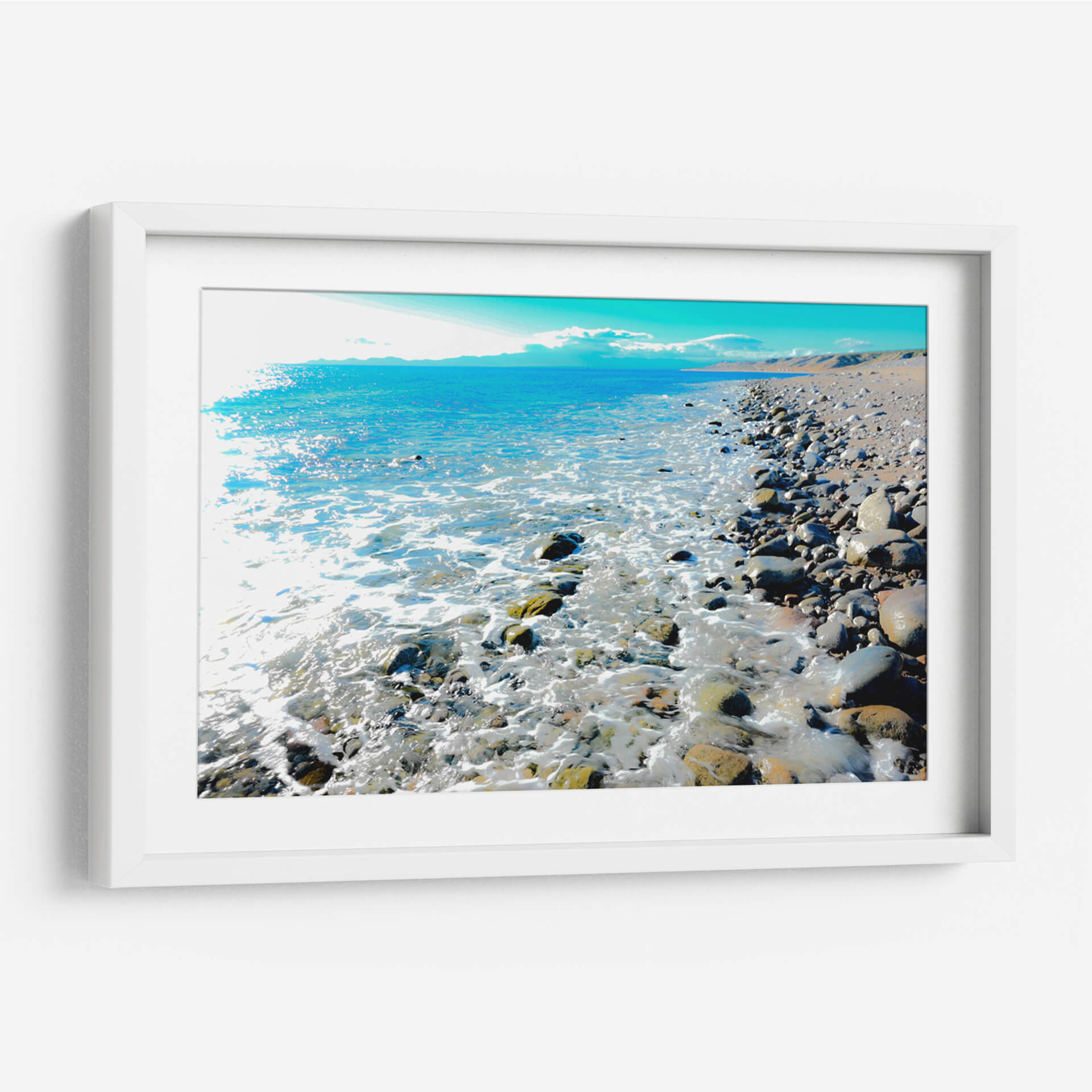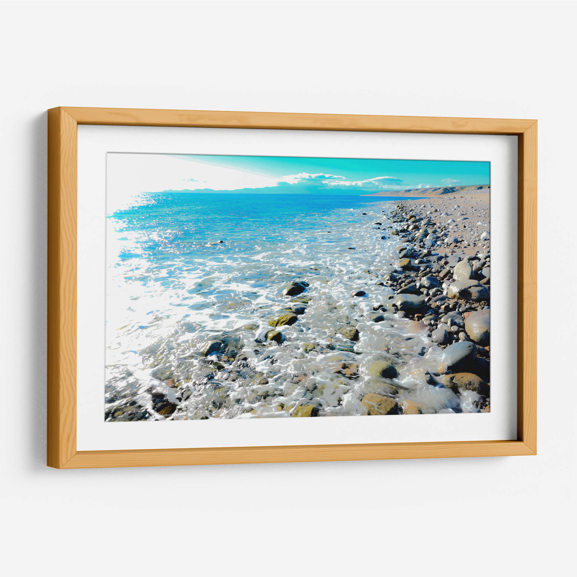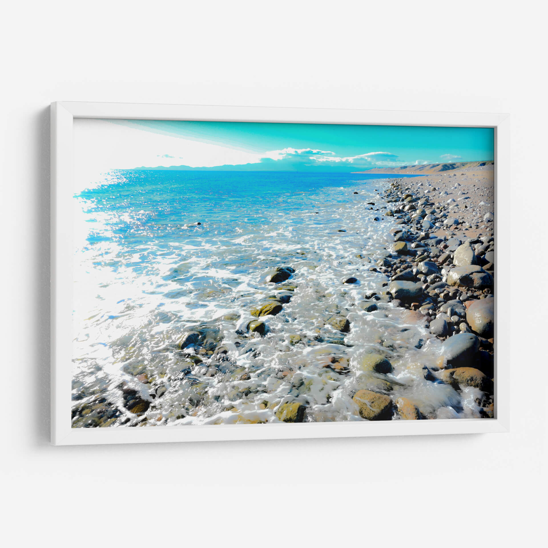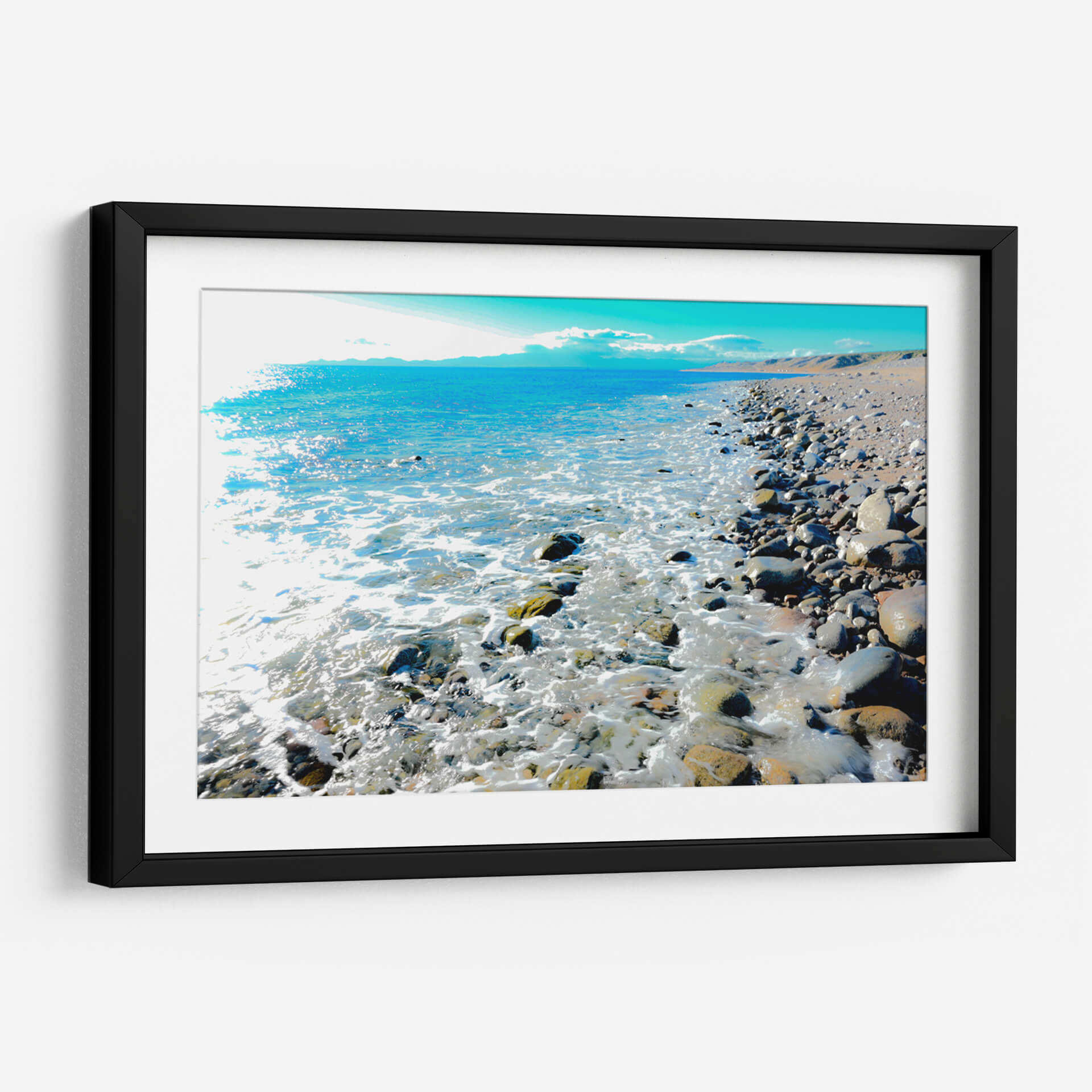 Sumérgete en la serena belleza del "Encuentro de mar y tierra", una obra de arte que captura la mágica transición entre el océano y la costa rocosa. Los vibrantes tonos turquesa del agua, bañados por la luz del sol, crean un espectáculo de brillos y reflejos que invitan a la calma y la contemplación. Las olas espumosas rompen suavemente sobre una orilla cubierta de piedras redondeadas y pulidas por el tiempo, cada una contando una historia de la naturaleza. La paleta de colores, dominada por azules profundos y celestes luminosos, se complementa con los tonos tierra y grises de las rocas, creando un equilibrio visual armonioso. Esta pieza evoca una sensación de paz, conexión con el entorno natural y la fuerza serena del mar. Ideal para añadir un toque de frescura y tranquilidad a tu hogar u oficina, este cuadro decorativo es perfecto para espacios que buscan transmitir serenidad y la belleza atemporal de la costa. Su composición fotográfica, con la línea del horizonte sutilmente definida, transporta al espectador a ese instante perfecto de unión entre el elemento acuático y la tierra firme, ofreciendo una ventana a la naturaleza desde cualquier rincón de tu espacio.